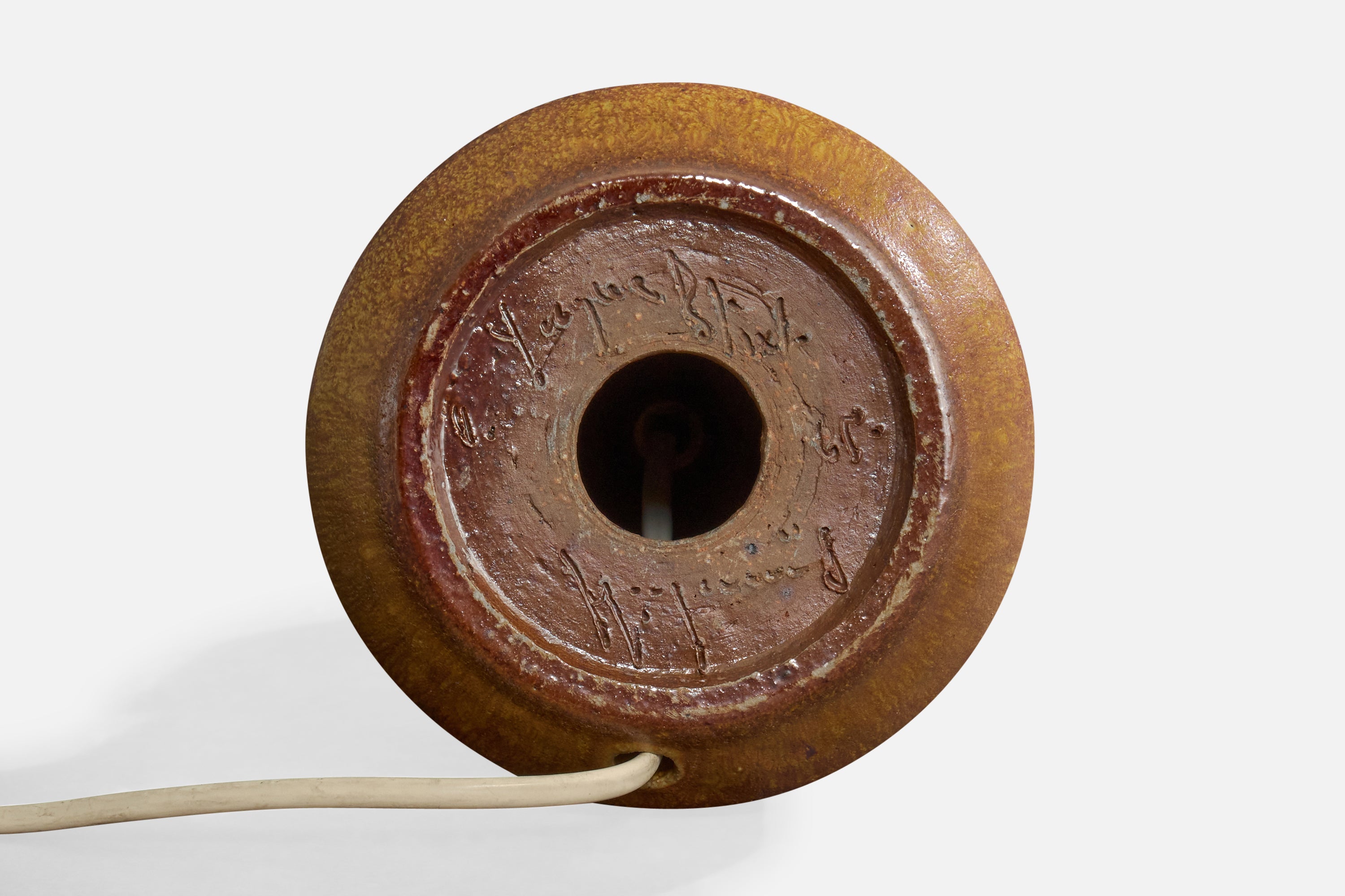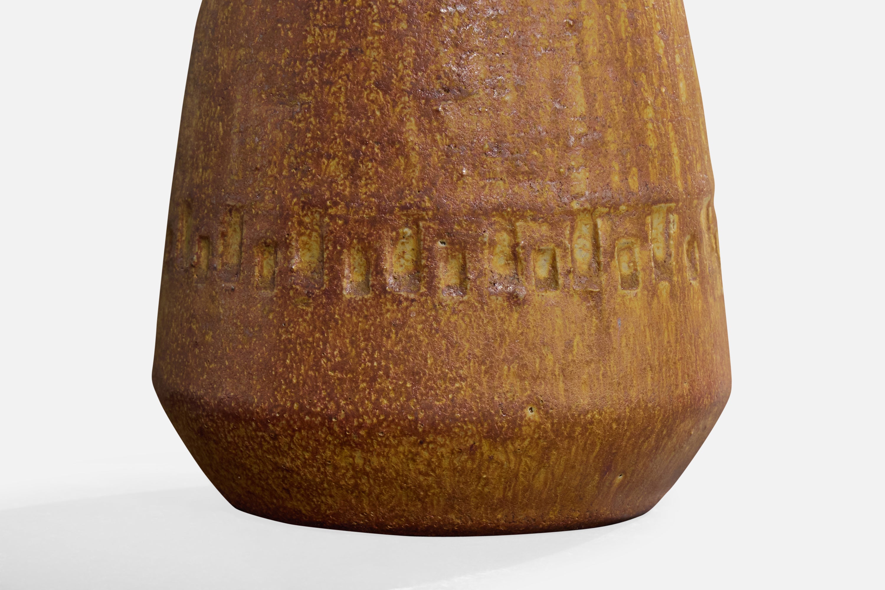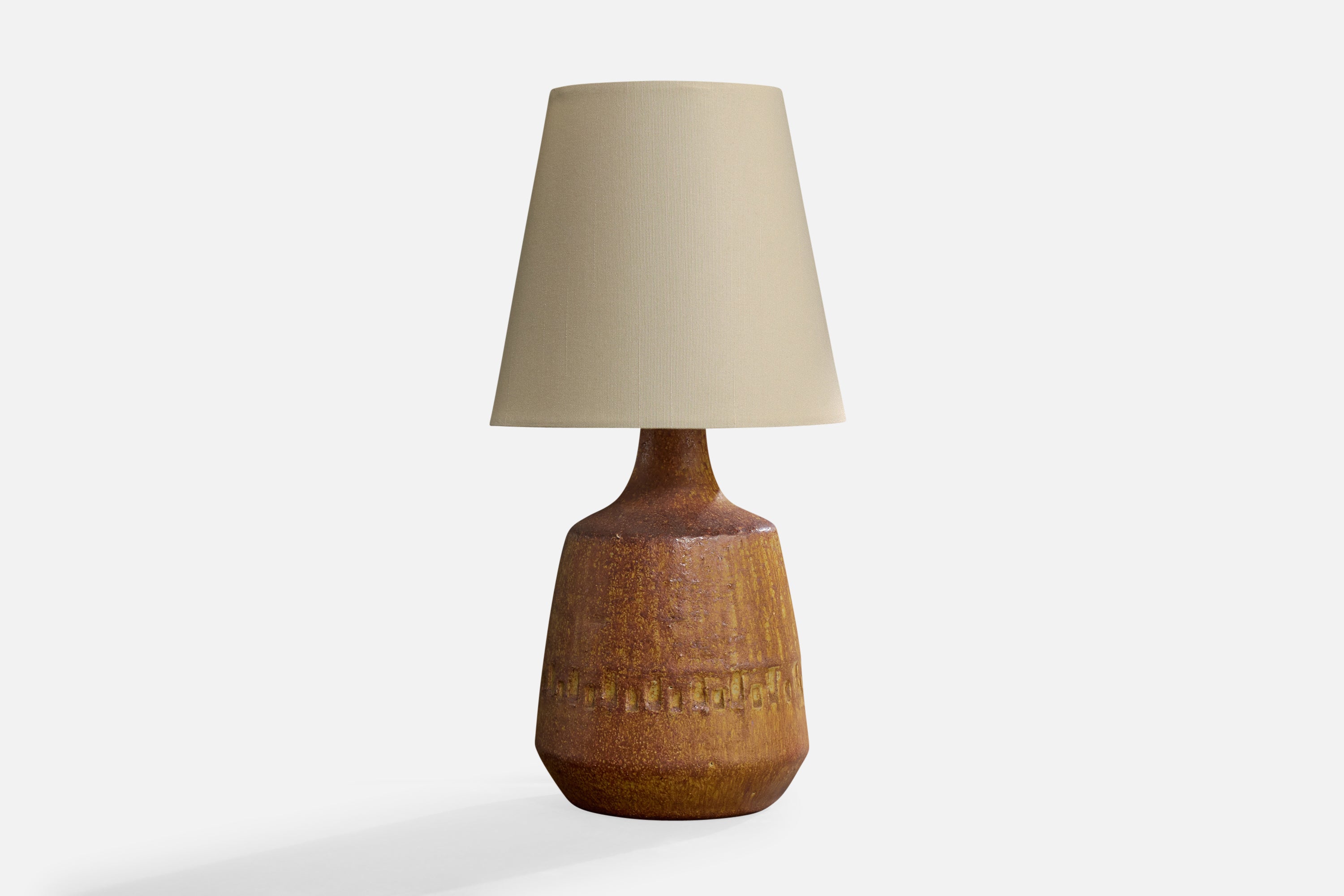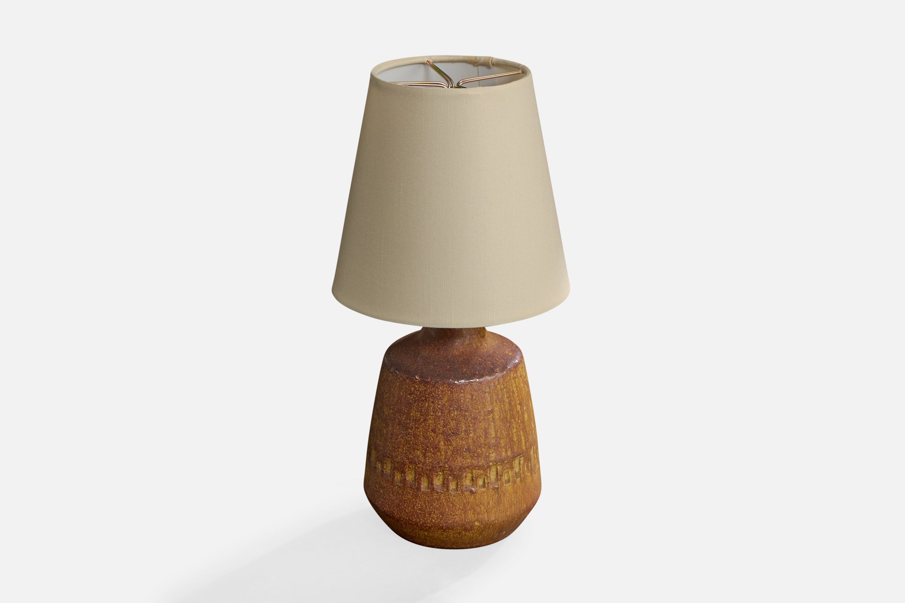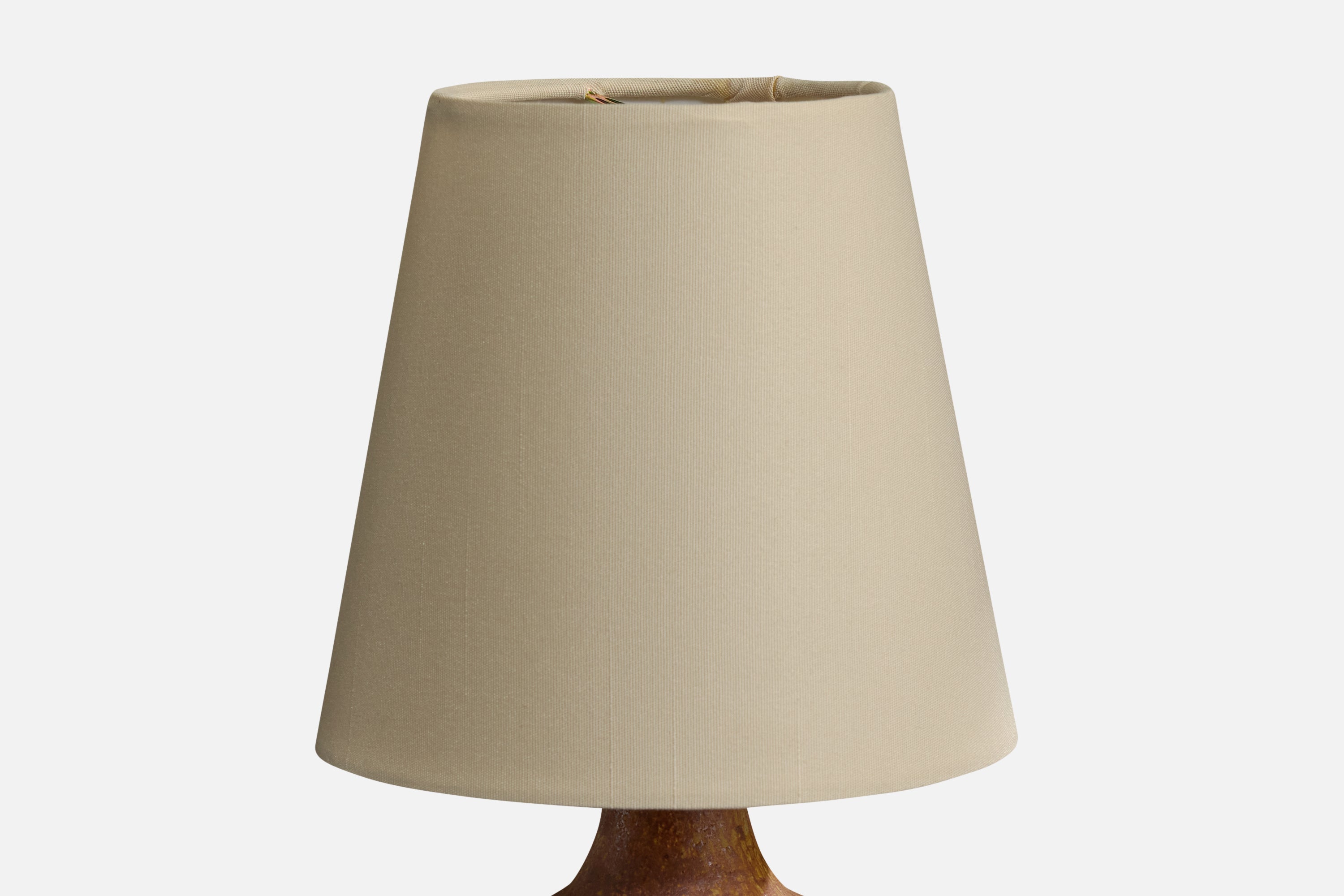 A brown-glazed ceramic and fabric table lamp designed and produced by Yngve Blixt, Höganäs, Sweden, c. 1950s.