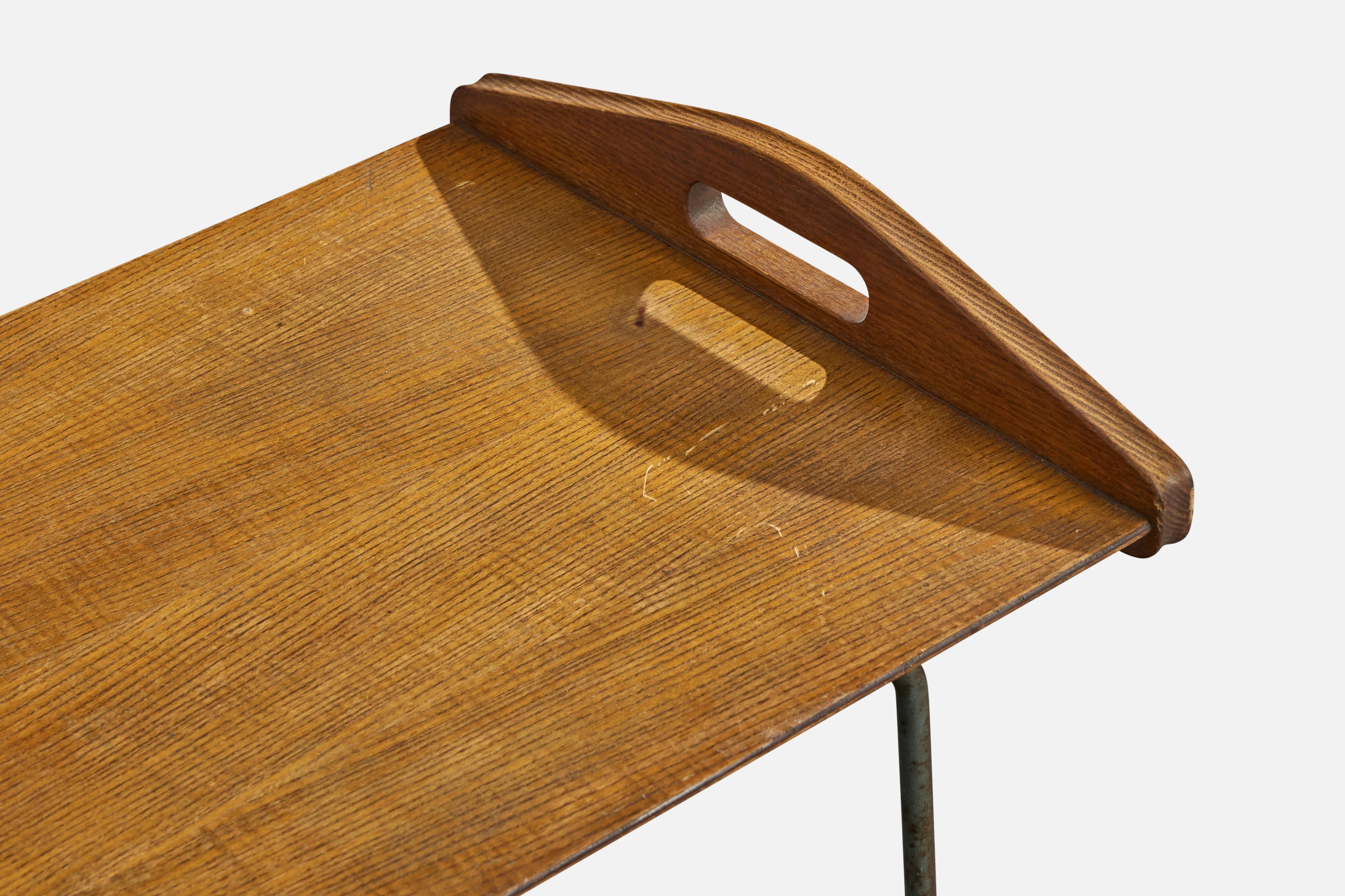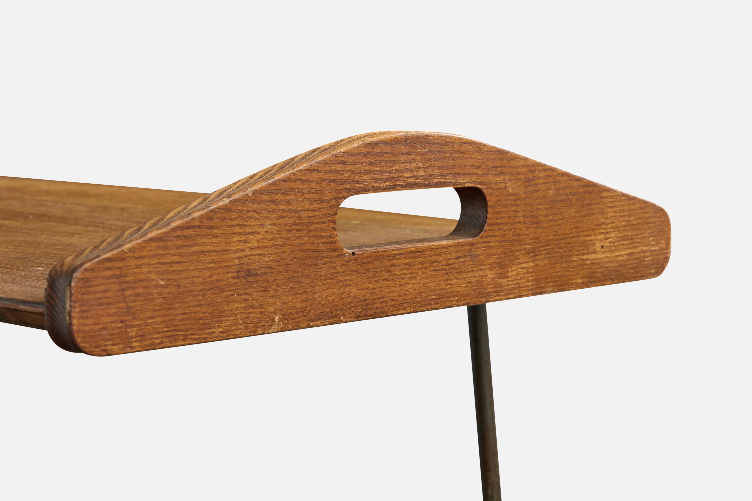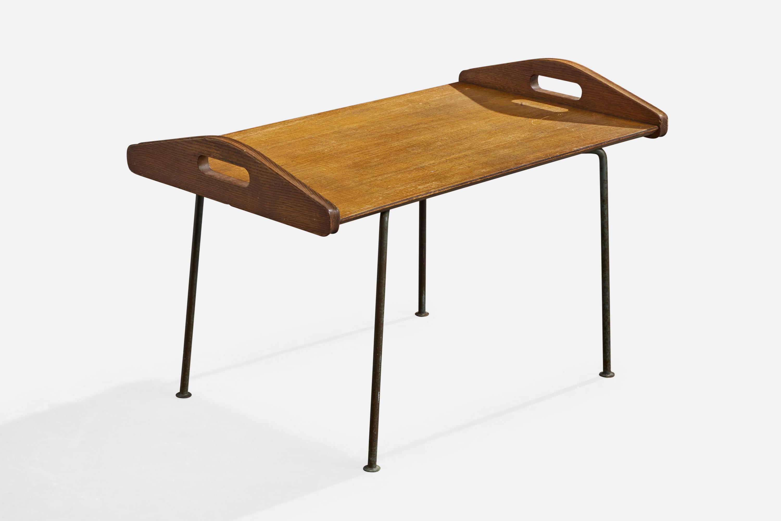 An oak and black-lacquered iron coffee table or side table likely designed and produced in France, c. 1950s.