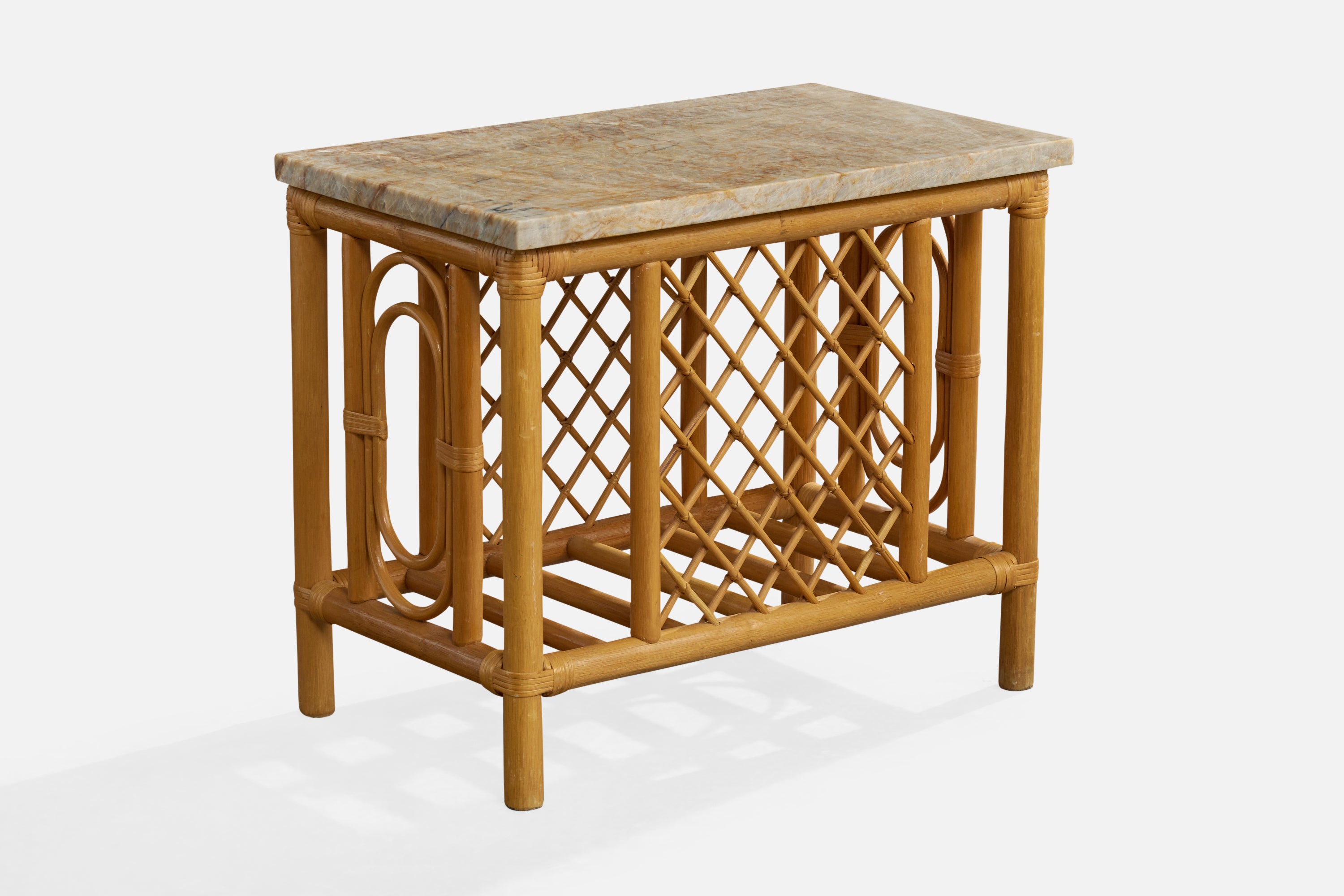 A pair of bamboo, rattan and marble side tables designed and produced in the US, c. 1960s.