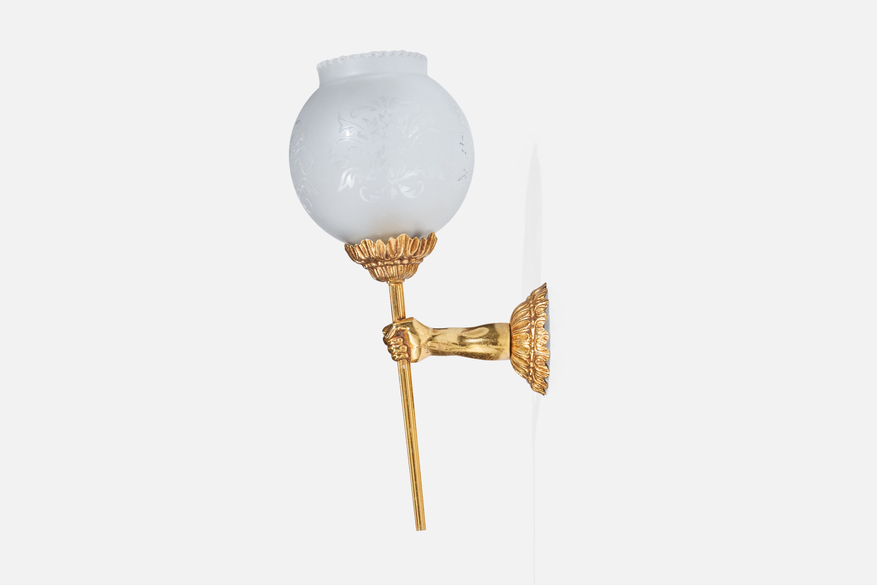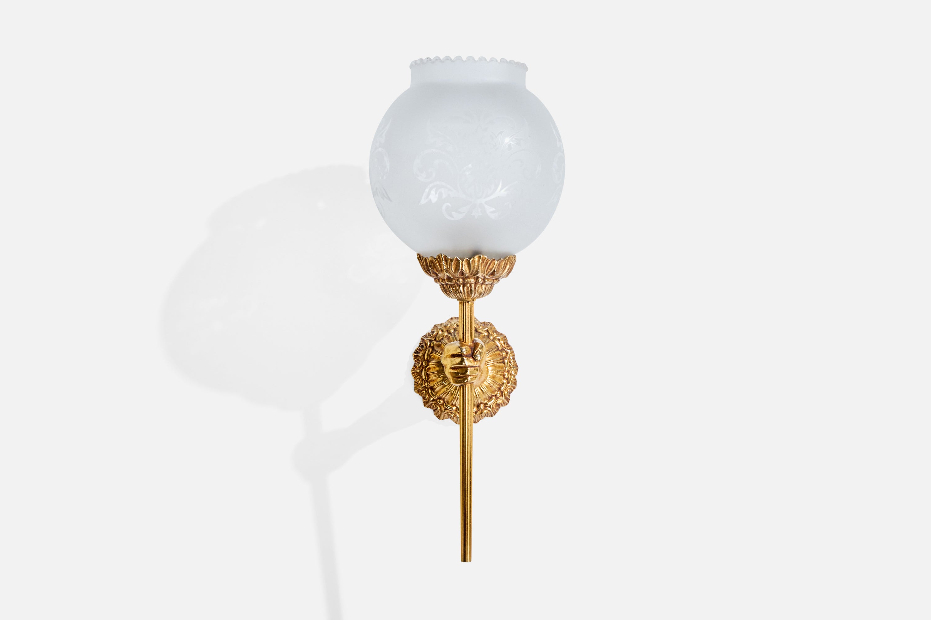 A brass and etched glass wall light designed and produced in France, c. 1950s.