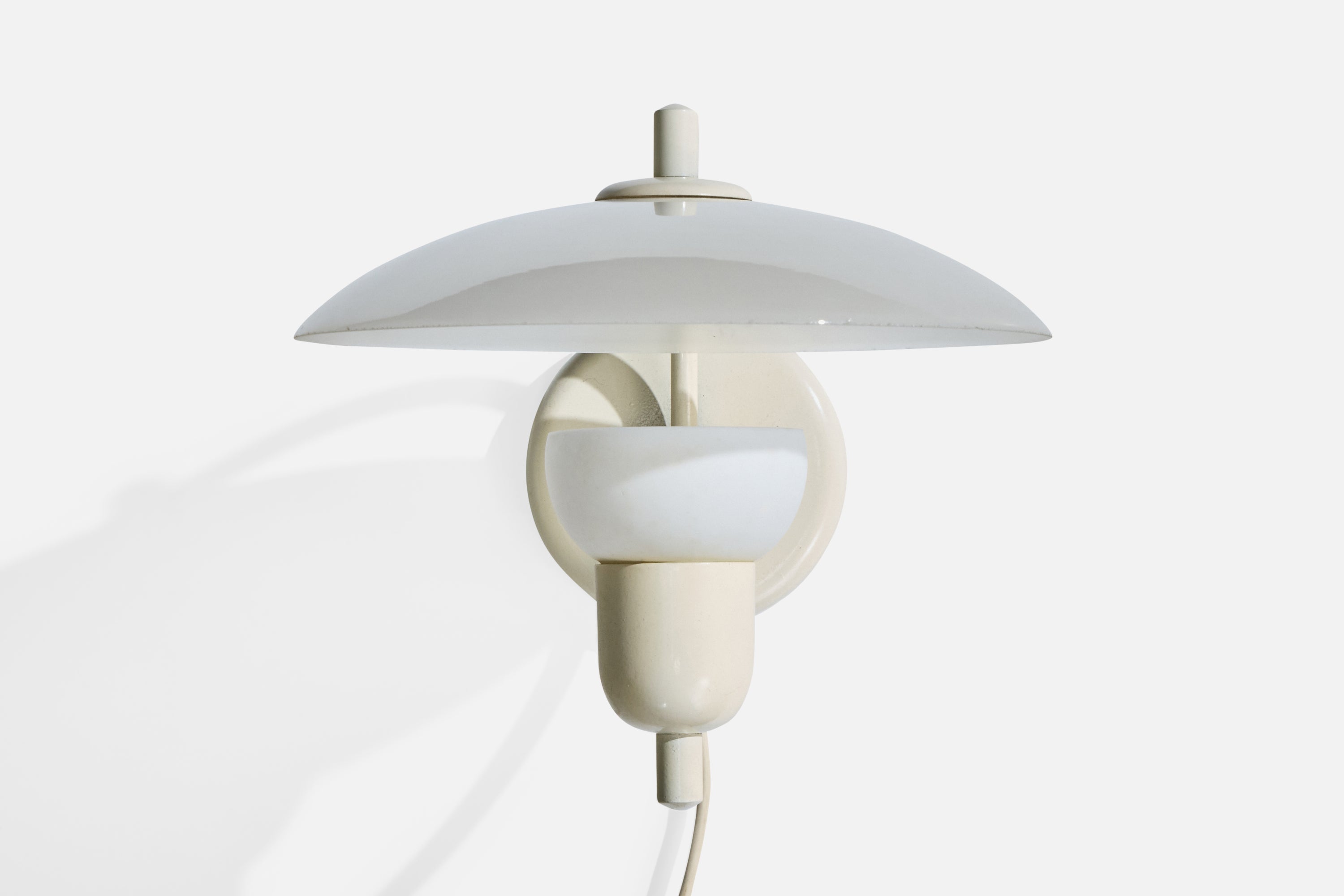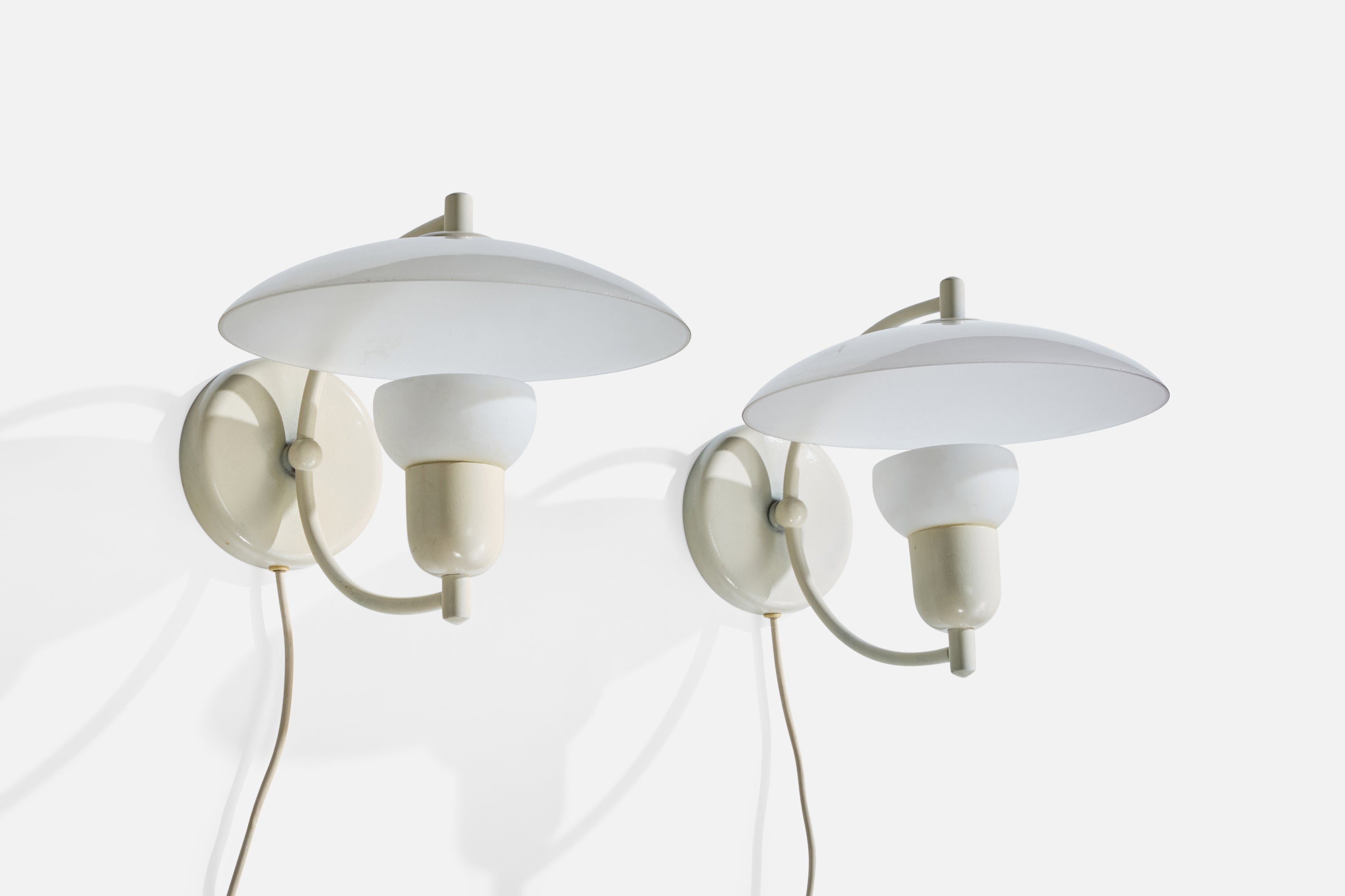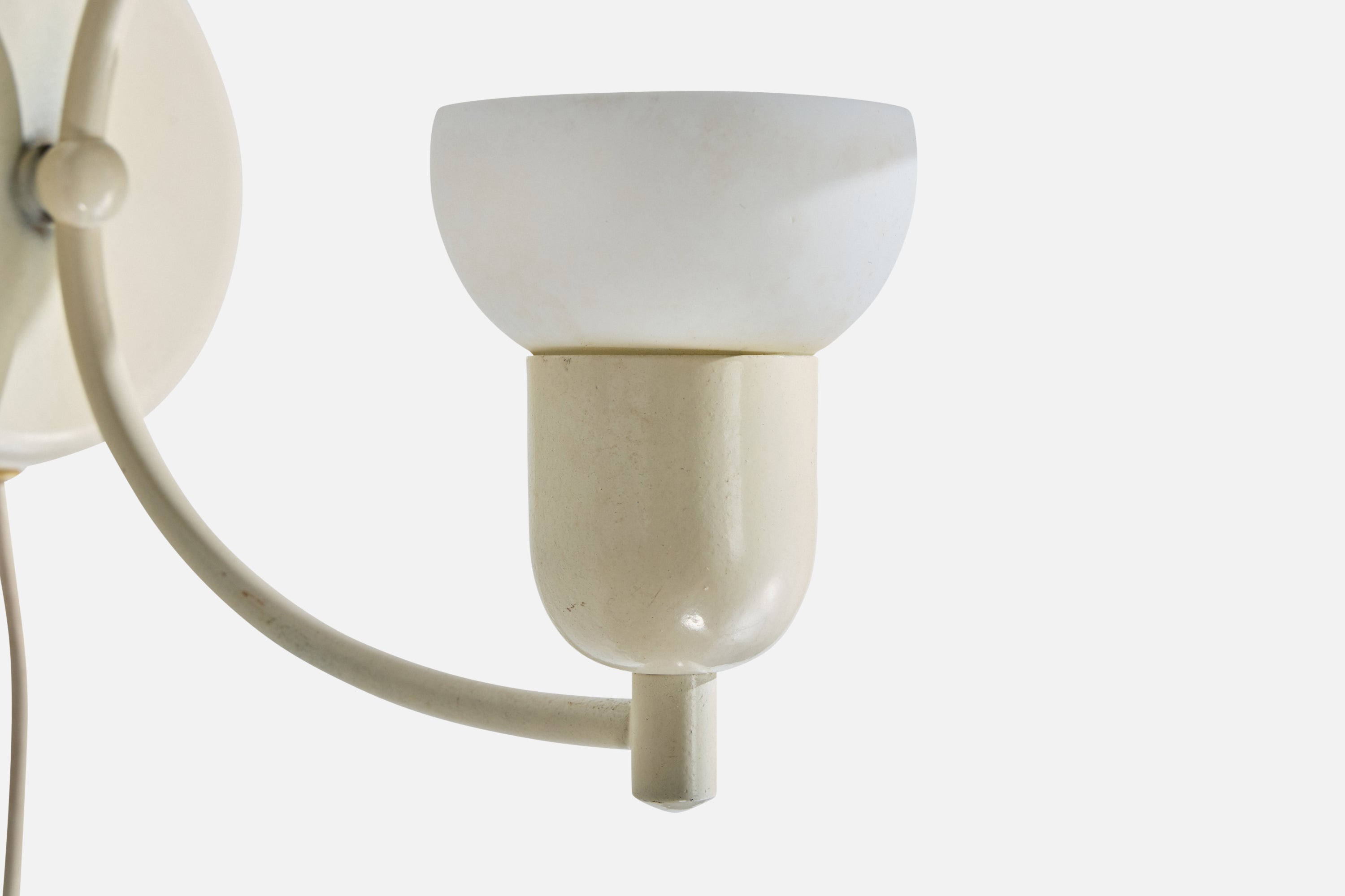 A pair of off-white lacquered metal and opaline white glass wall lights designed and produced in Denmark, c. 1940s.