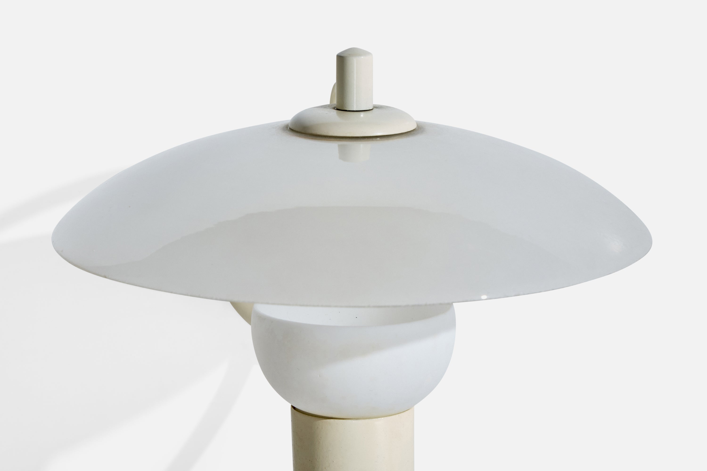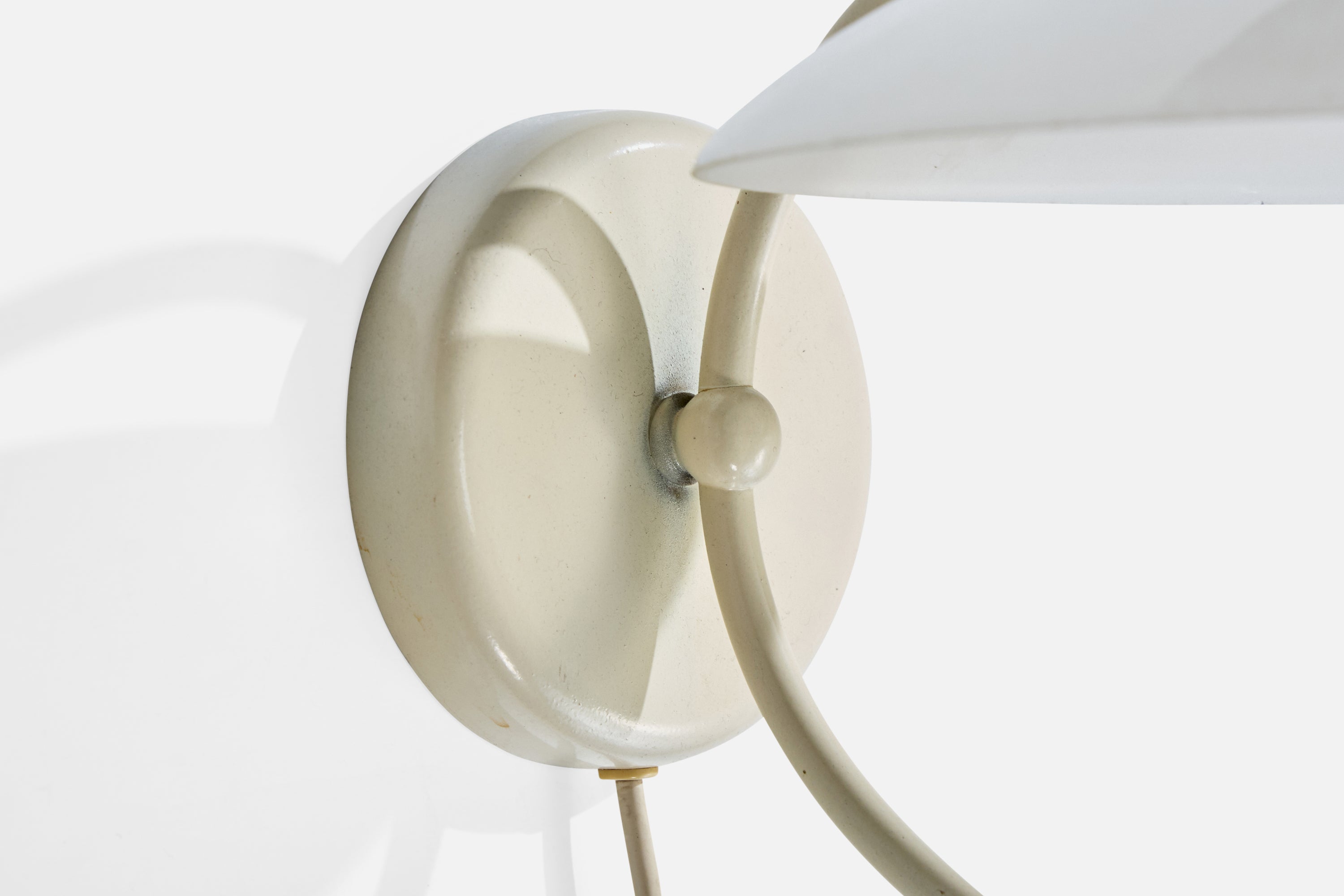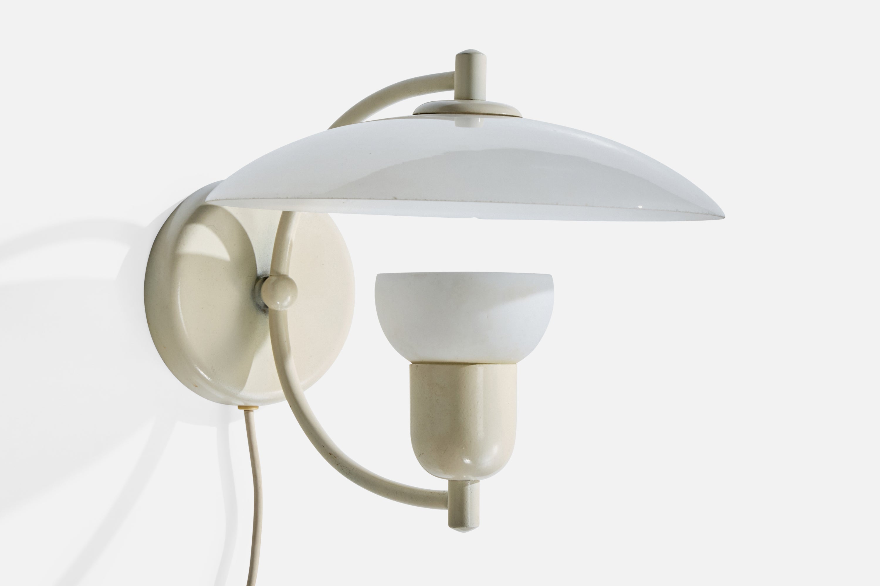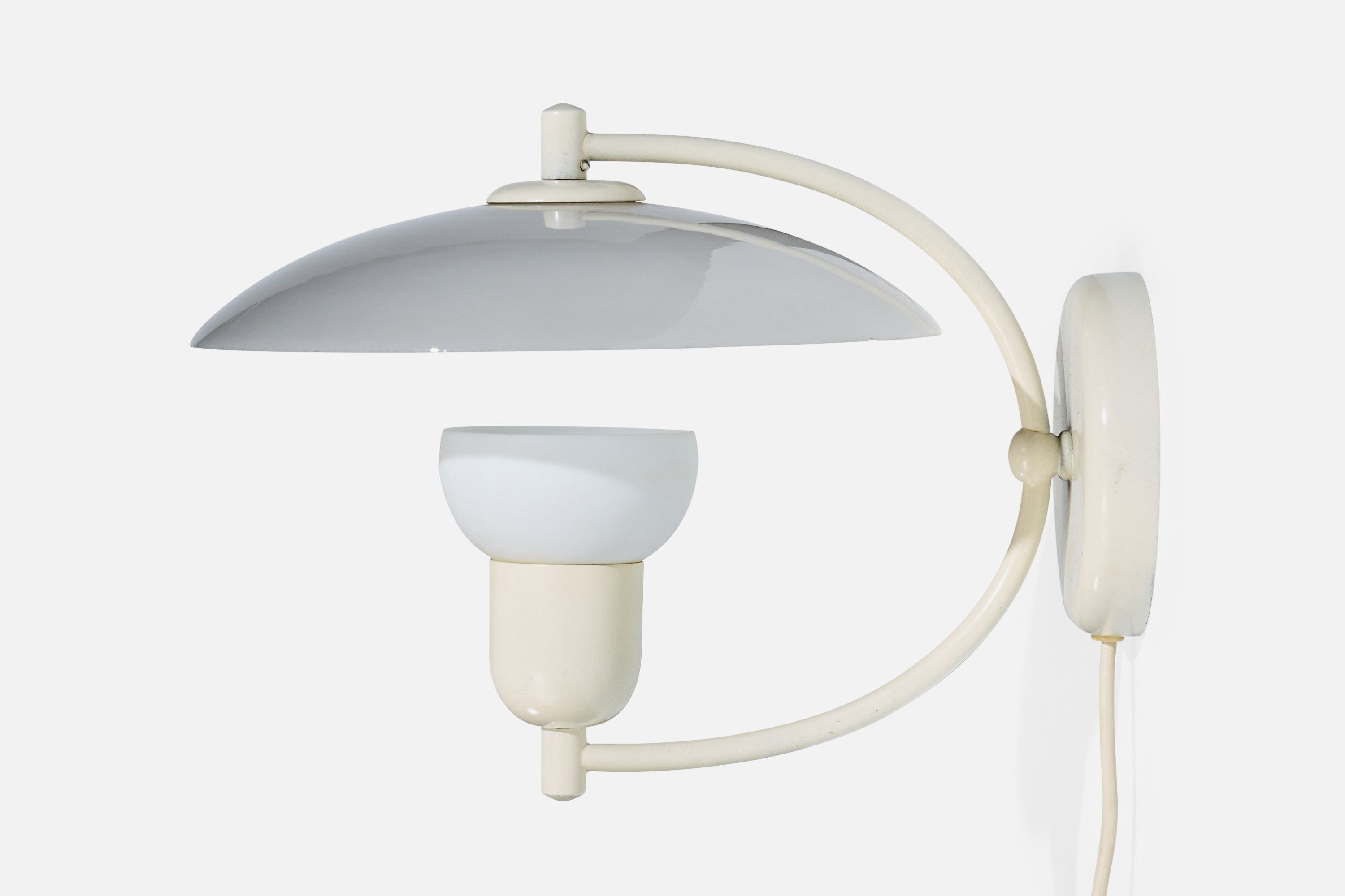 A pair of off-white lacquered metal and opaline white glass wall lights designed and produced in Denmark, c. 1940s.