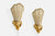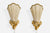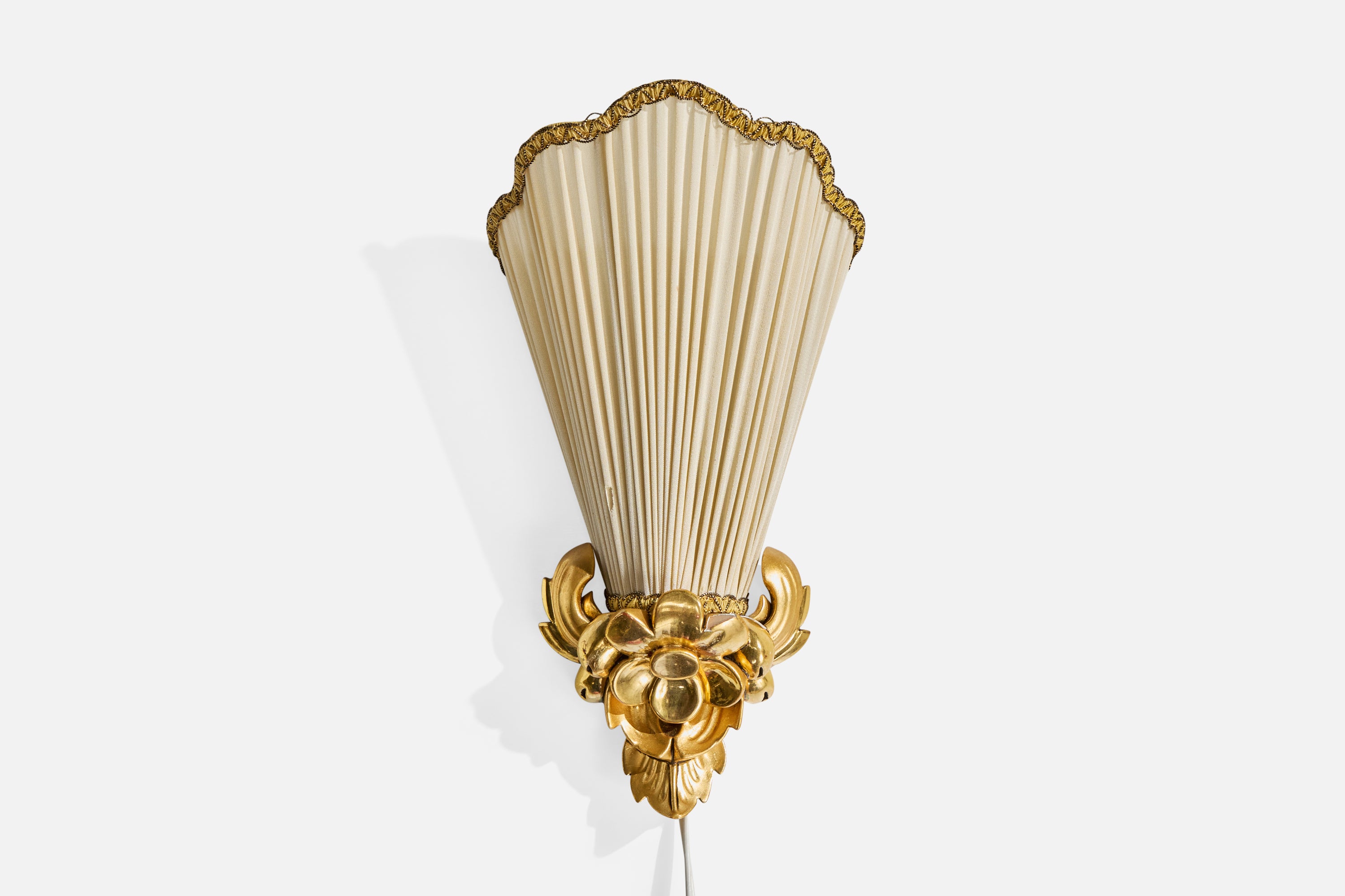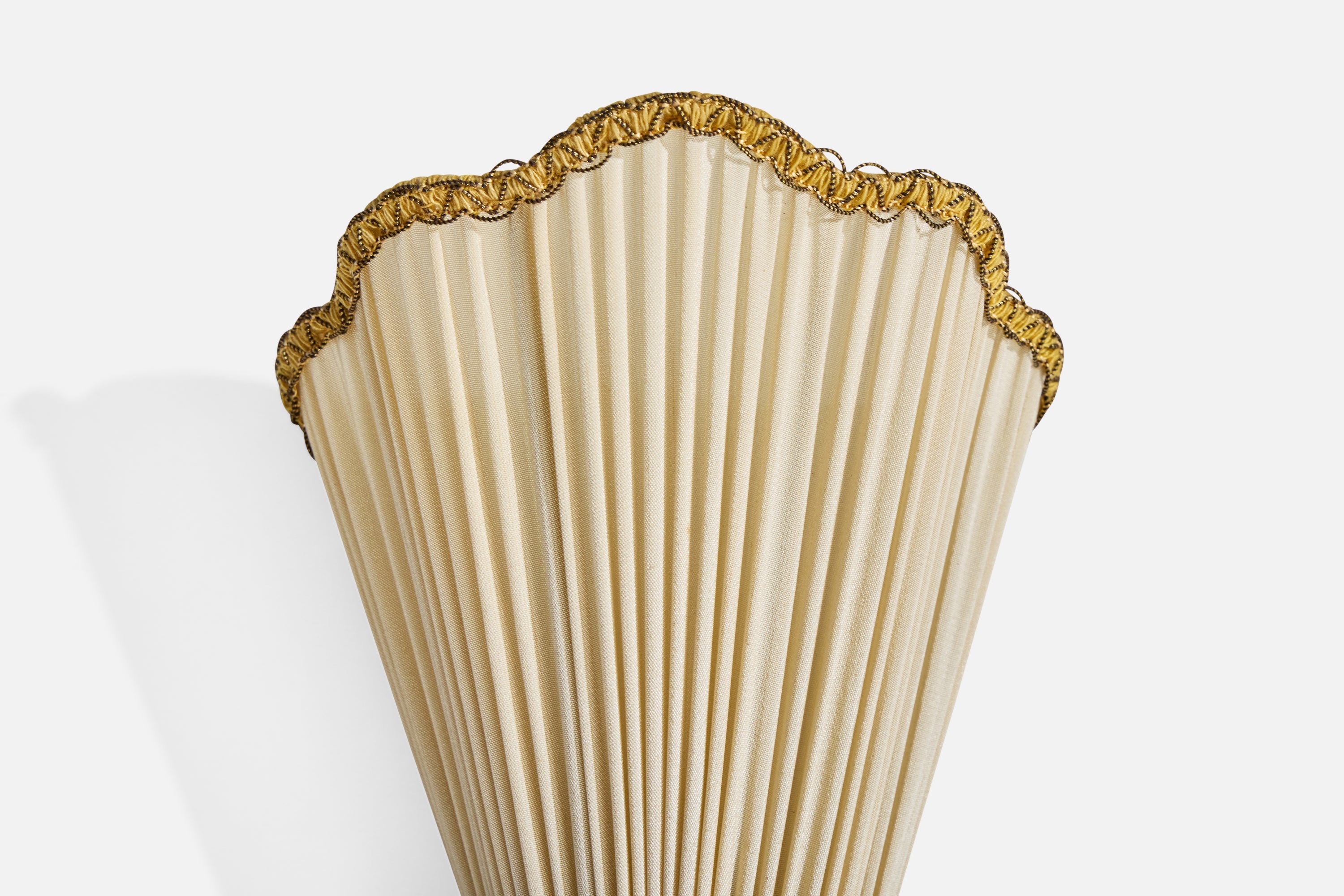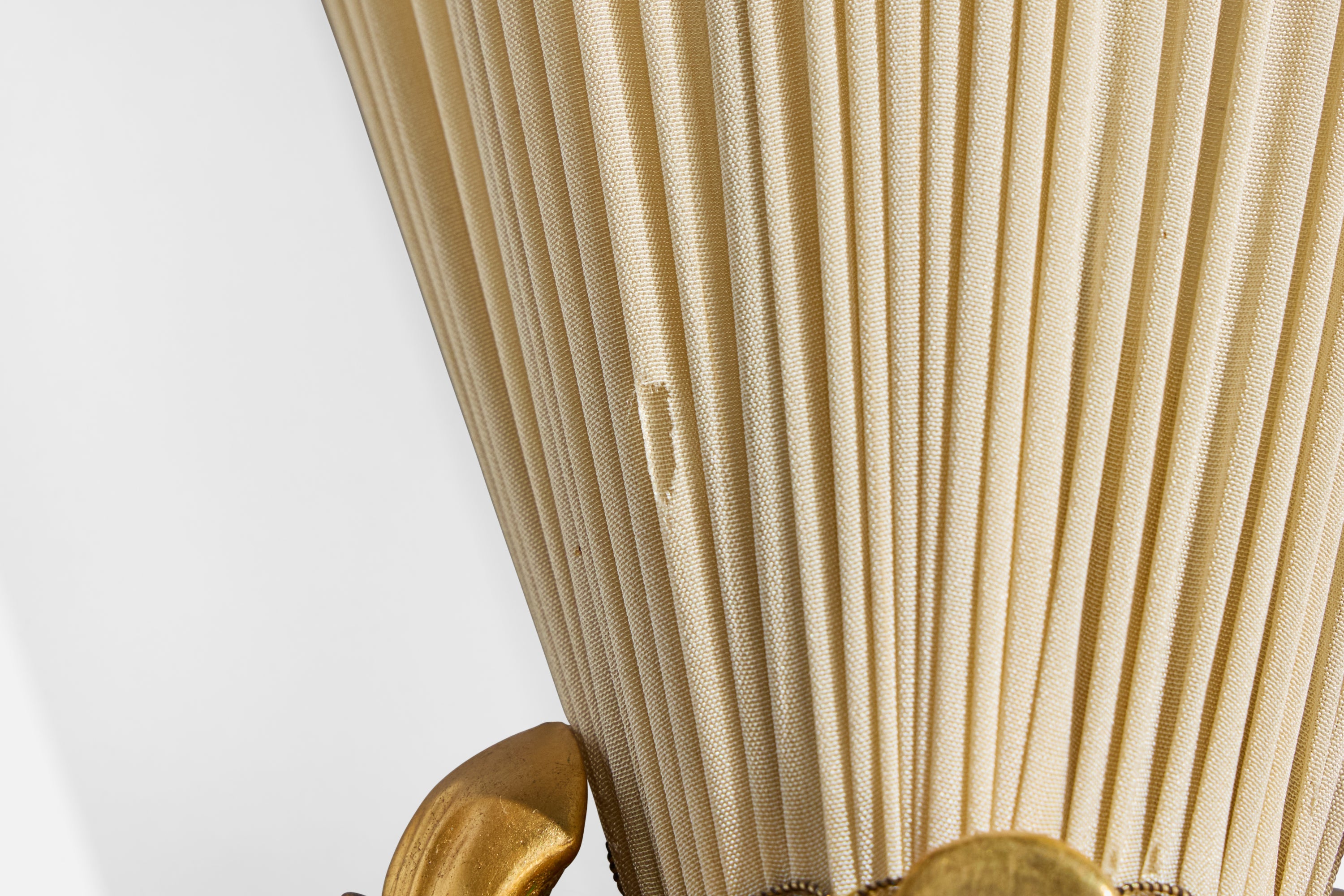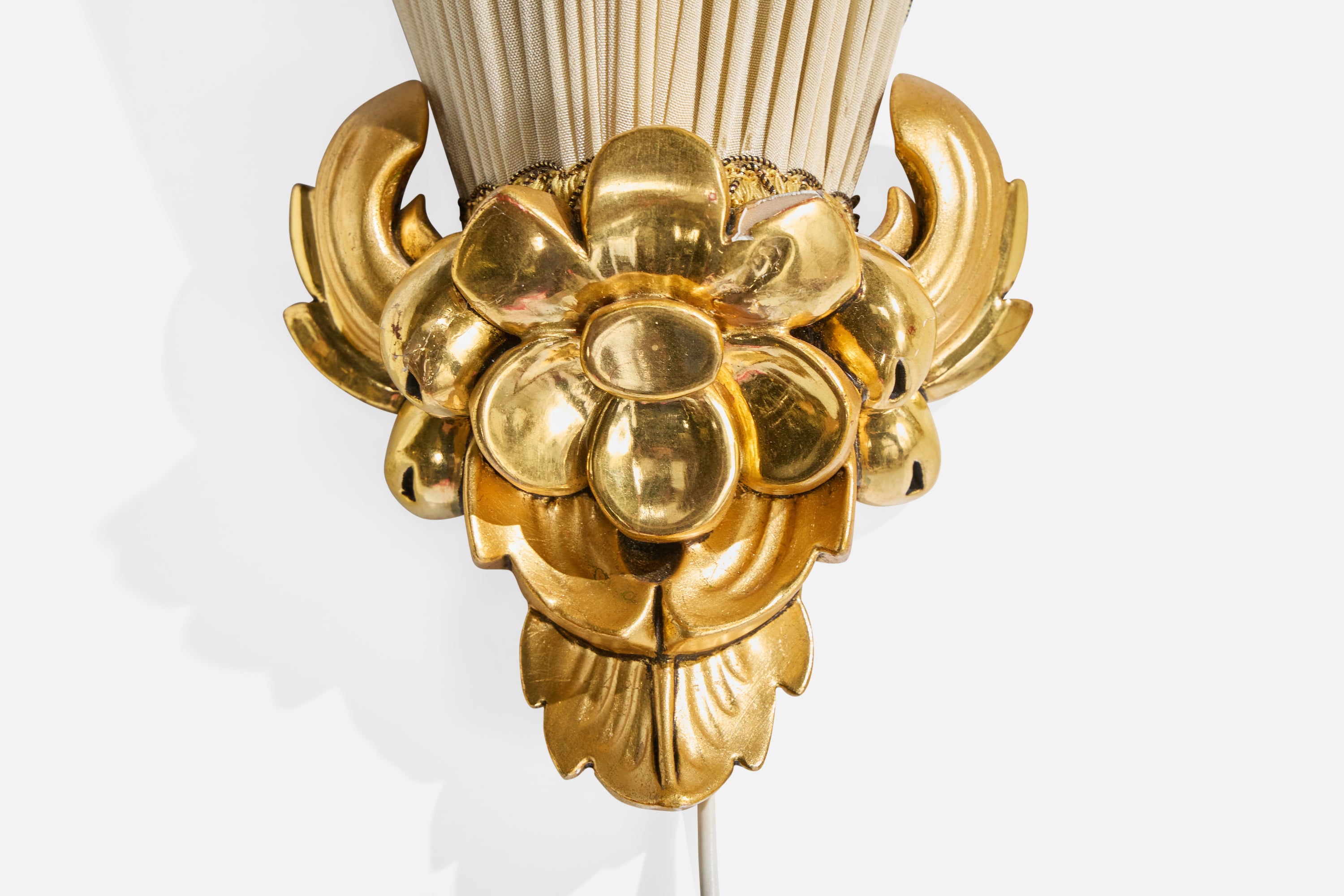 A pair of gold-painted wood or plaster and beige fabric wall lights designed and produced in Sweden, c. 1940s.