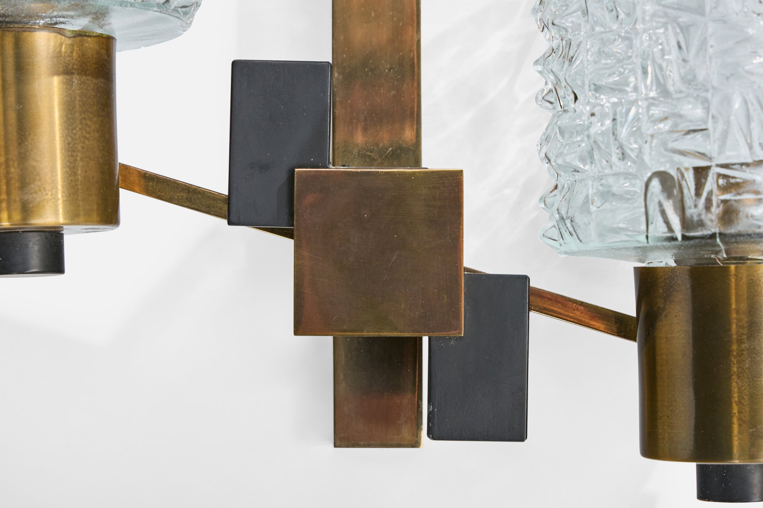 A brass, black-lacquered metal and glass wall light designed and produced in France, c. 1950s.