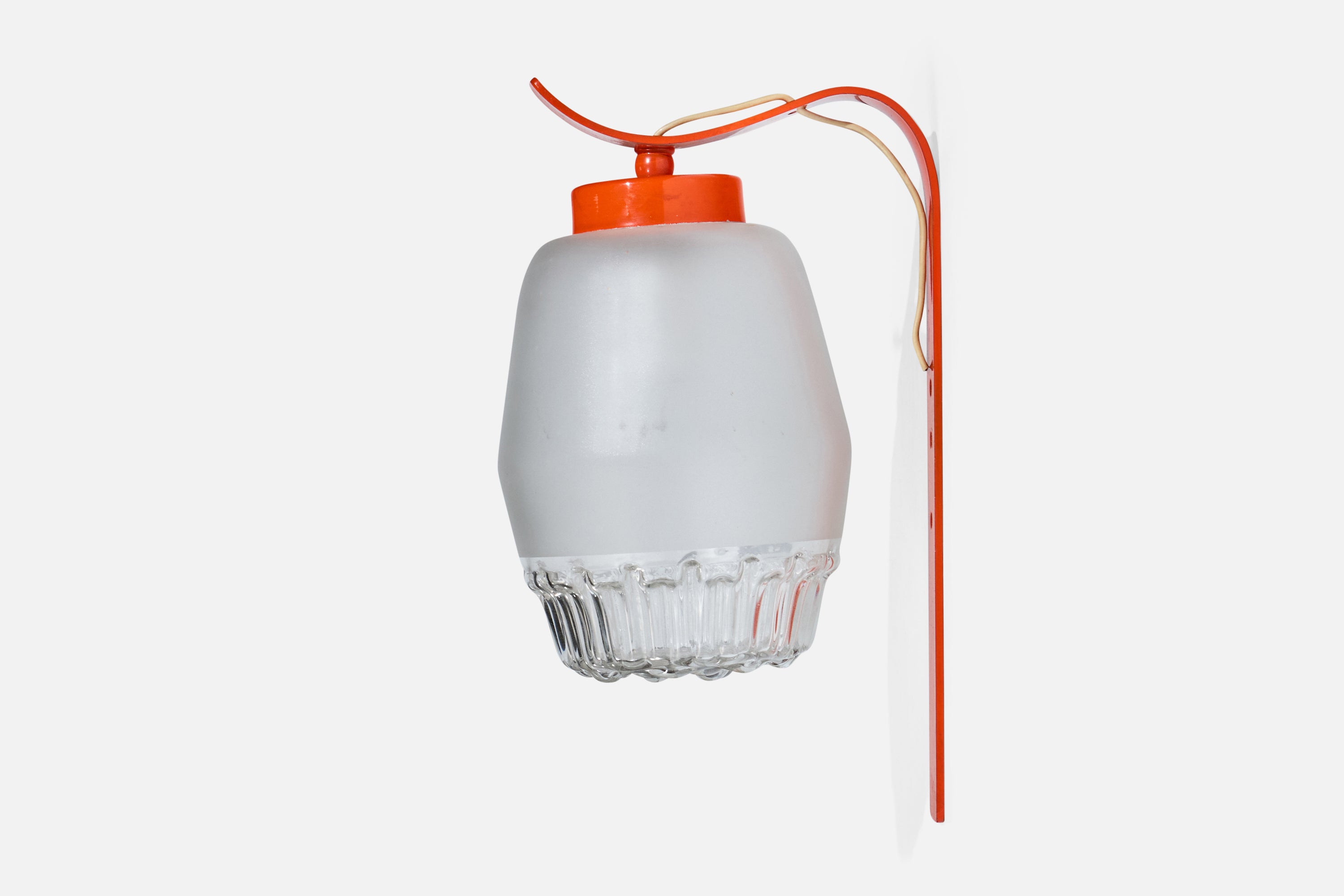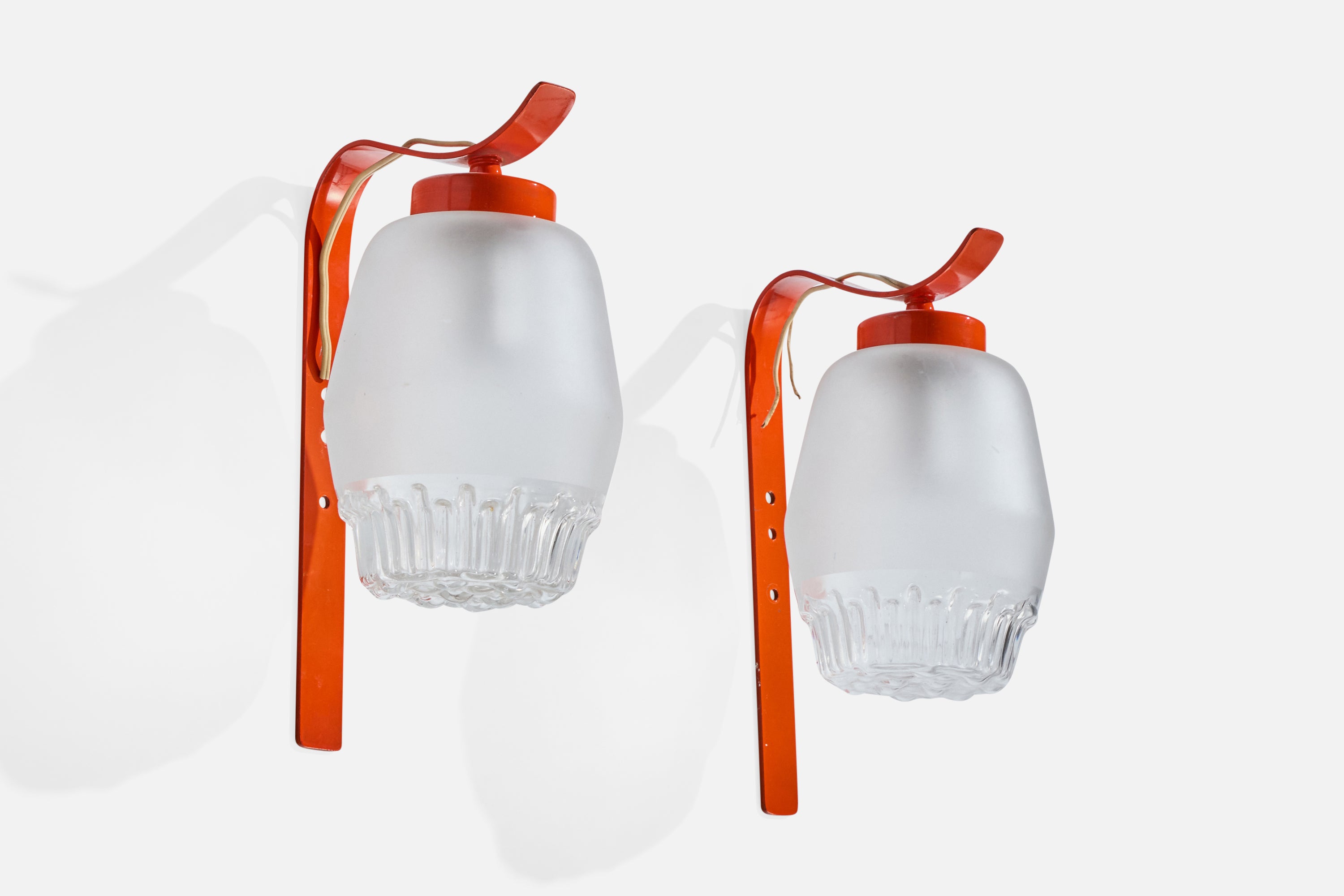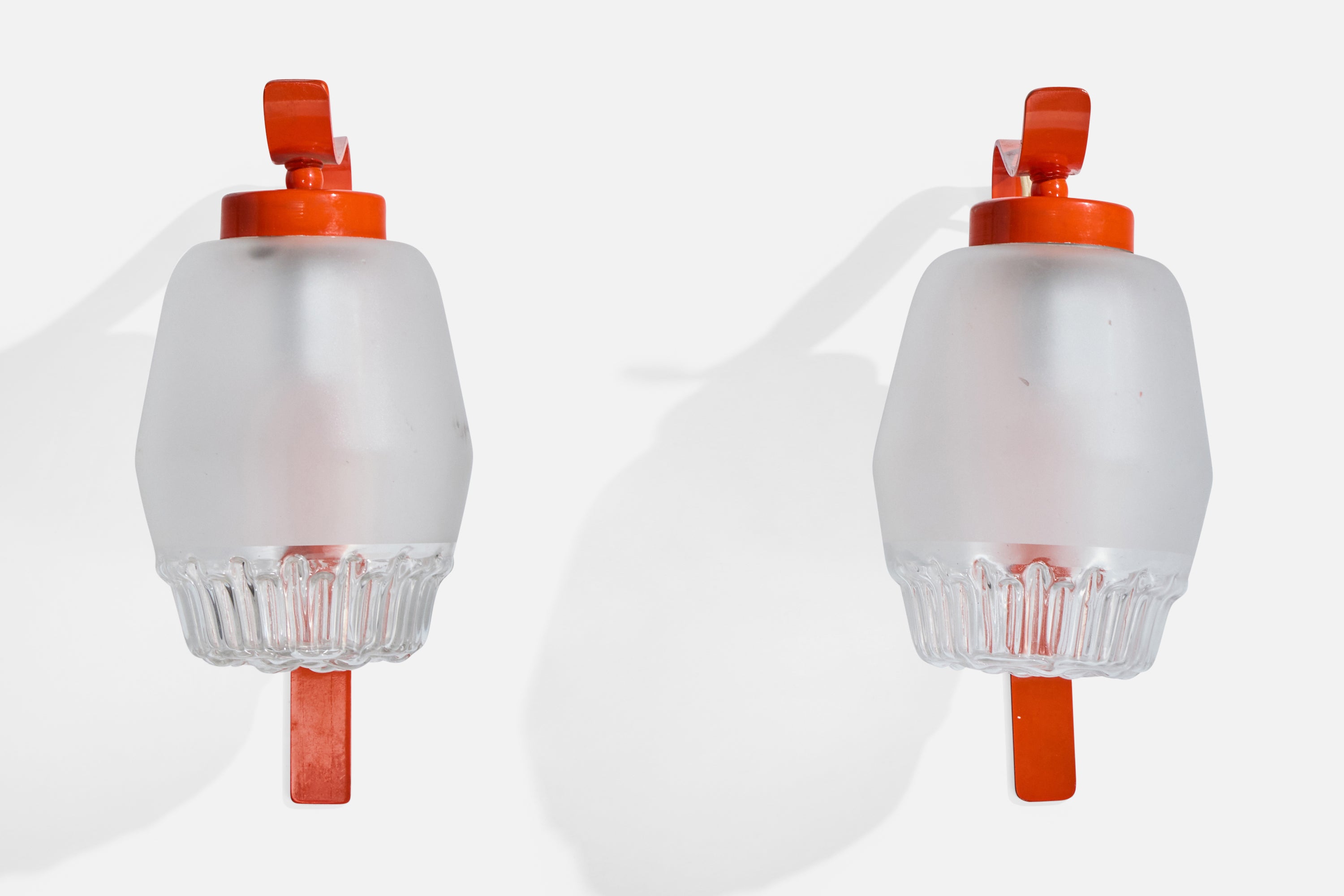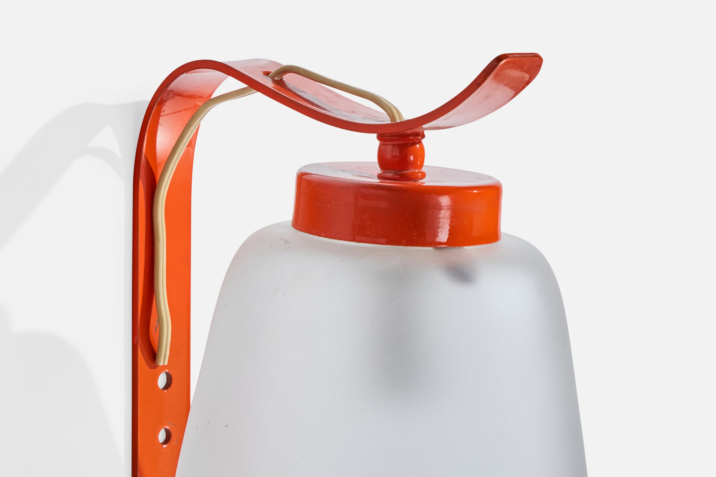A pair of orange-lacquered metal and opaline glass wall lights likely designed and produced in Italy, c. 1970s.