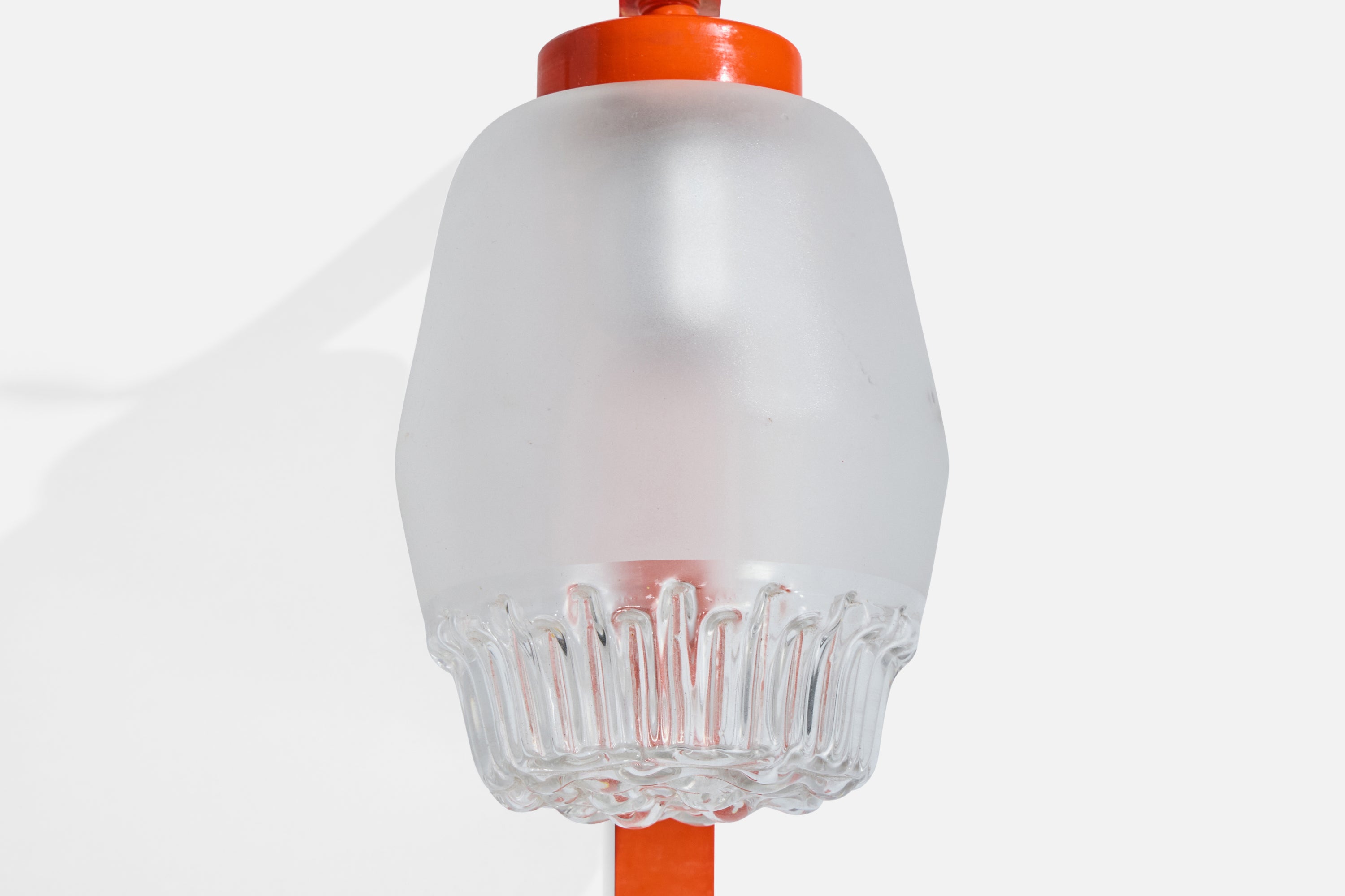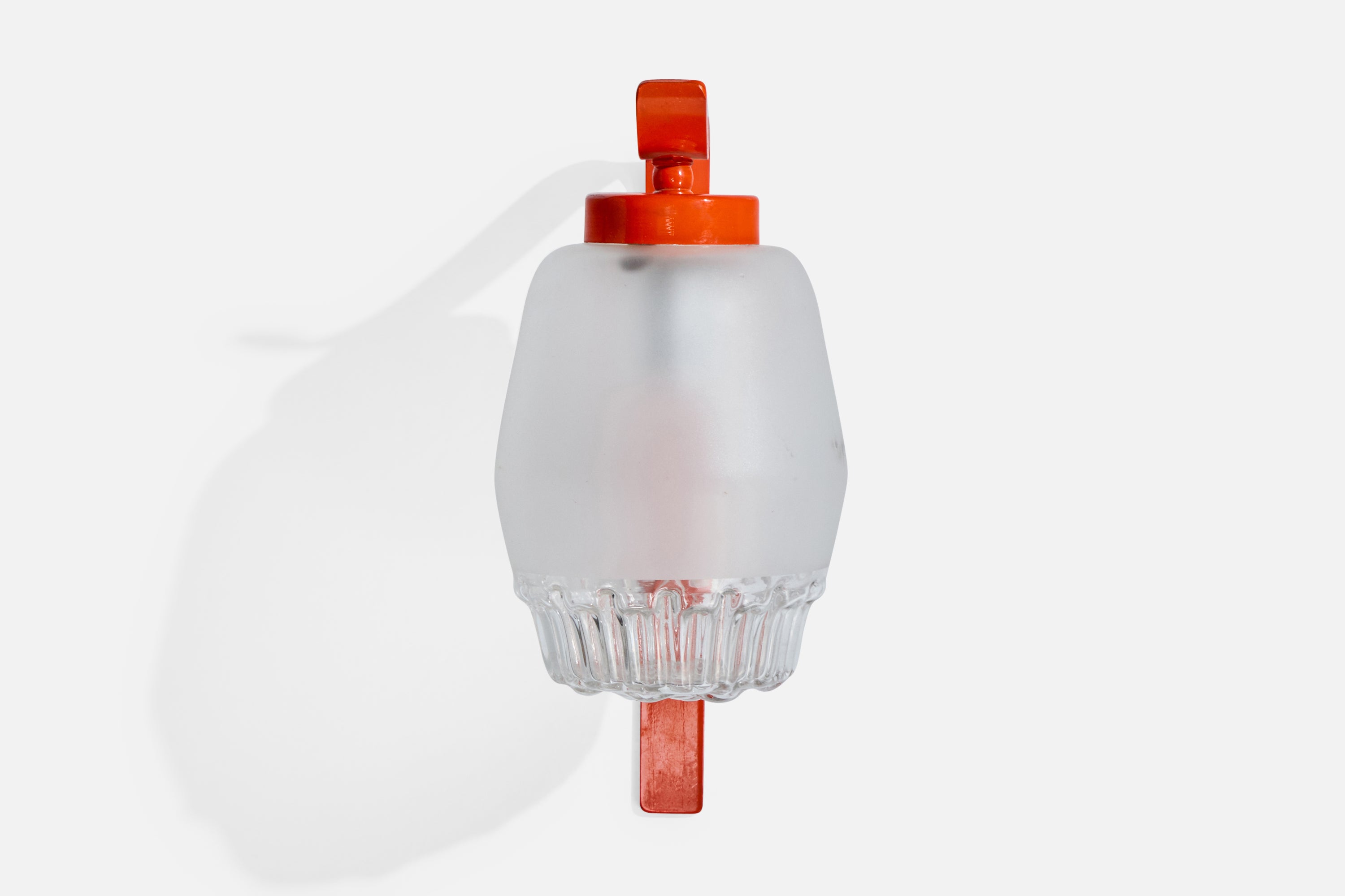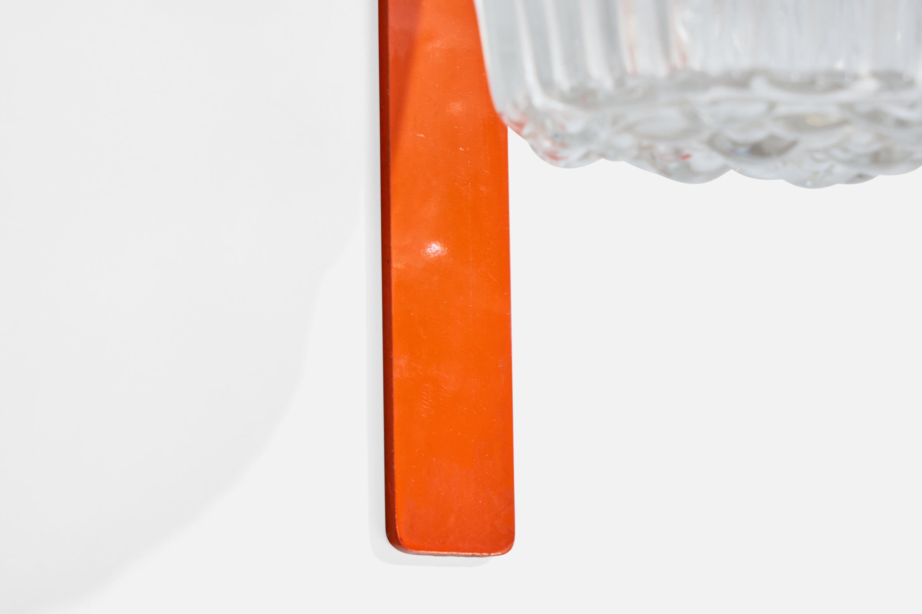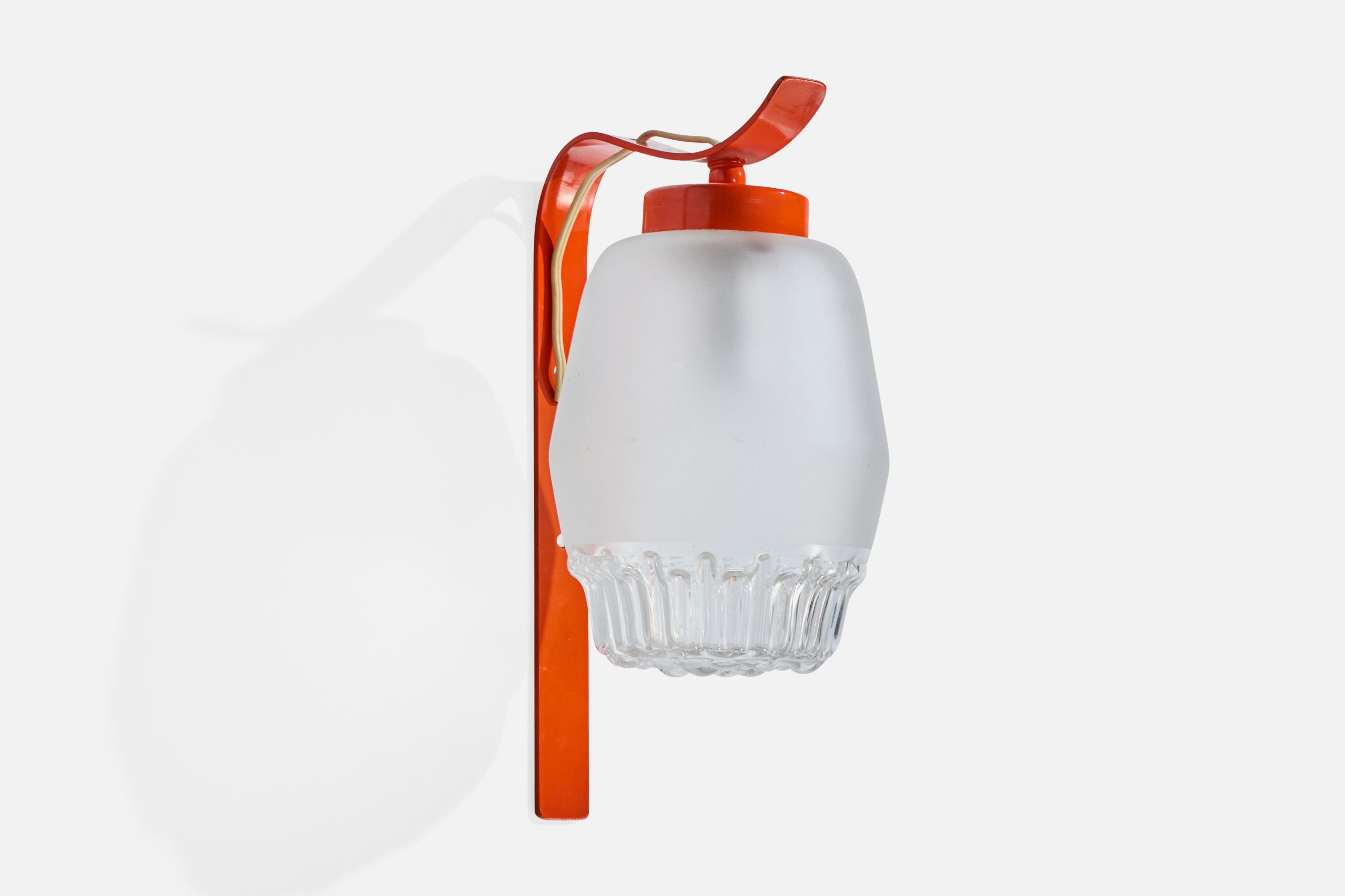 A pair of orange-lacquered metal and opaline glass wall lights likely designed and produced in Italy, c. 1970s.