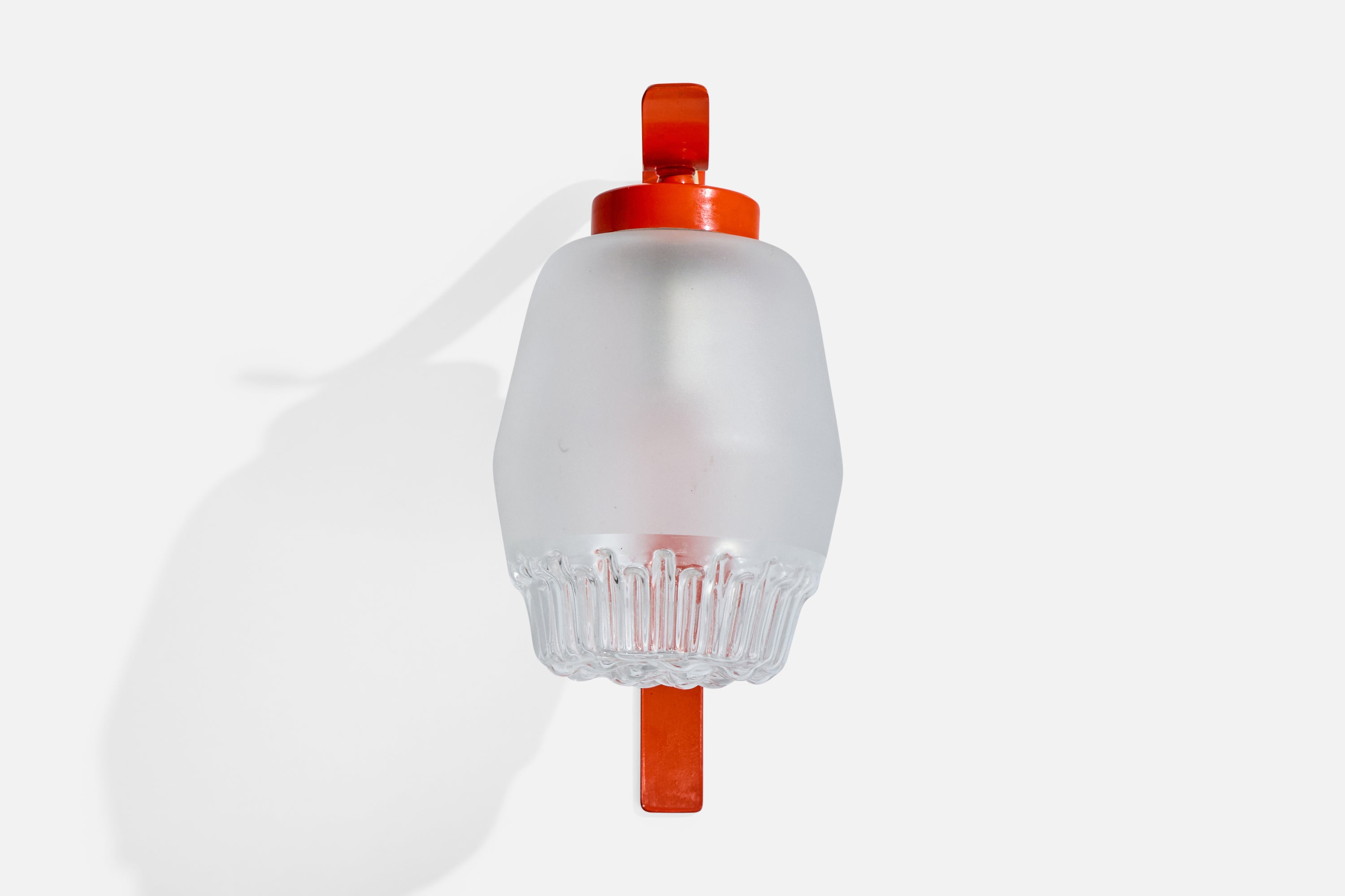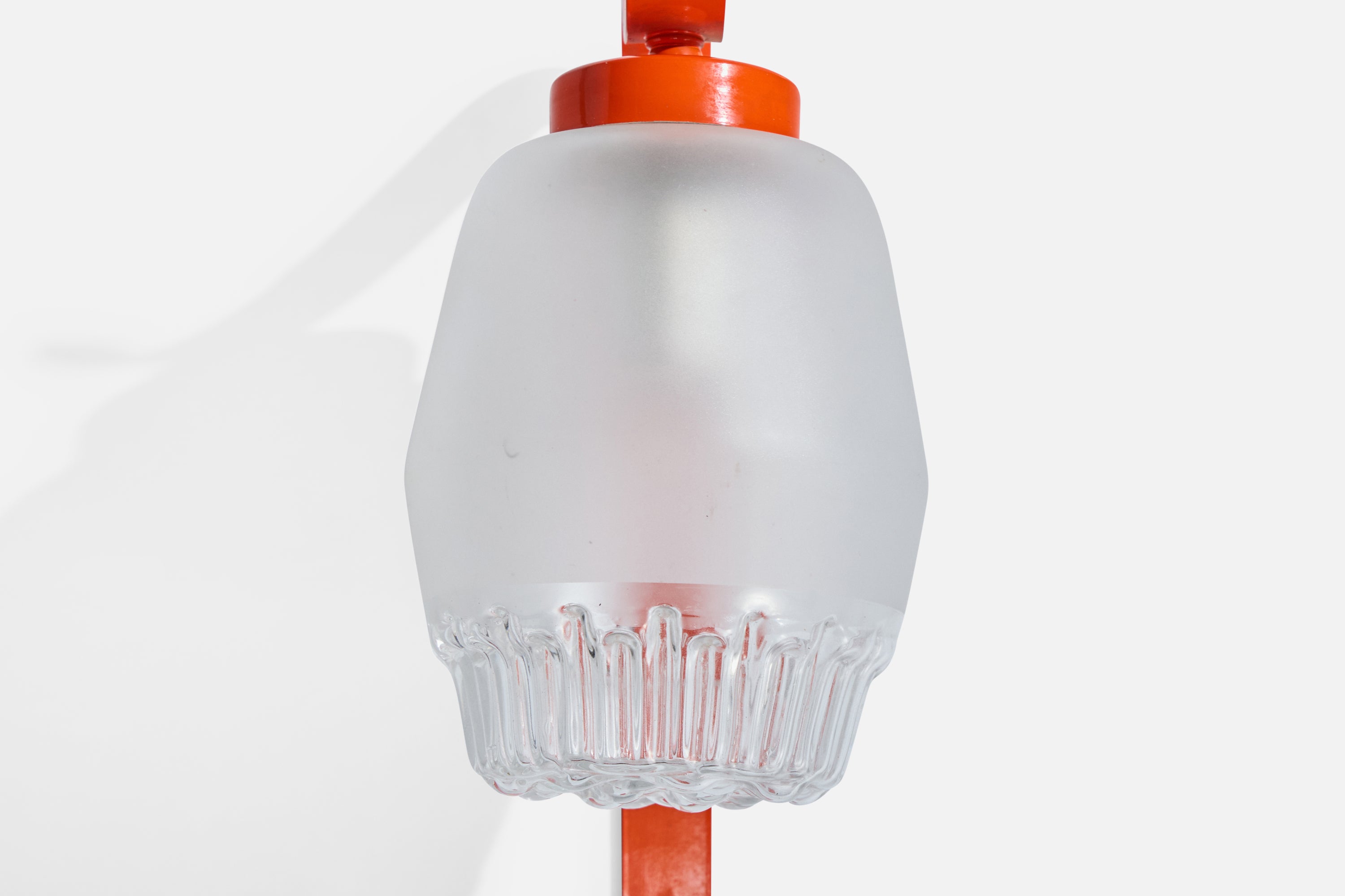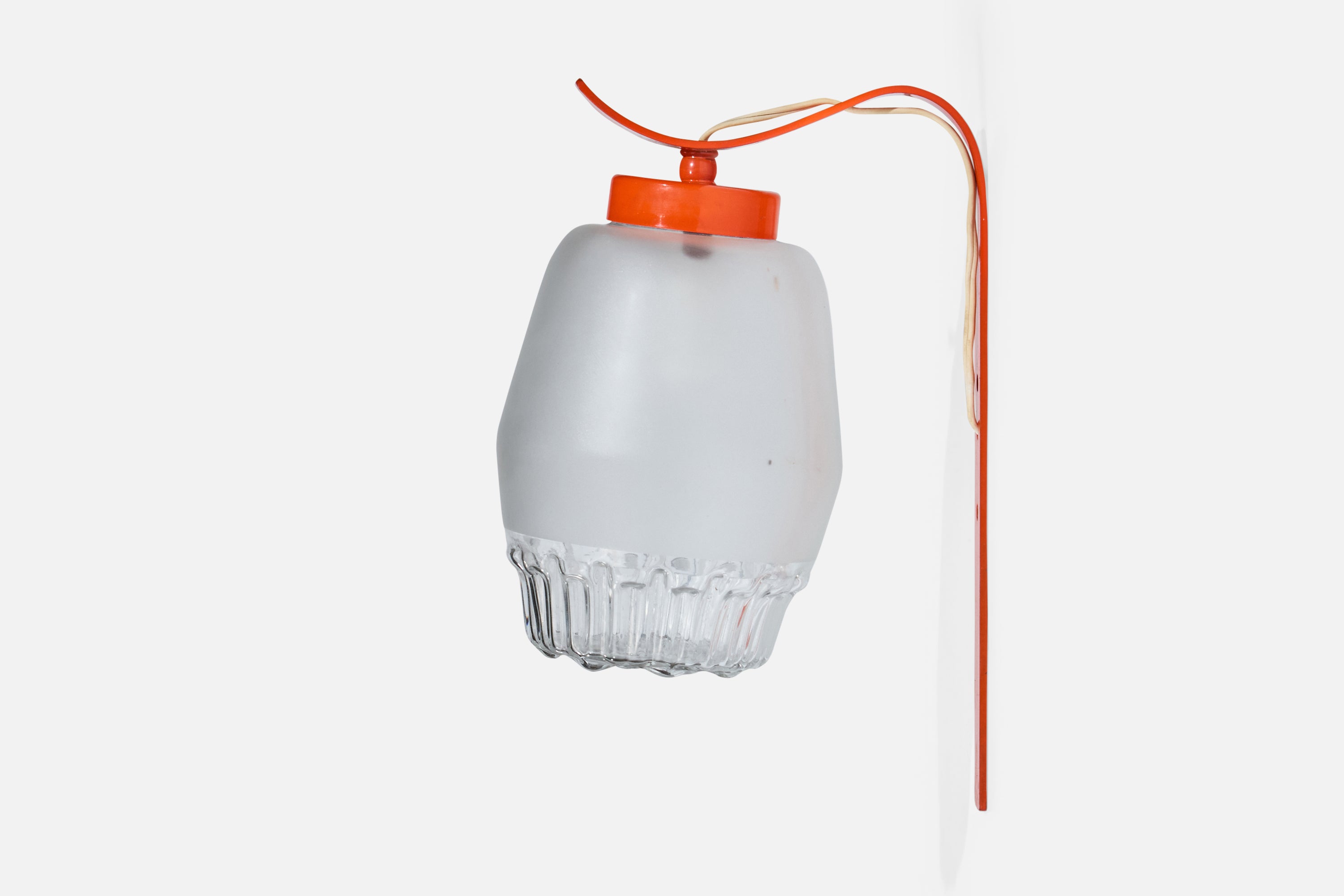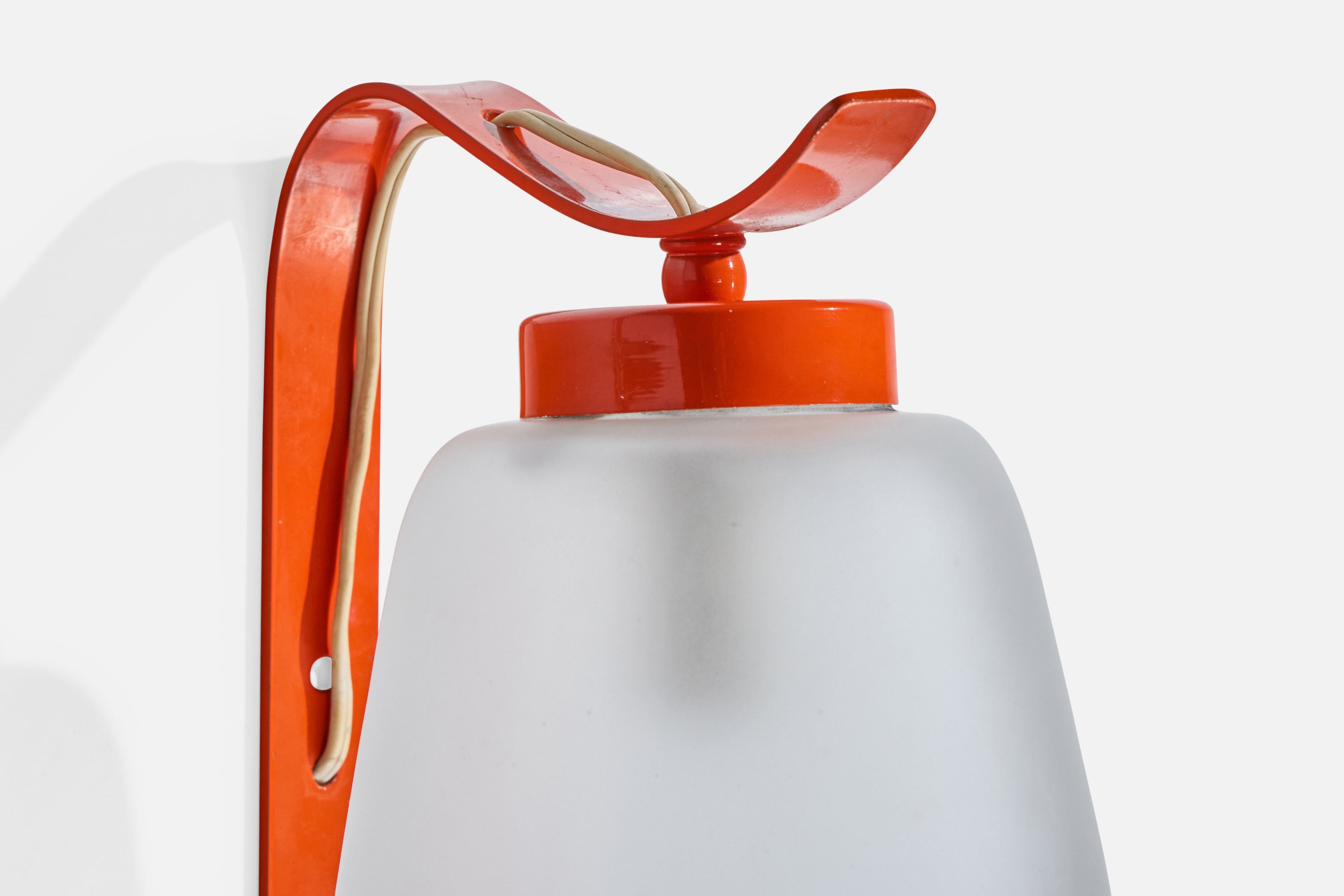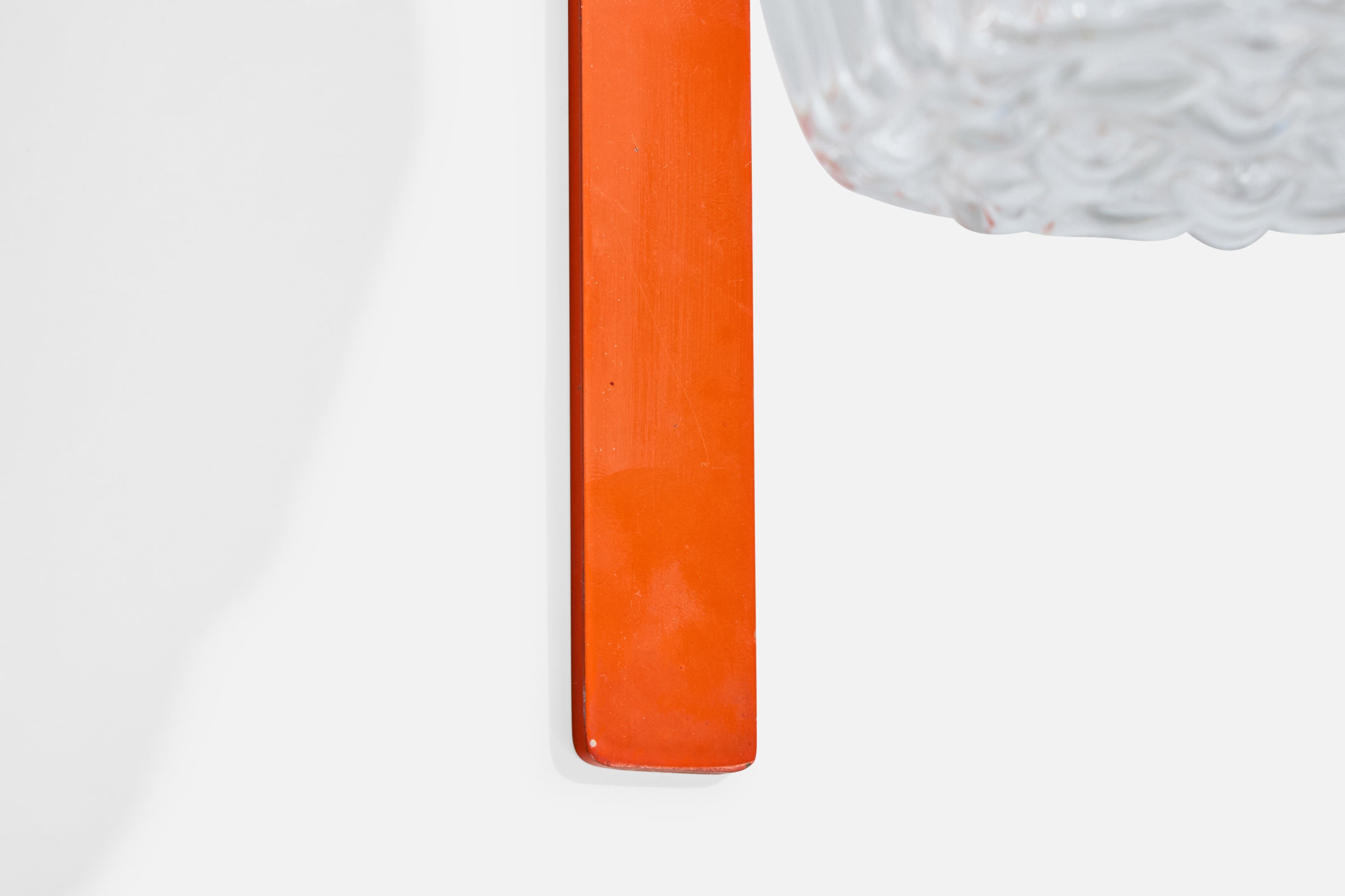 An orange-lacquered metal and opaline glass wall light likely designed and produced in Italy, c. 1970s.