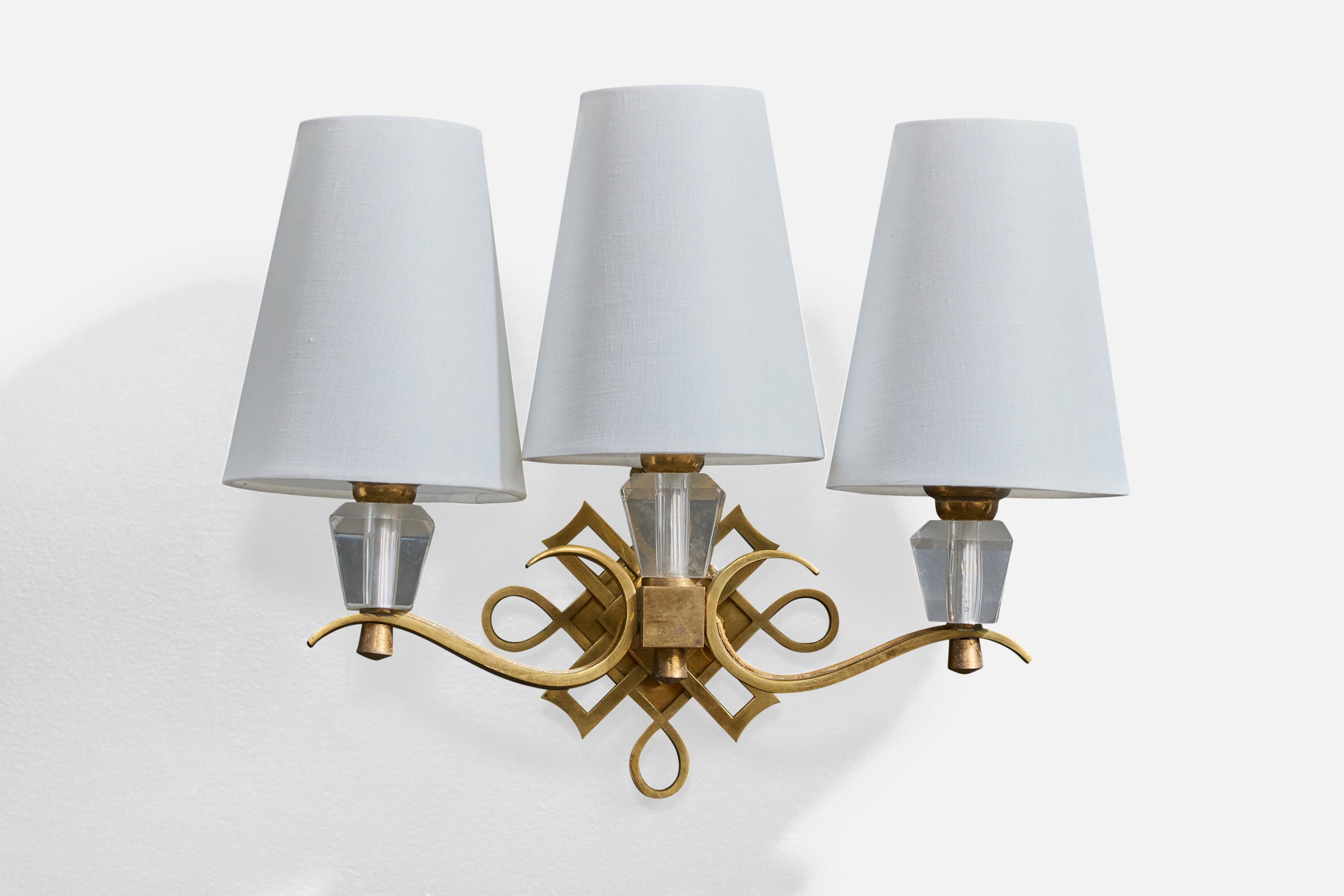 A brass, acrylic and white fabric wall light designed and produced in France, c. 1950s.