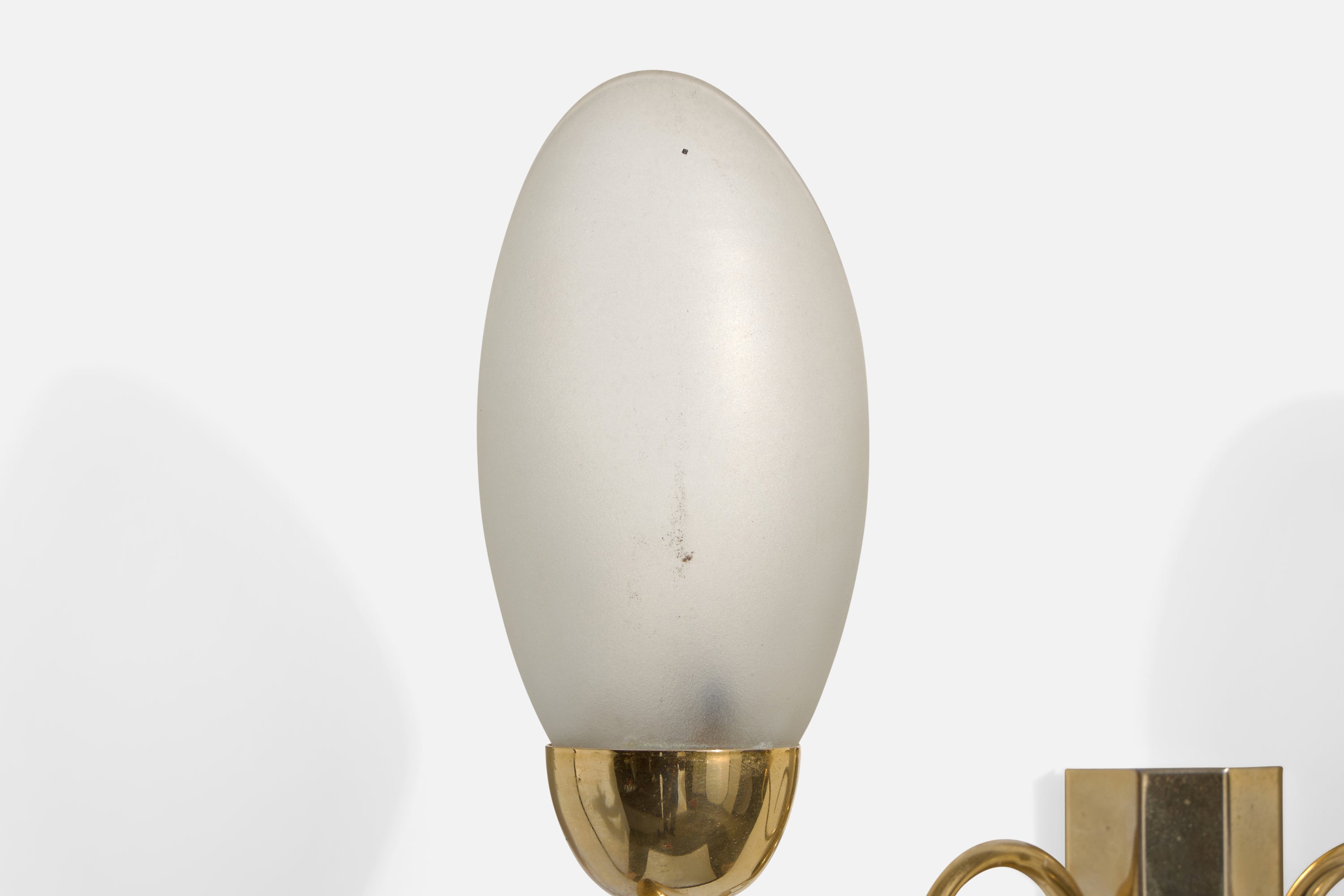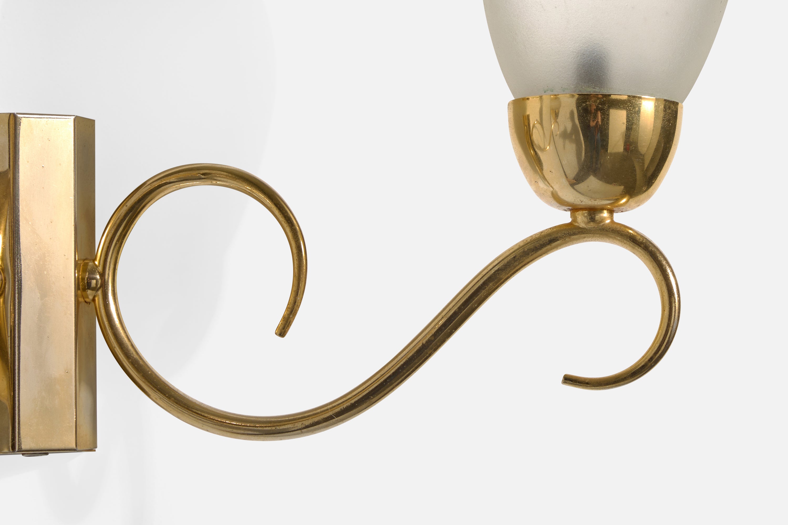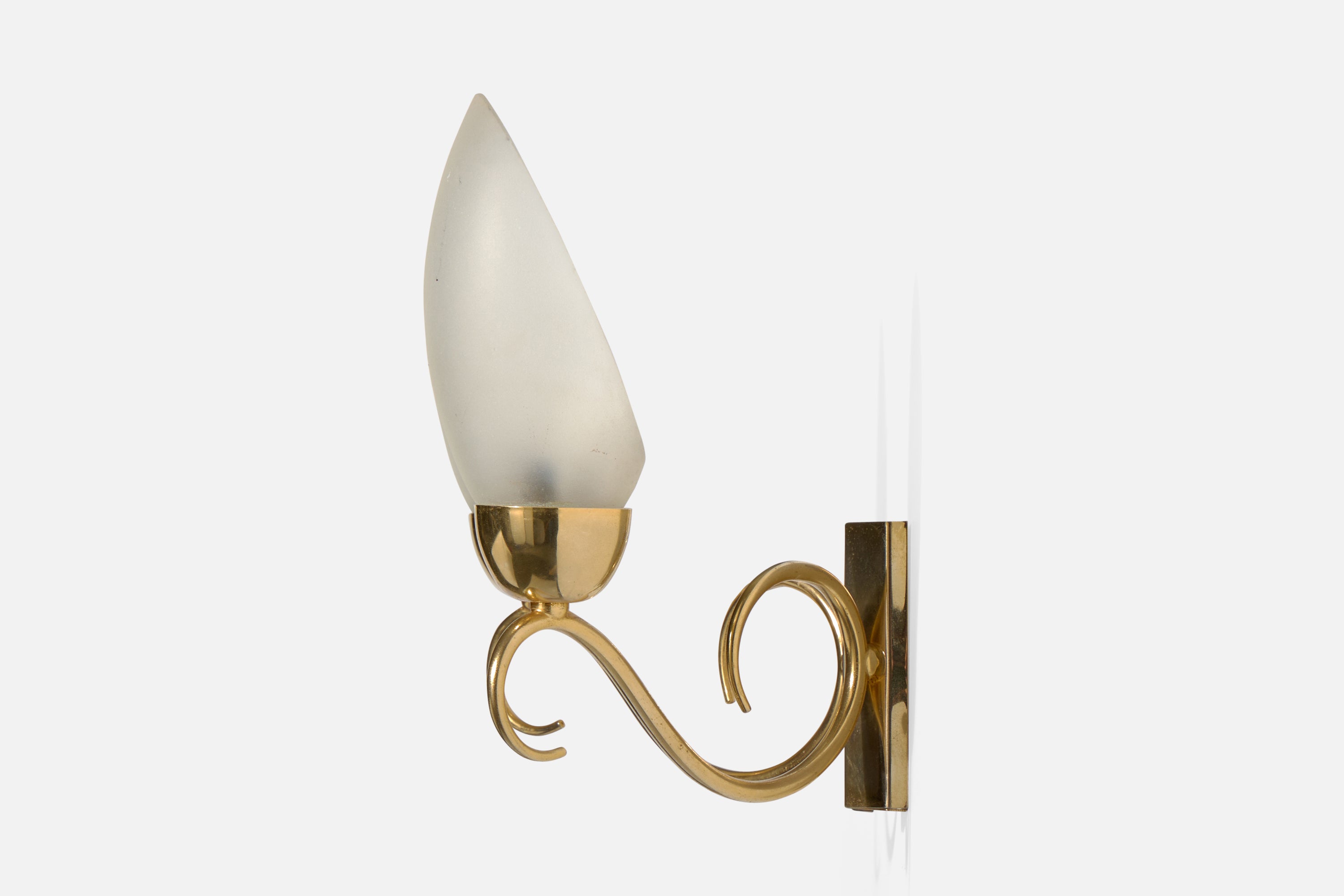 A brass and frosted glass wall light designed and produced in France, c. 1960s.