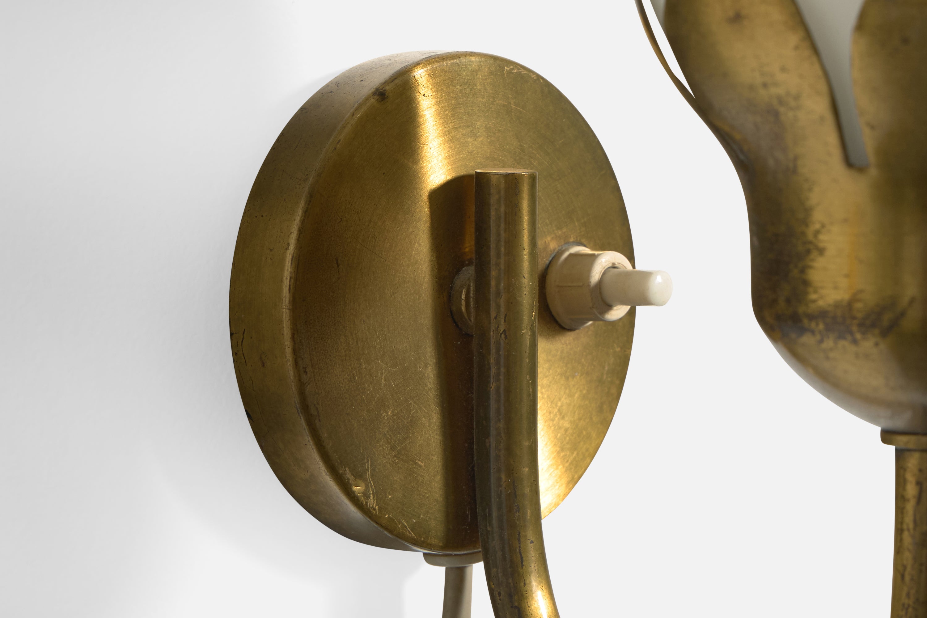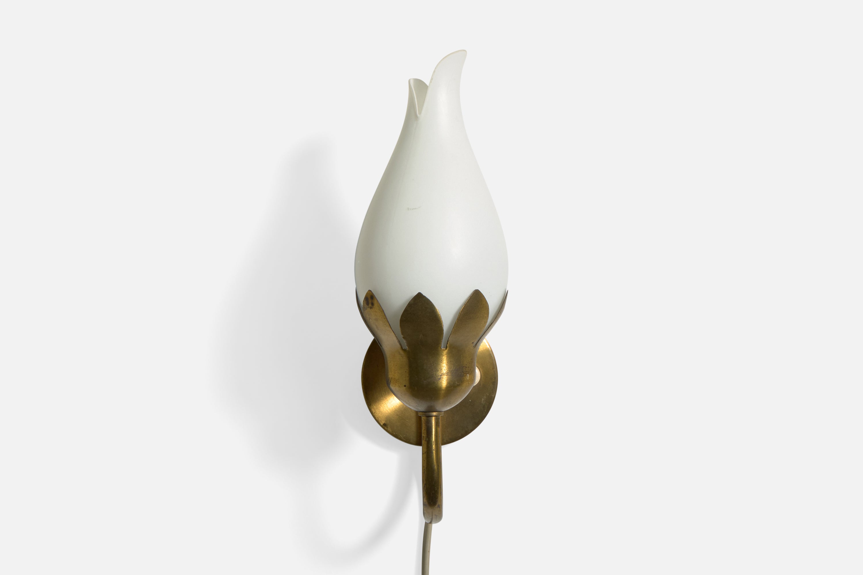 A brass and white opaline glass wall light, designed and produced by Fog & Mørup, Denmark, c. 1950s.