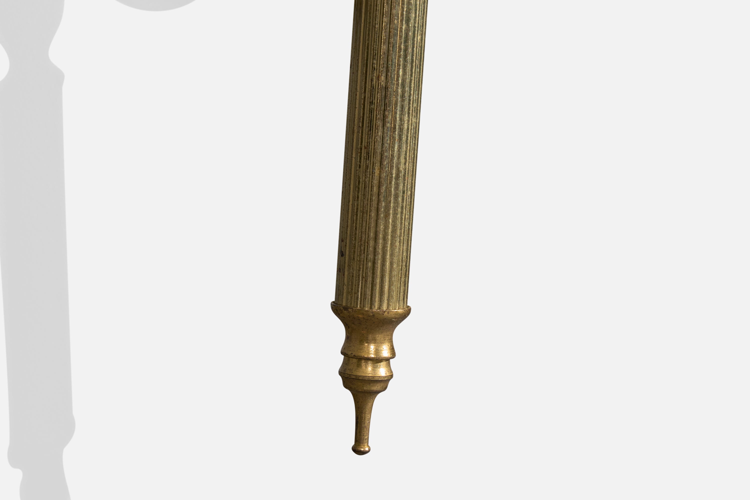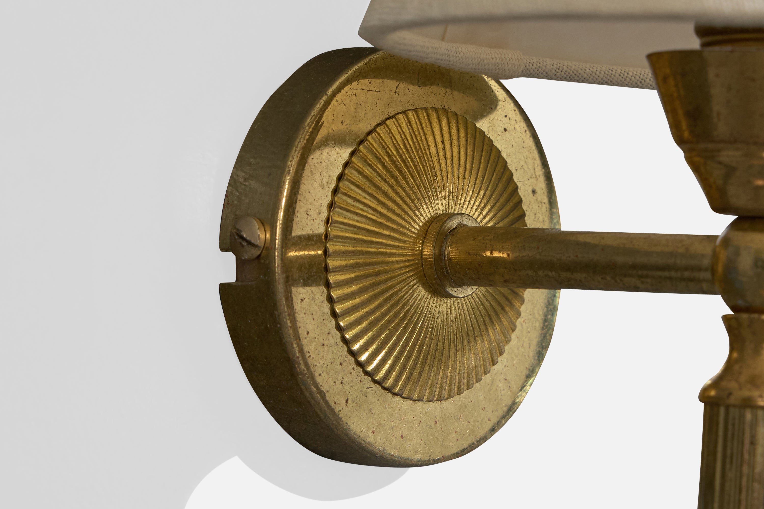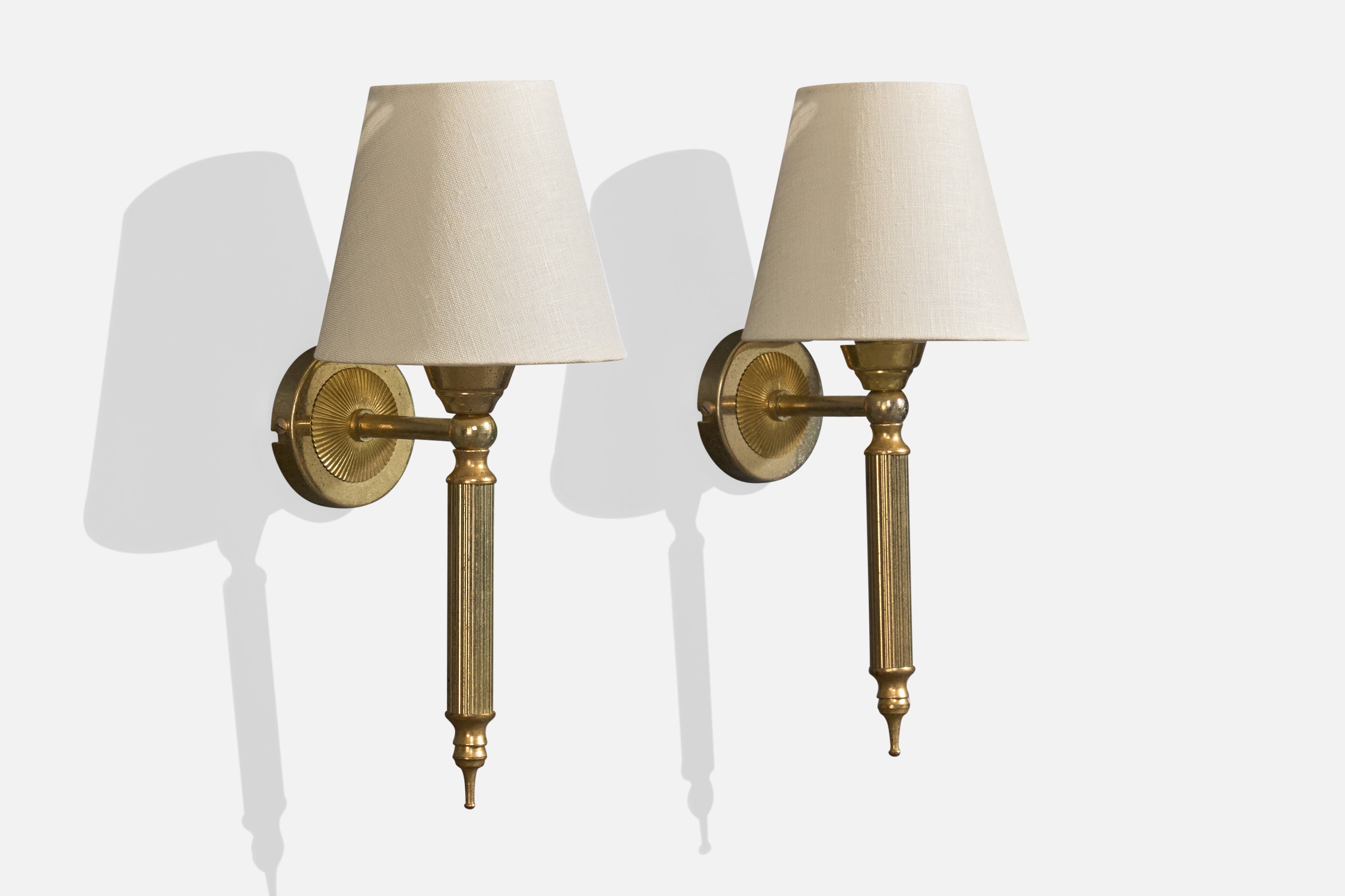 A pair of brass and white fabric wall lights designed and produced in France, c. 1950s.
