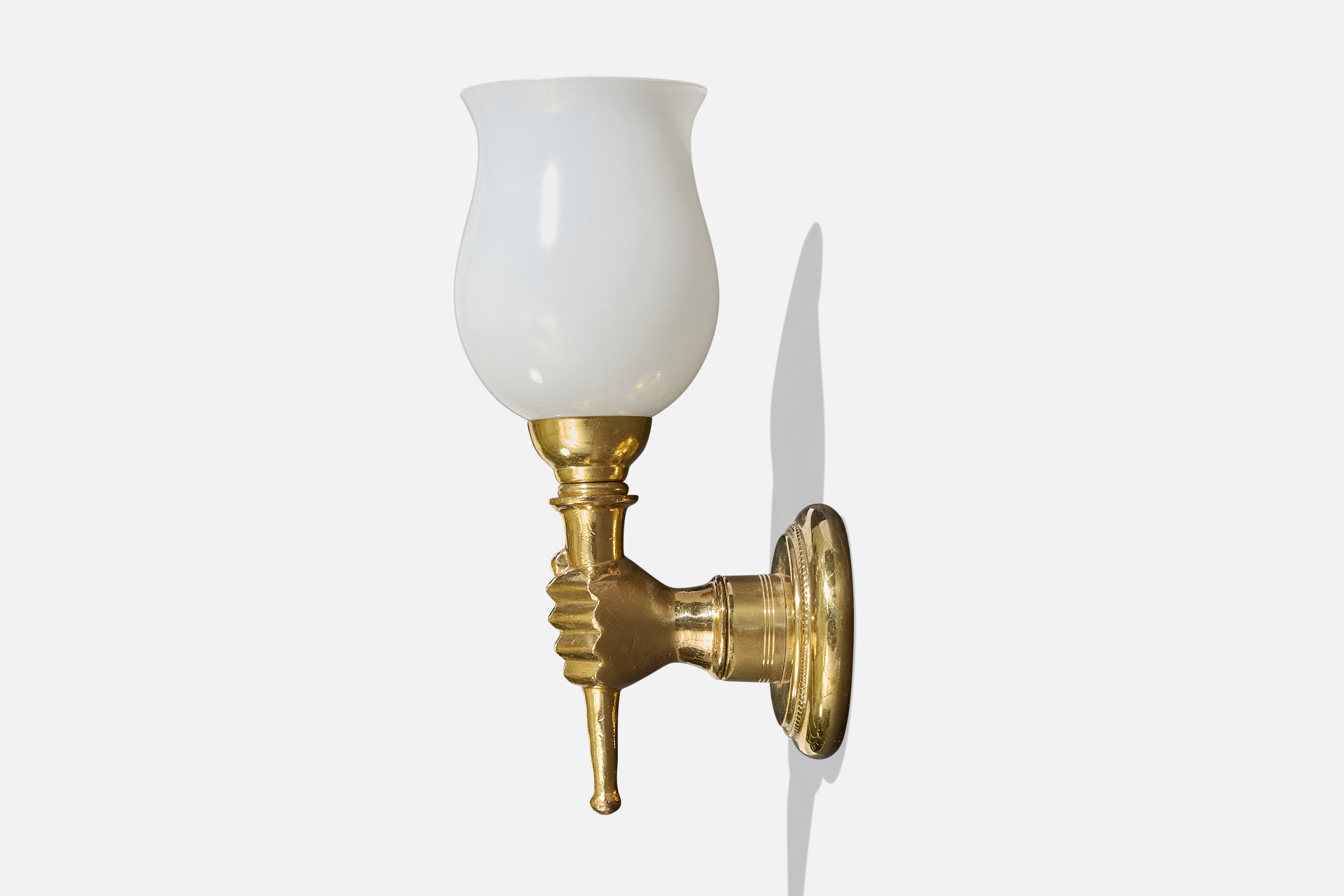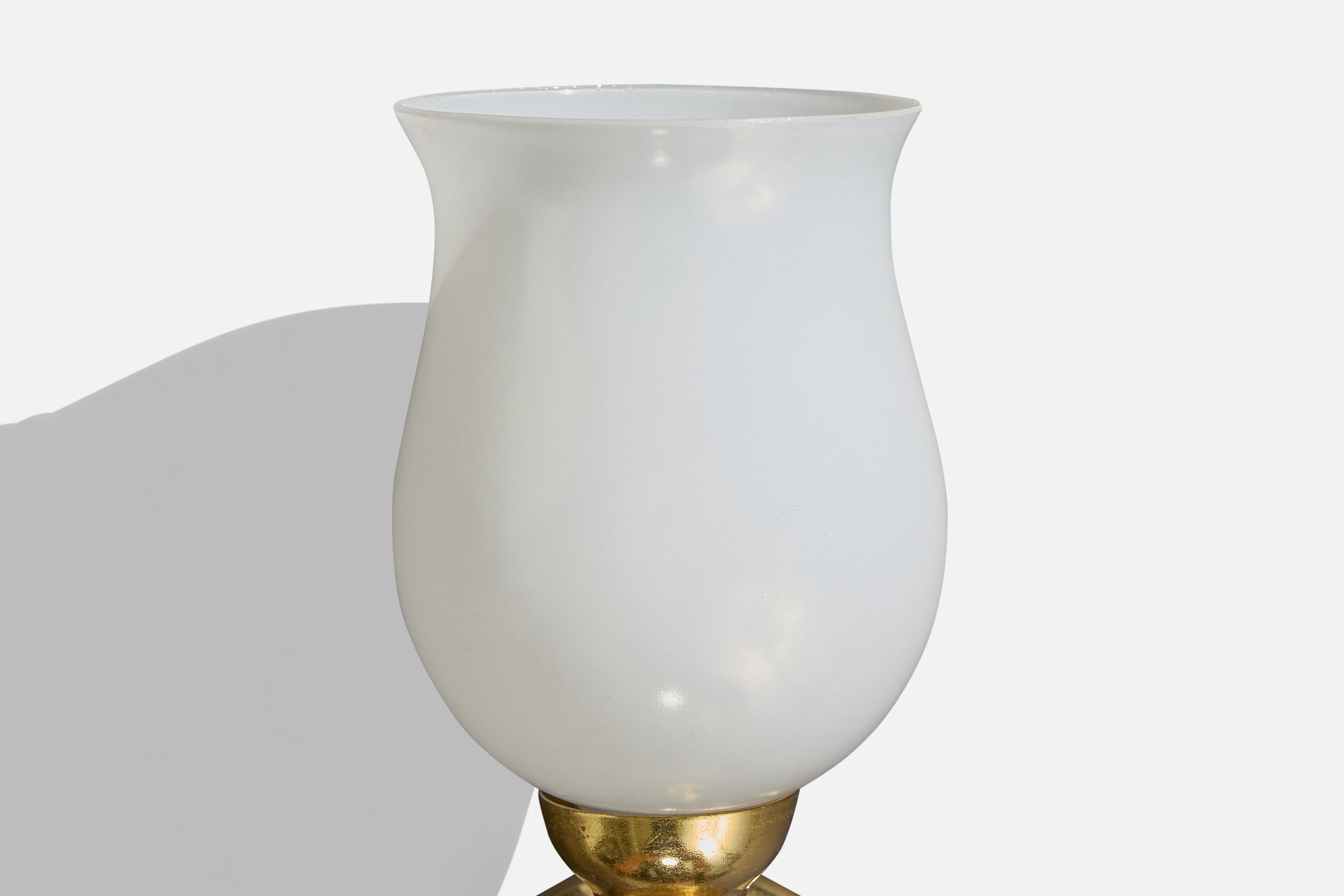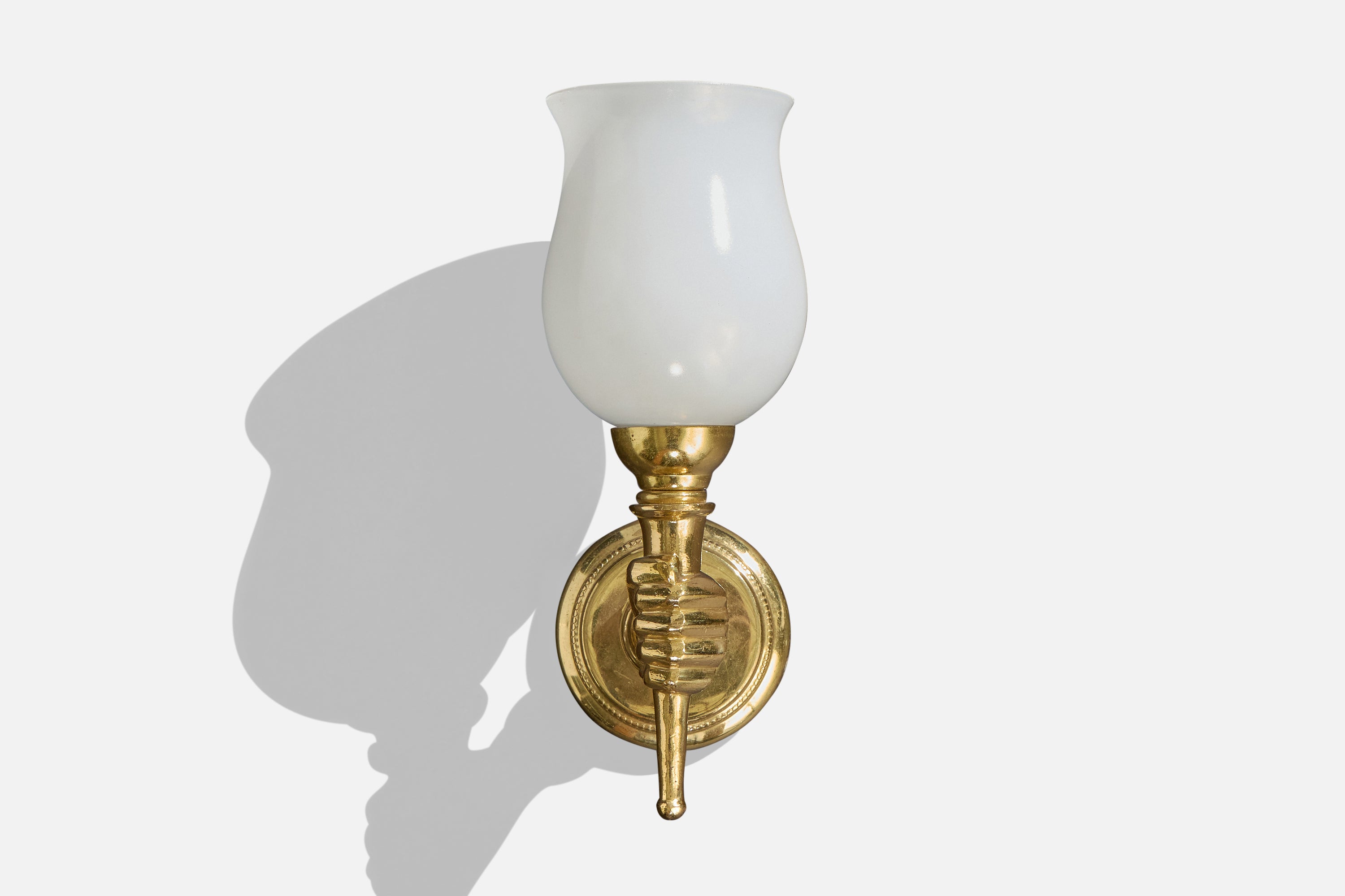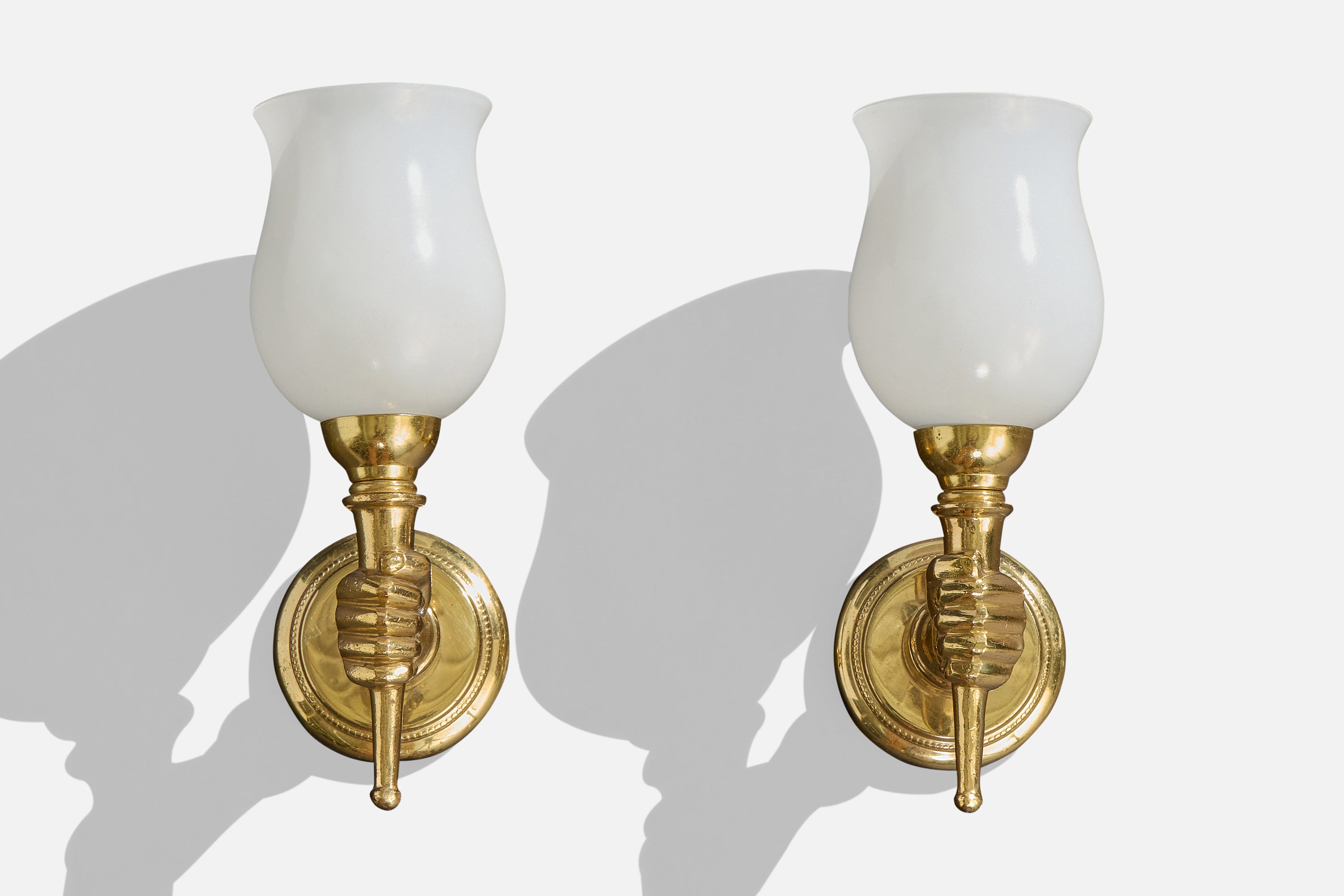 A pair of brass and white opaline glass wall lights designed and produced in France, c. 1950s.