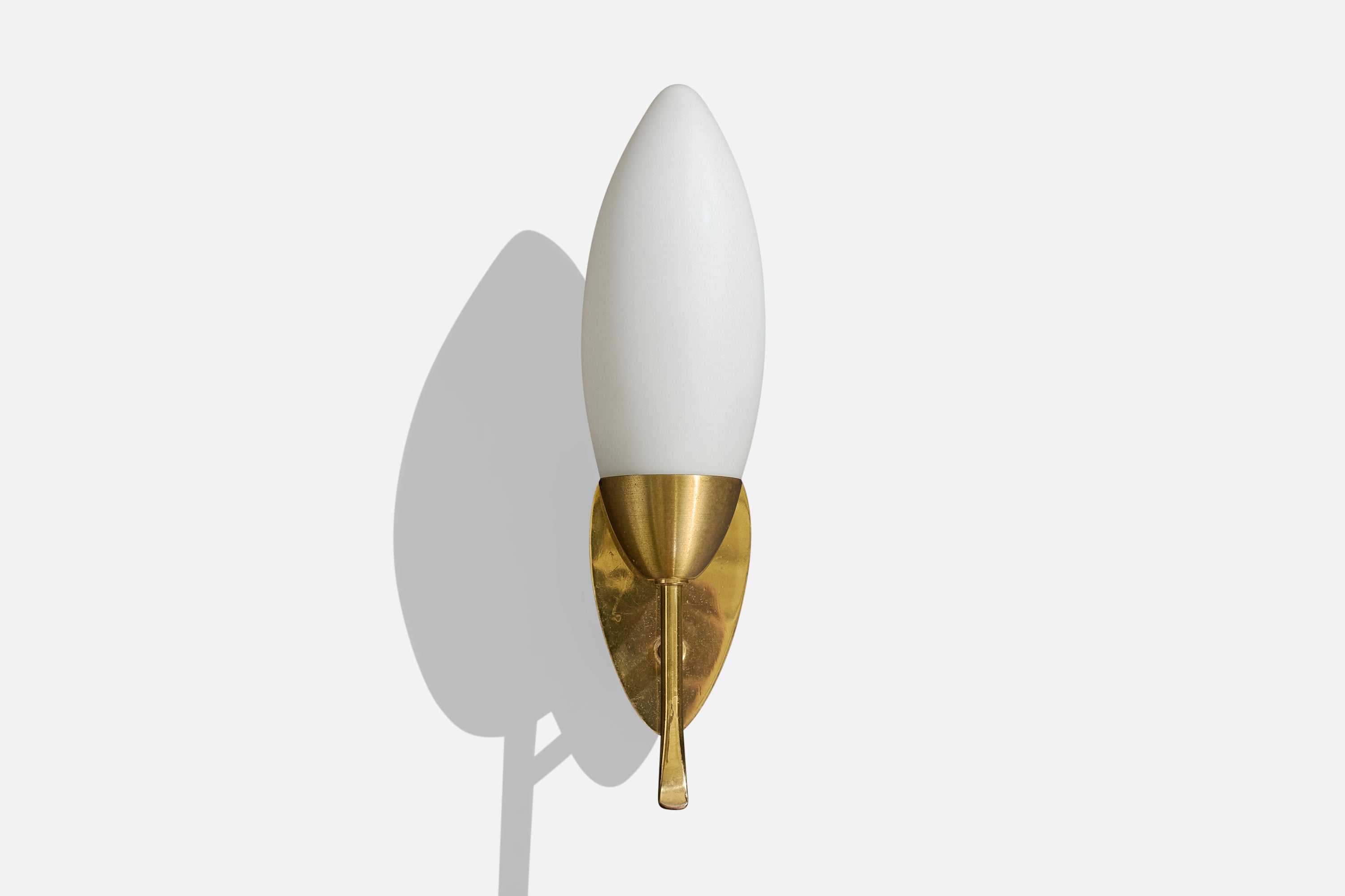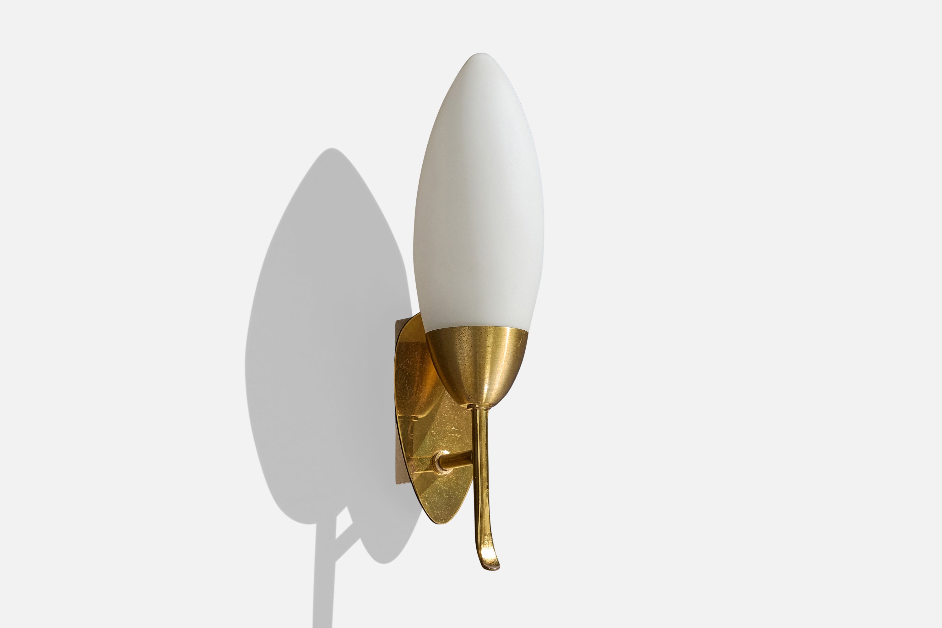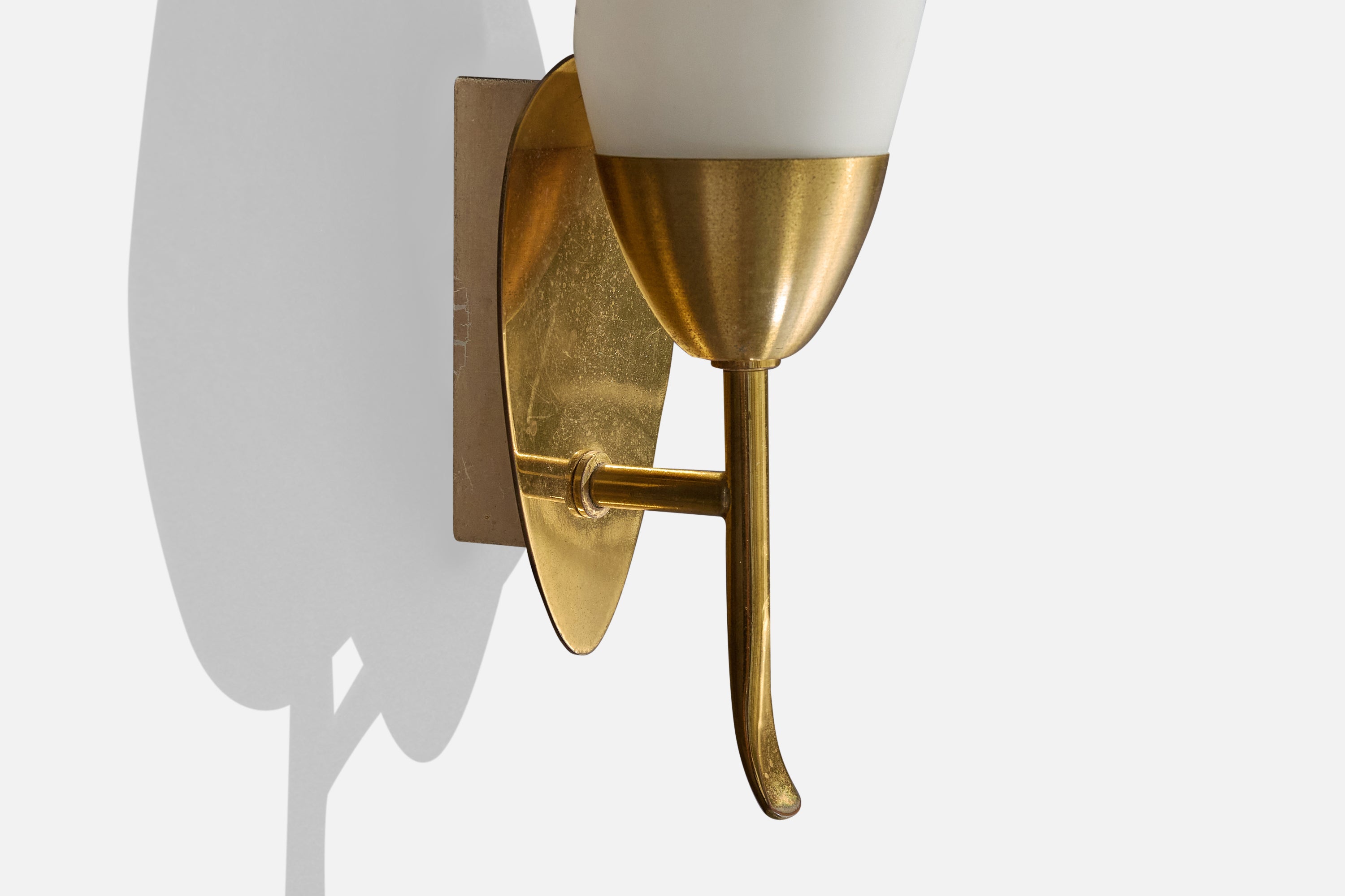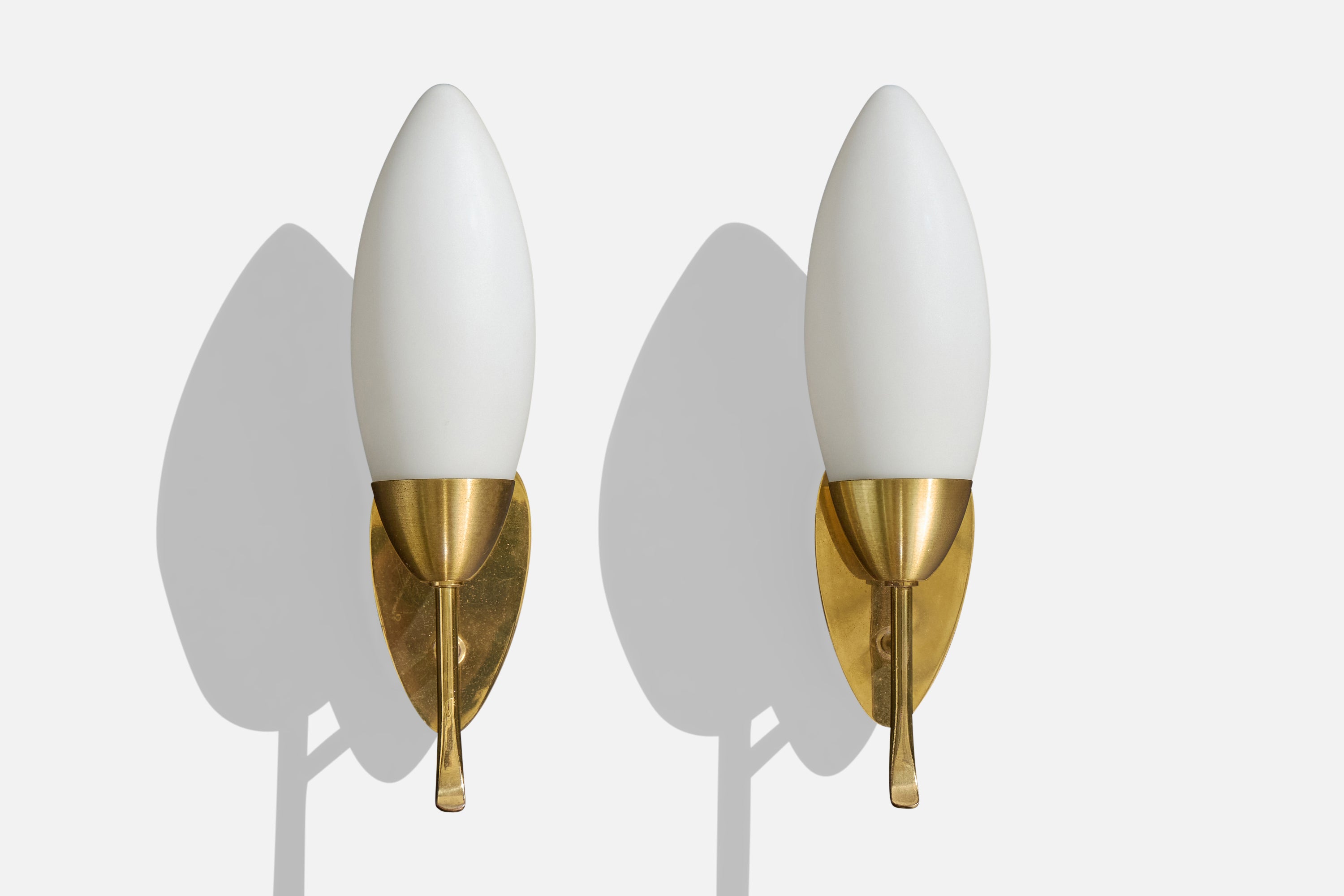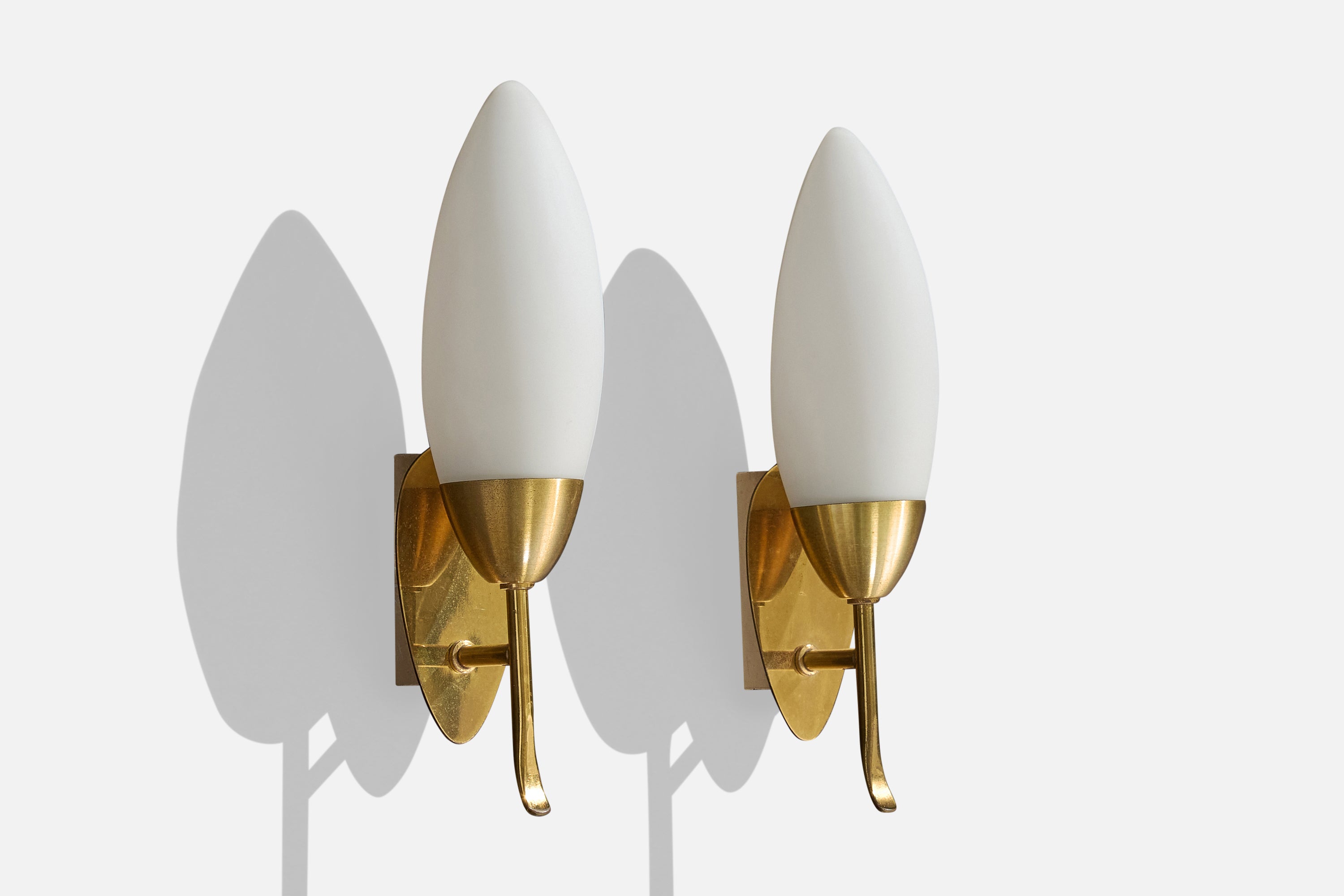 A pair of brass and white opaline glass wall lights designed and produced in Sweden, c. 1950s.