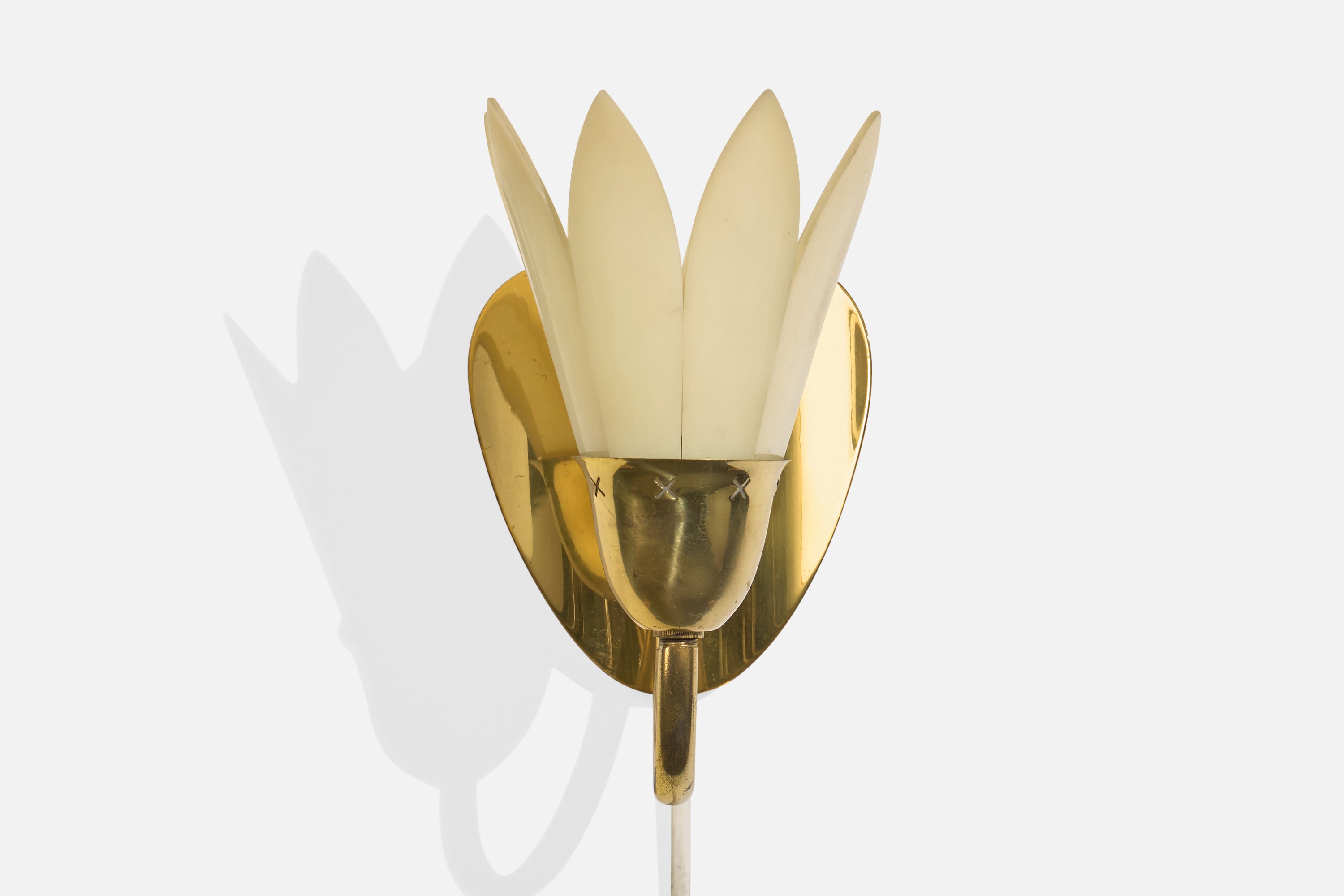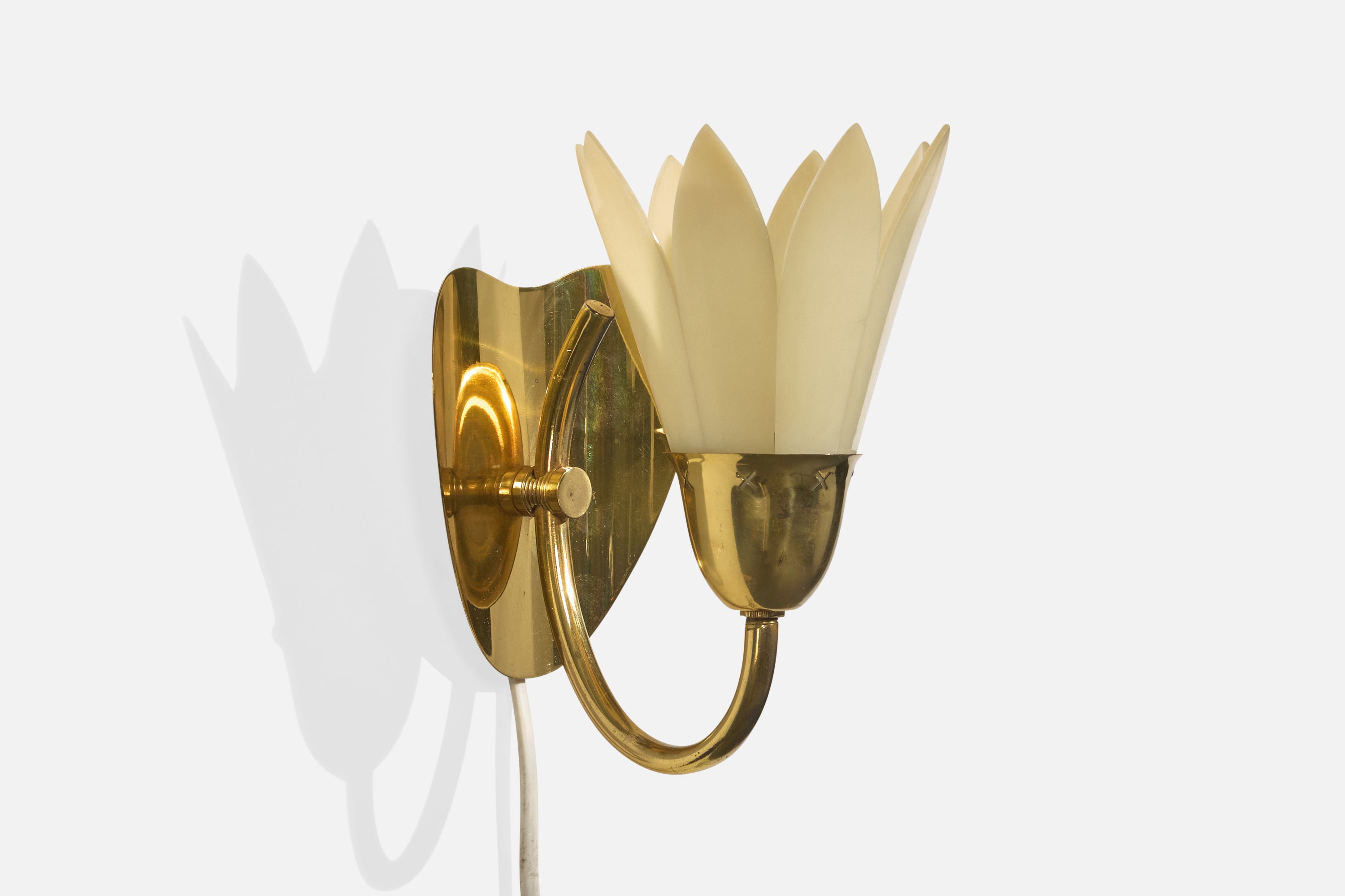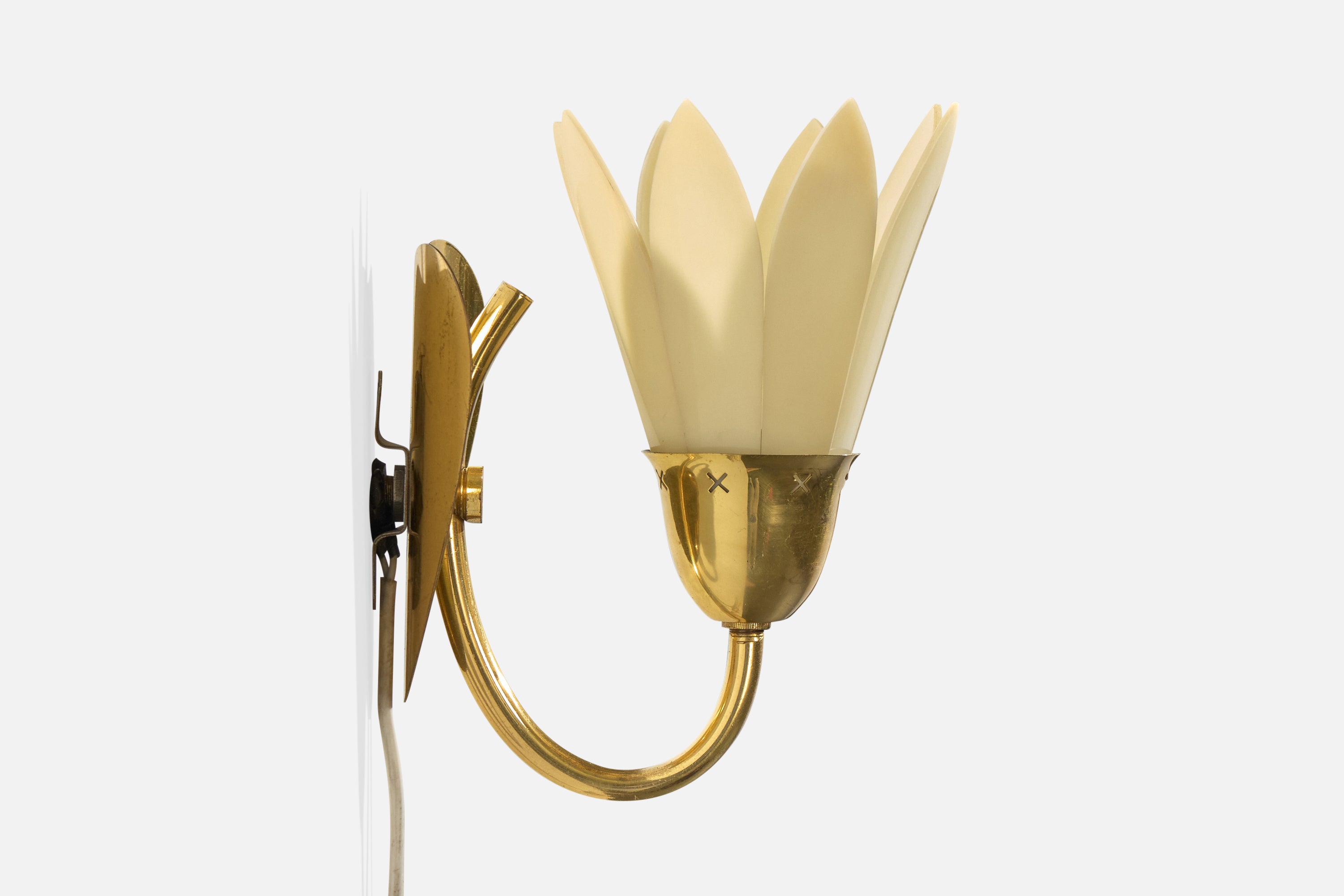 A brass and beige acrylic wall light designed and produced in Sweden, c. 1950s.