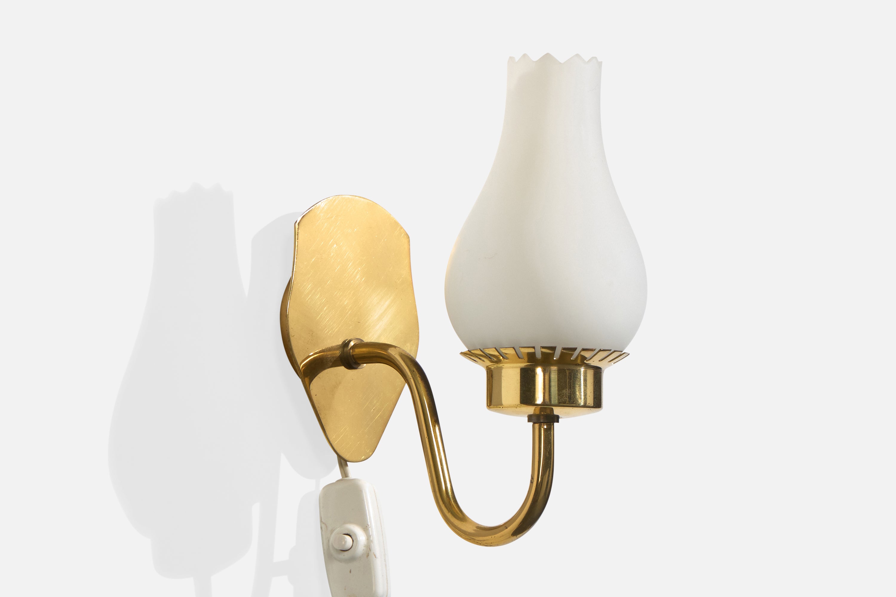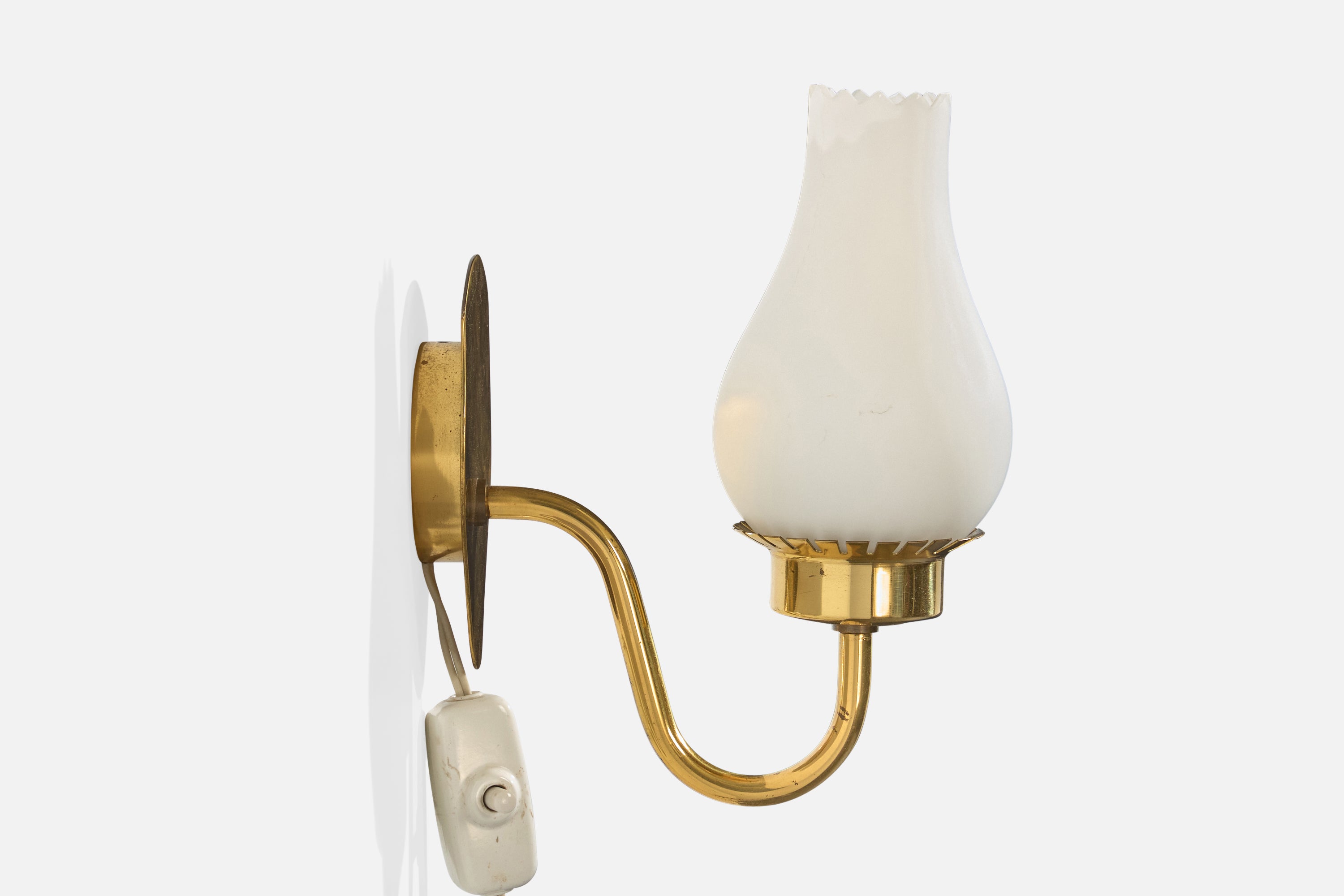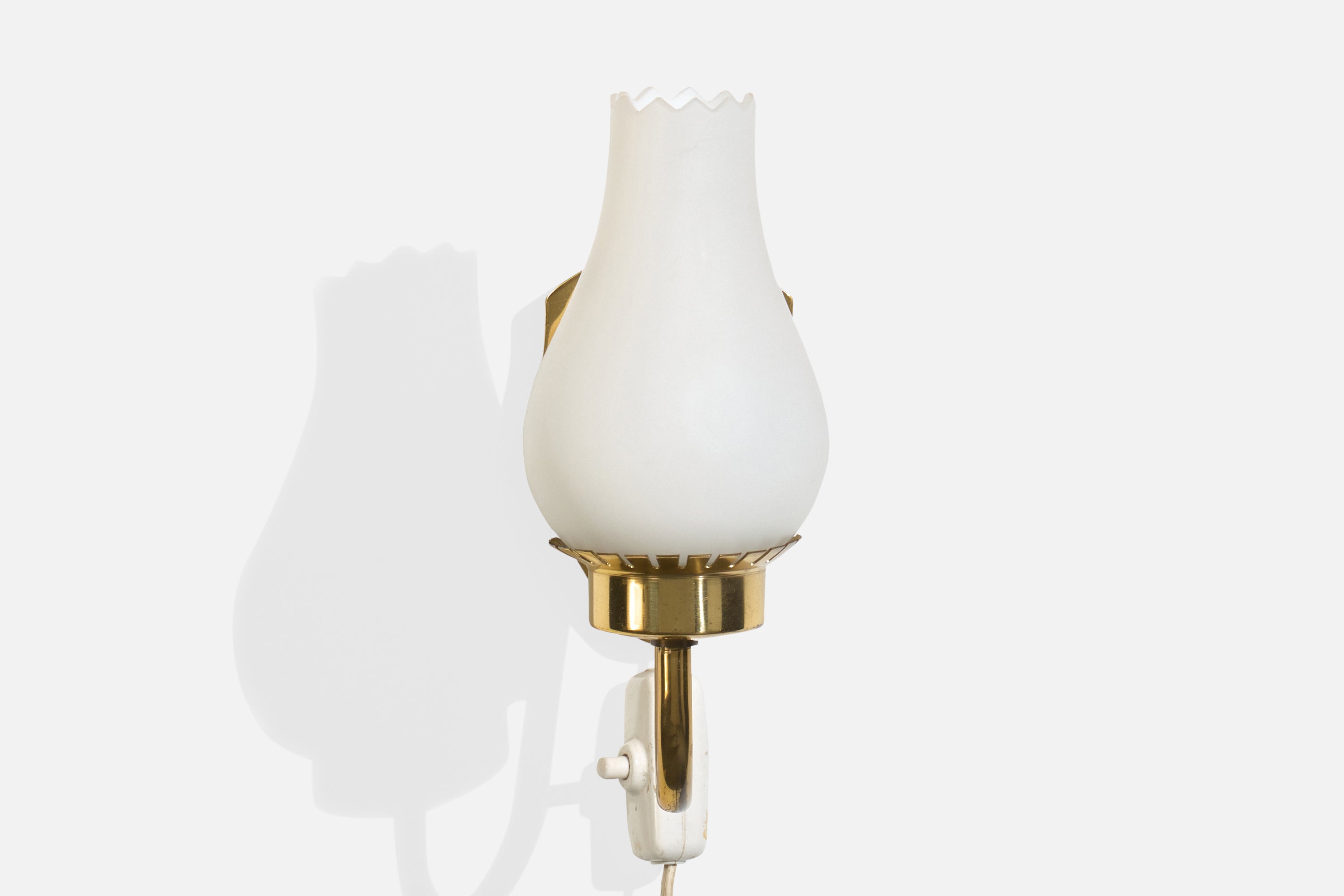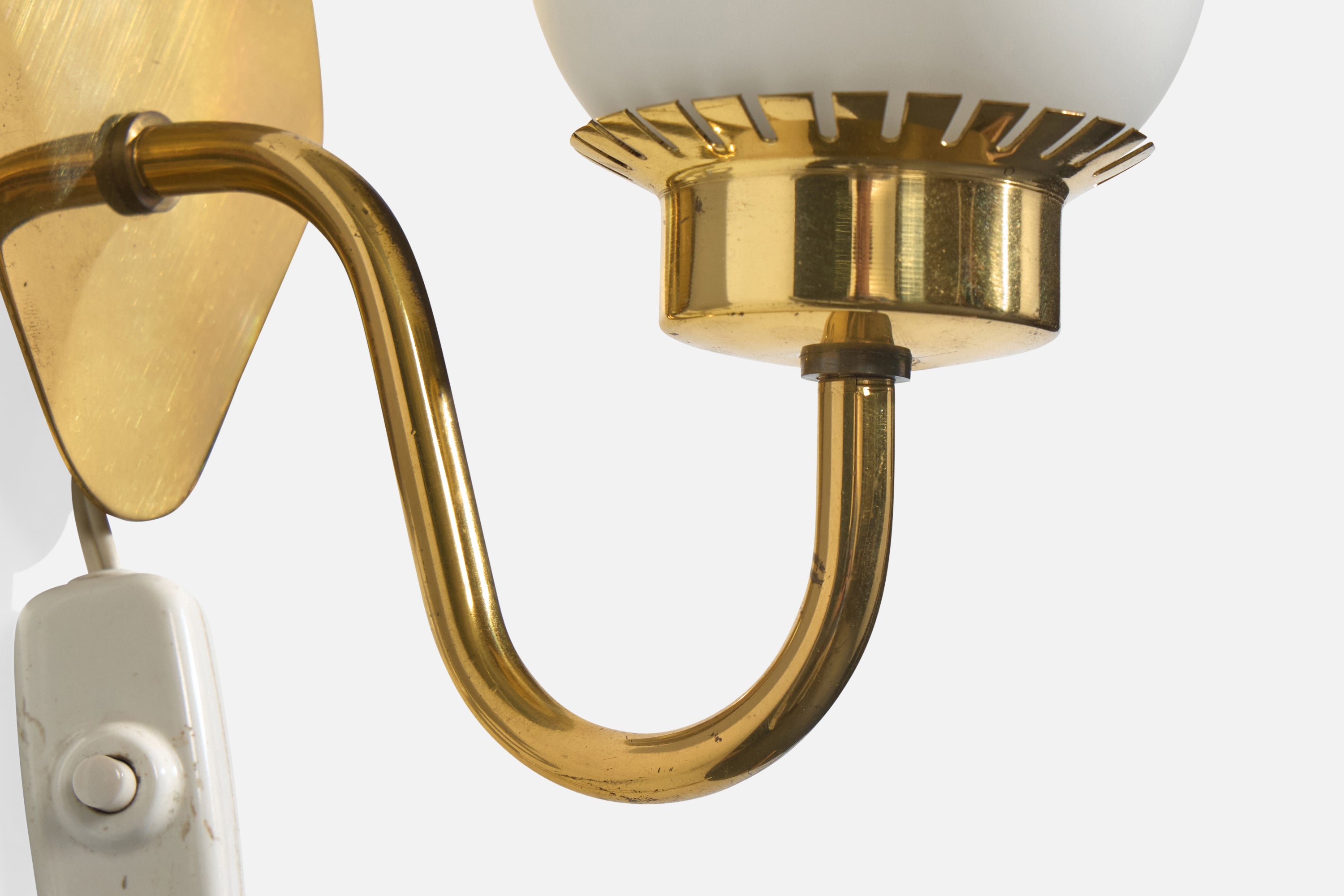 A brass and white opaline glass wall light designed and produced in Sweden, c. 1950s.