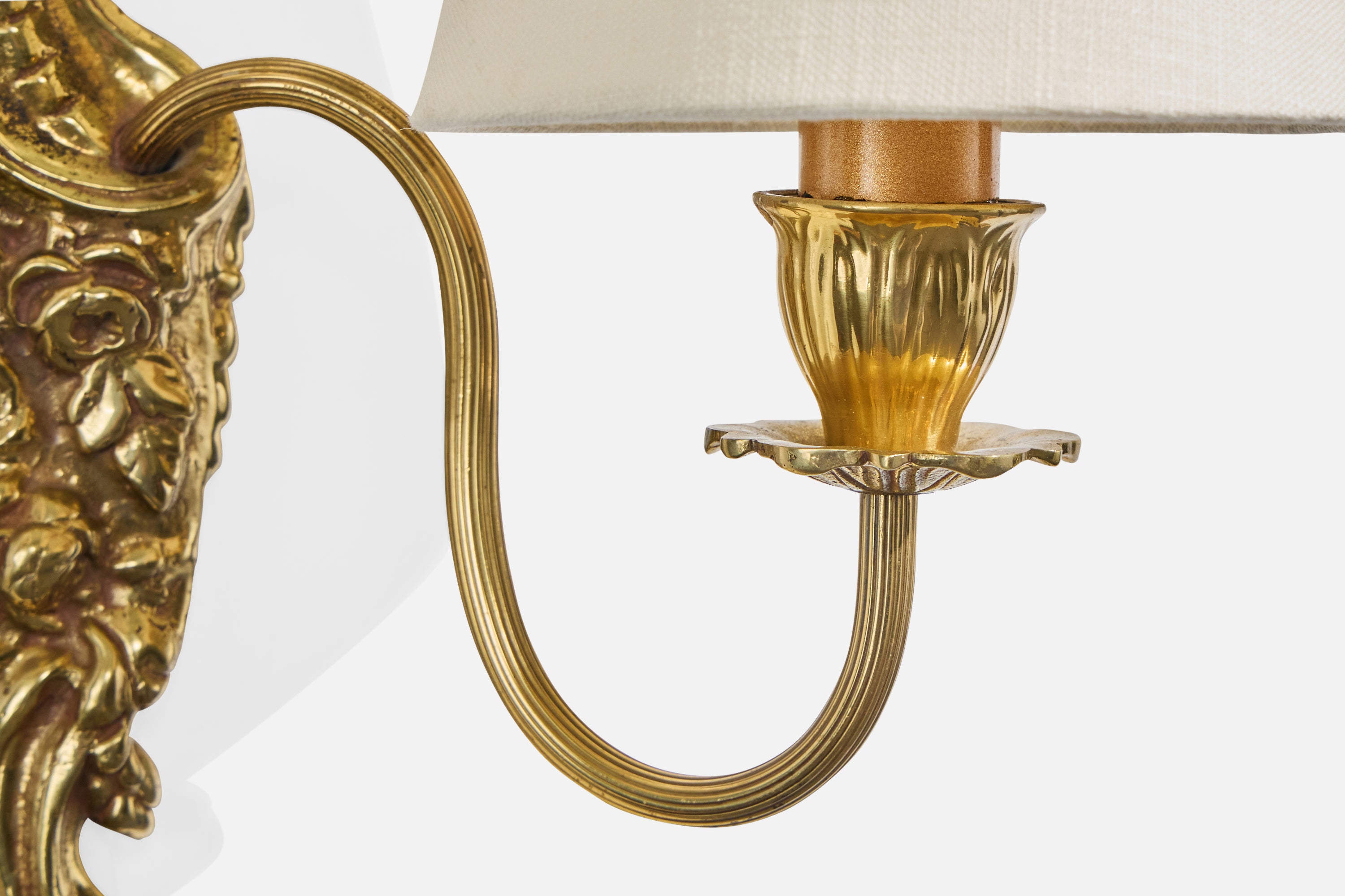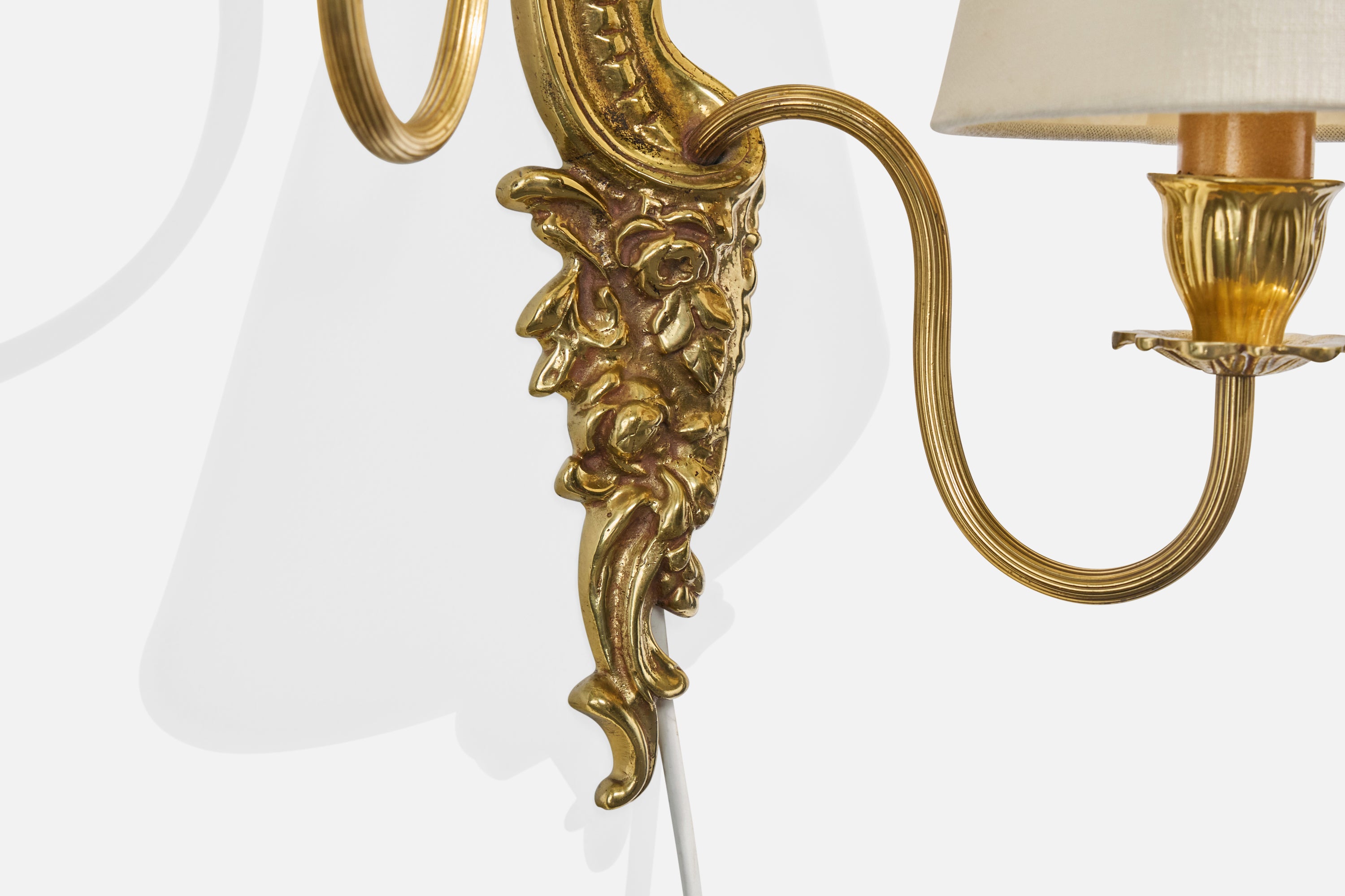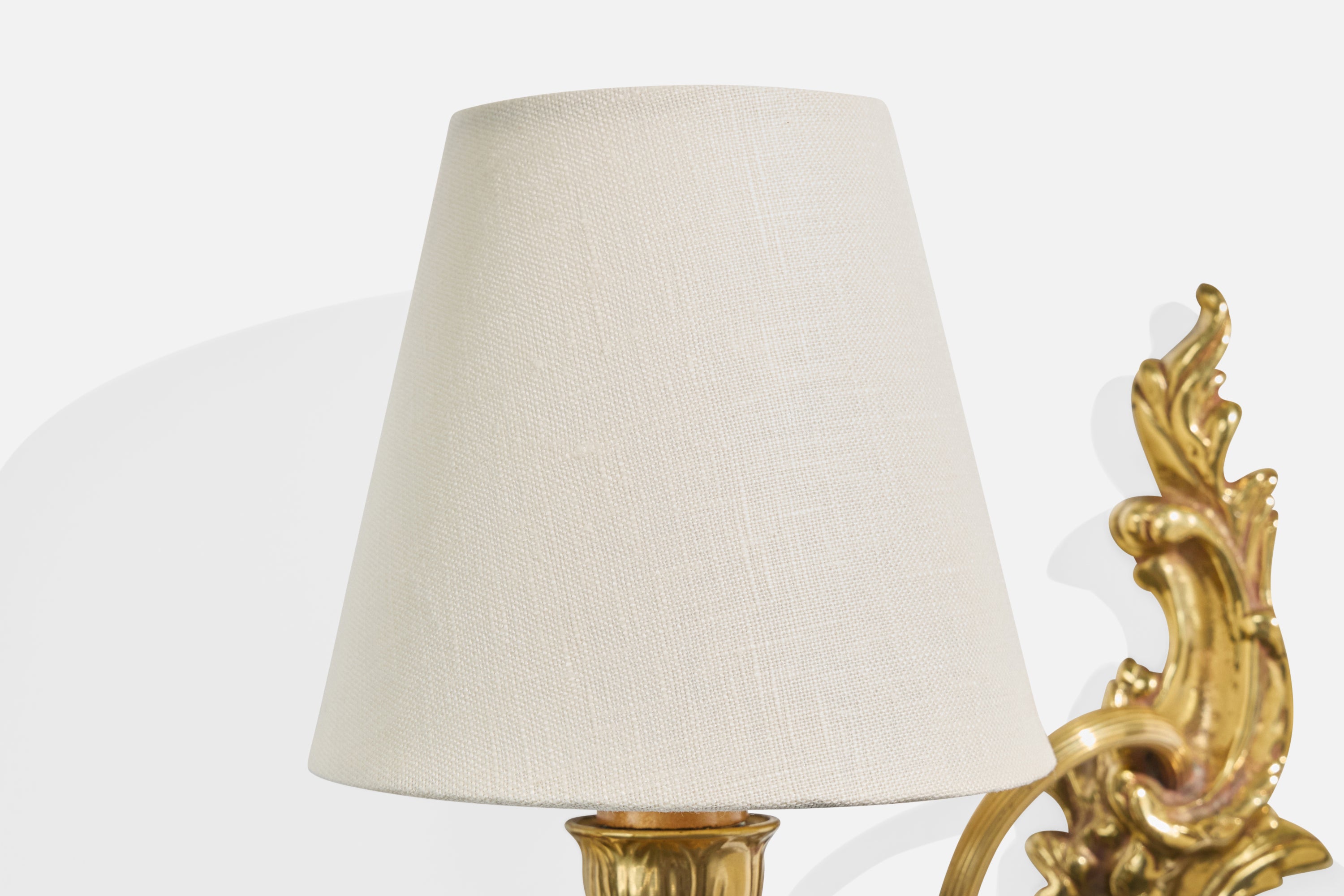 A brass and white fabric wall light designed and produced in Sweden, c. 1940s.