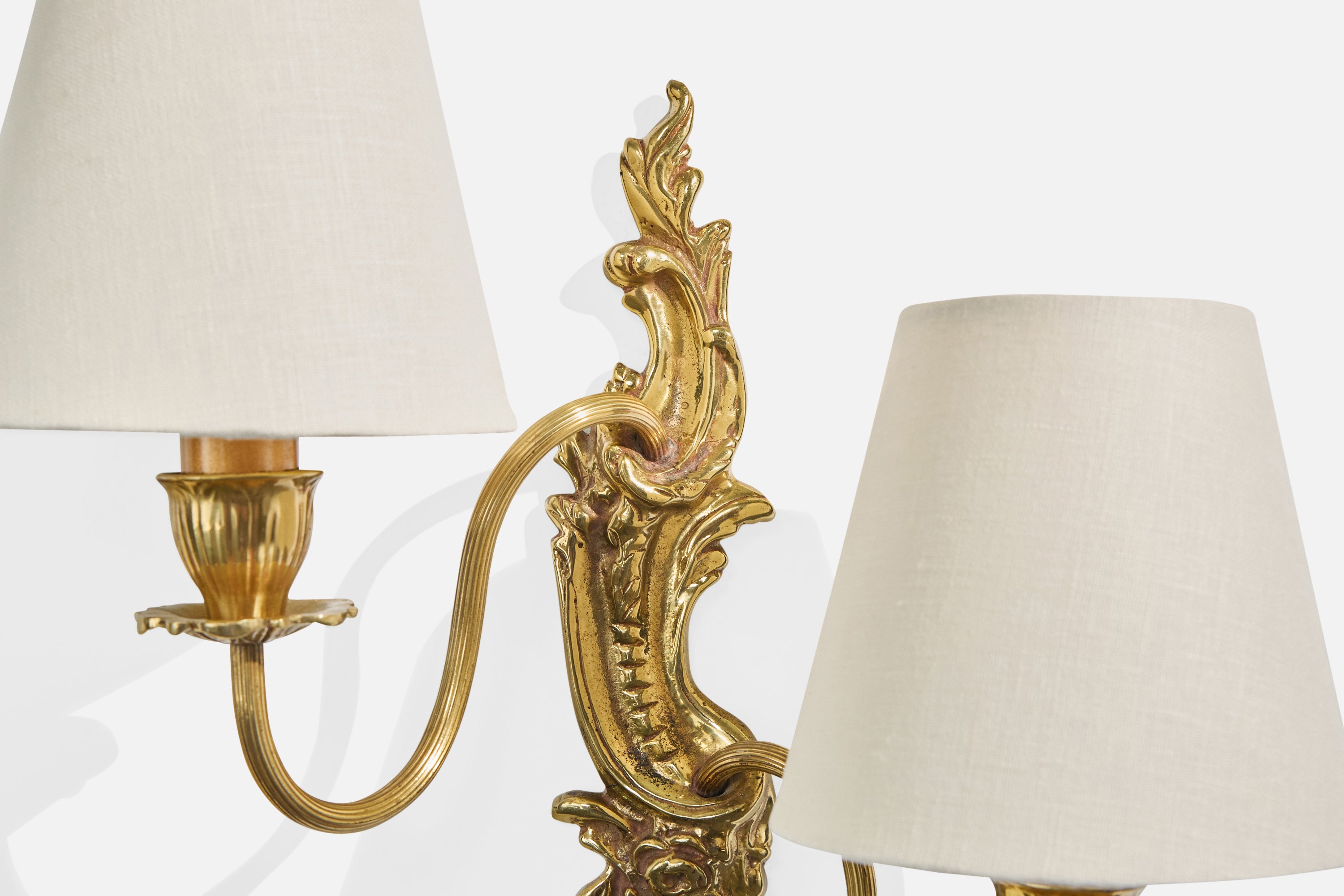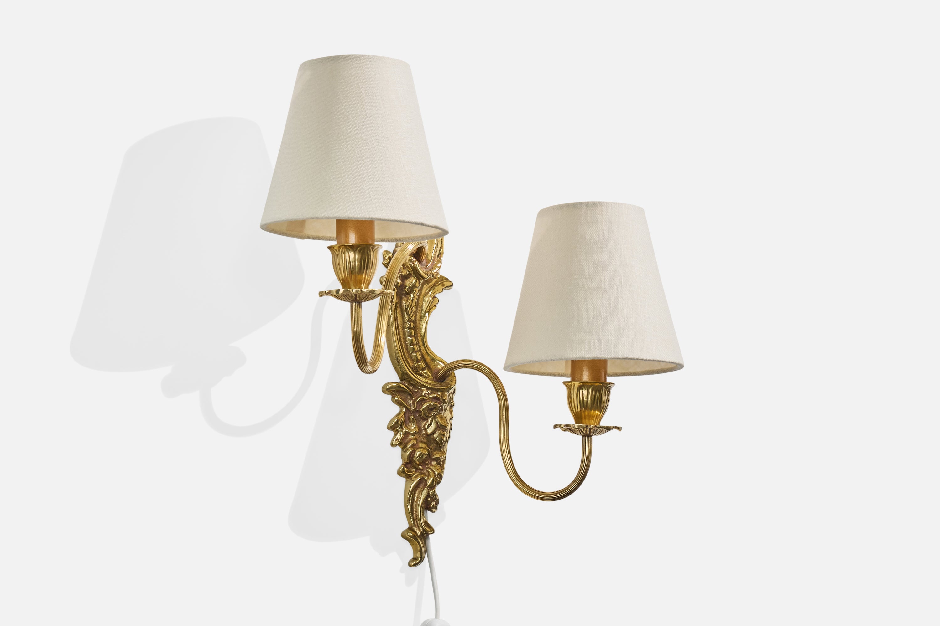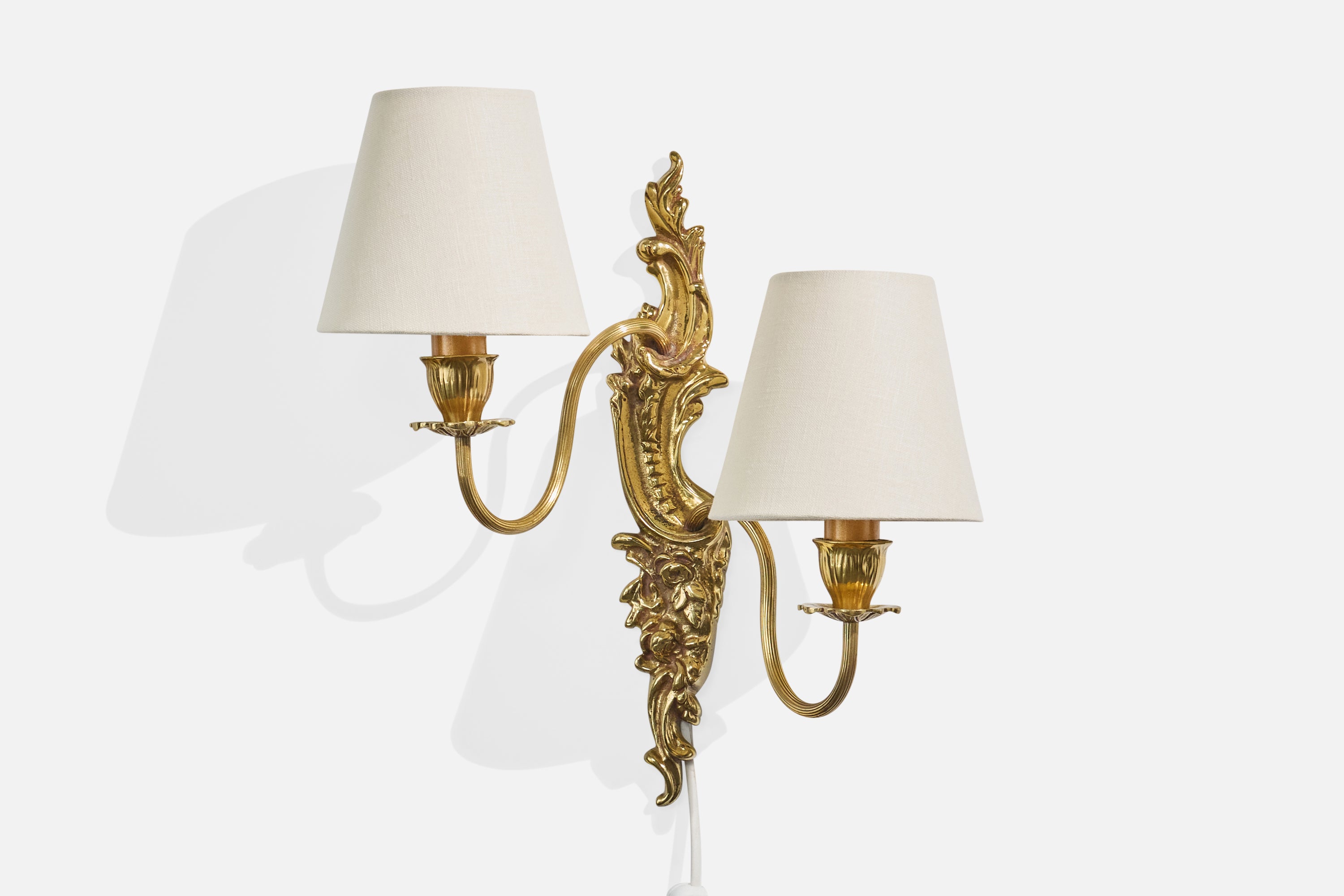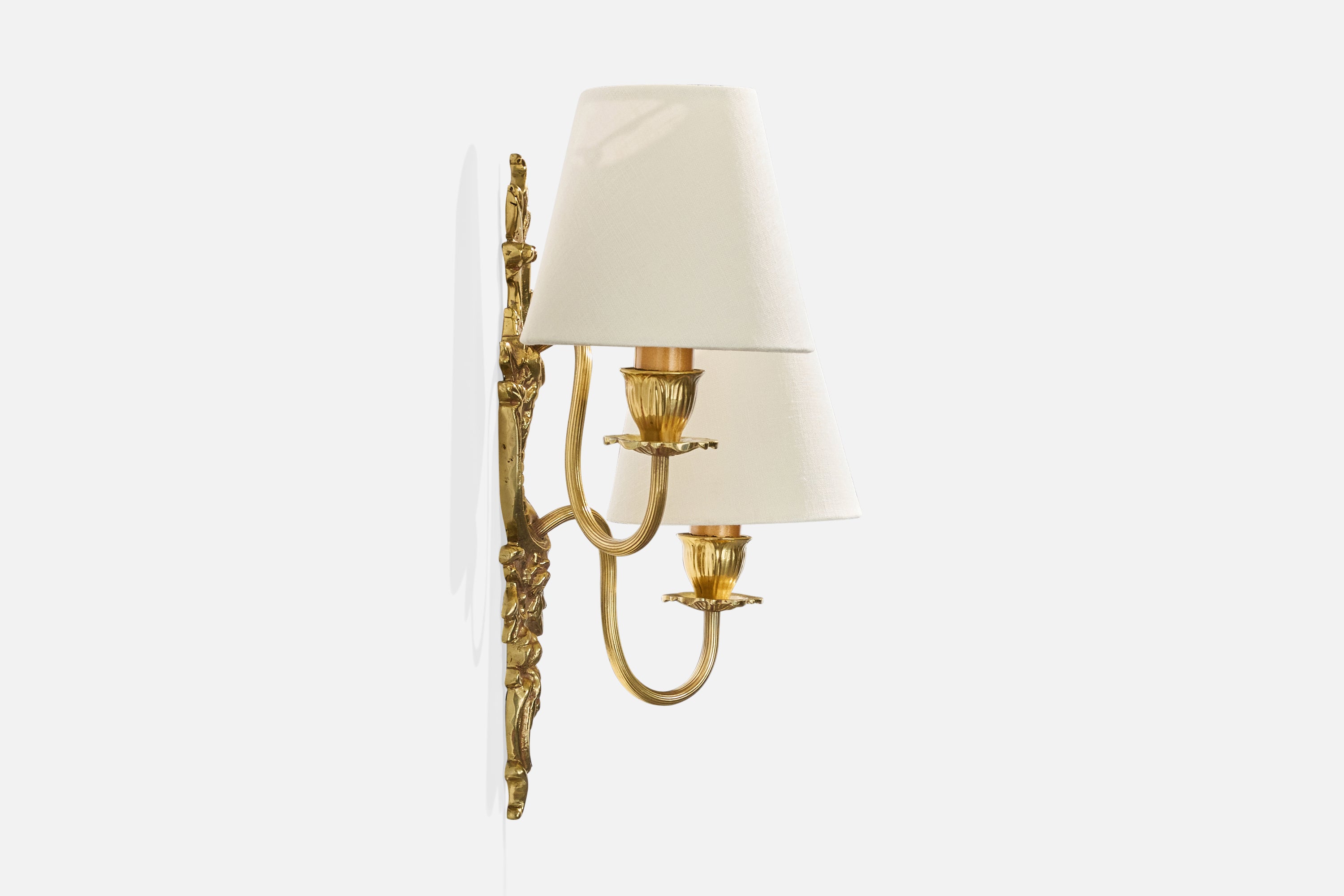 A brass and white fabric wall light designed and produced in Sweden, c. 1940s.