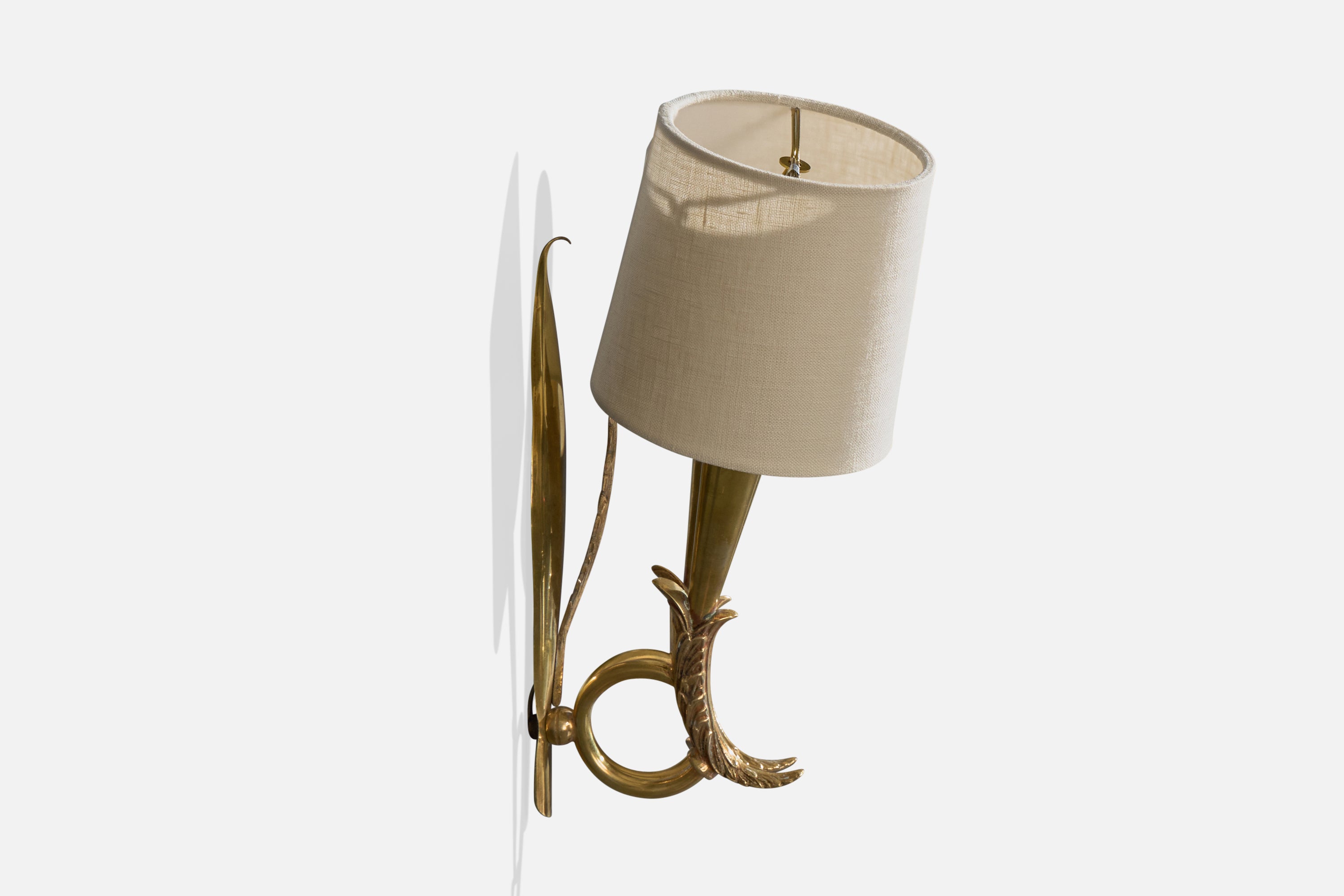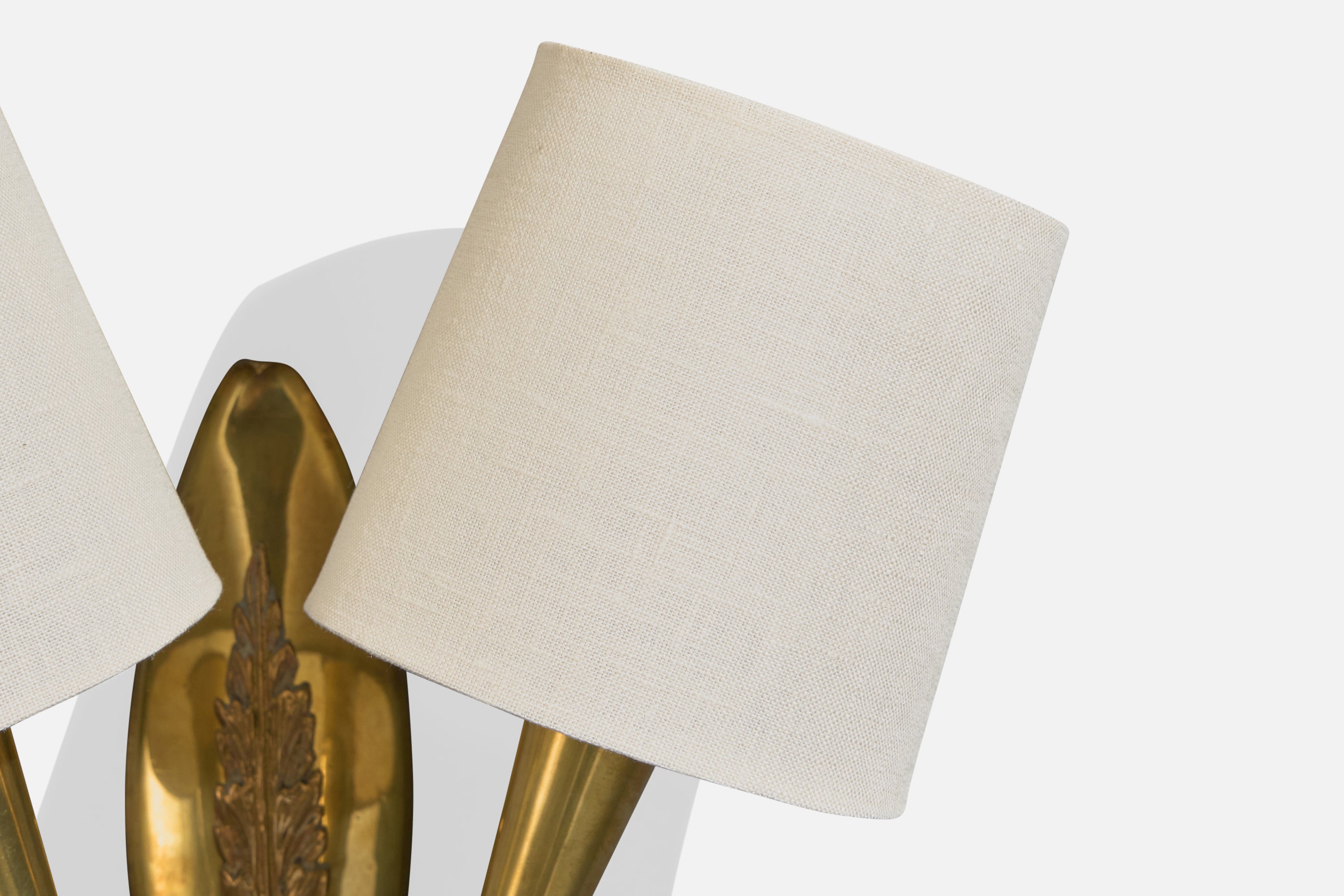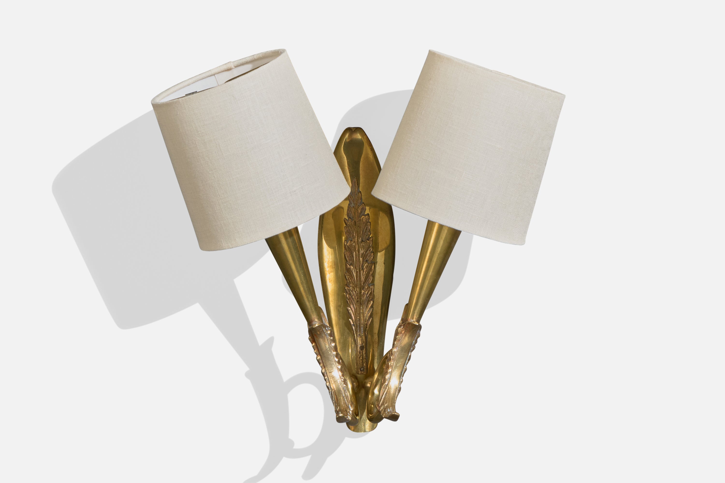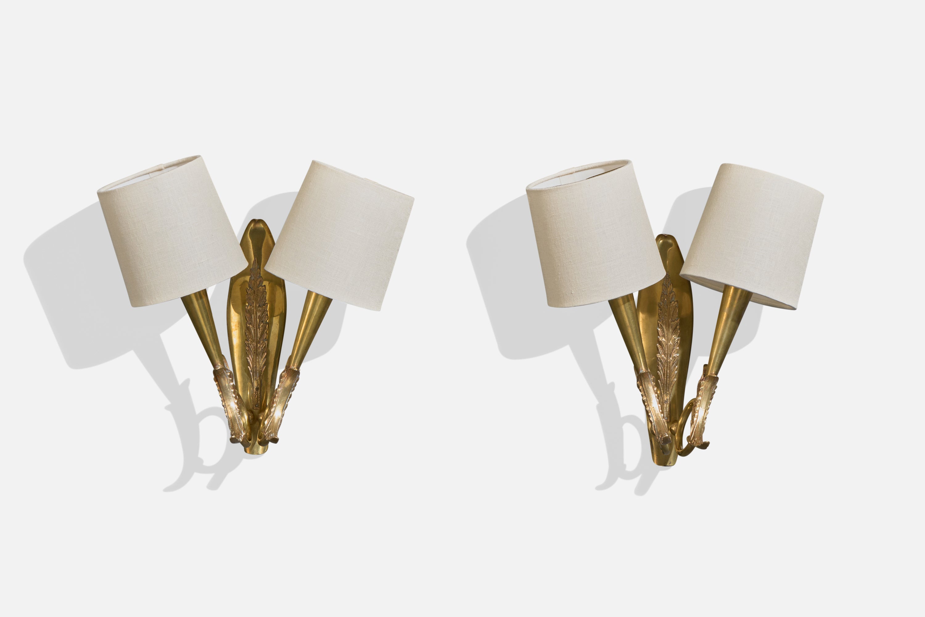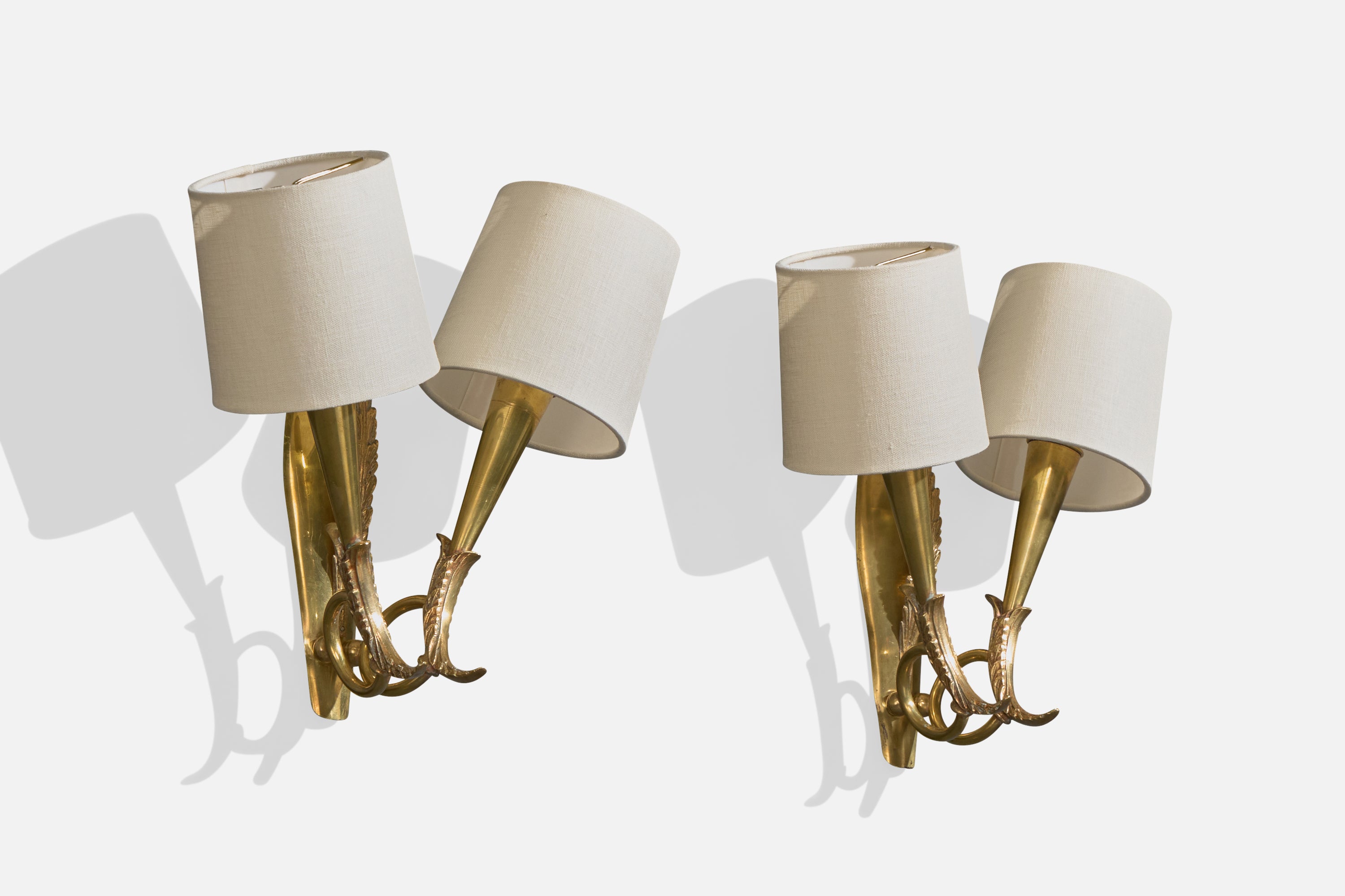 A pair of brass and white fabric wall lights designed and produced in Italy, c. 1940s.