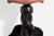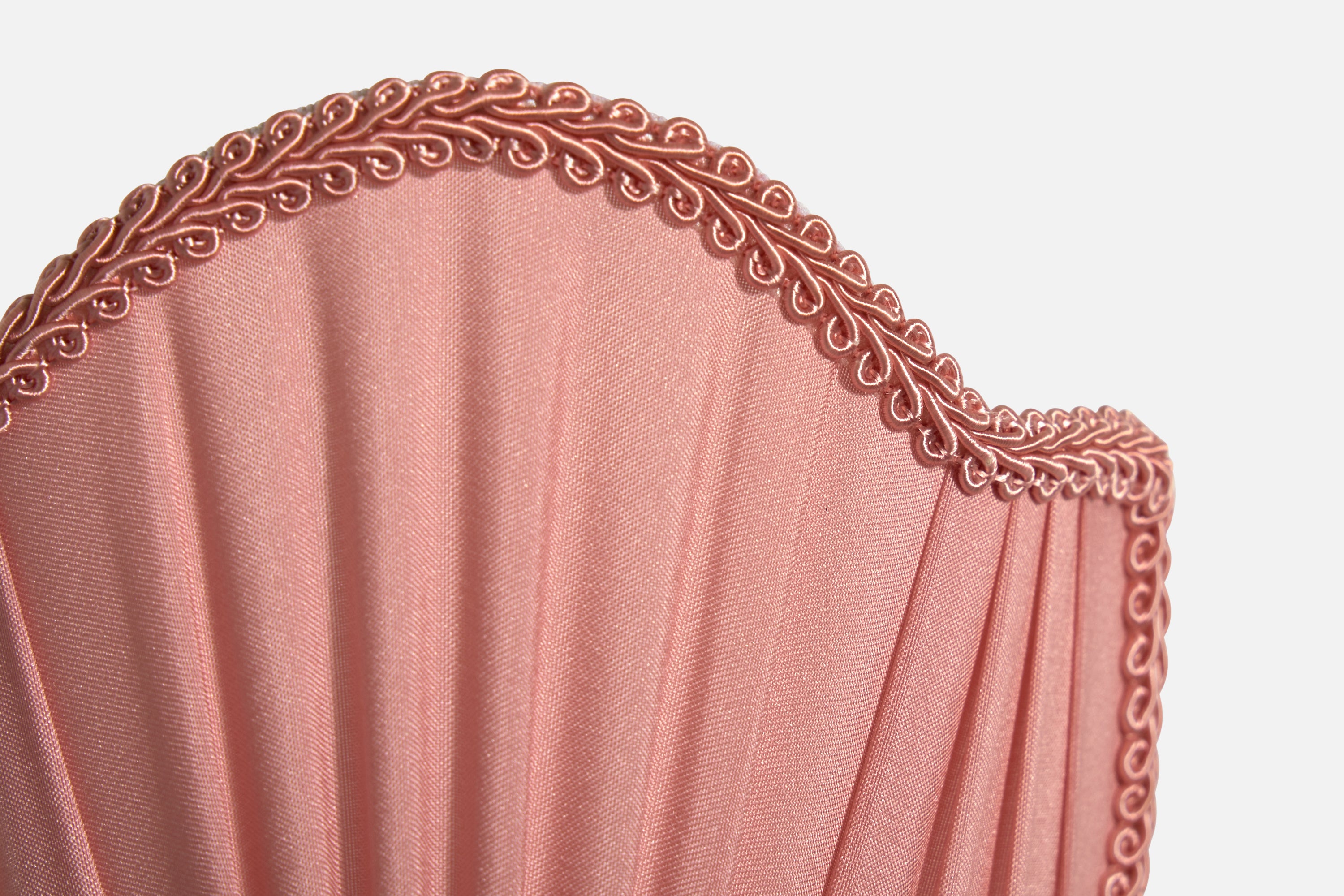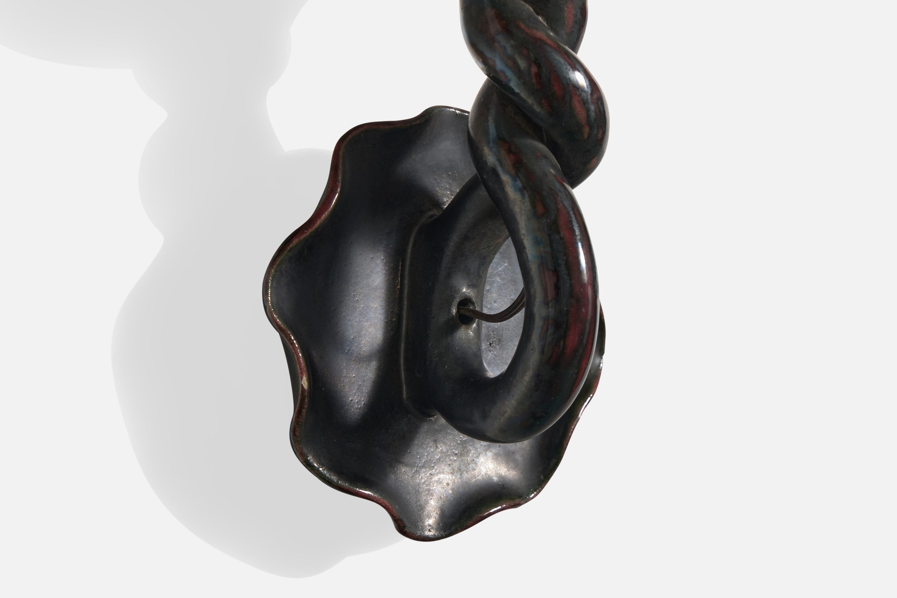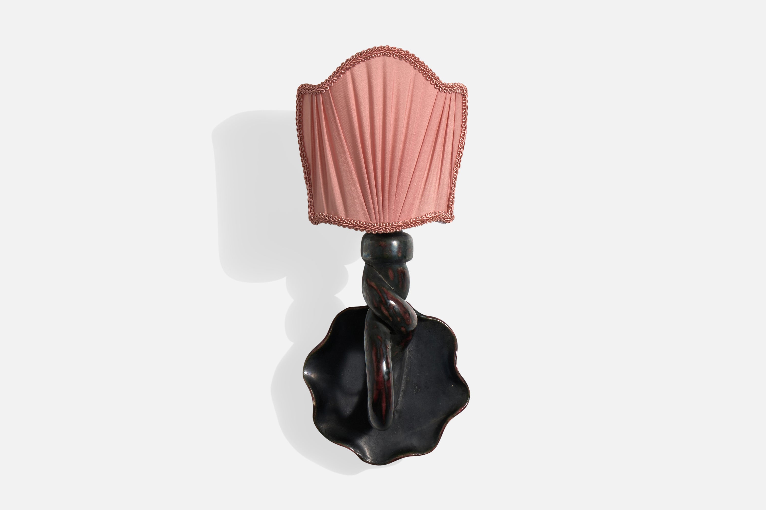 A black-glazed ceramic and pink fabric wall light designed and produced in France, c. 1950s.
