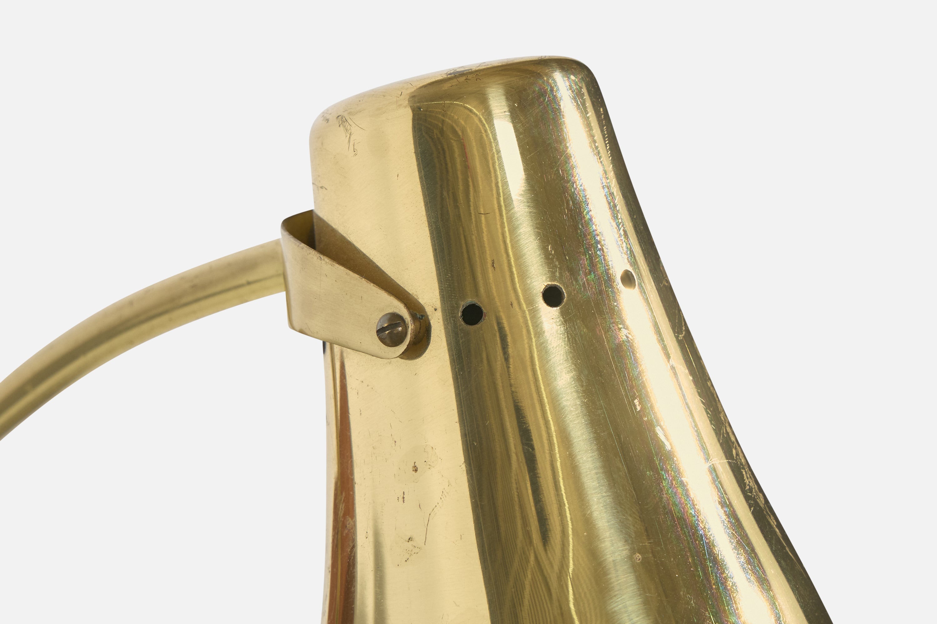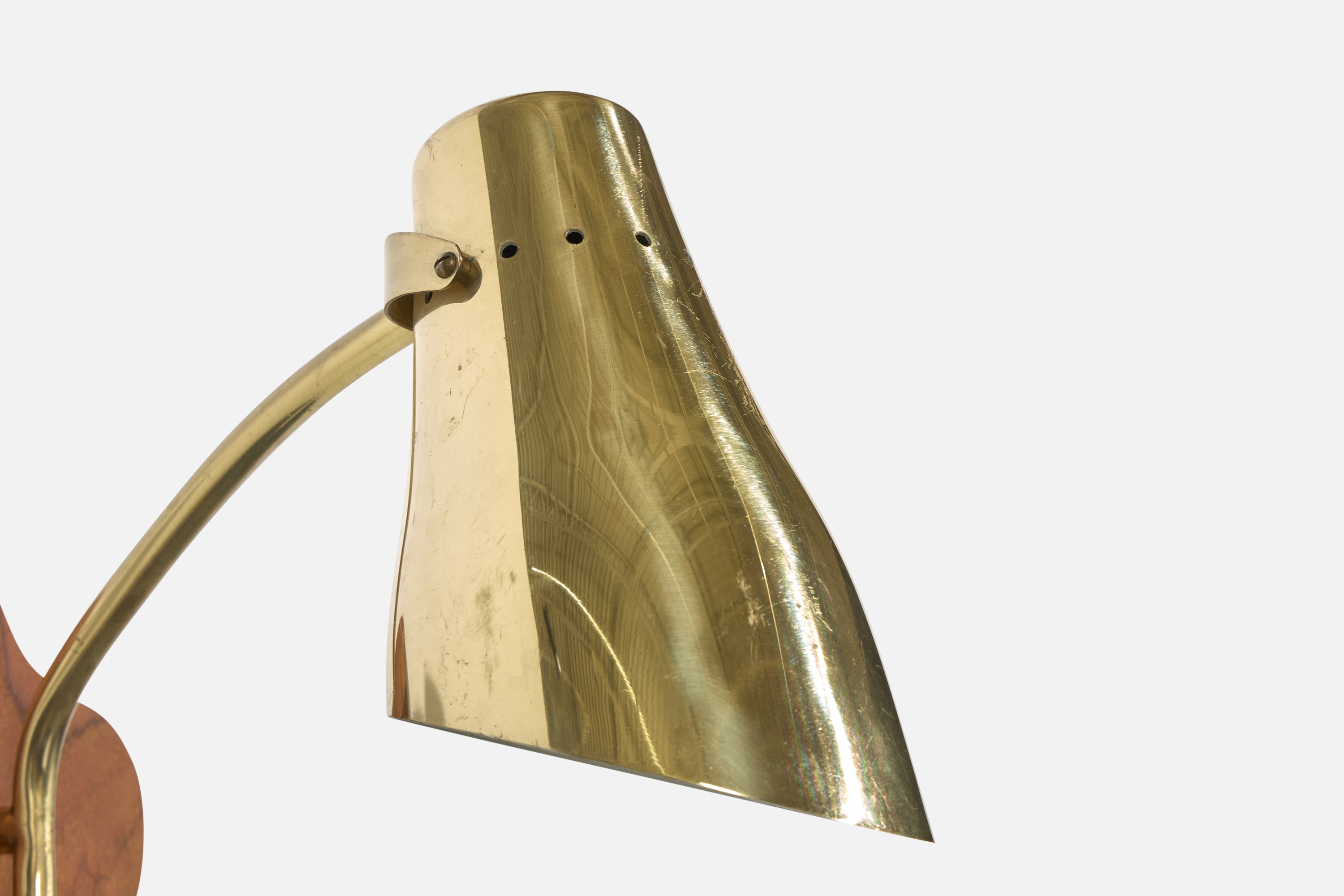 A pair of adjustable brass and wood wall lights designed and produced in Sweden, c. 1950s.