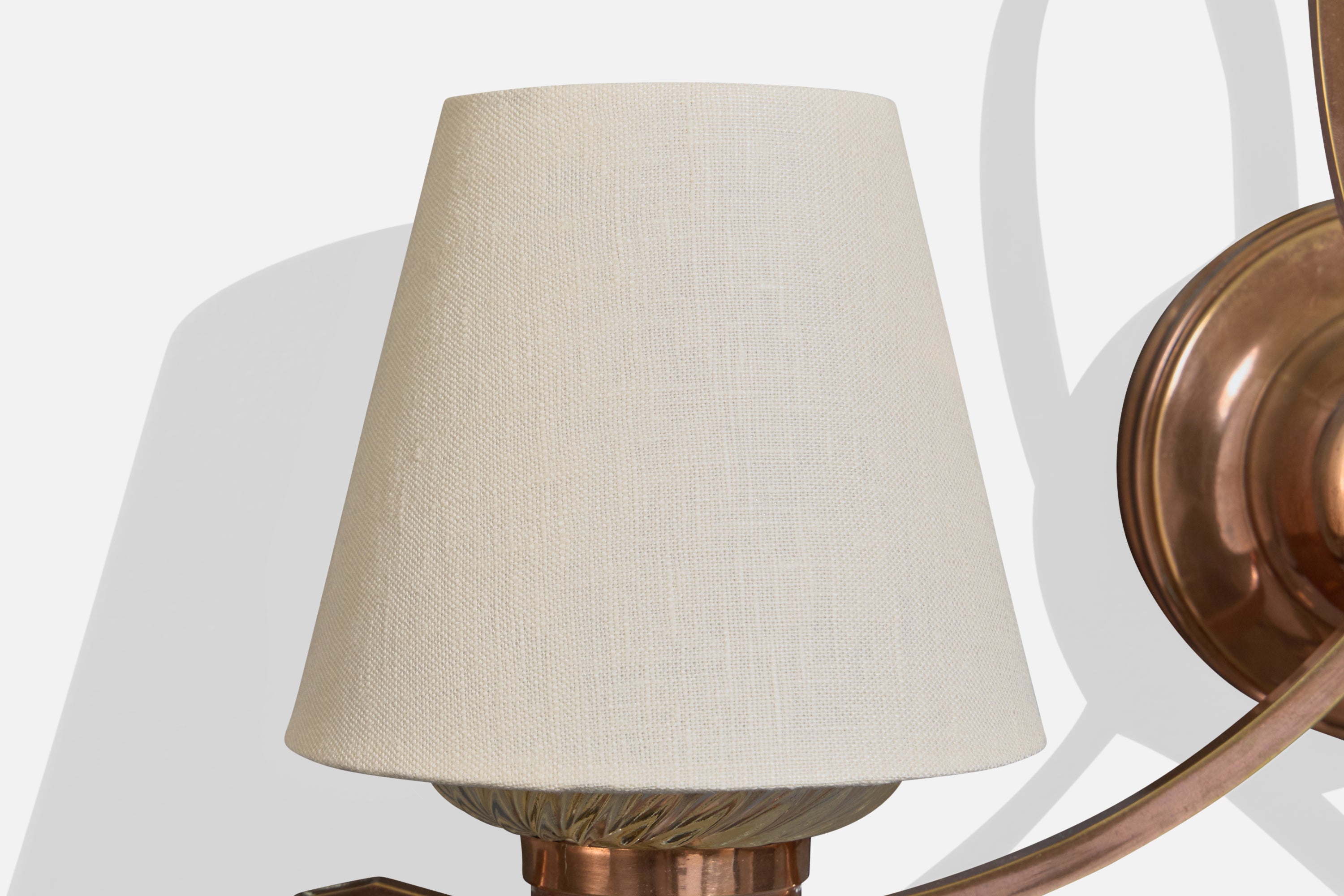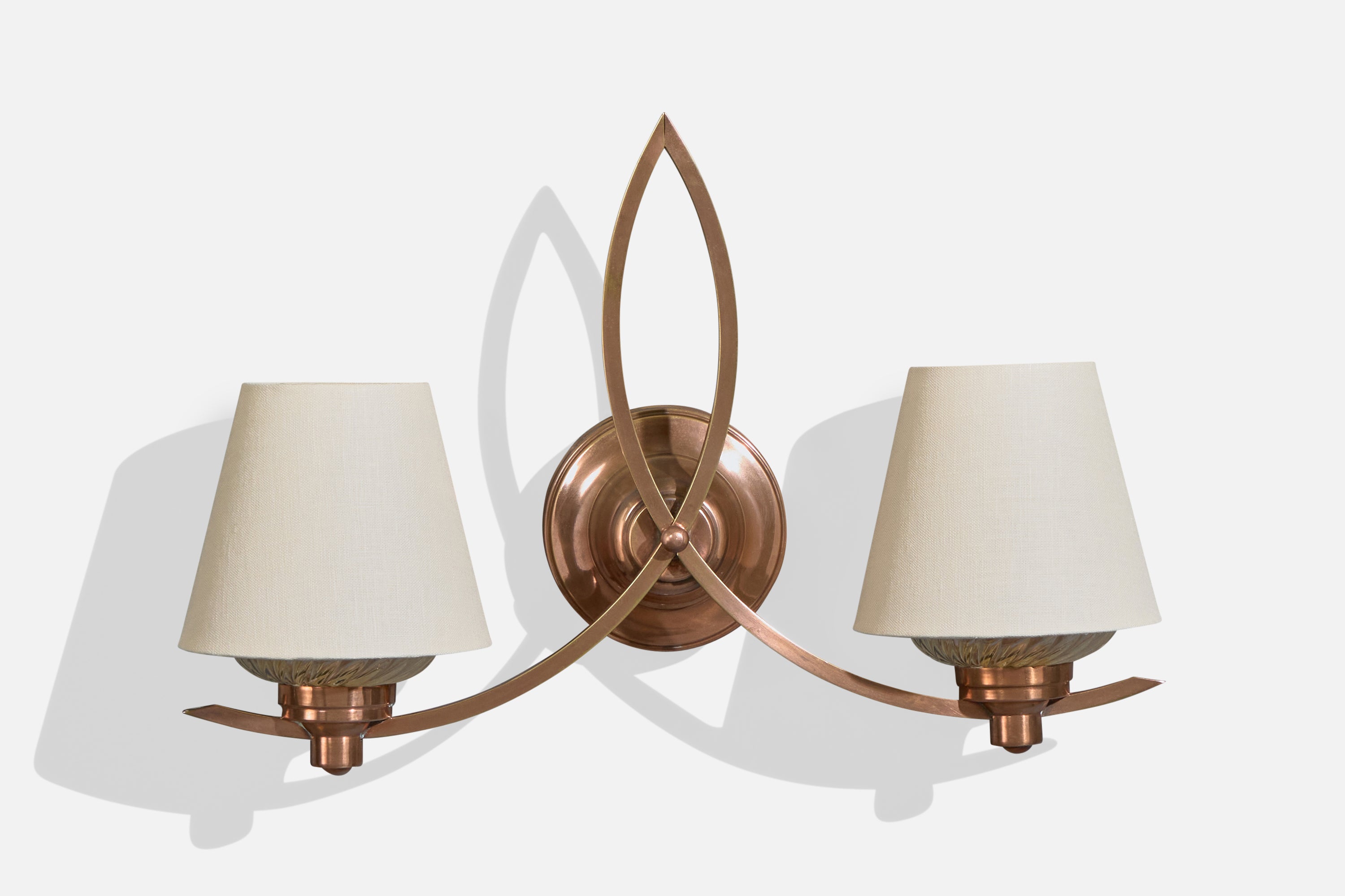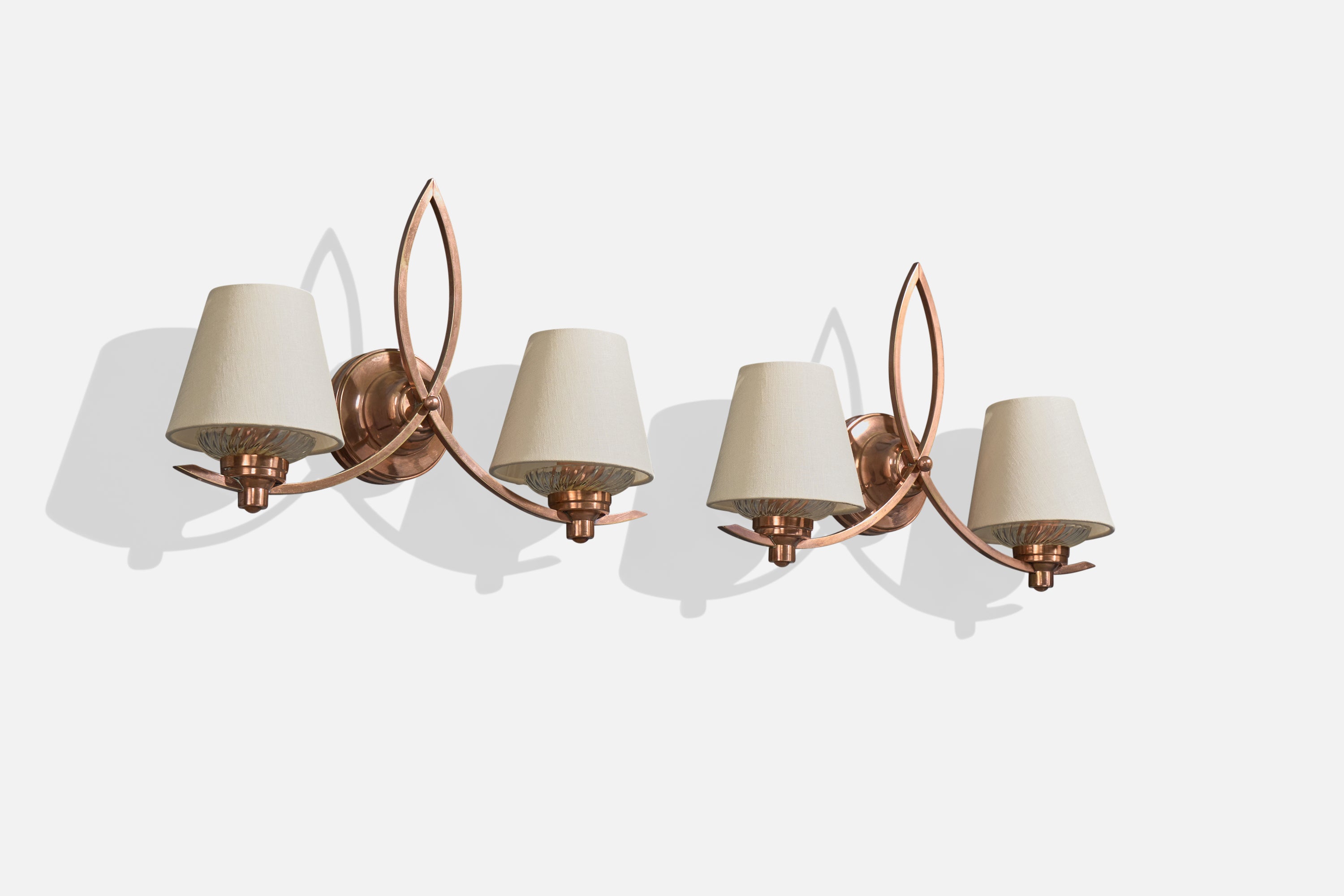 A pair of copper, glass and white fabric wall lights designed and produced in France, c. 1950s.