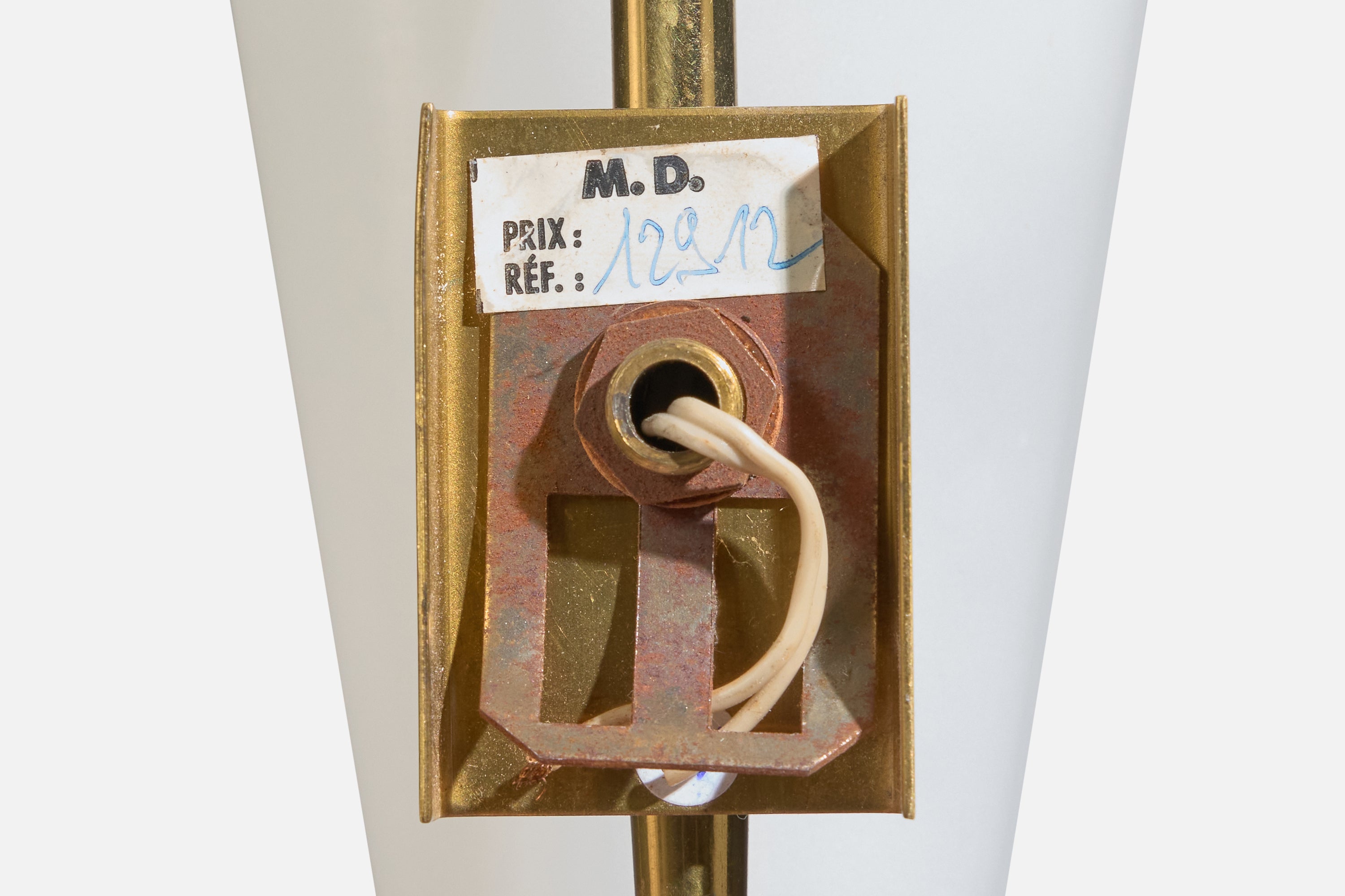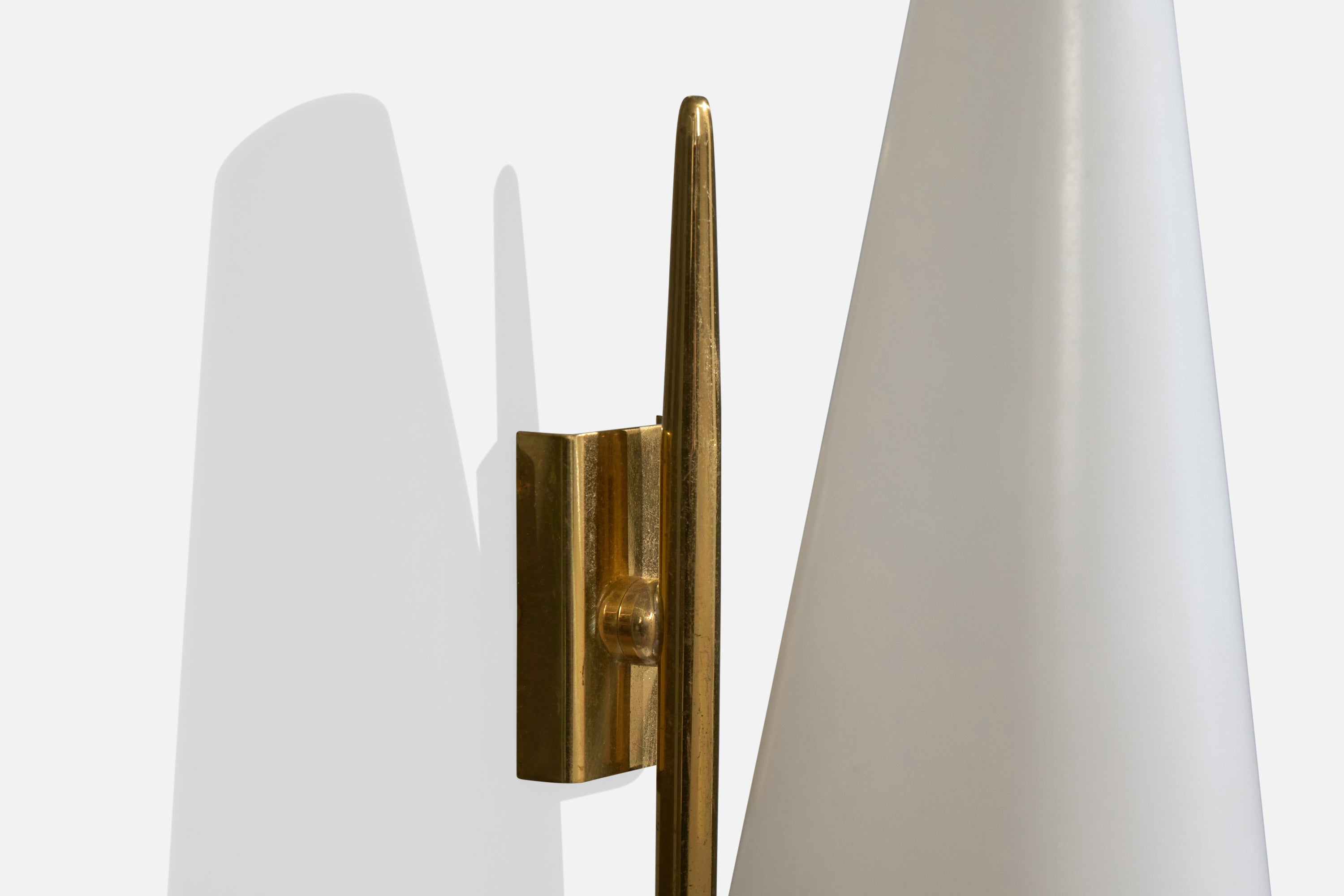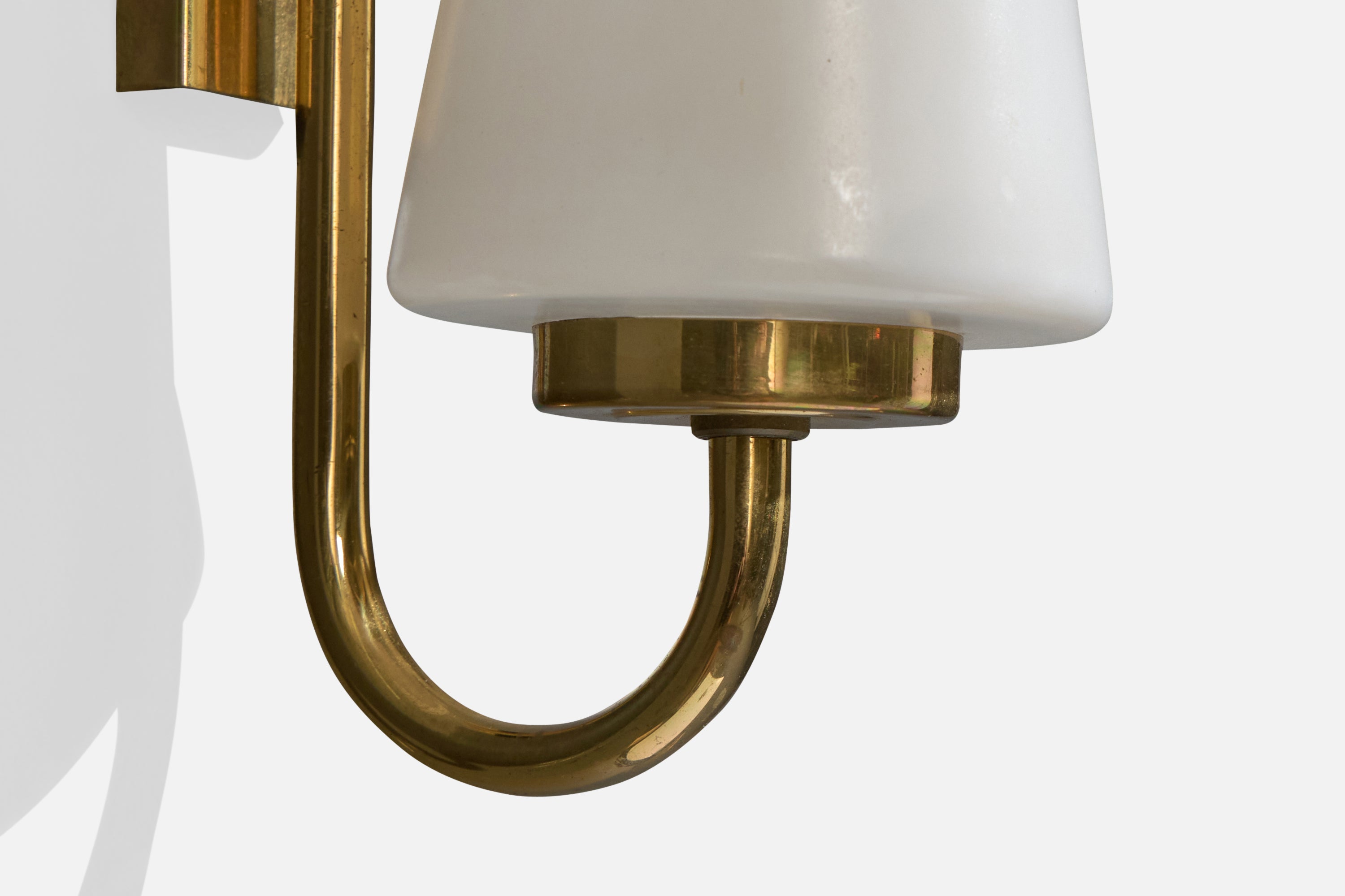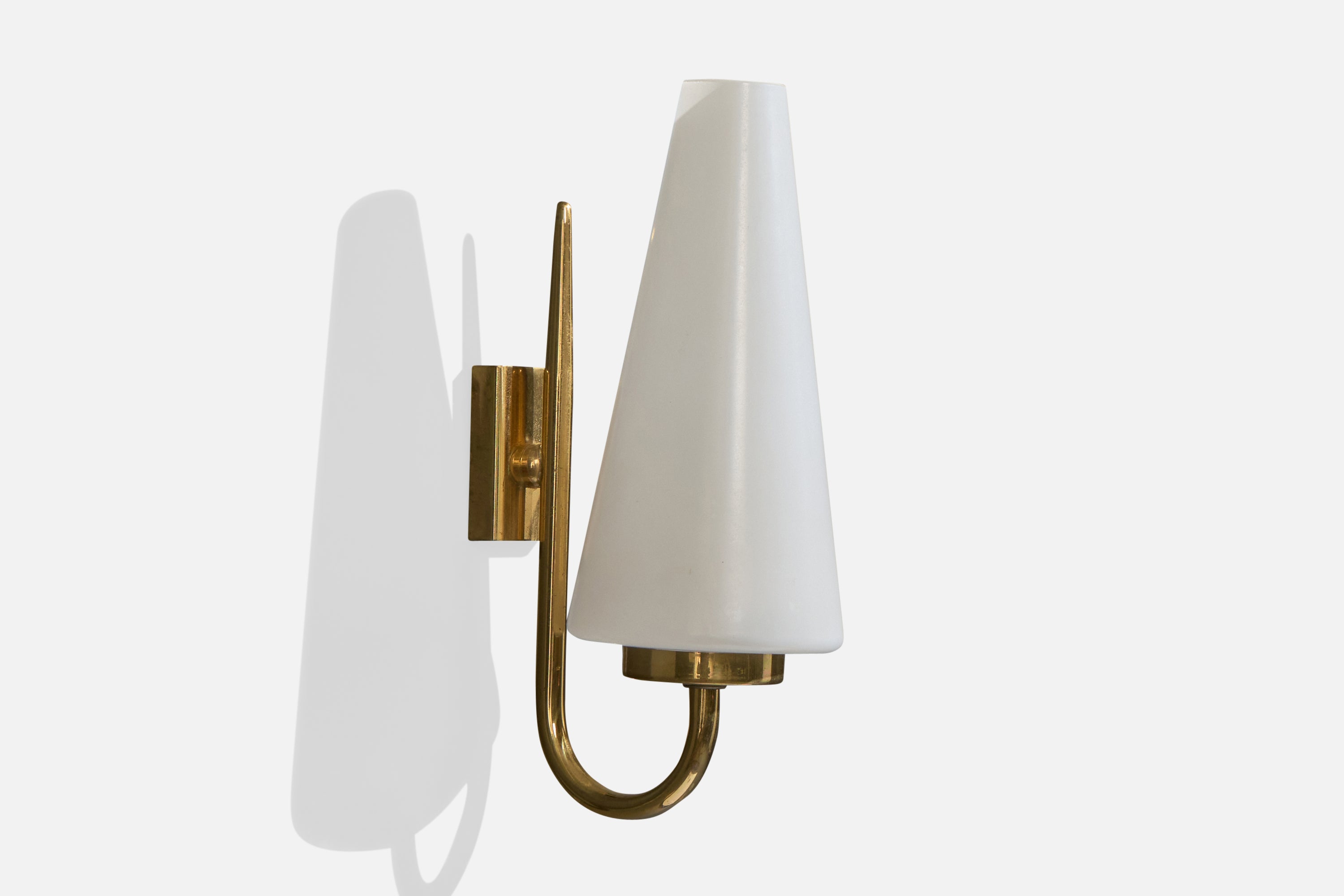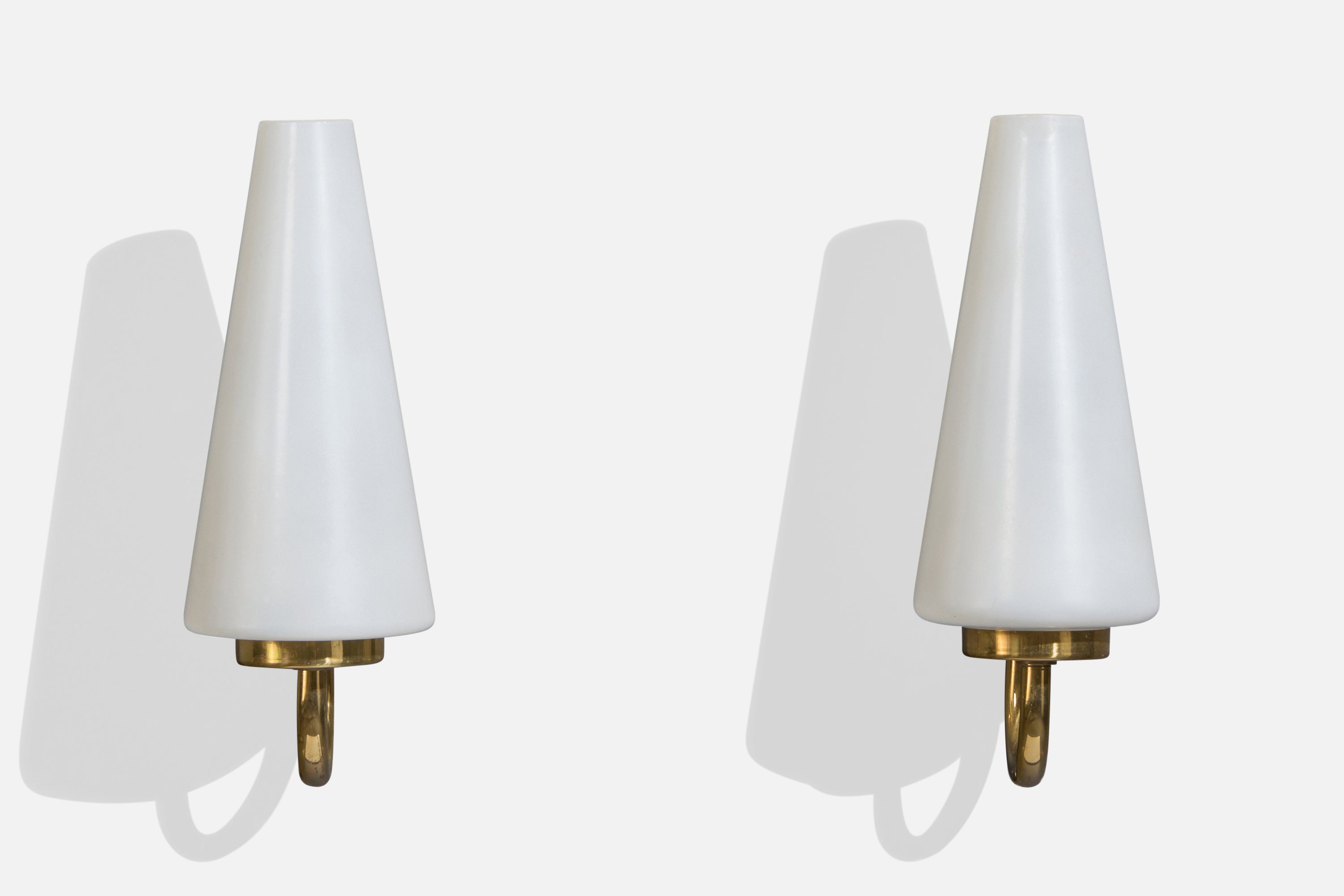 A pair of brass and white opaline glass wall lights designed and produced in France, c. 1950s.