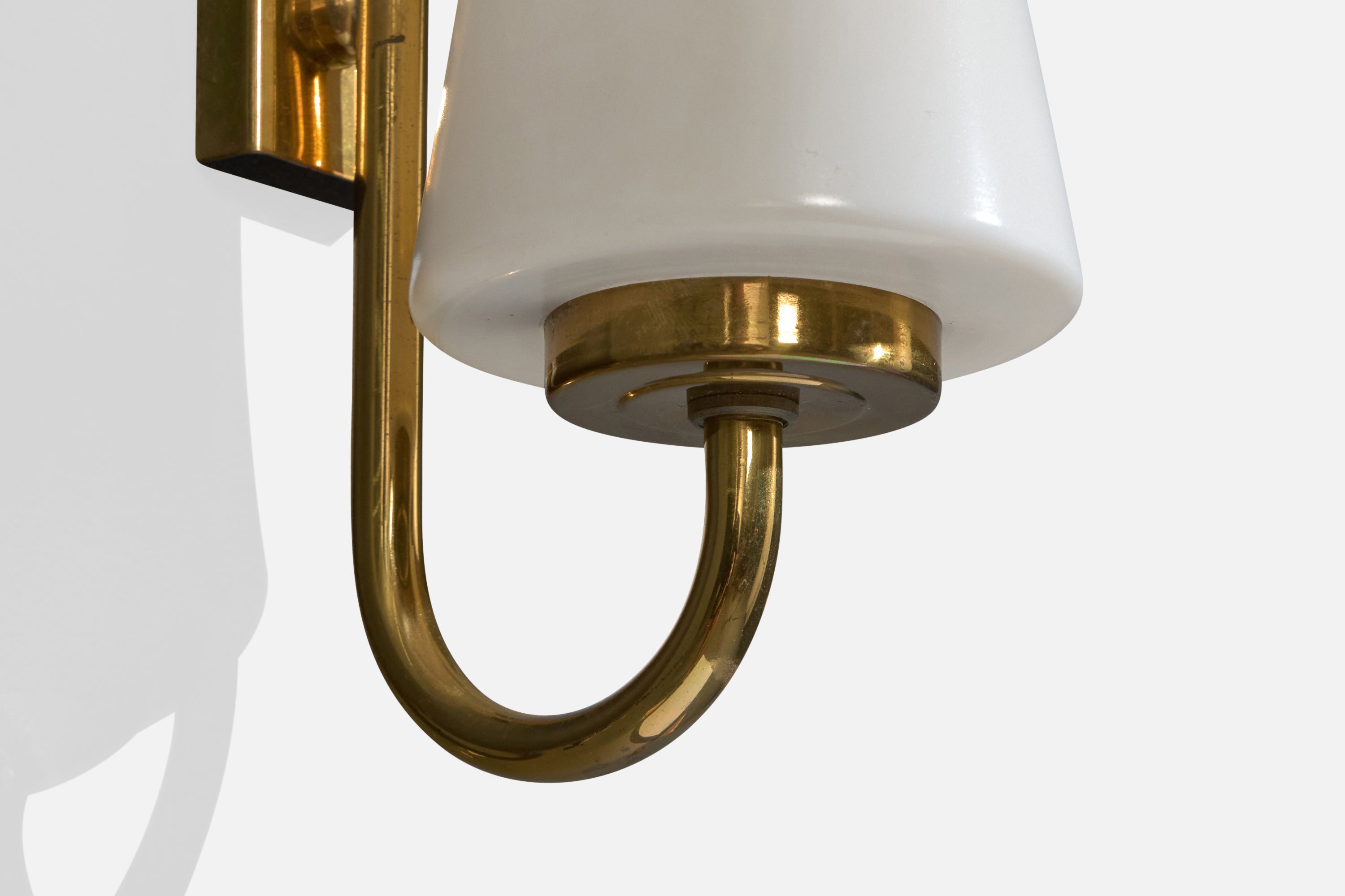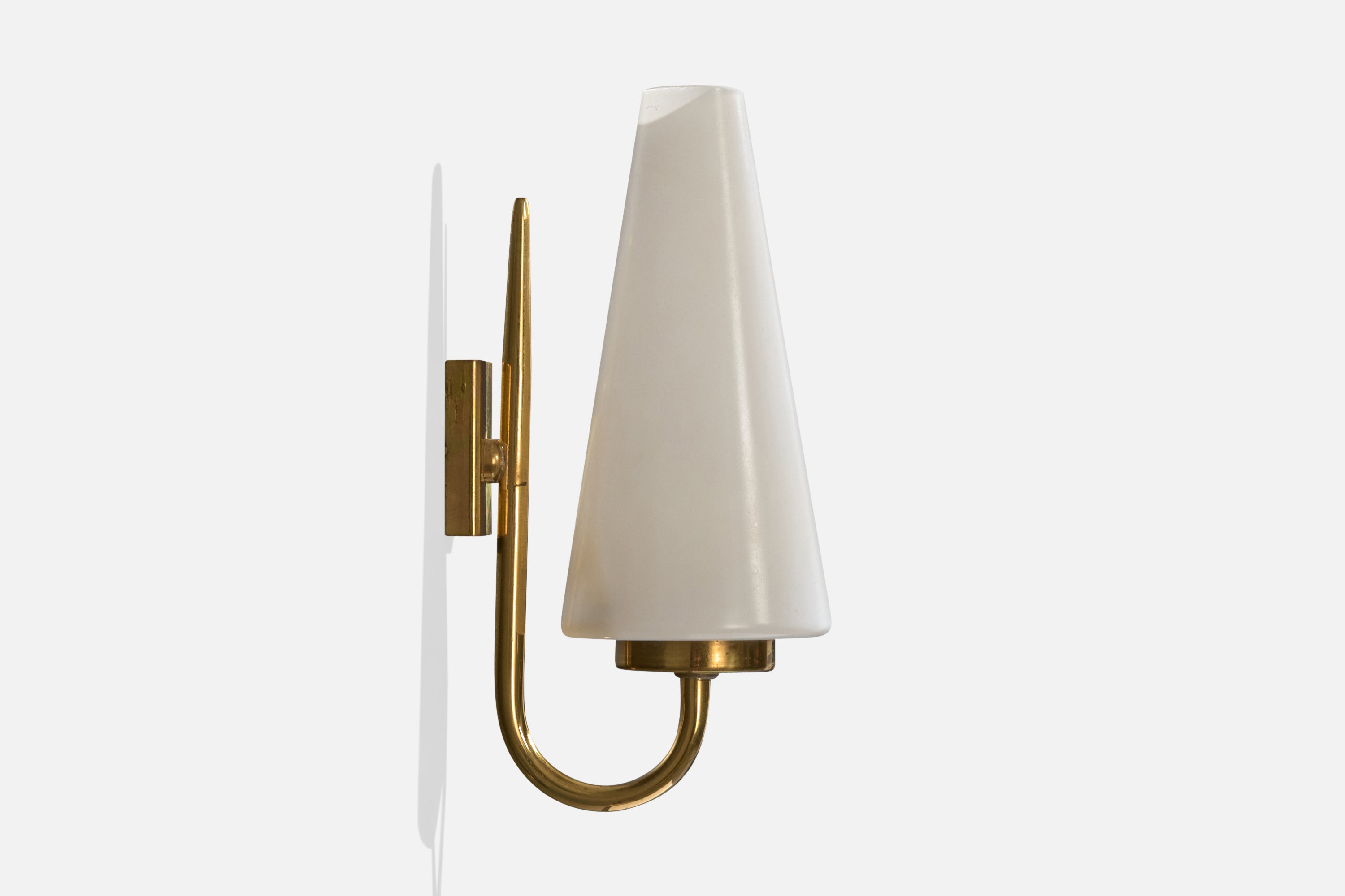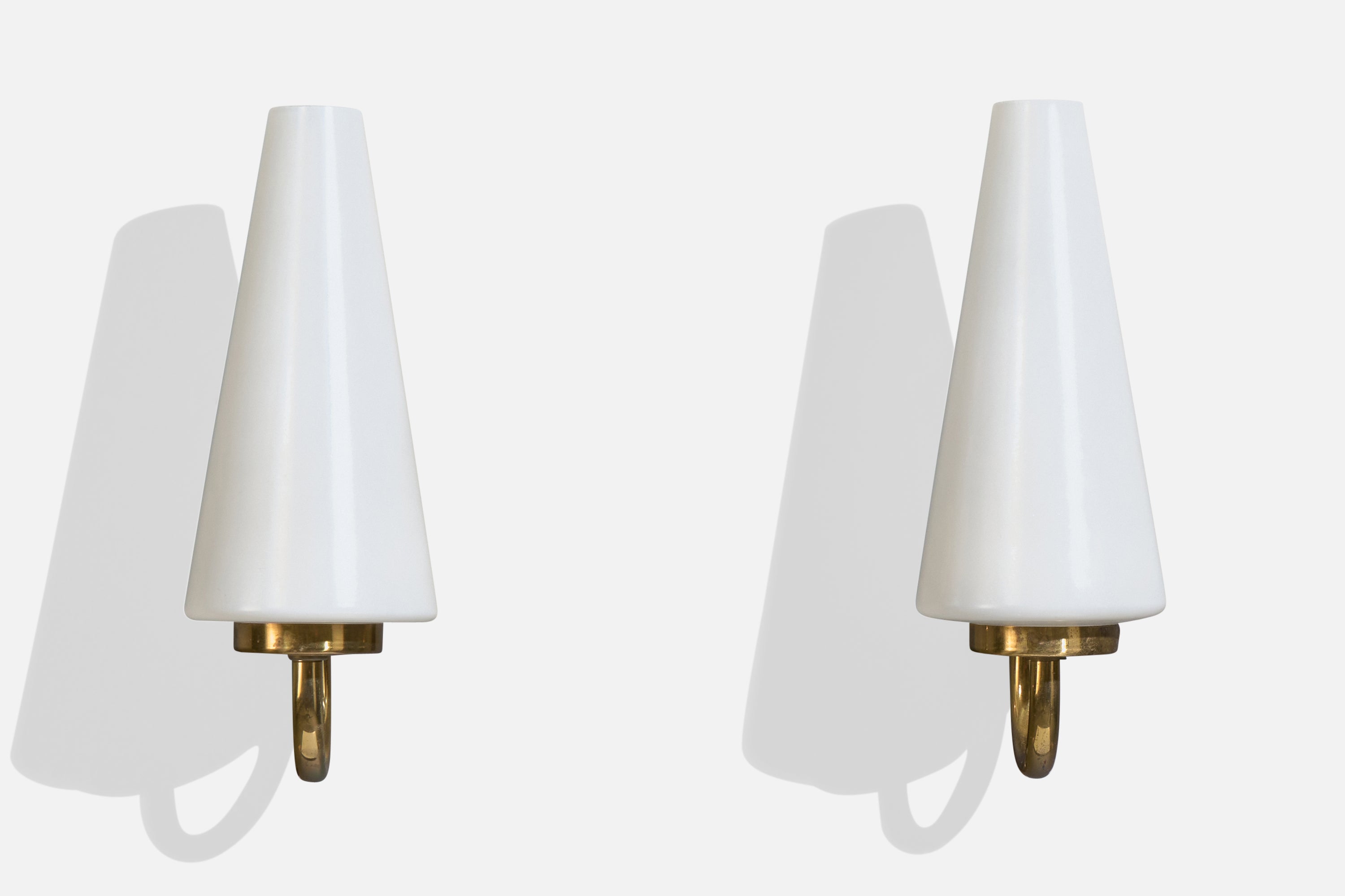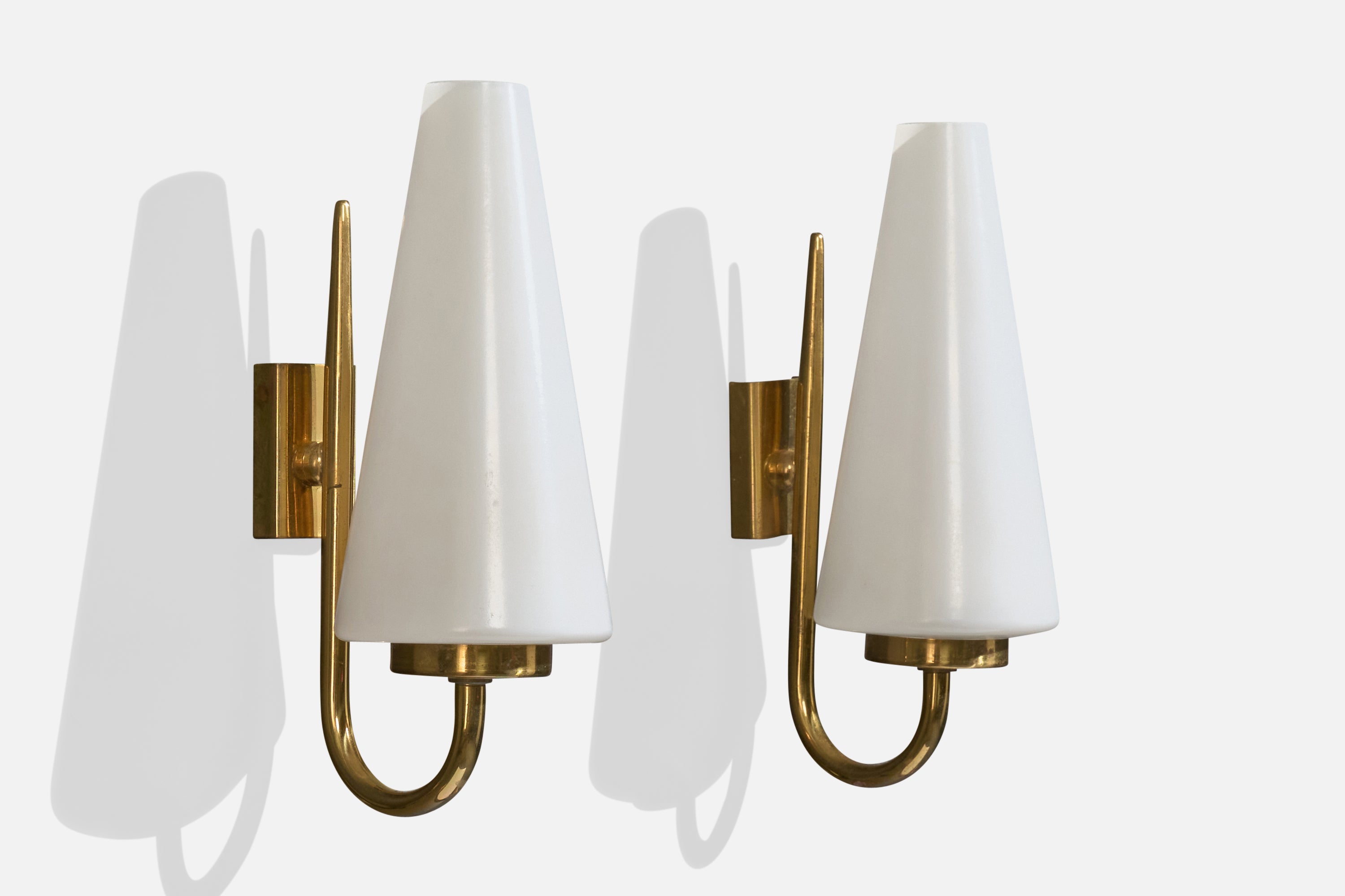 A pair of brass and white opaline glass wall lights designed and produced in France, c. 1950s.