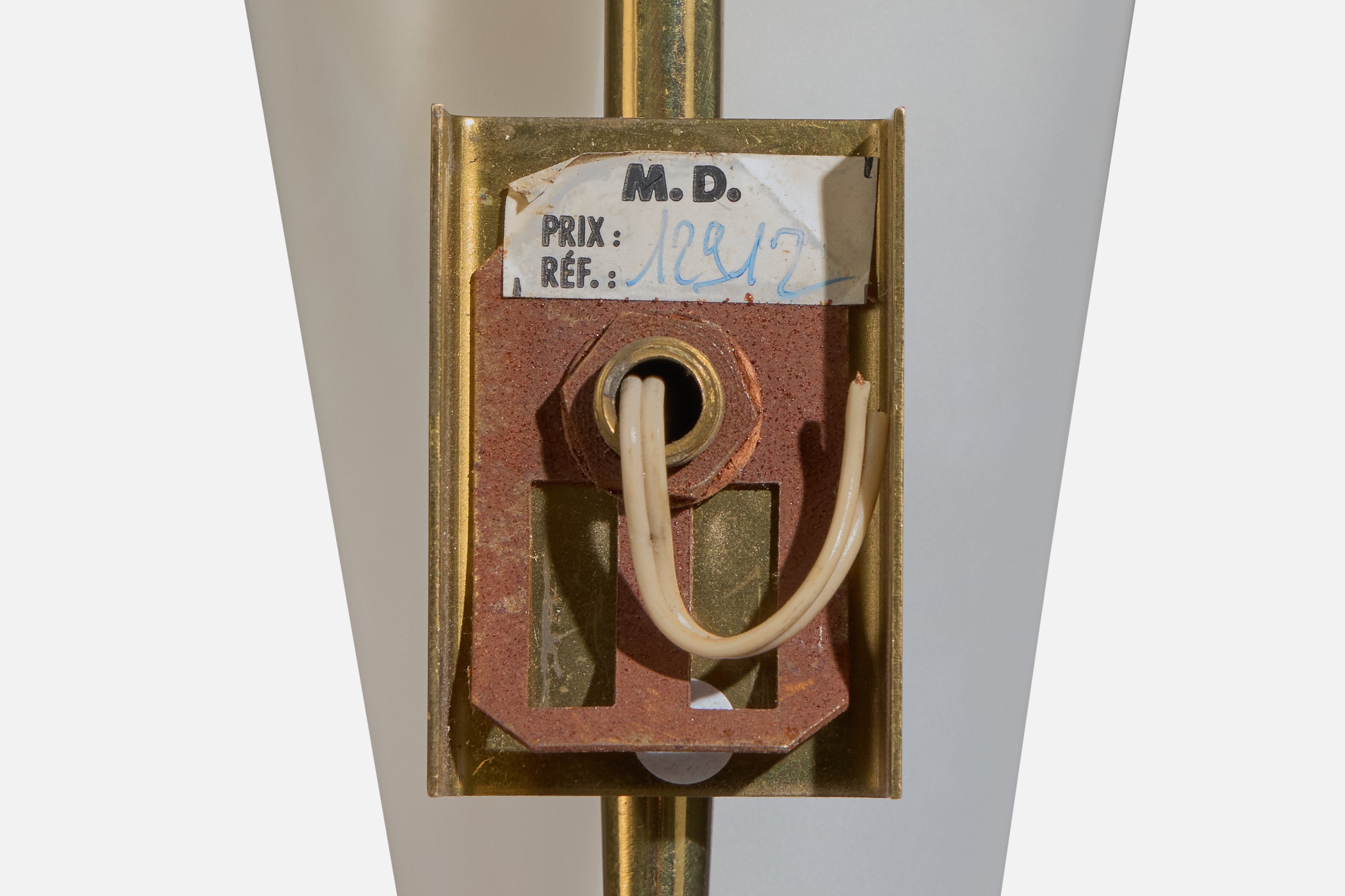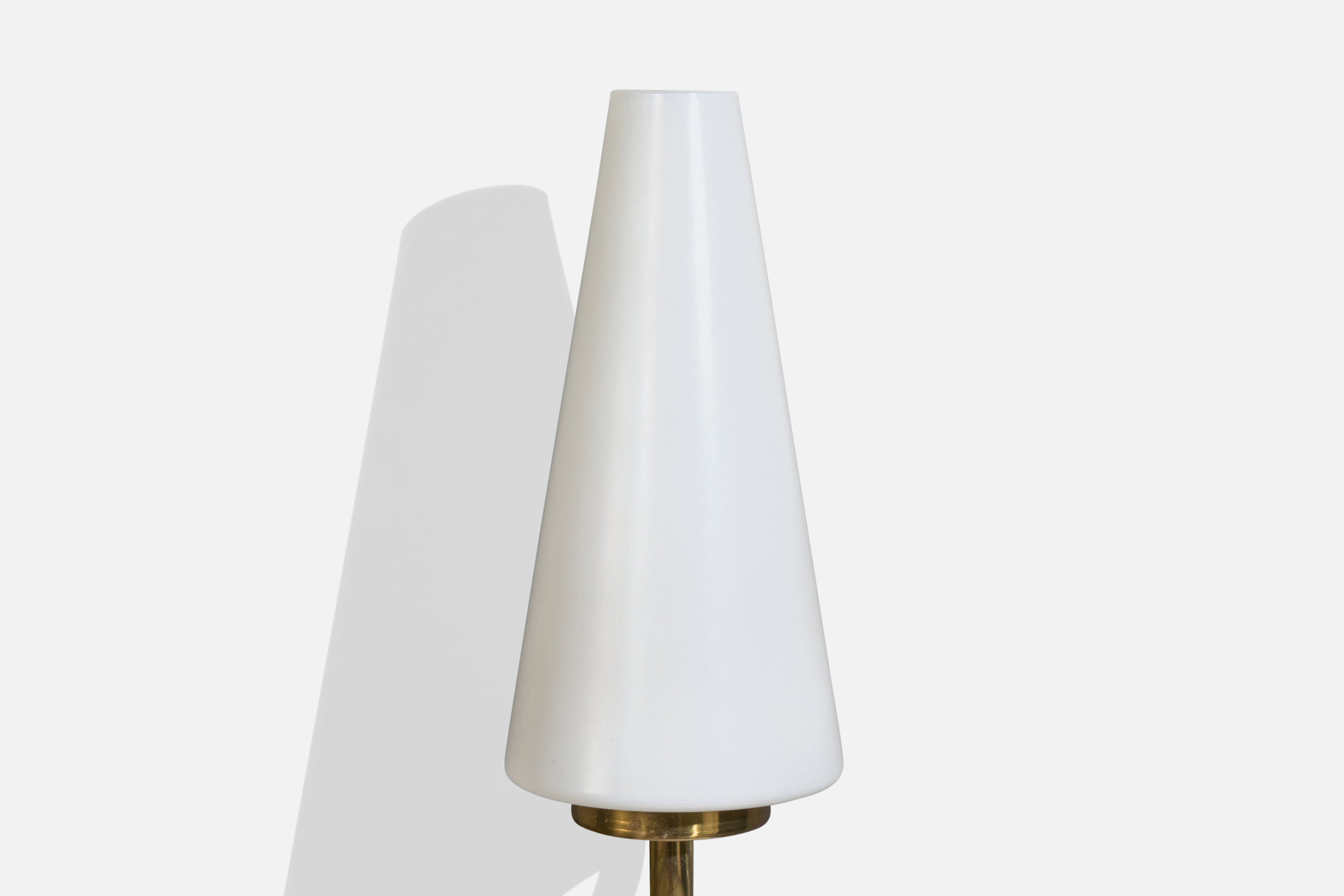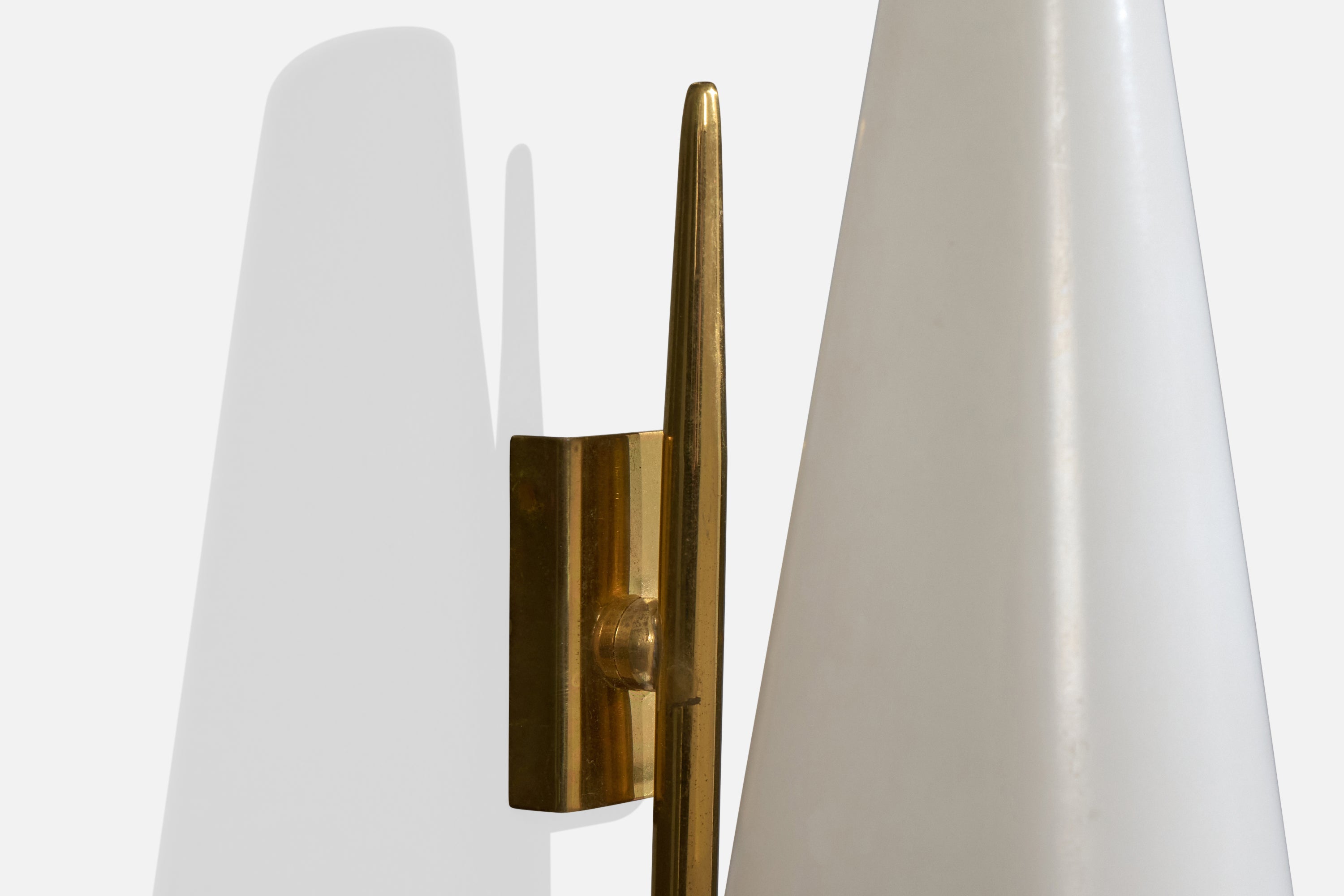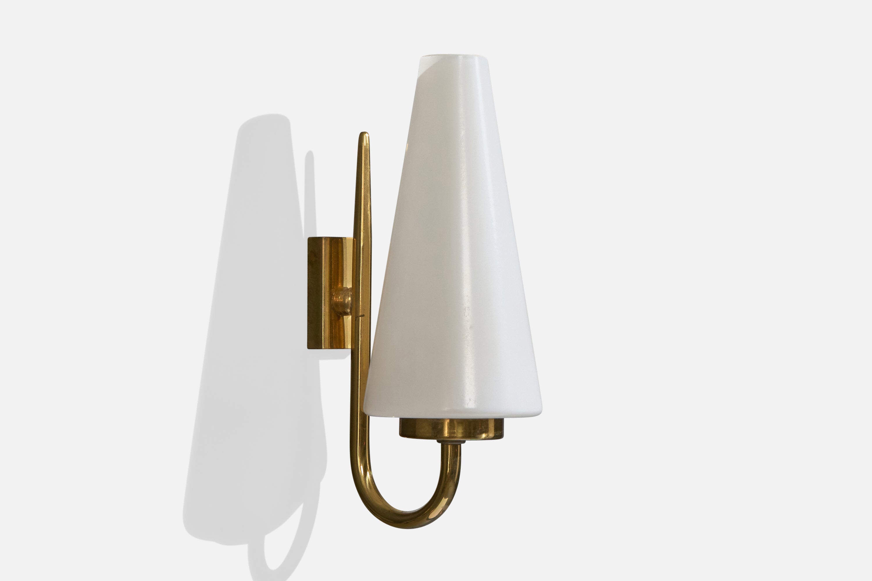 A pair of brass and white opaline glass wall lights designed and produced in France, c. 1950s.
