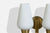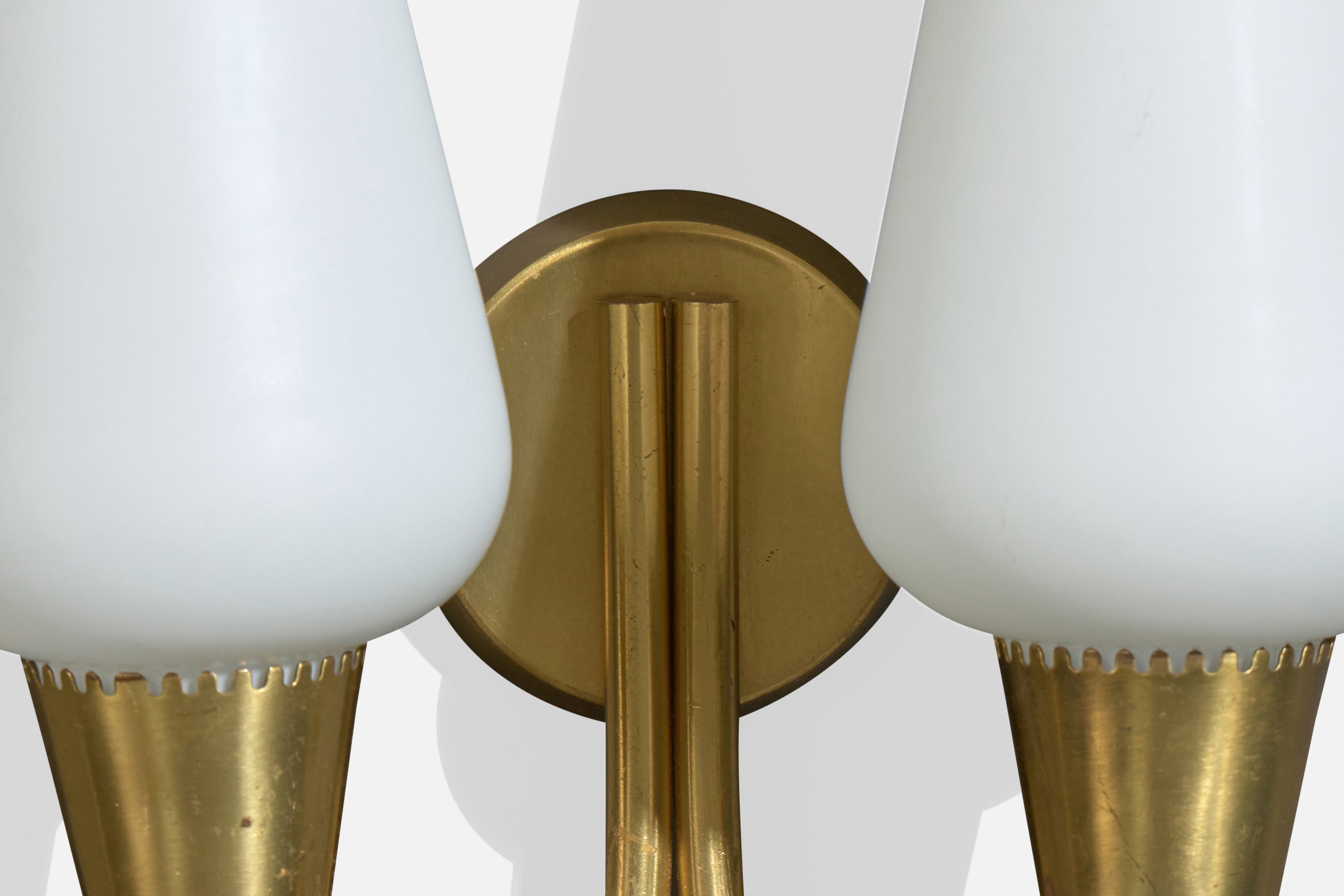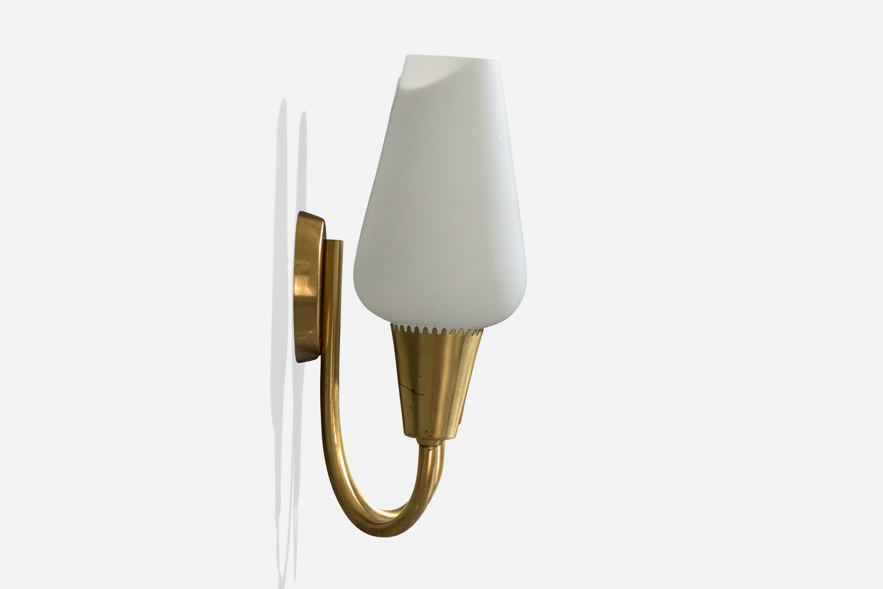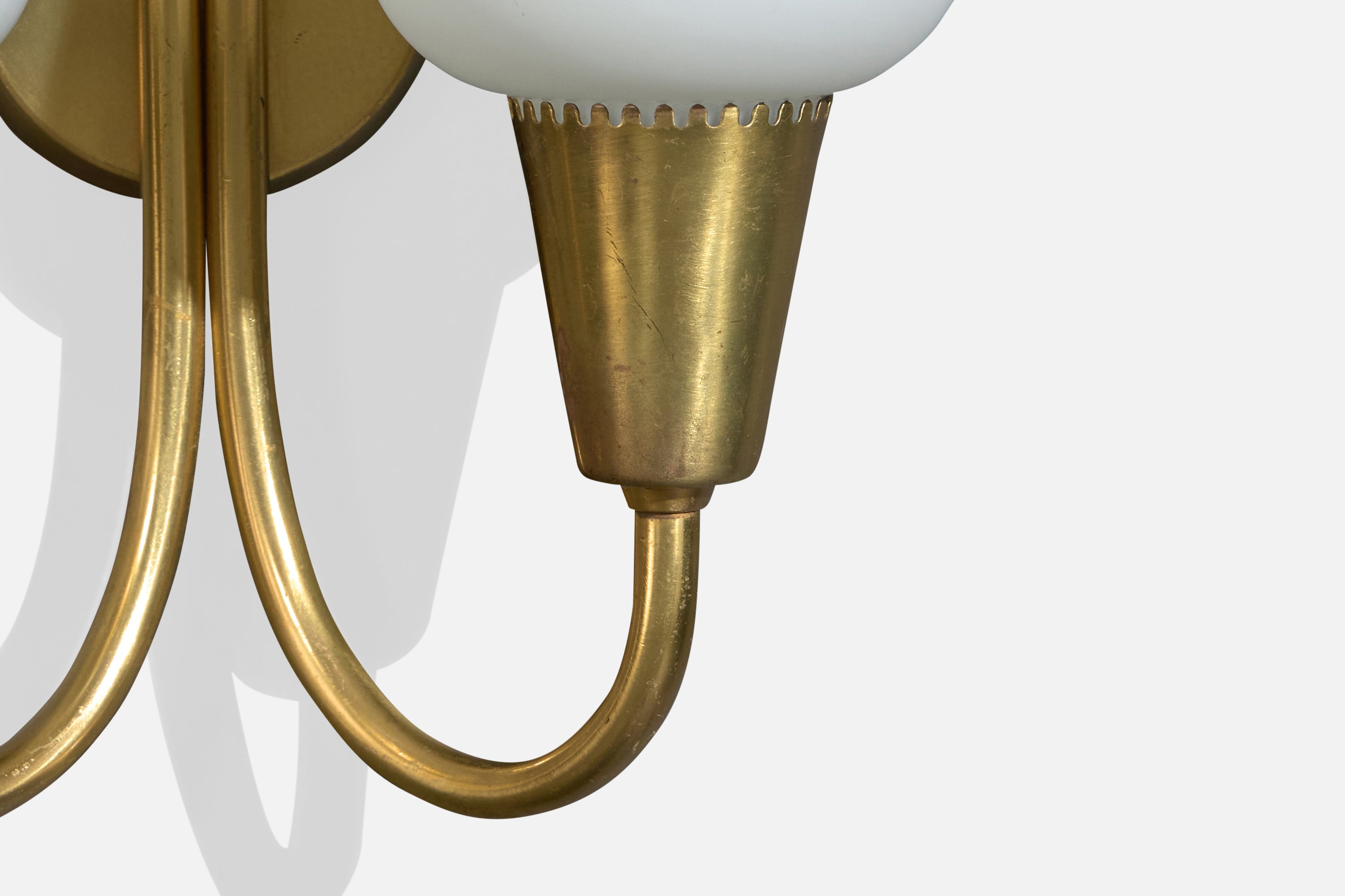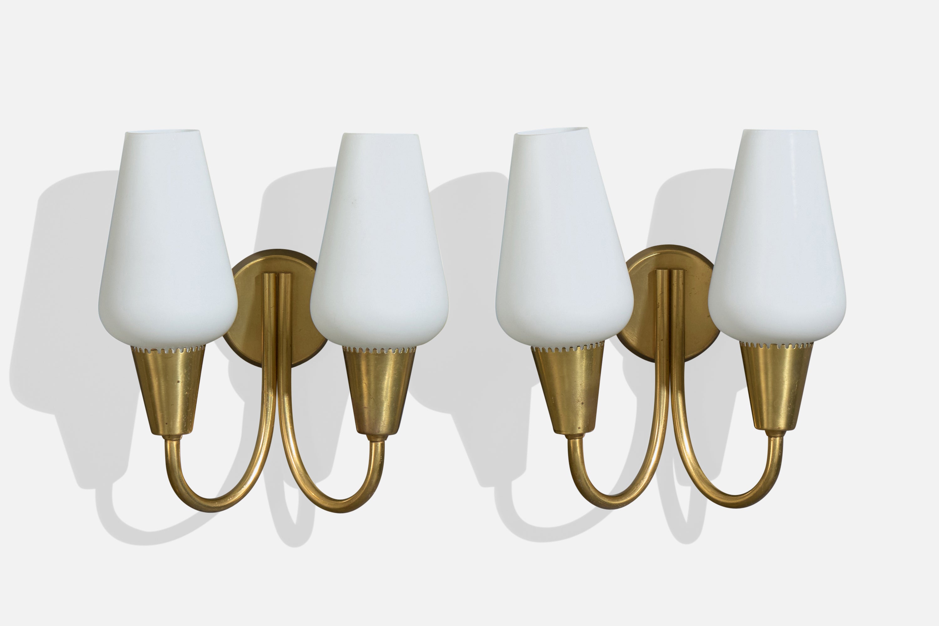 A pair of brass and white opaline glass wall lights produced by Lyfa, Denmark, c. 1940s.