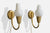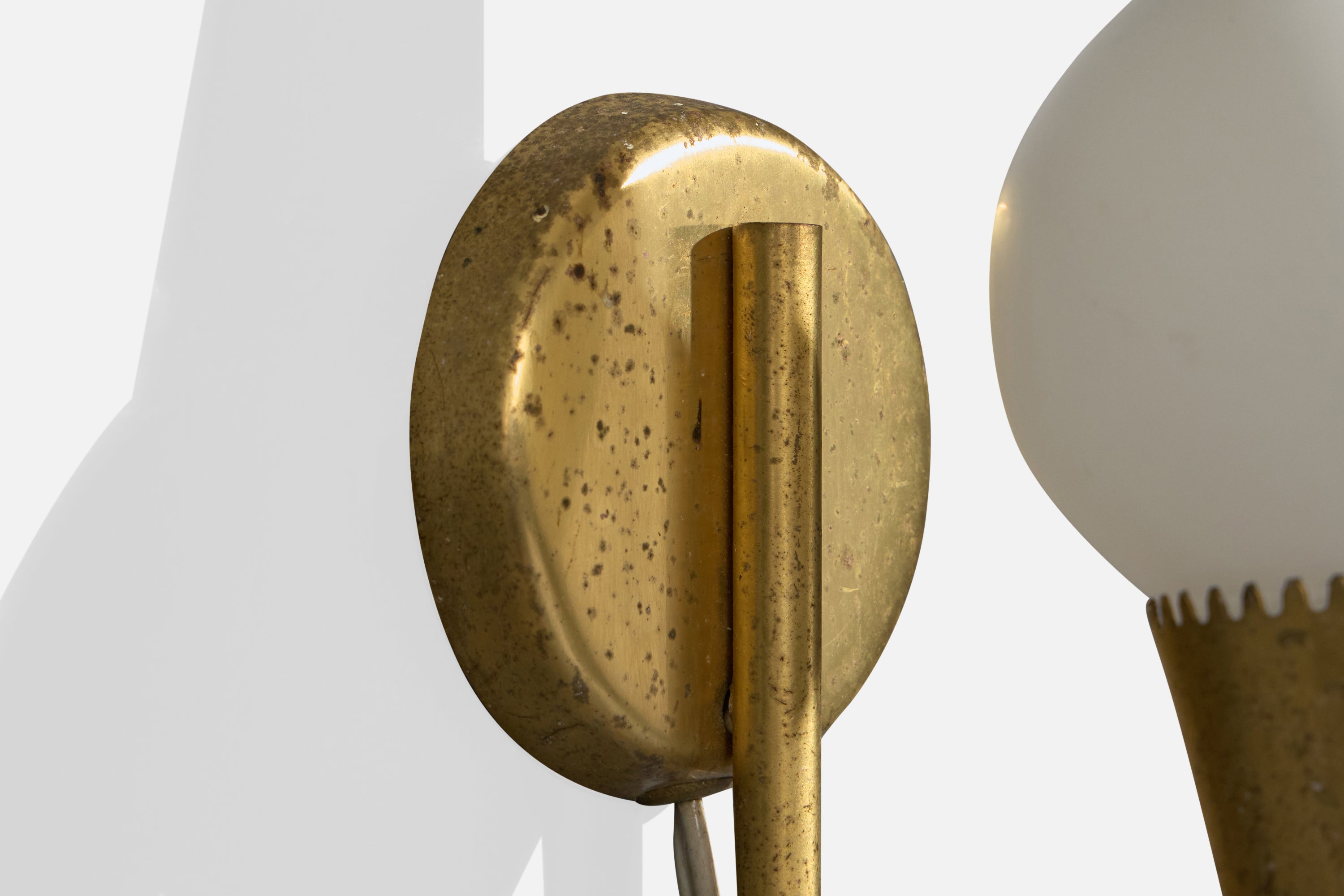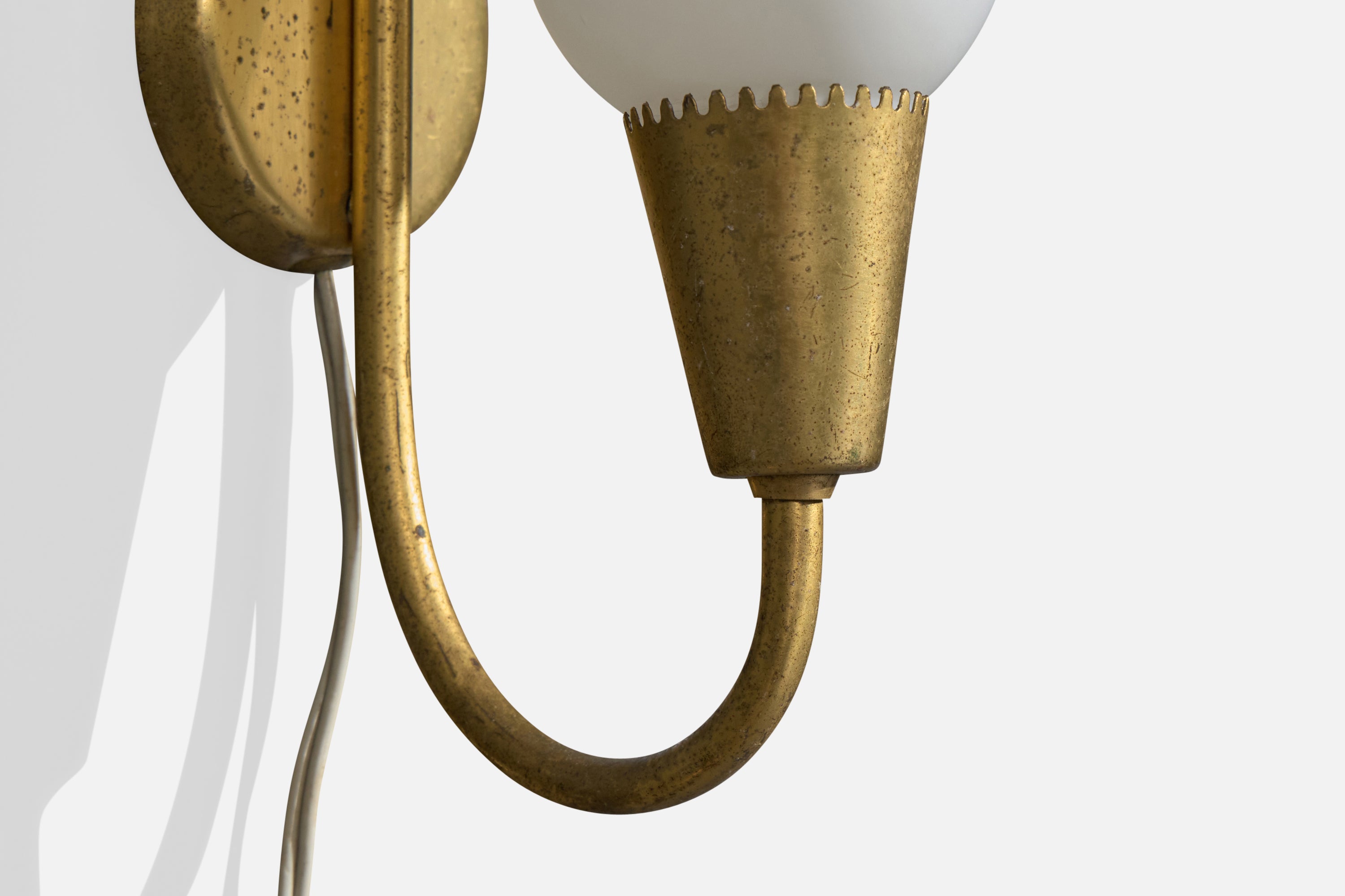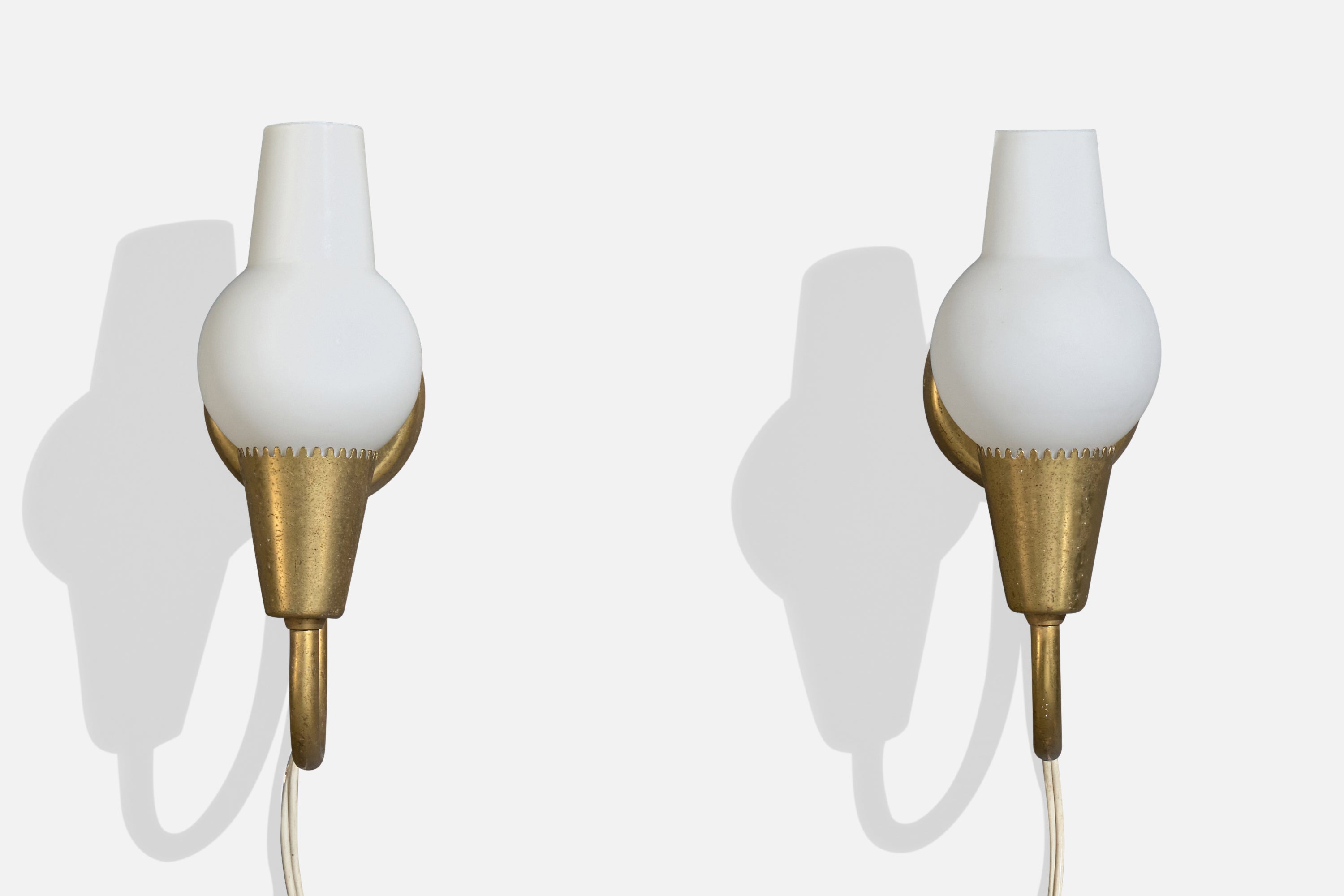 A pair of brass and white opaline glass wall lights produced by Lyfa, Denmark, c. 1940s.