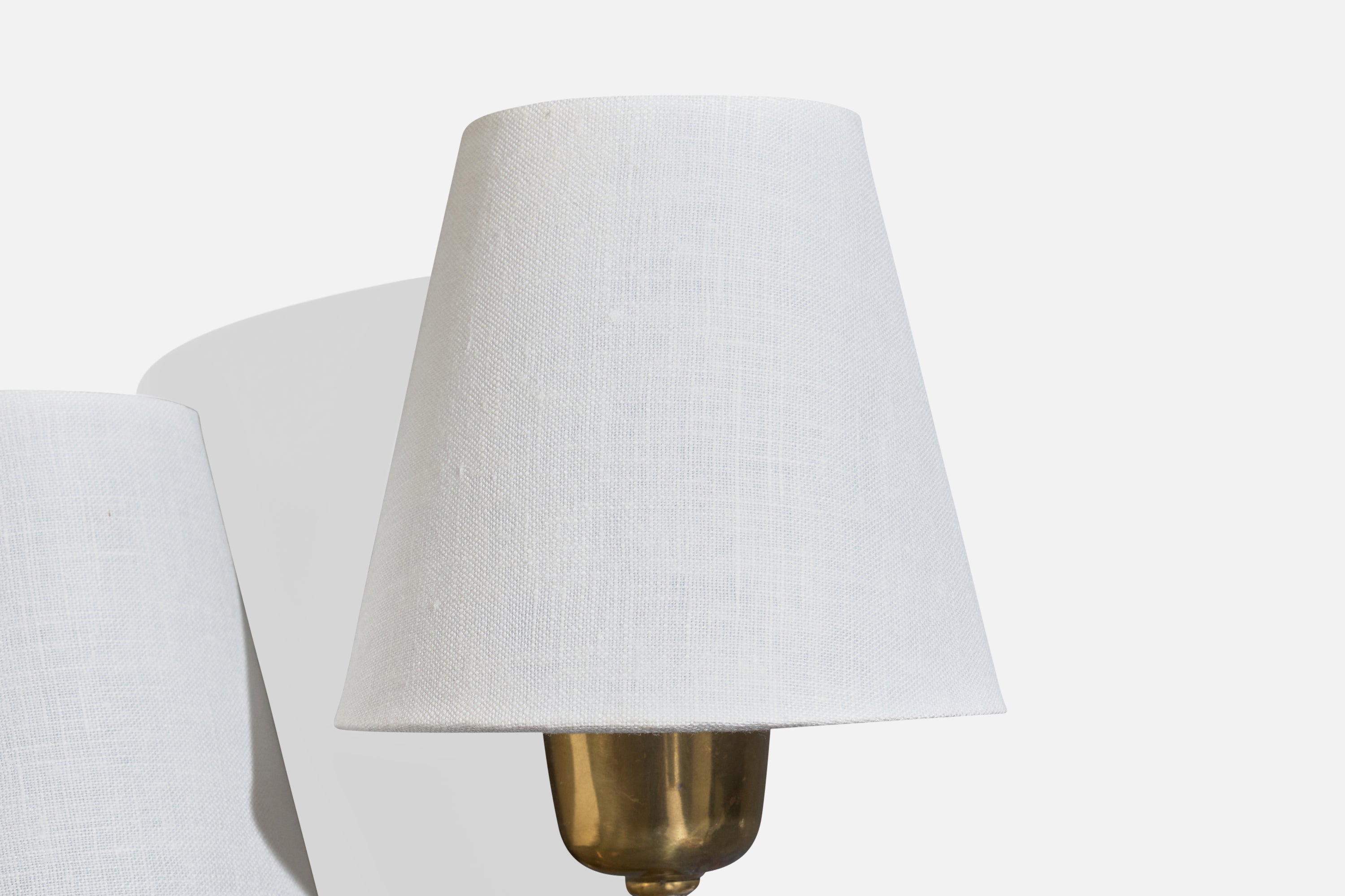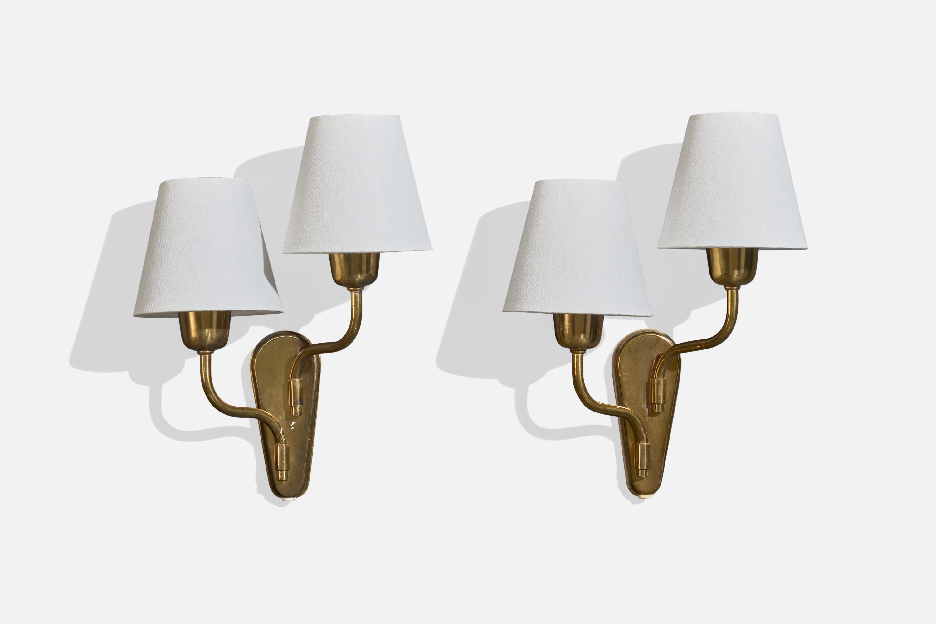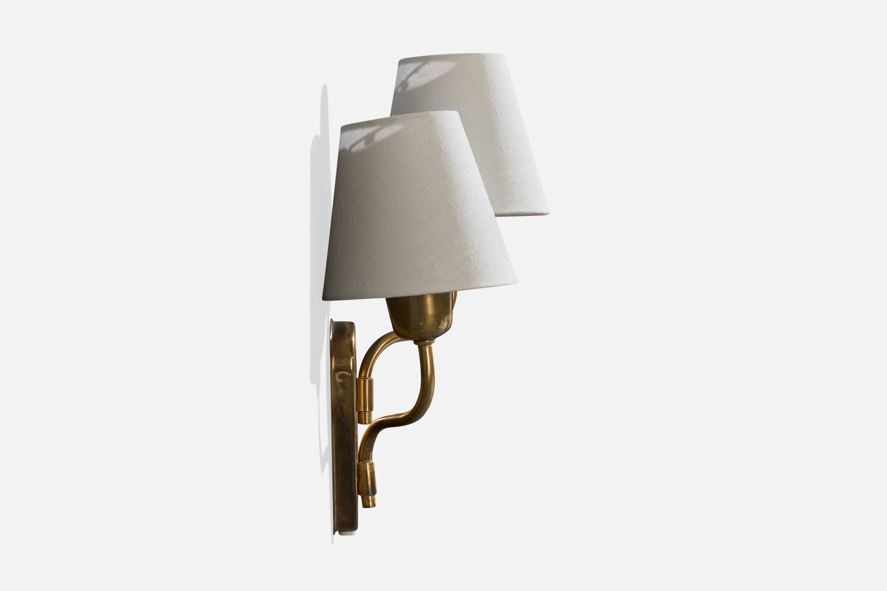 A pair of brass and white fabric wall lights designed and produced in Denmark, c. 1950s.