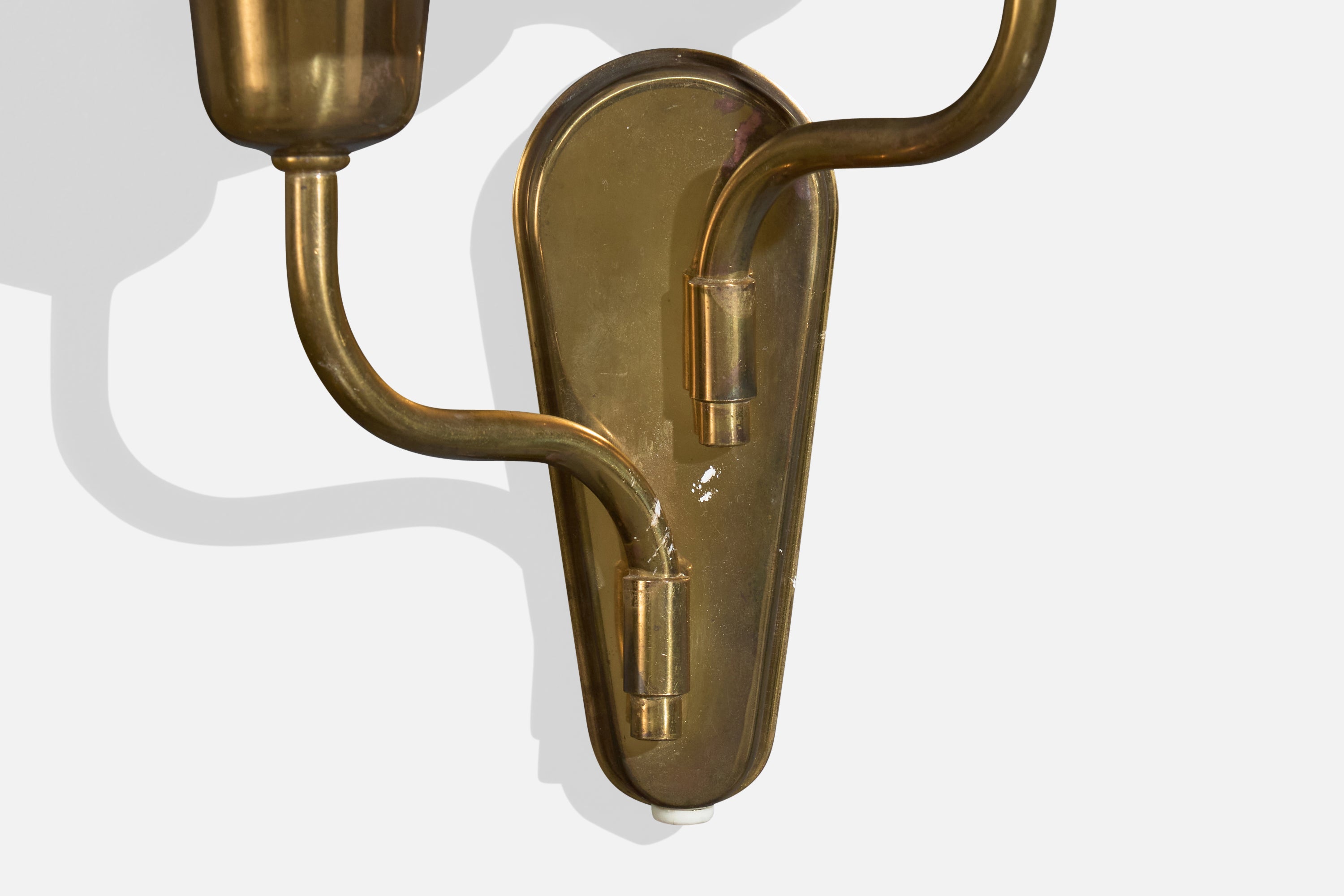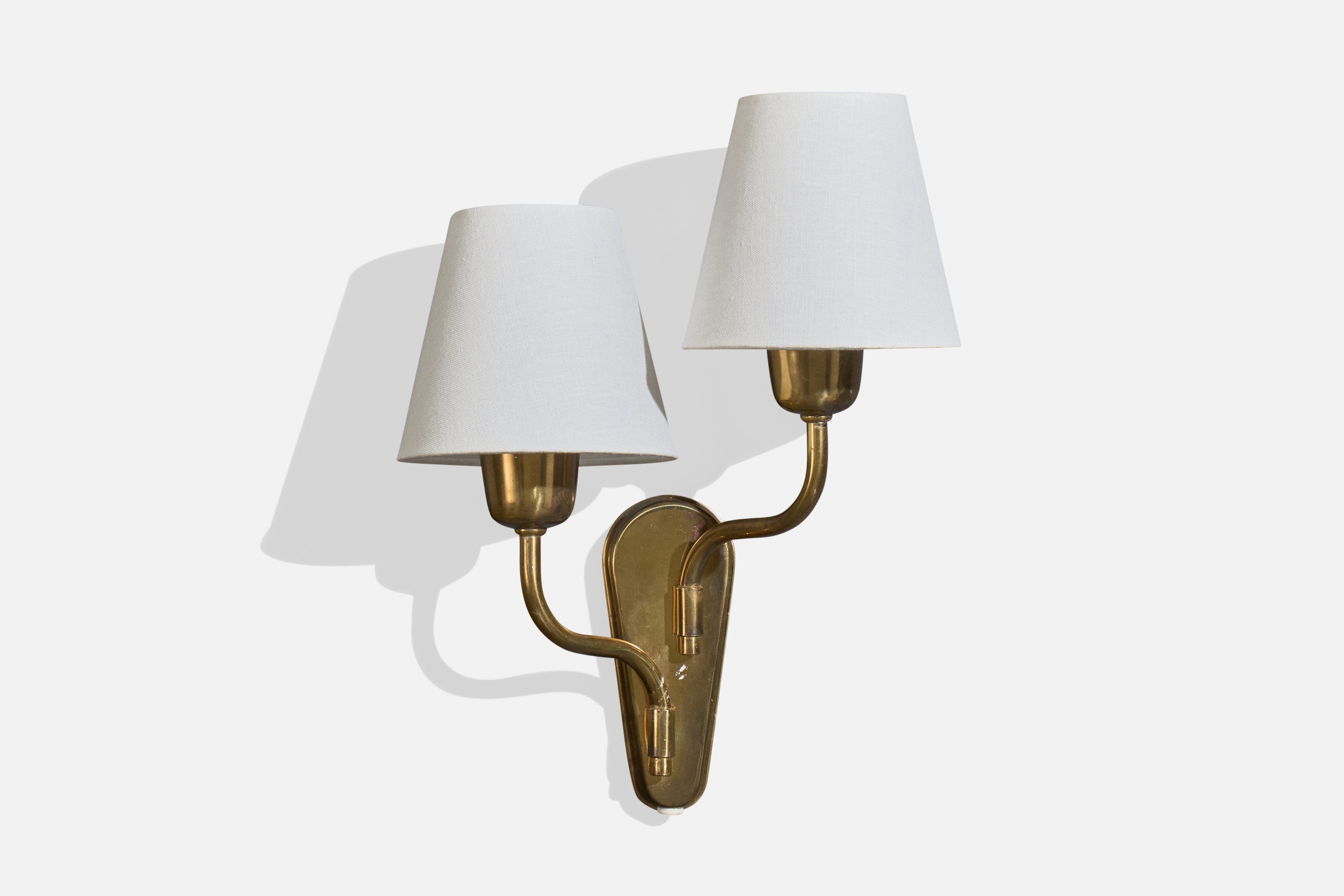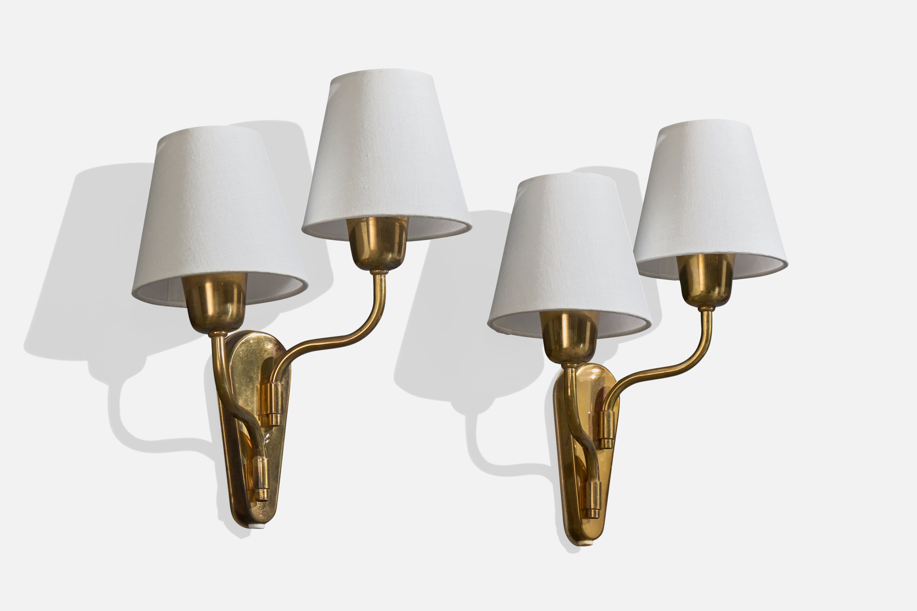 A pair of brass and white fabric wall lights designed and produced in Denmark, c. 1950s.