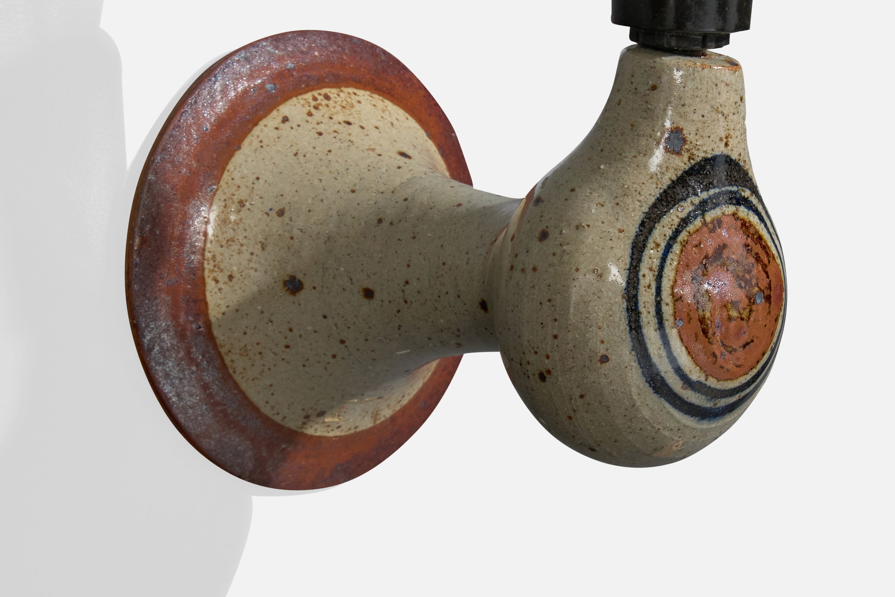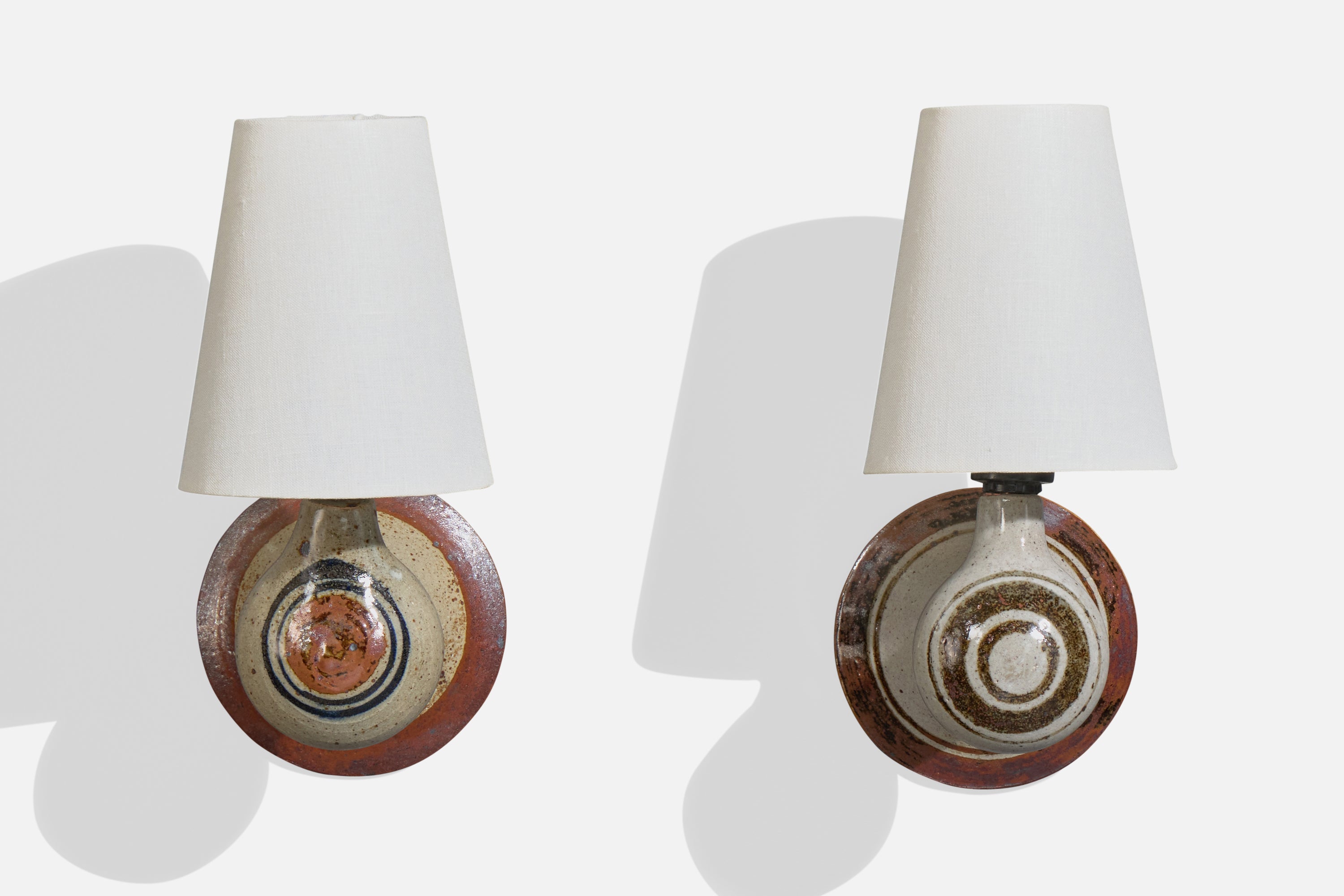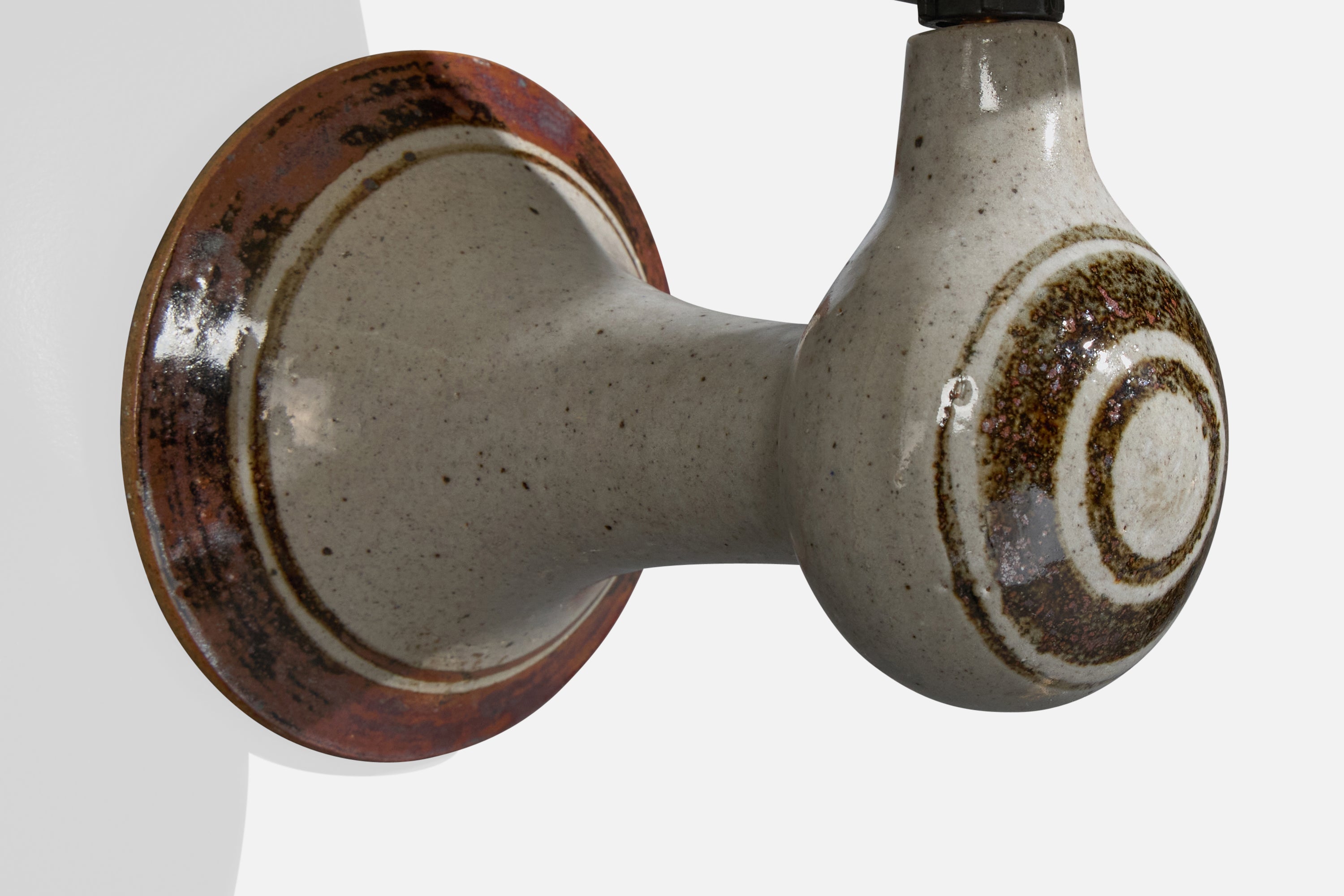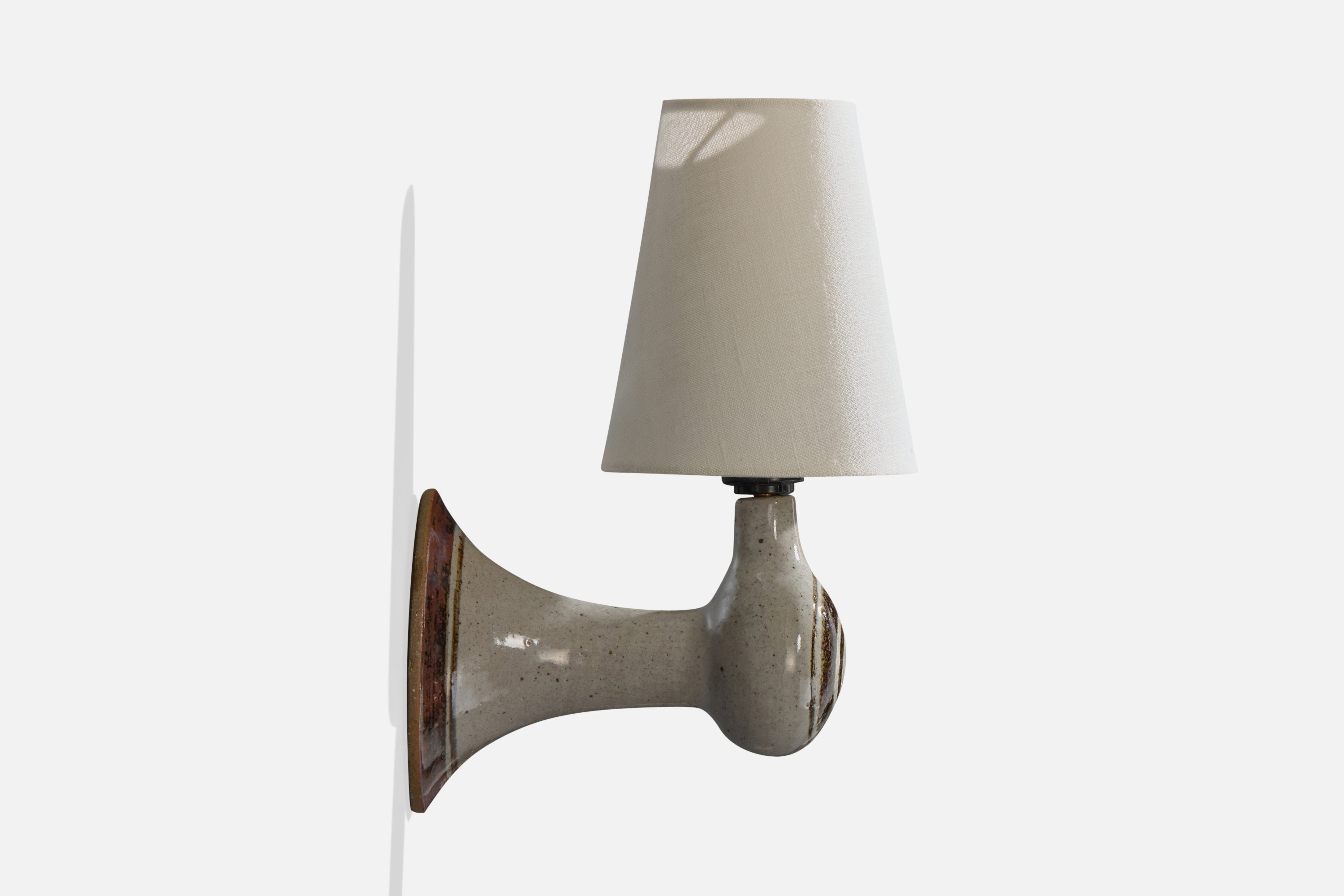 A set of two brown, grey-glazed ceramic and white fabric wall lights designed and produced in Denmark, c. 1960s.