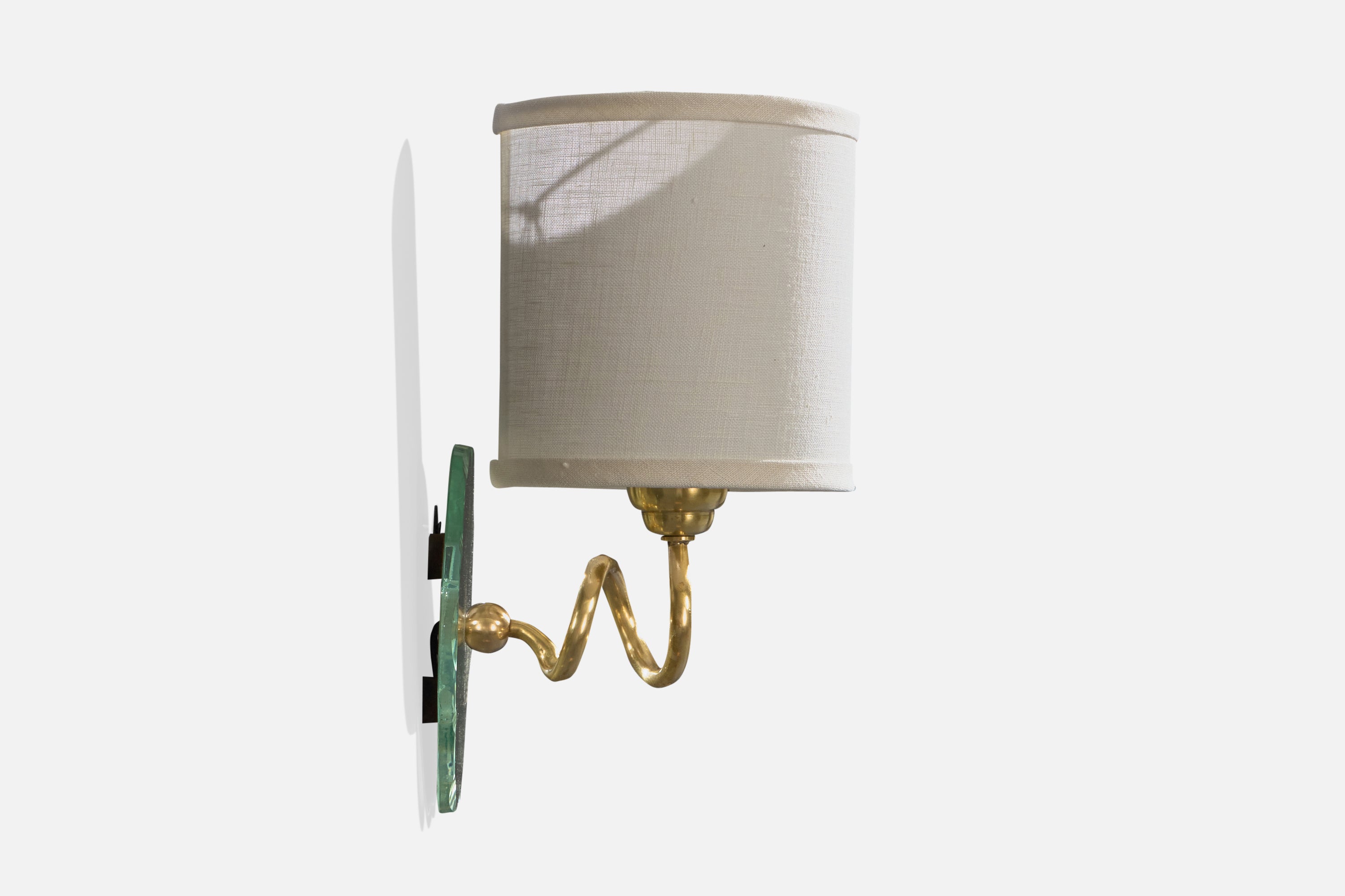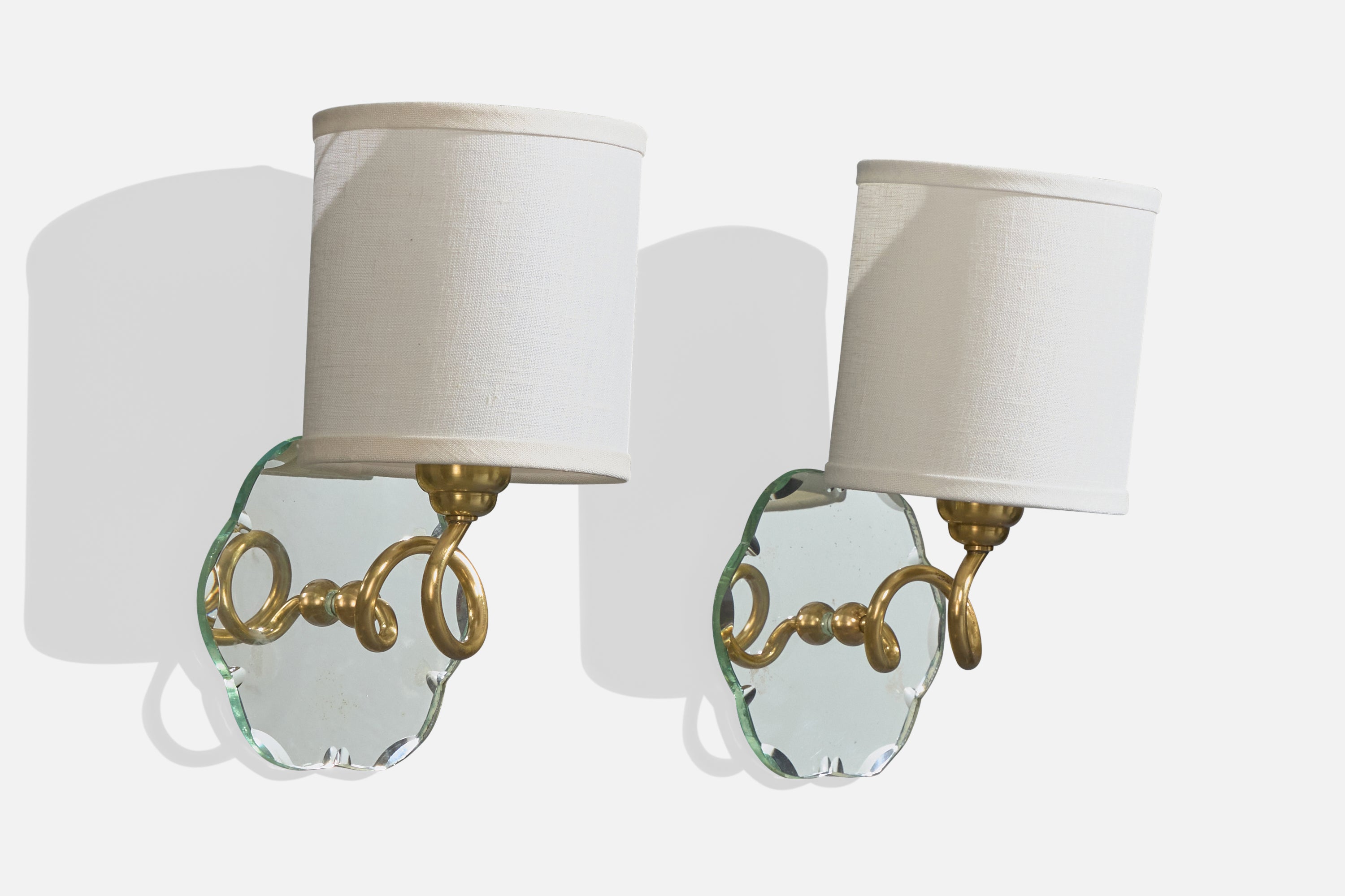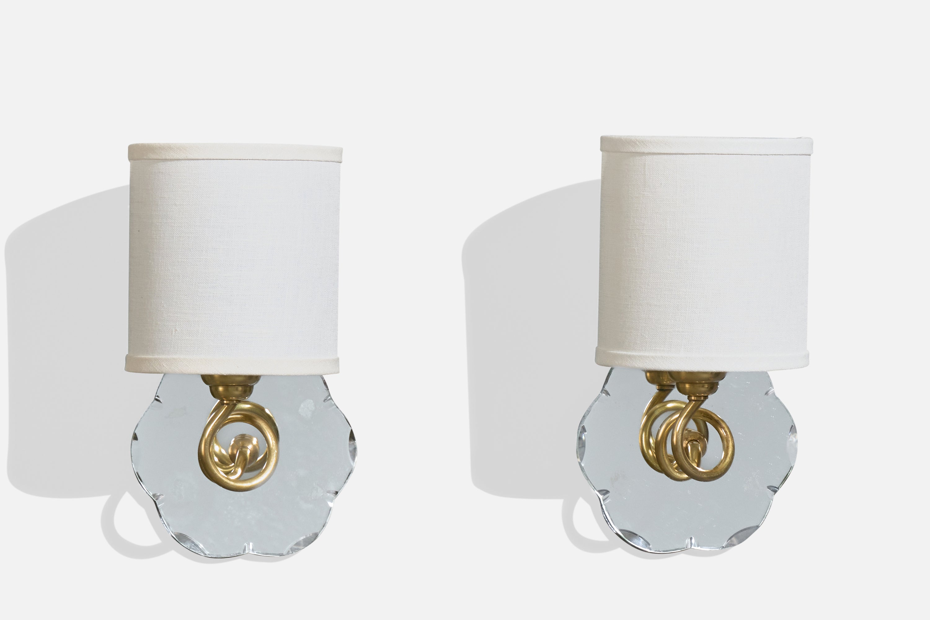 A pair of brass, mirror glass and white fabric wall lights designed and produced in France, c. 1950s.