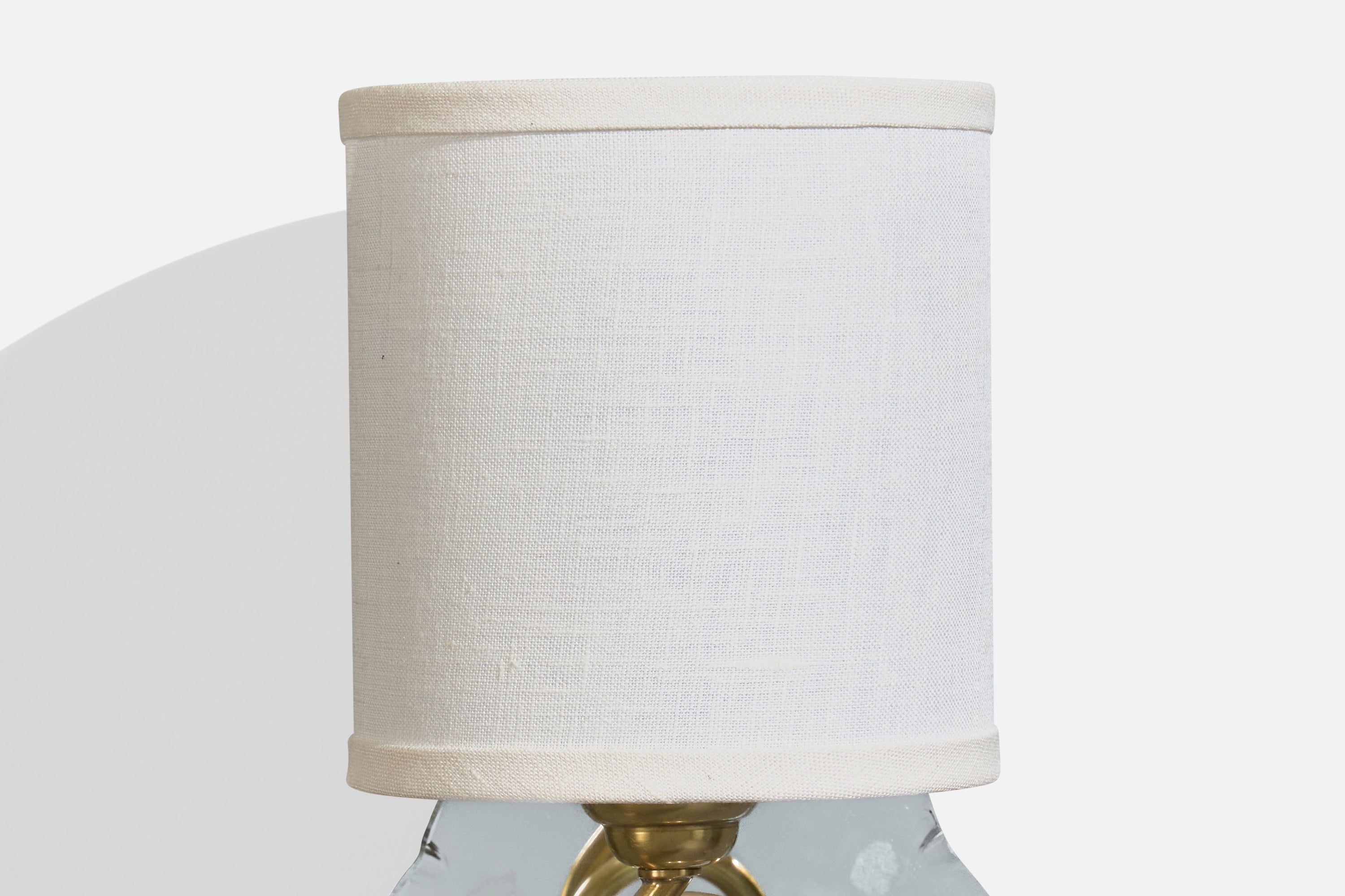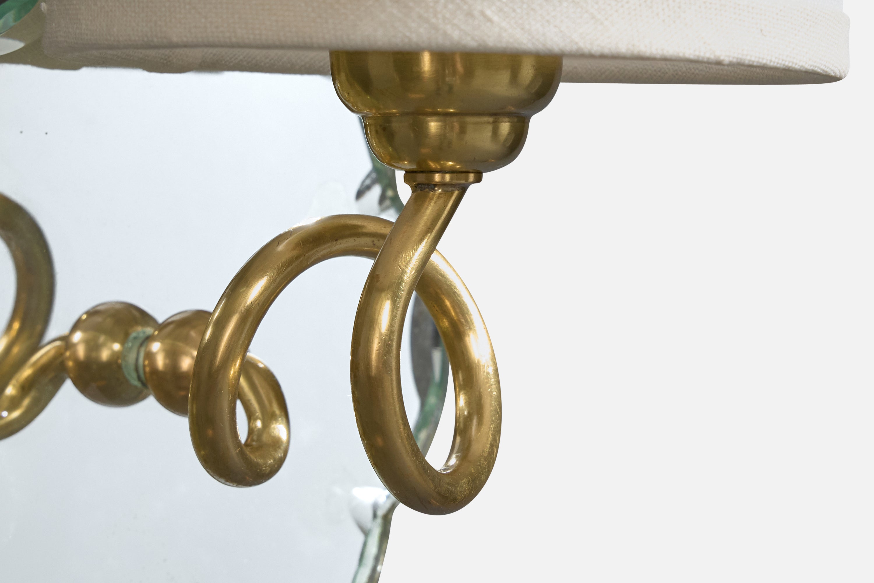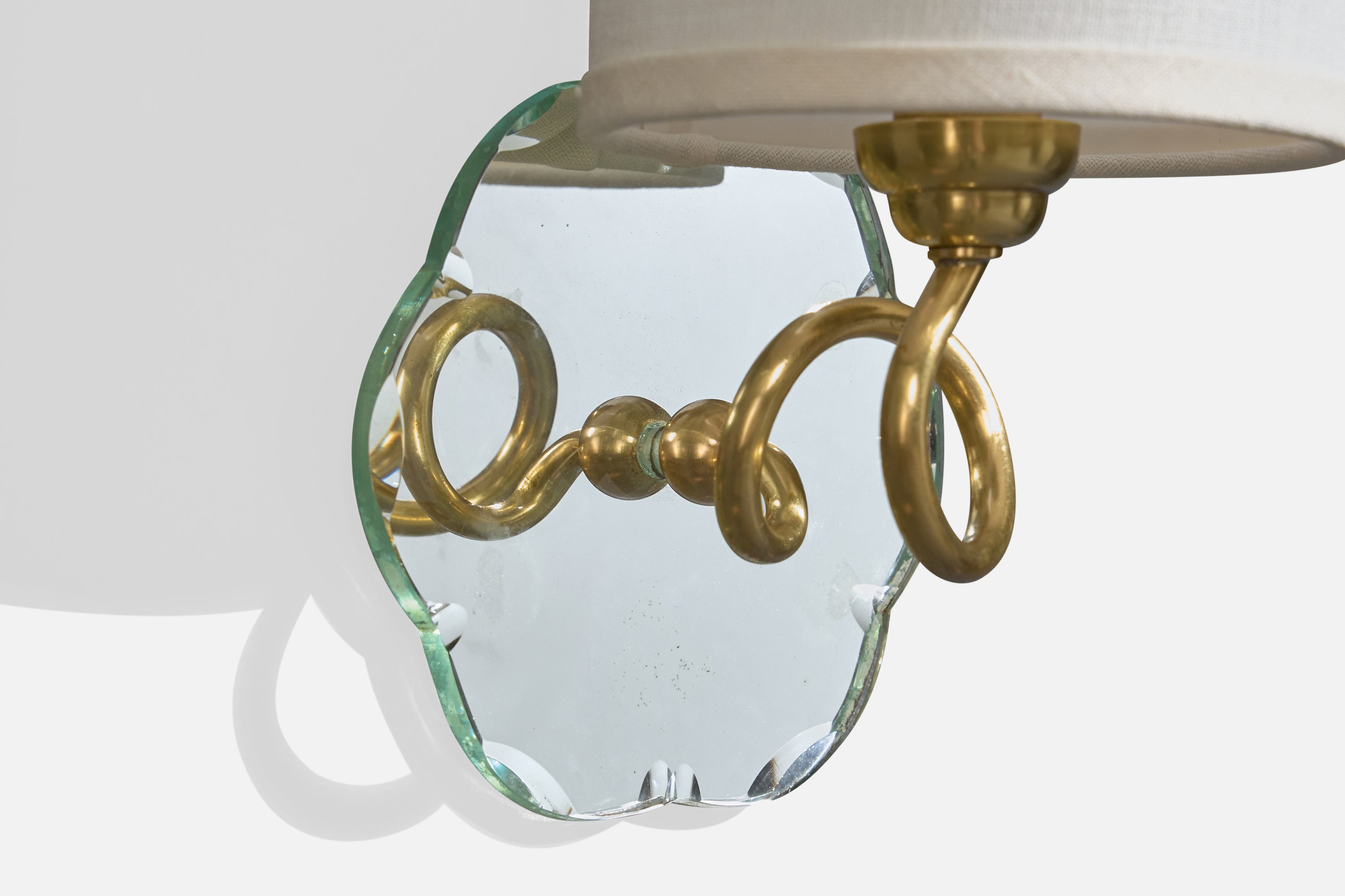 A pair of brass, mirror glass and white fabric wall lights designed and produced in France, c. 1950s.