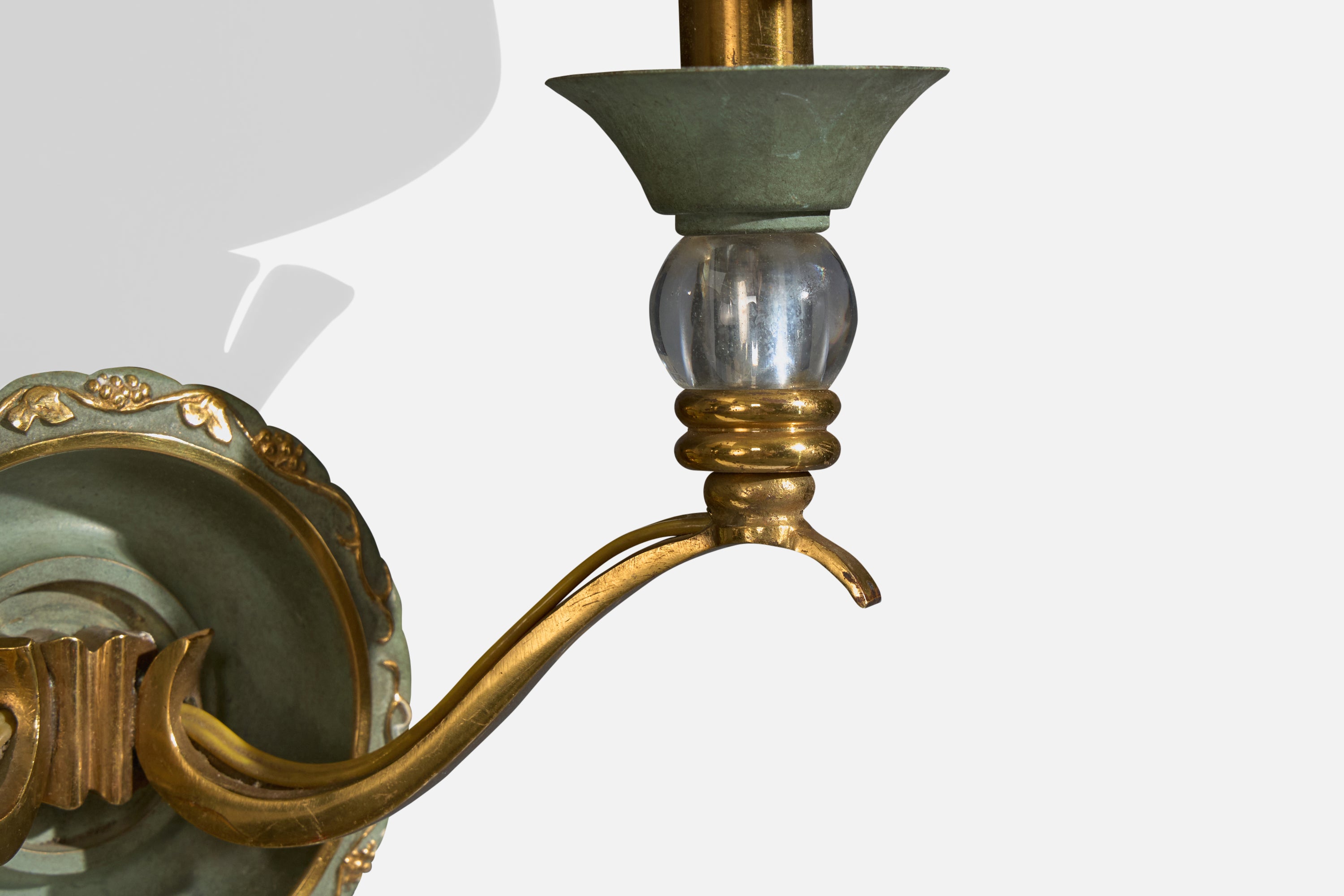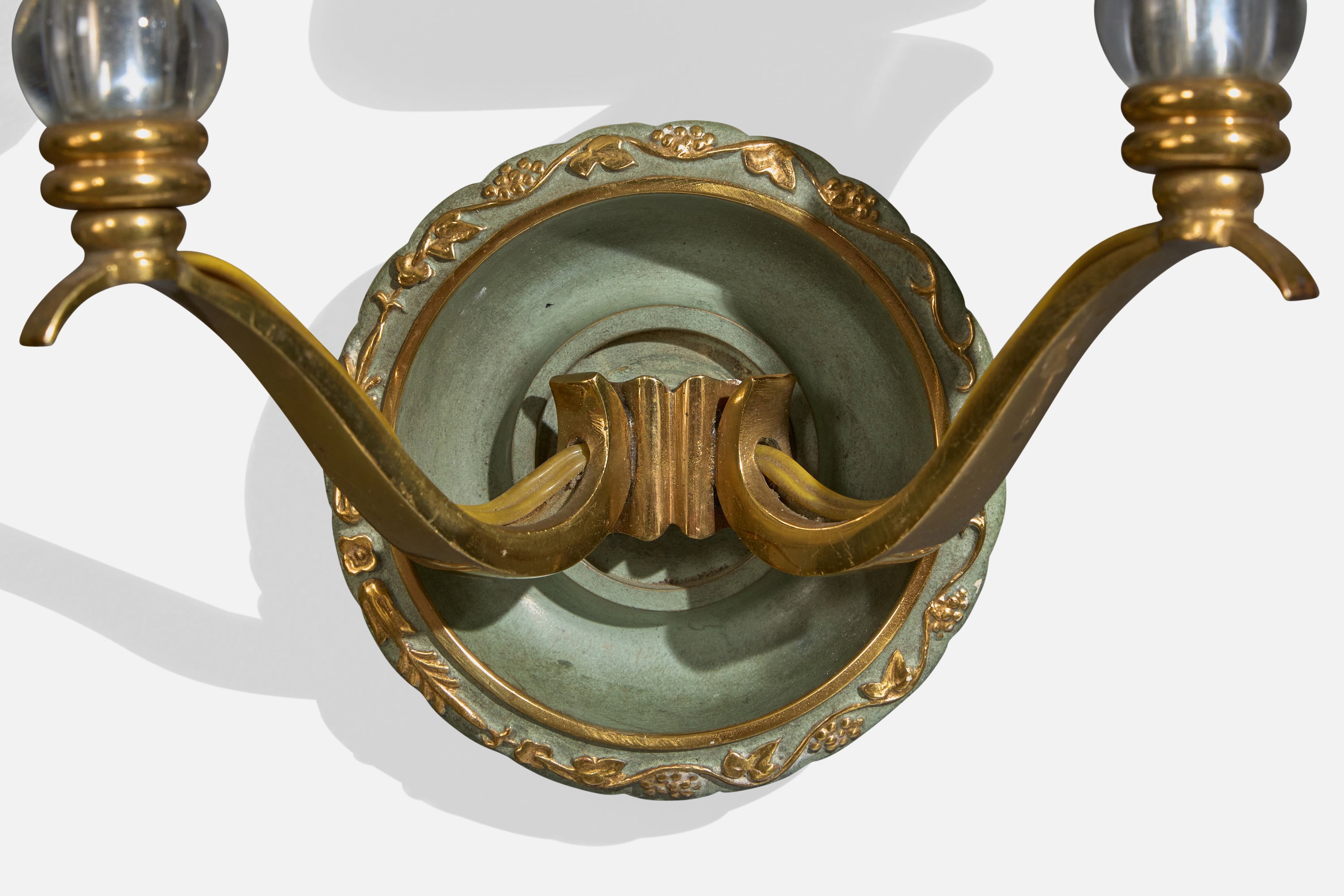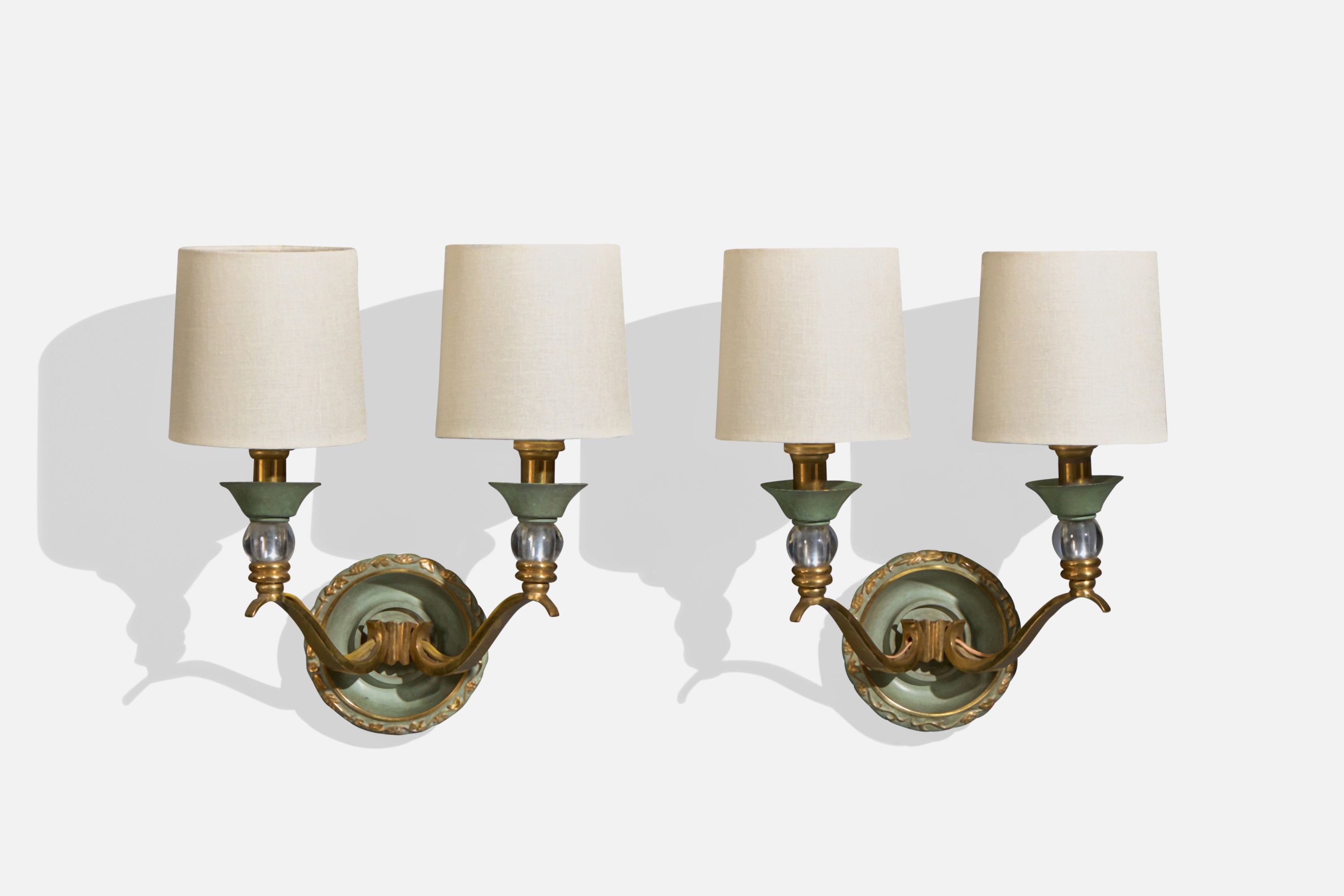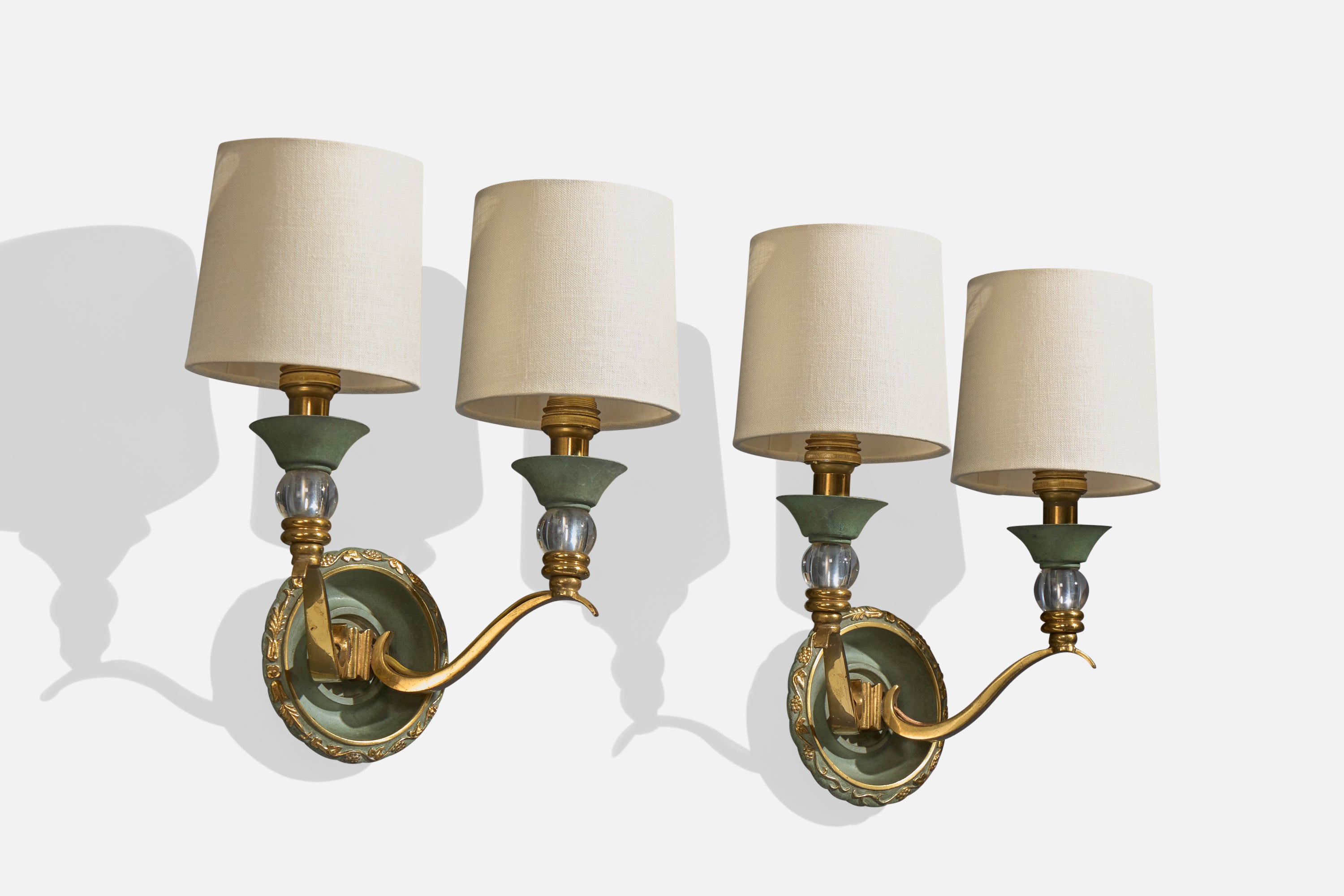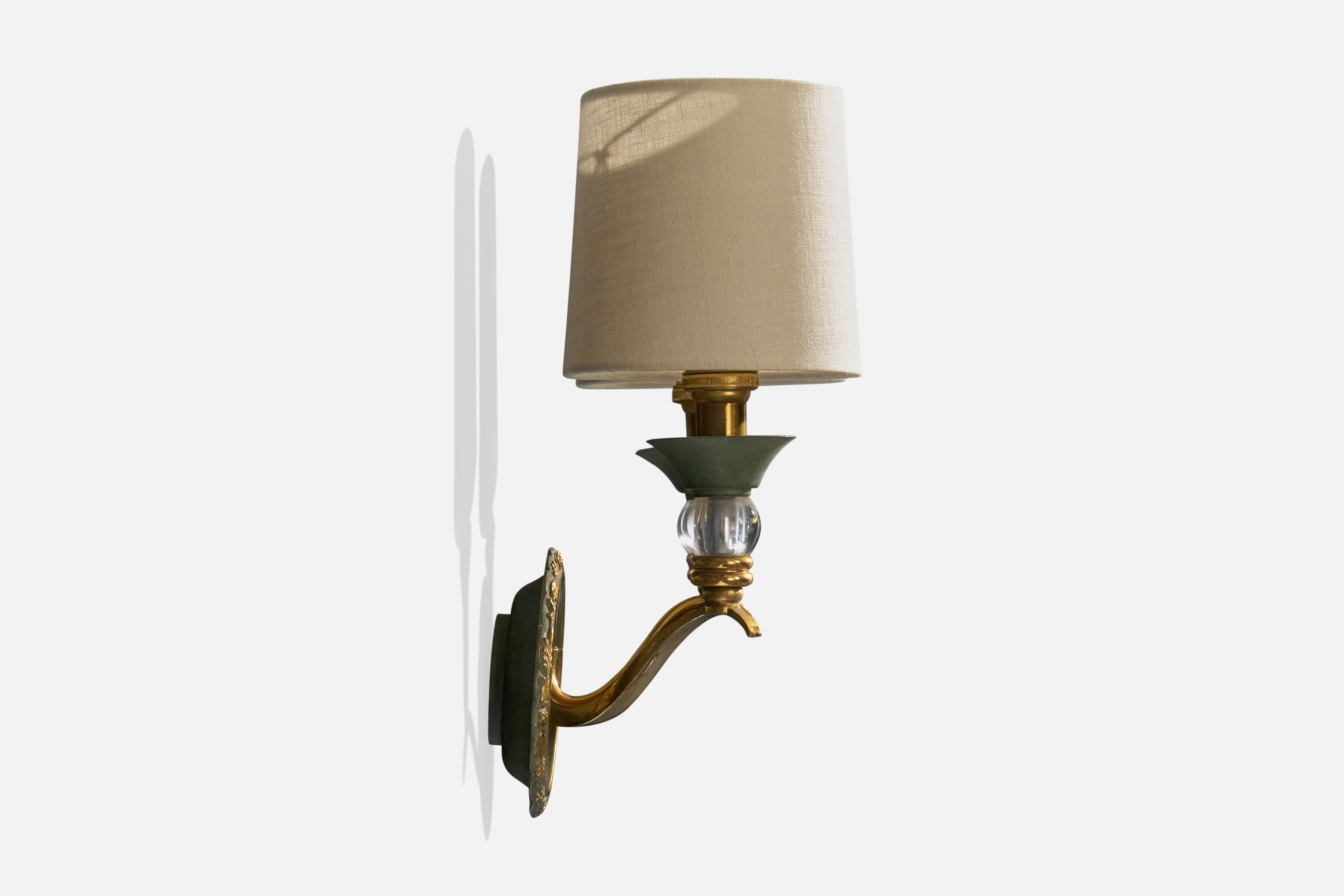 A pair of green-lacquered metal, brass, glass and white fabric wall lights designed and produced in France, c. 1950s.