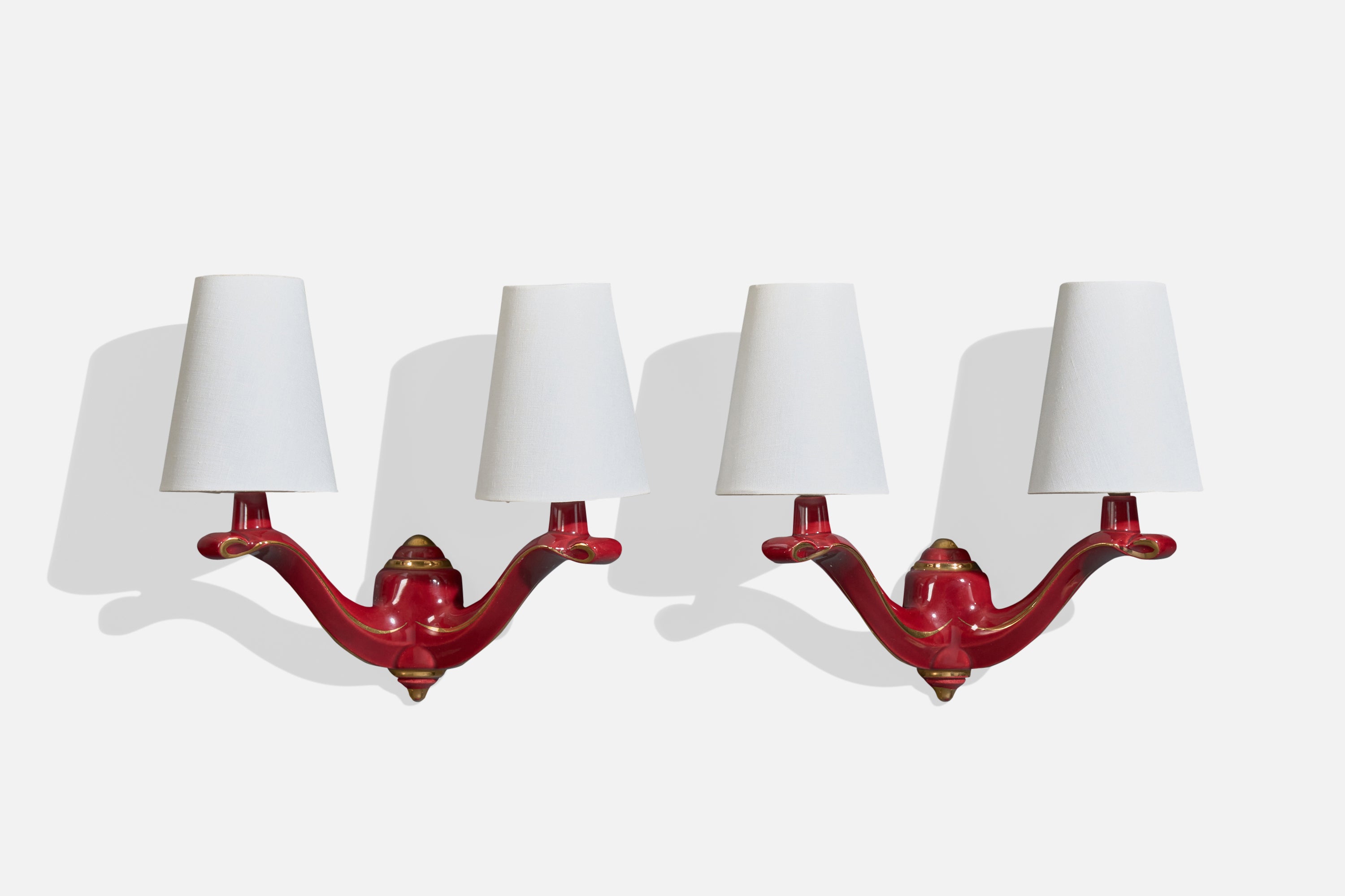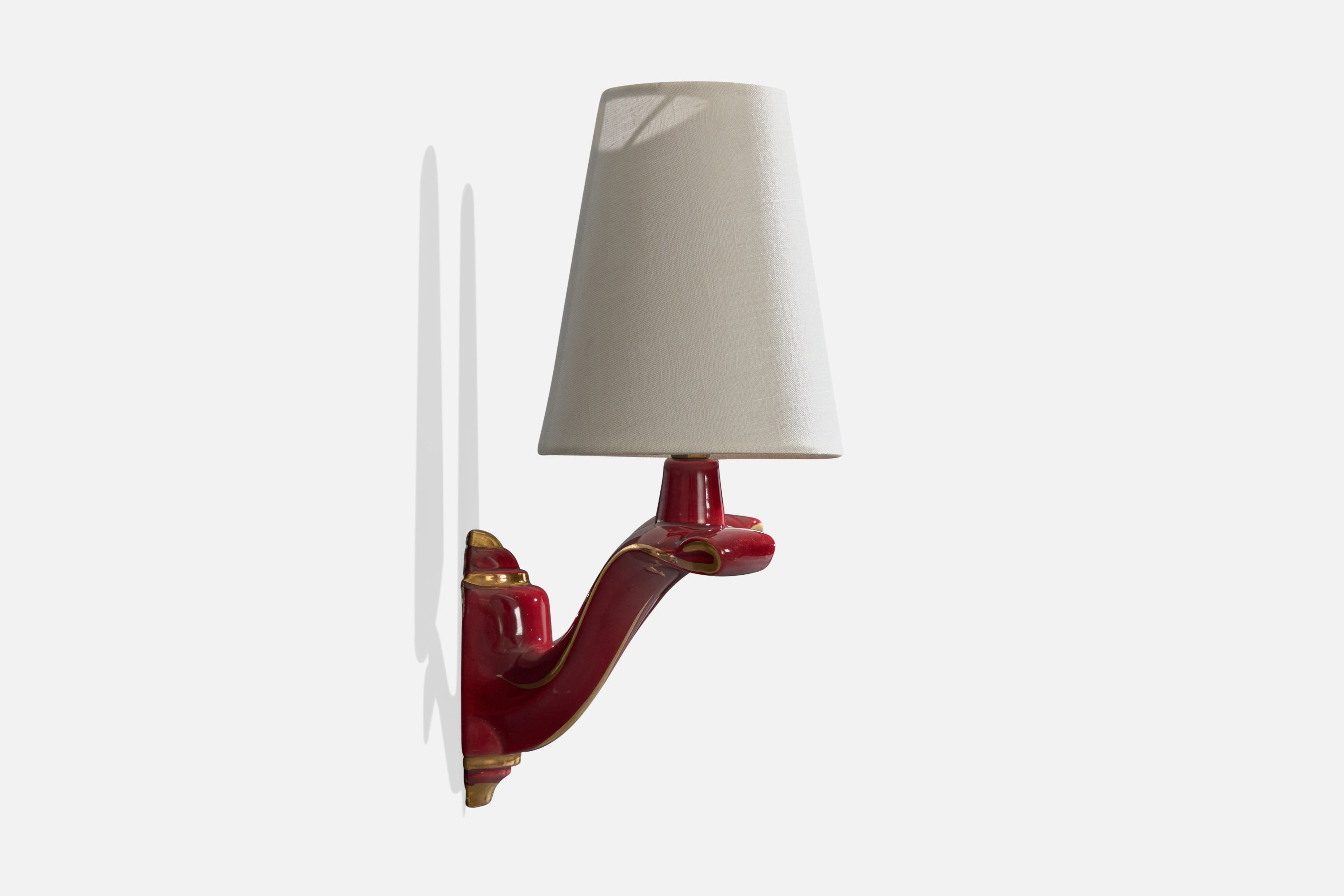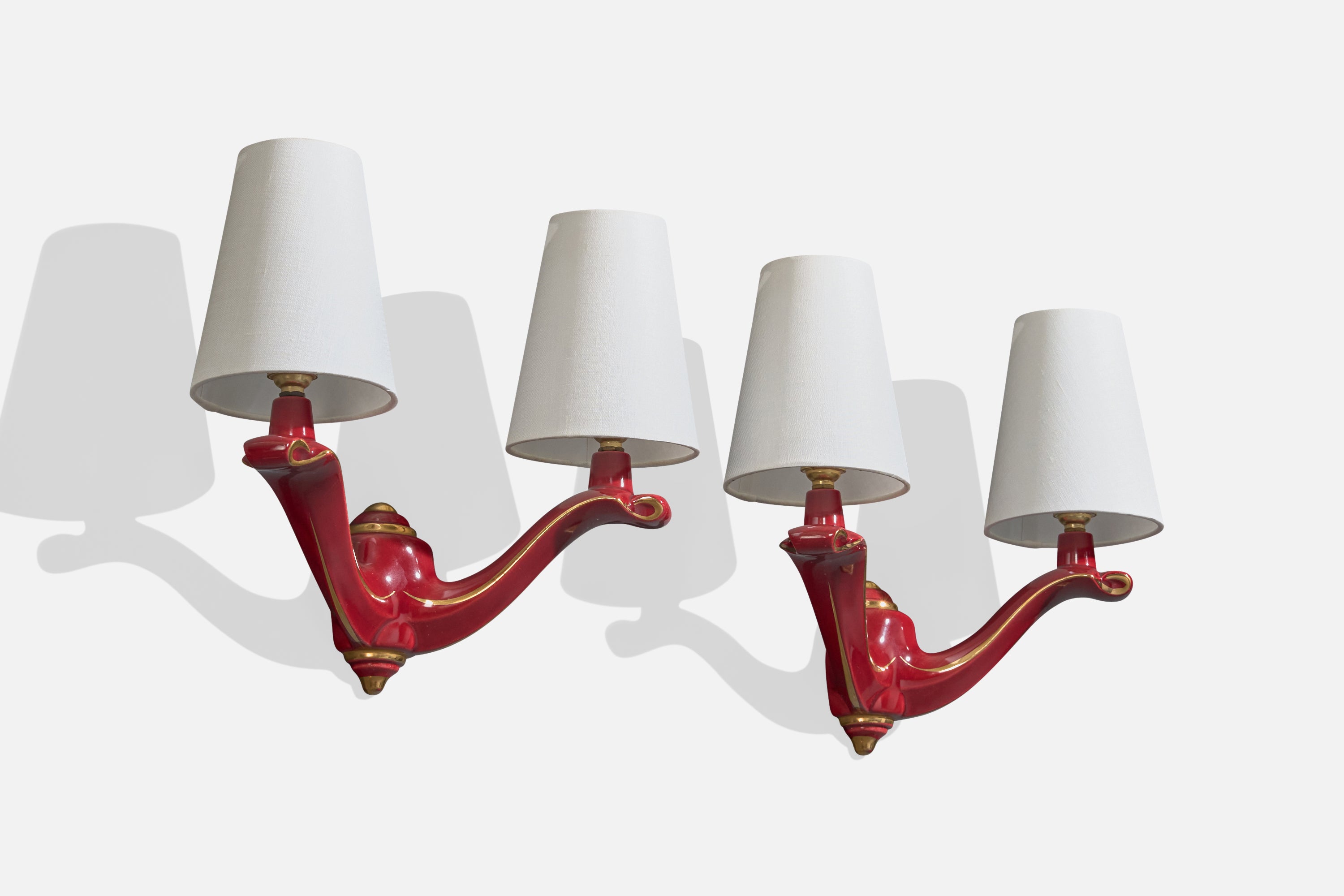 A pair of red, gold-glazed ceramic and white fabric wall lights designed and produced in France, c. 1960s.