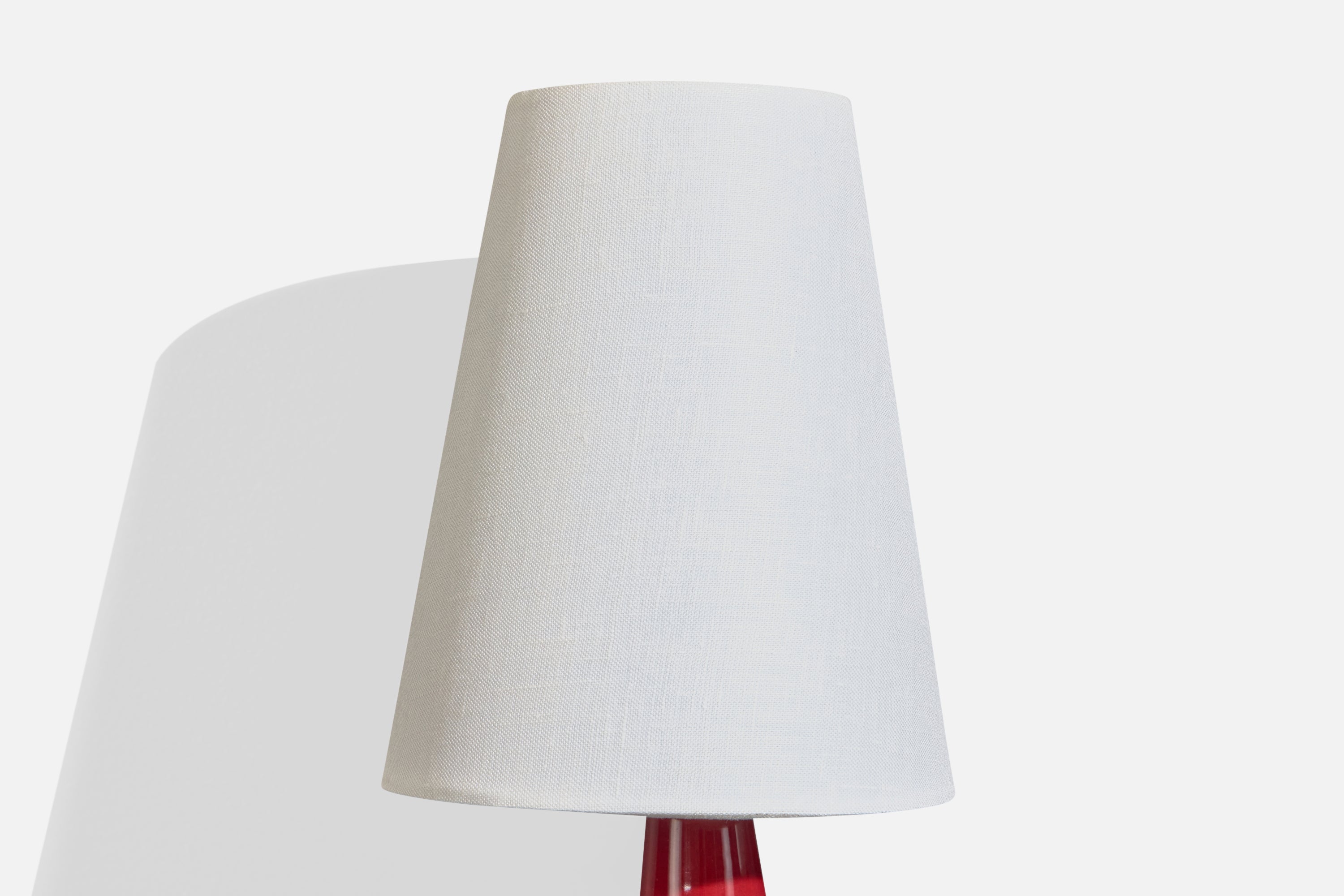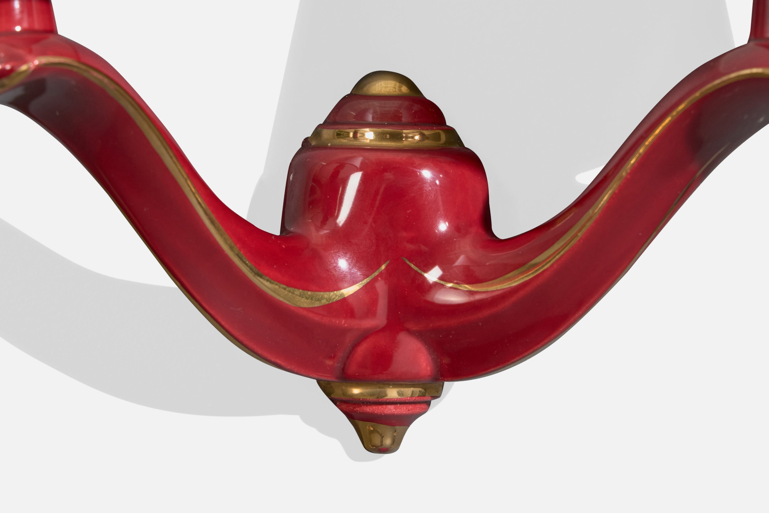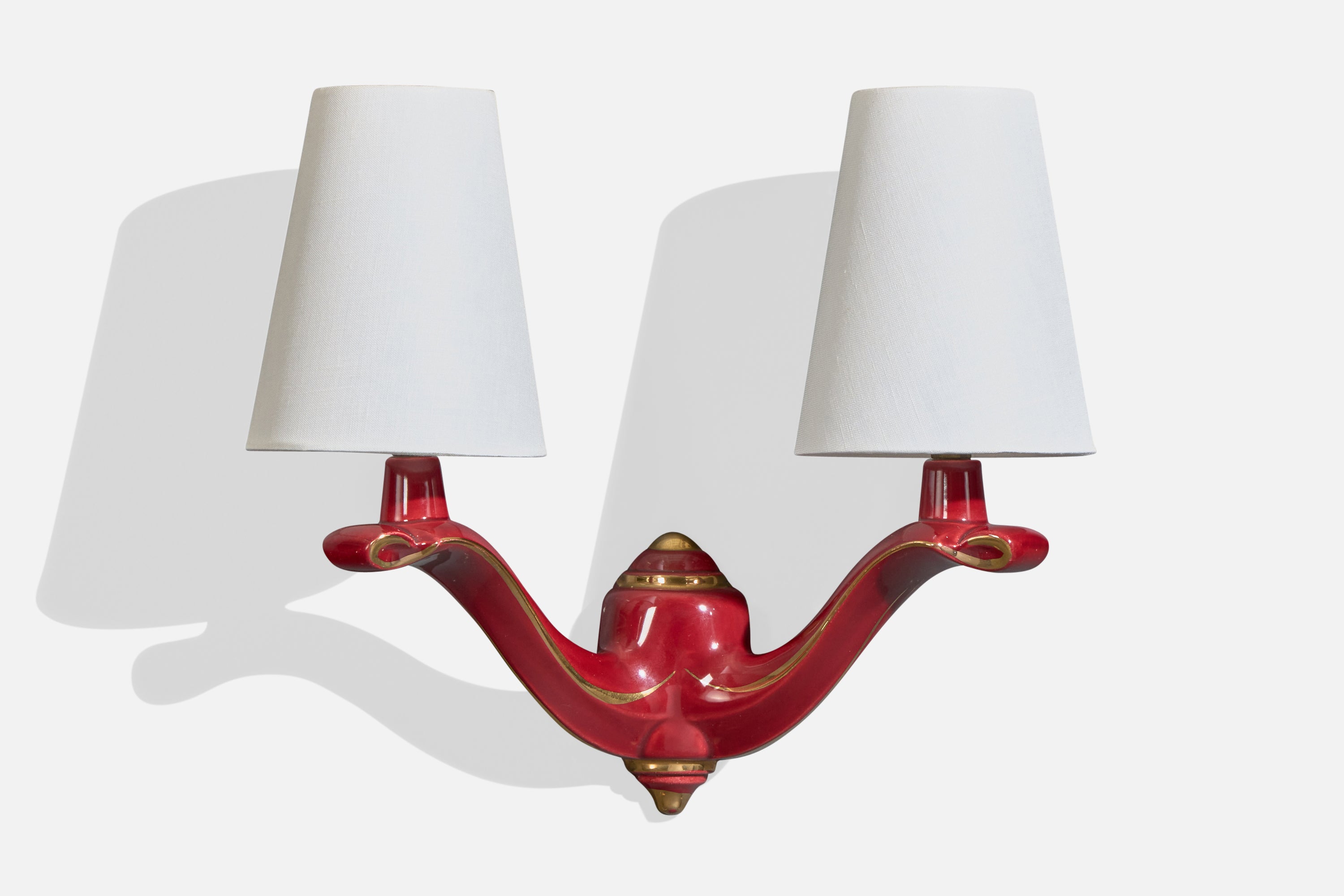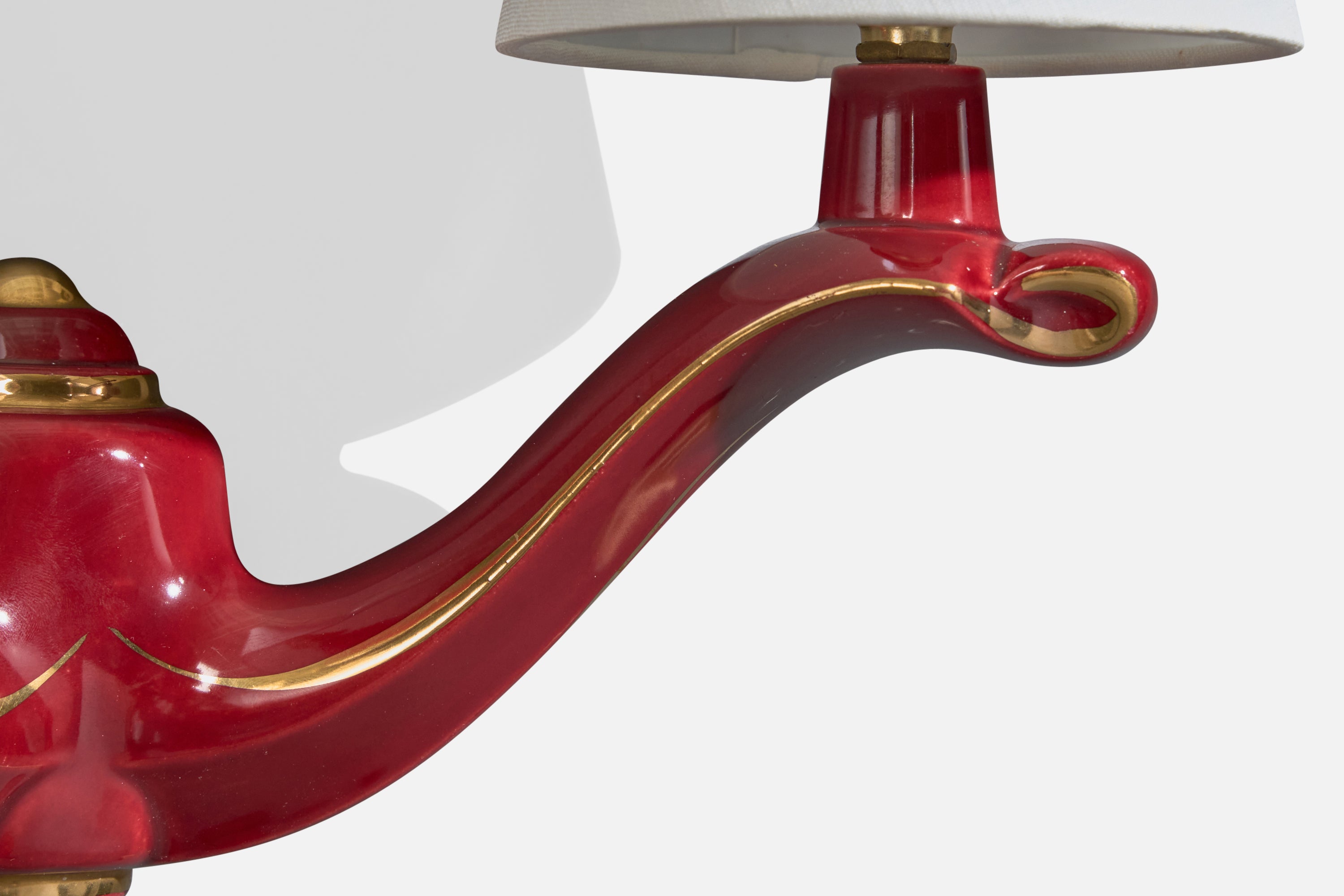 A pair of red, gold-glazed ceramic and white fabric wall lights designed and produced in France, c. 1960s.