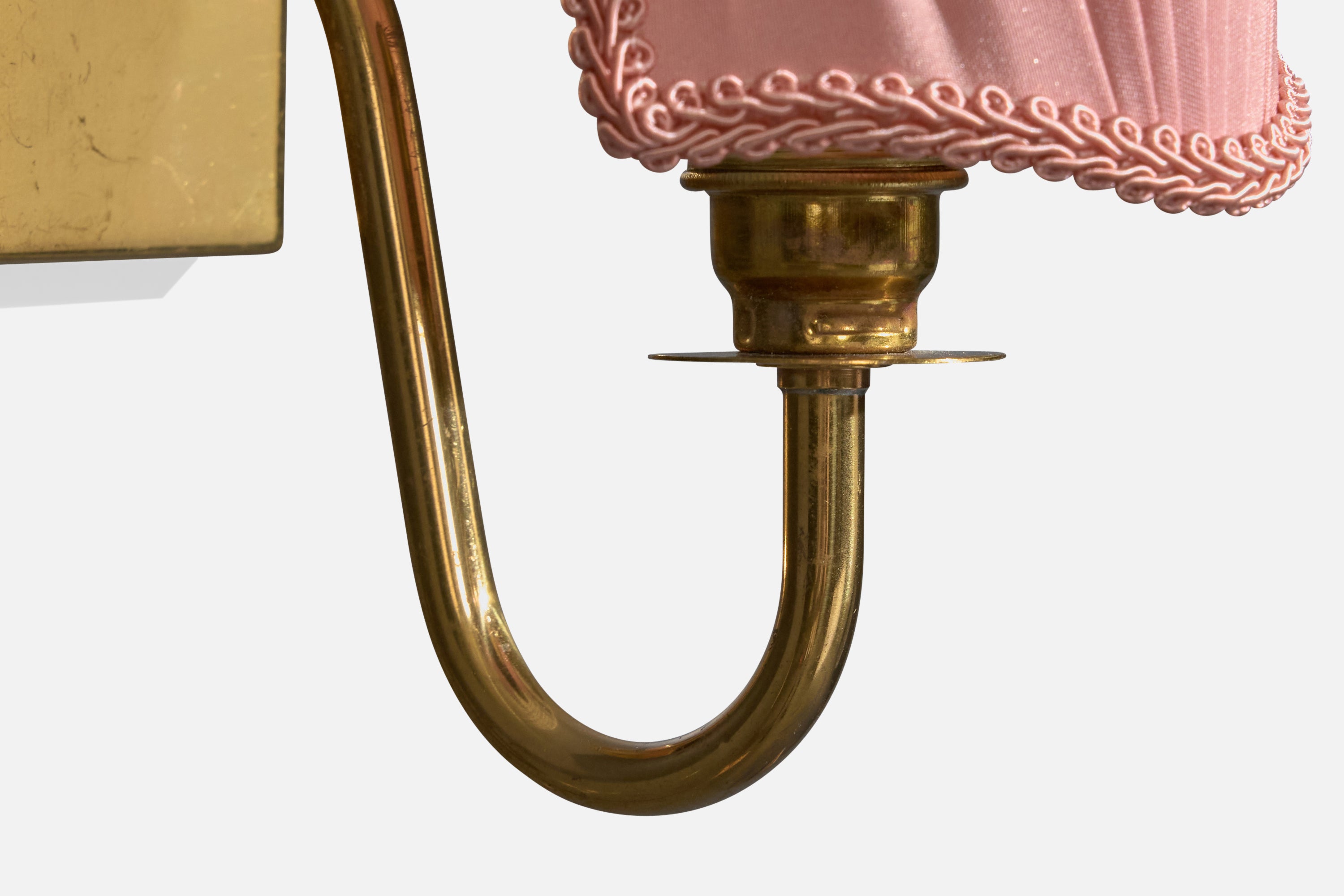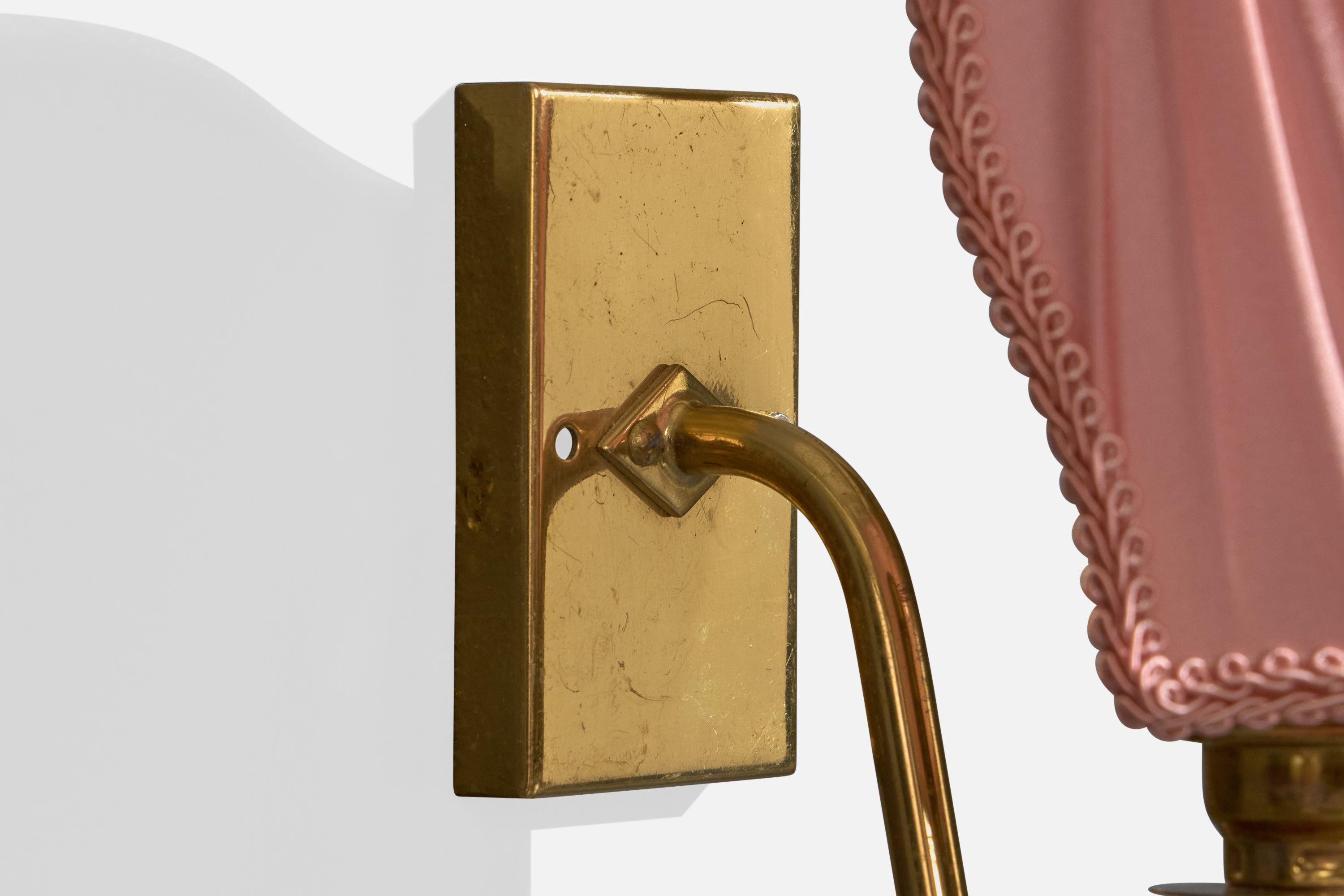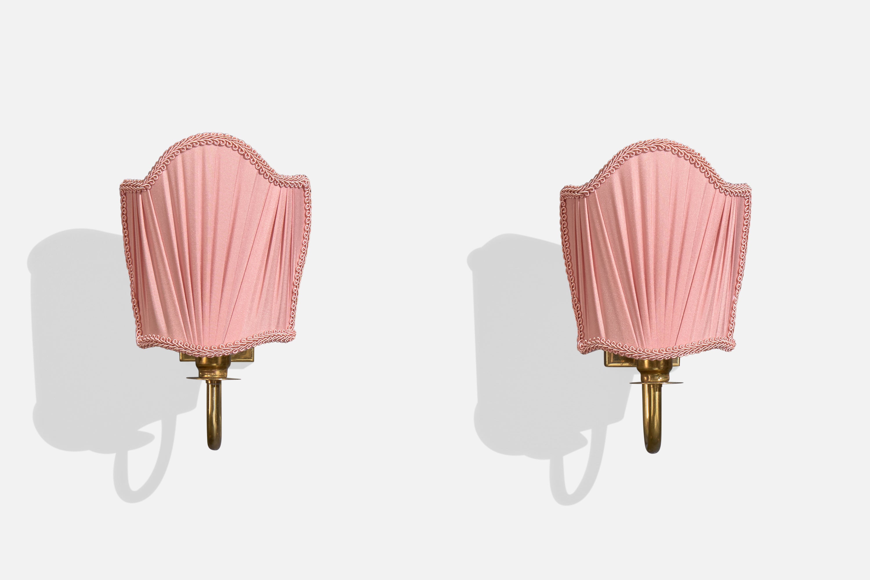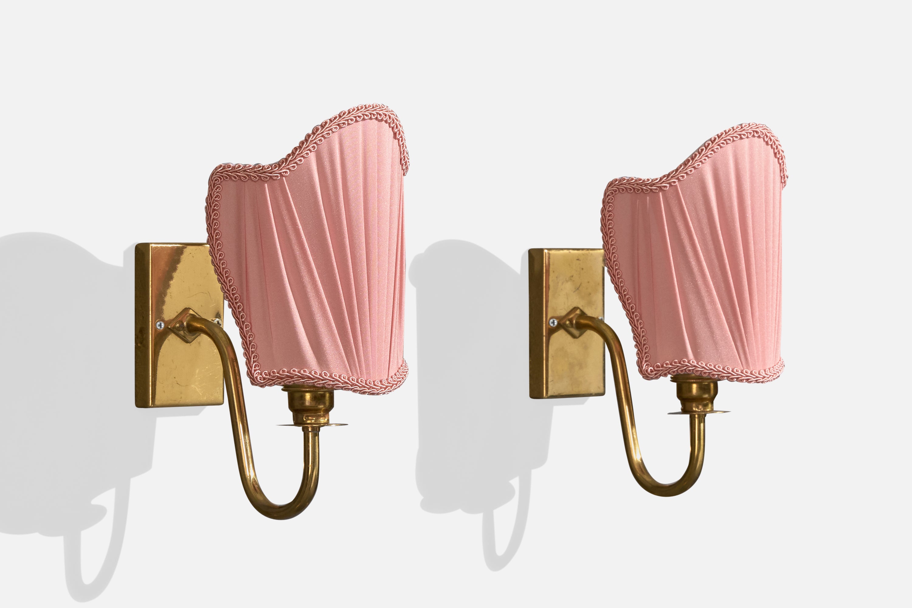 A pair of brass and pink fabric wall lights produced by ASEA, Sweden, c. 1950s.