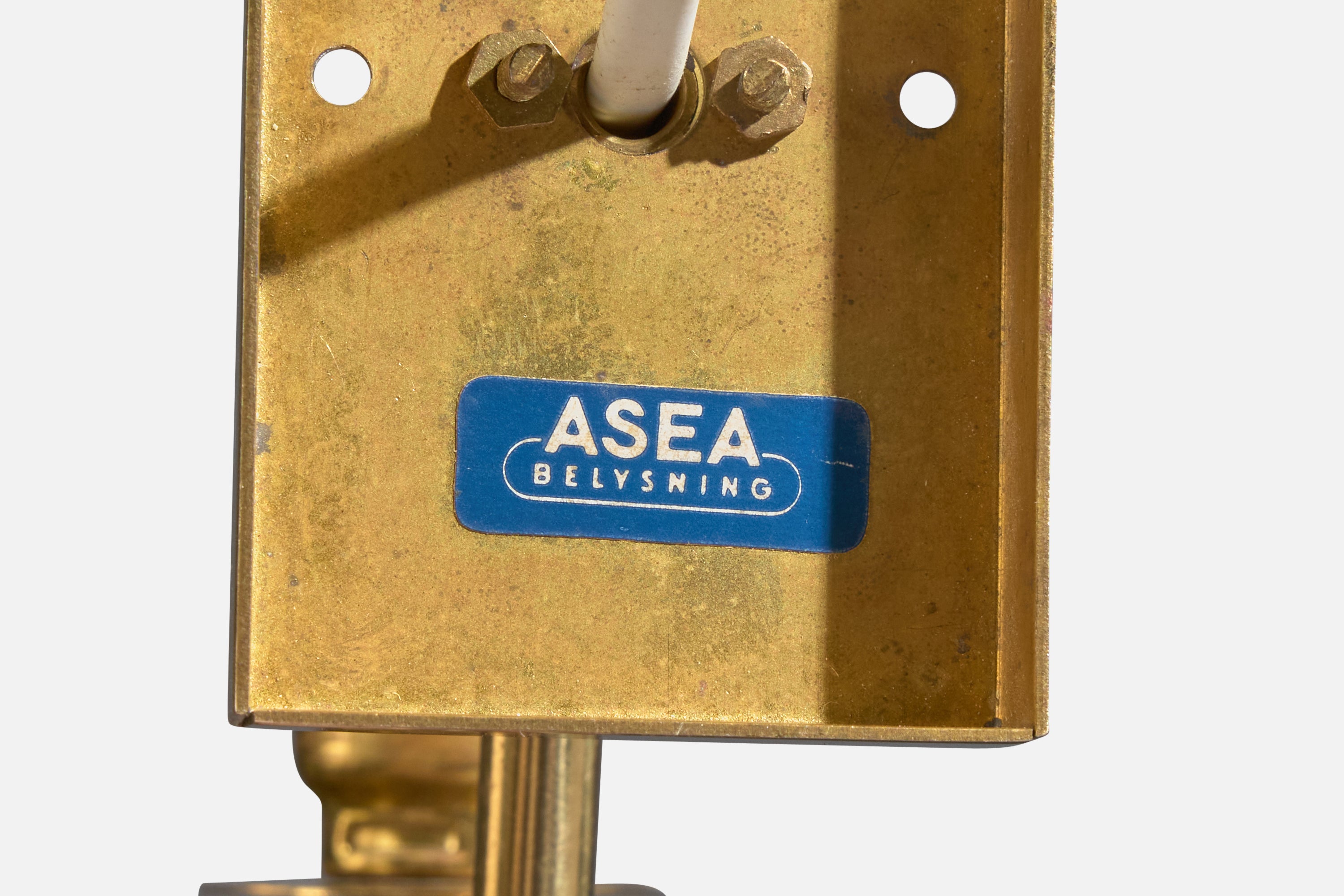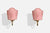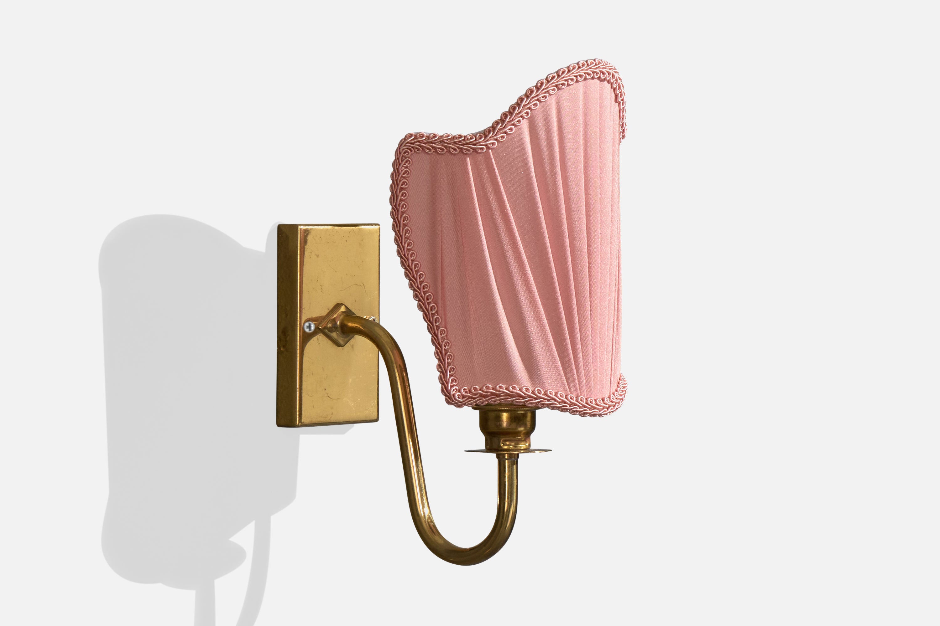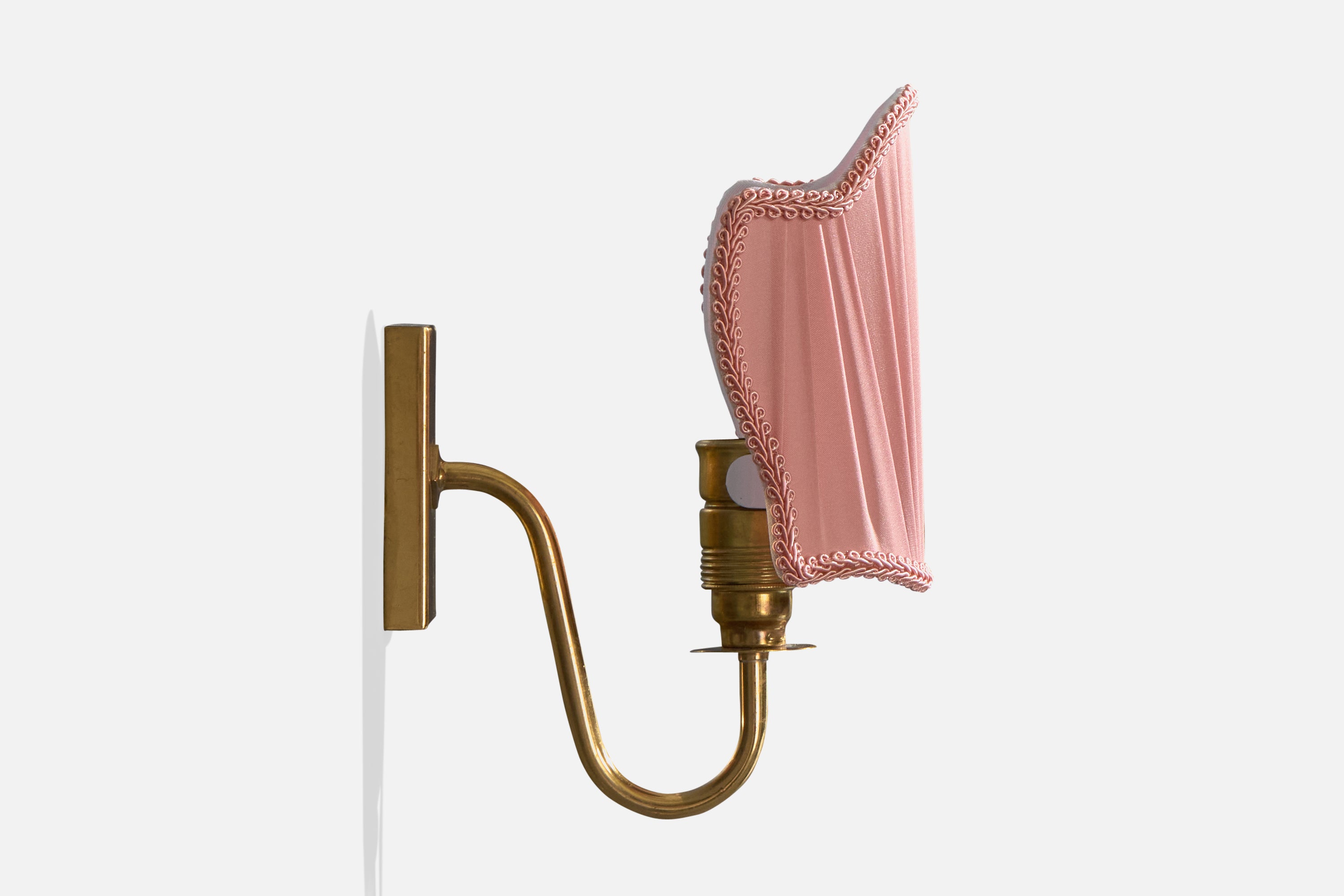 A pair of brass and pink fabric wall lights produced by ASEA, Sweden, c. 1950s.