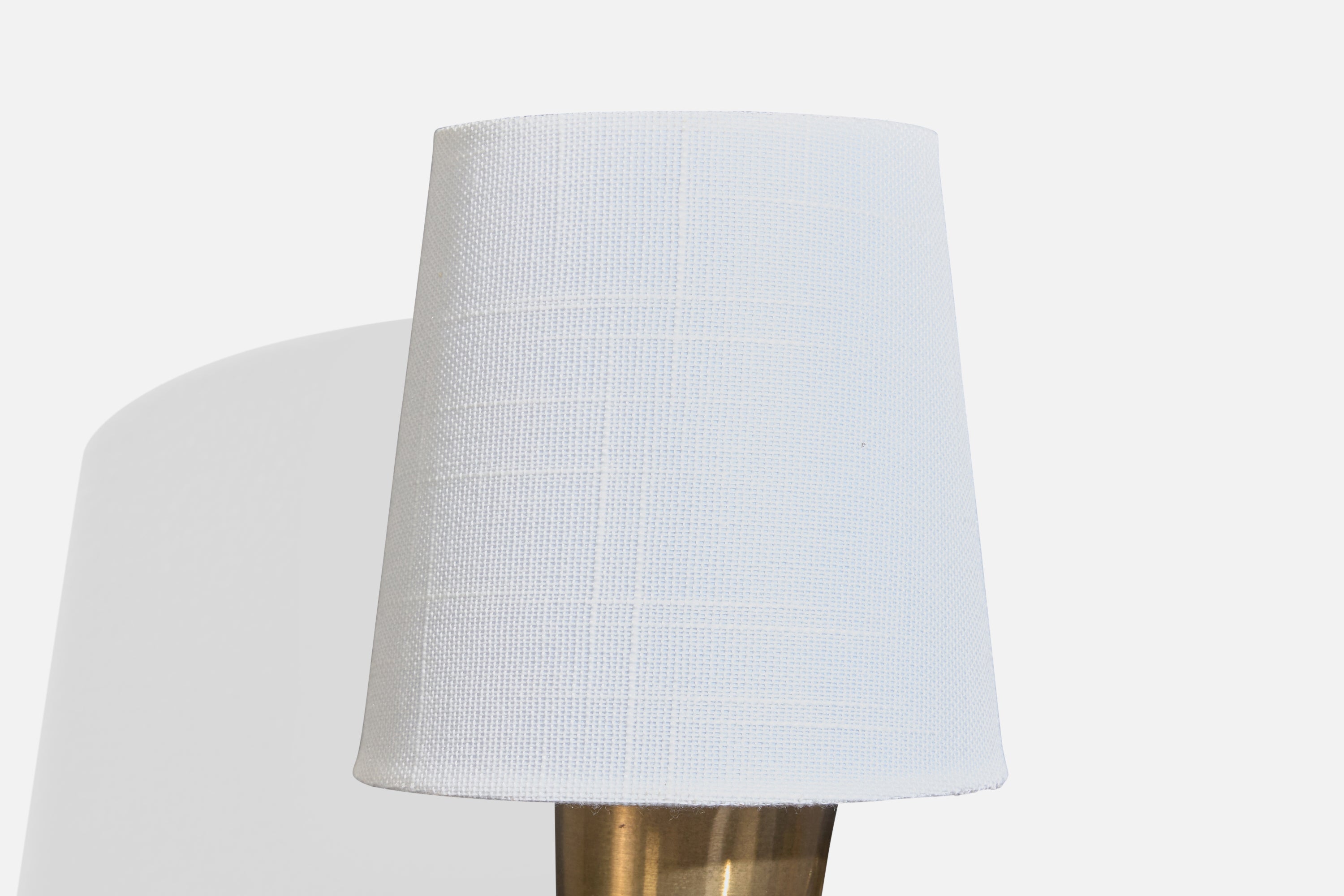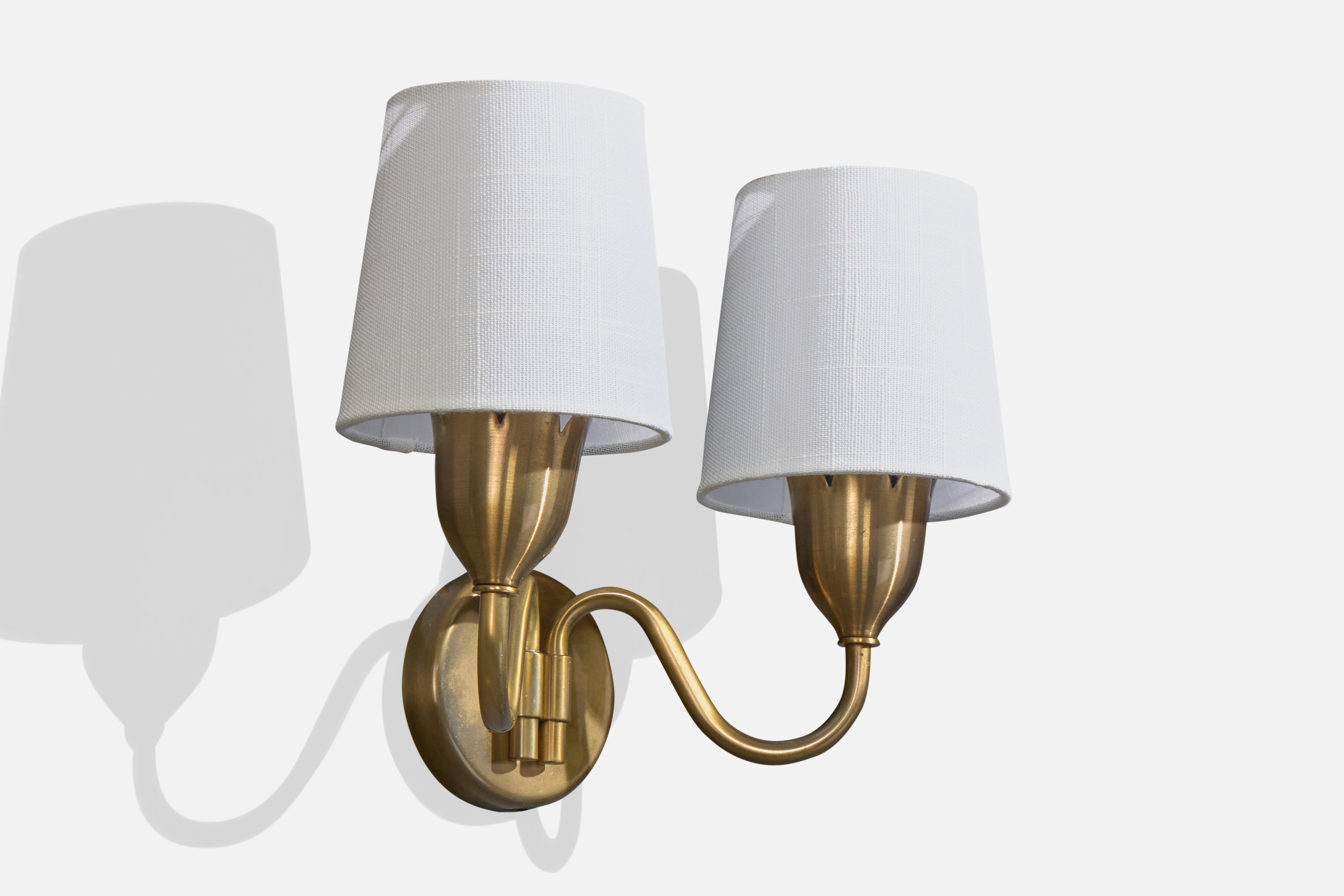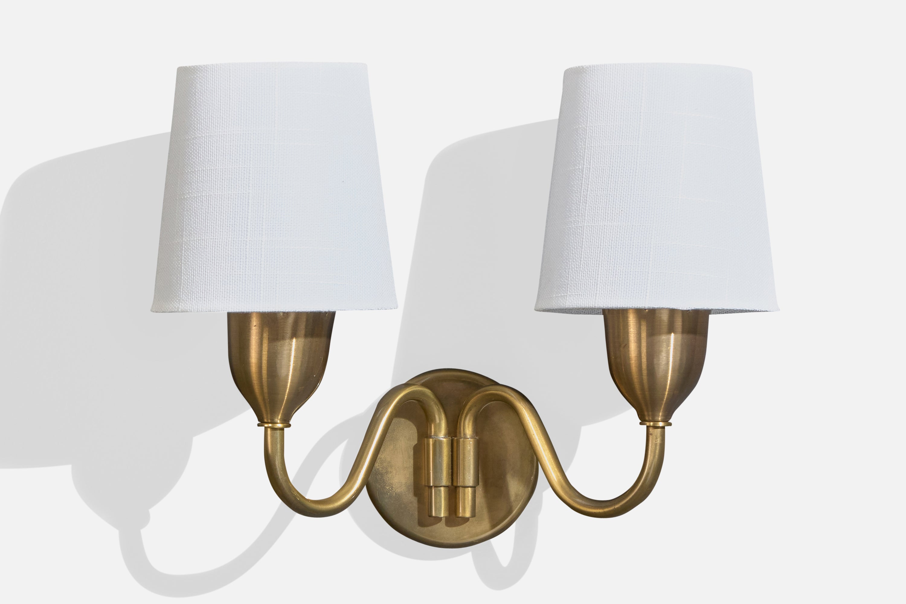 A brass and white fabric wall light designed and produced in Denmark, c. 1950s.