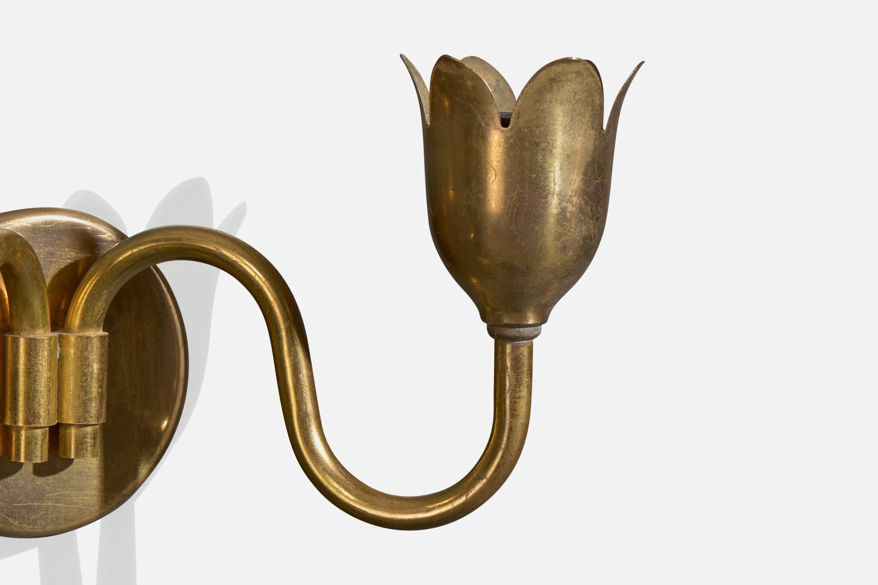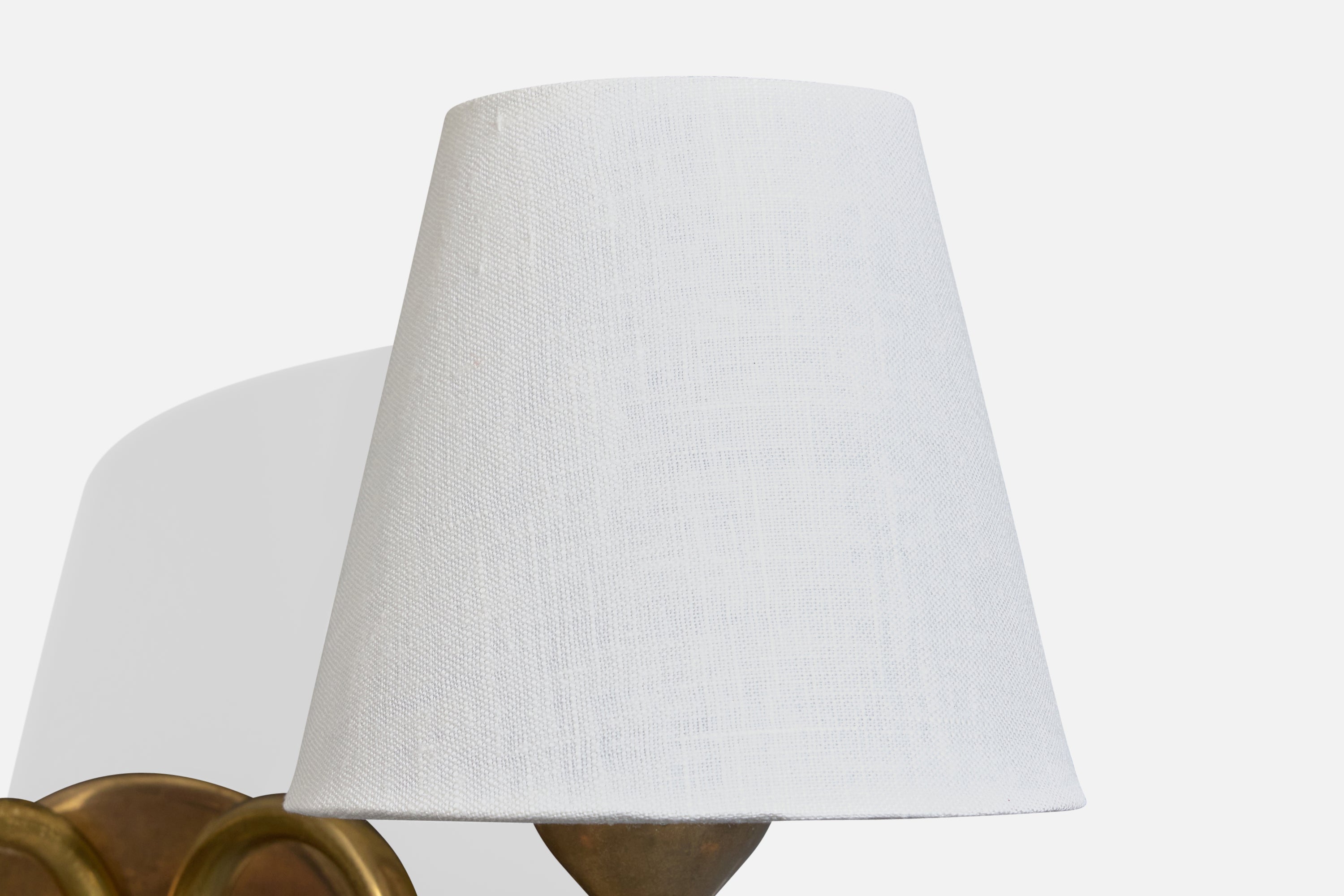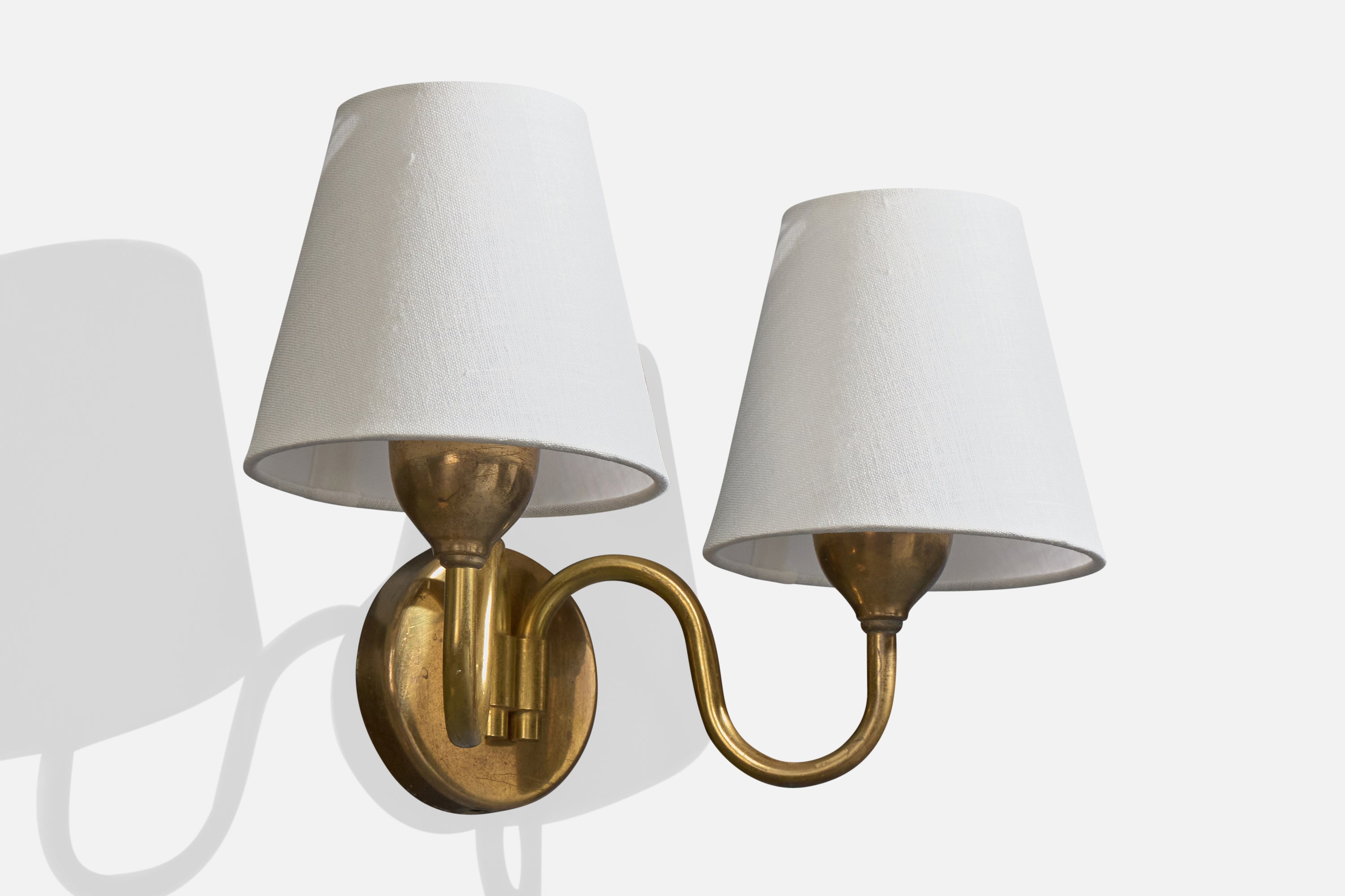 A brass and white fabric wall light designed and produced in Denmark, c. 1950s.