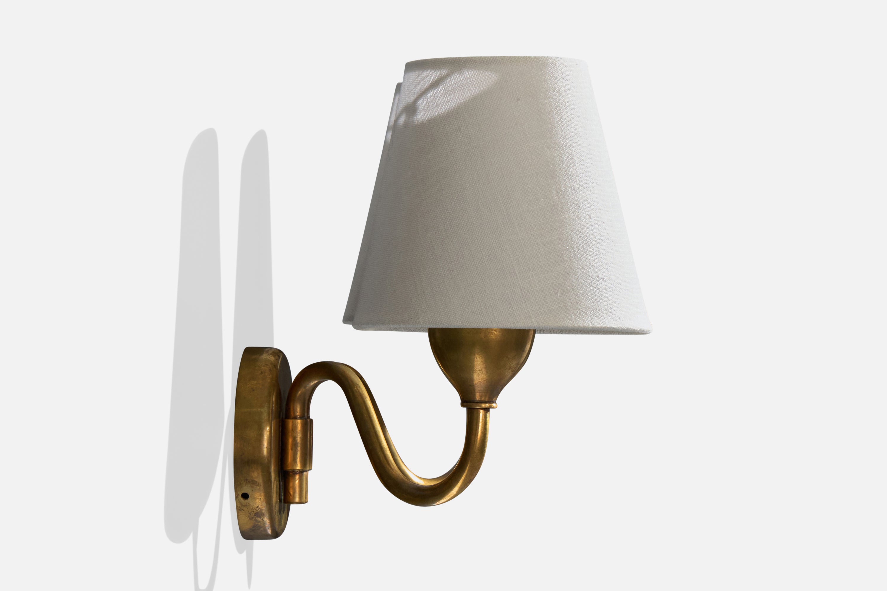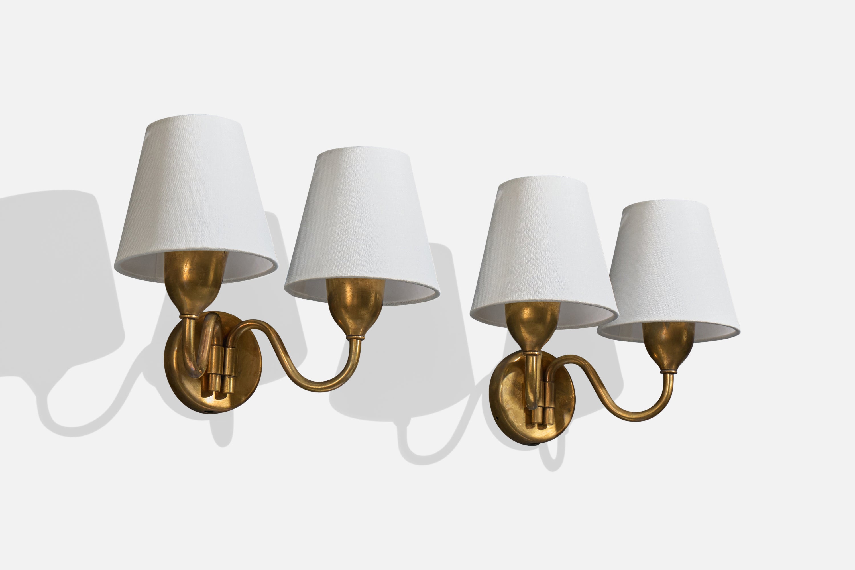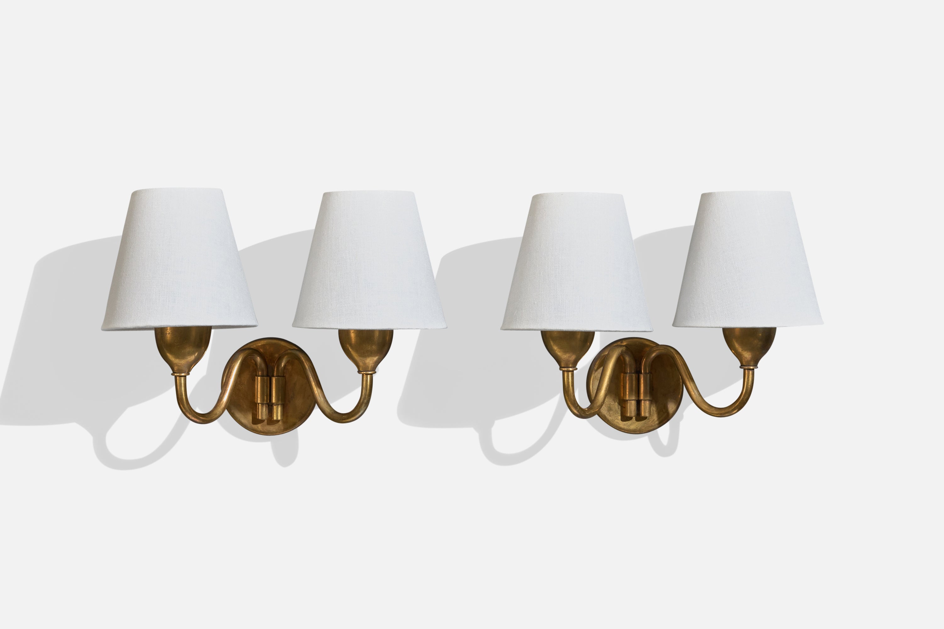A pair of brass and white fabric wall lights designed and produced in Denmark, c. 1950s.