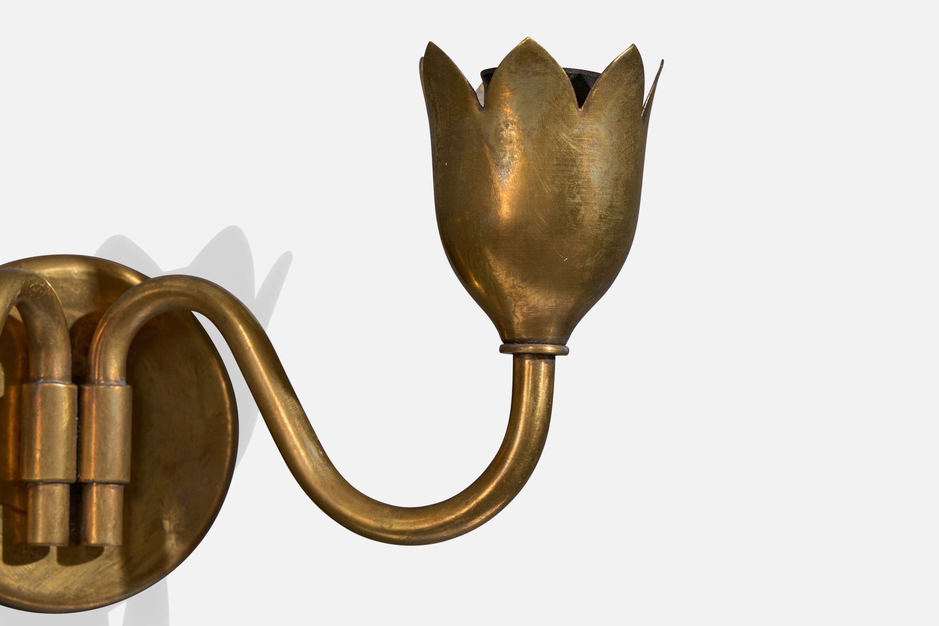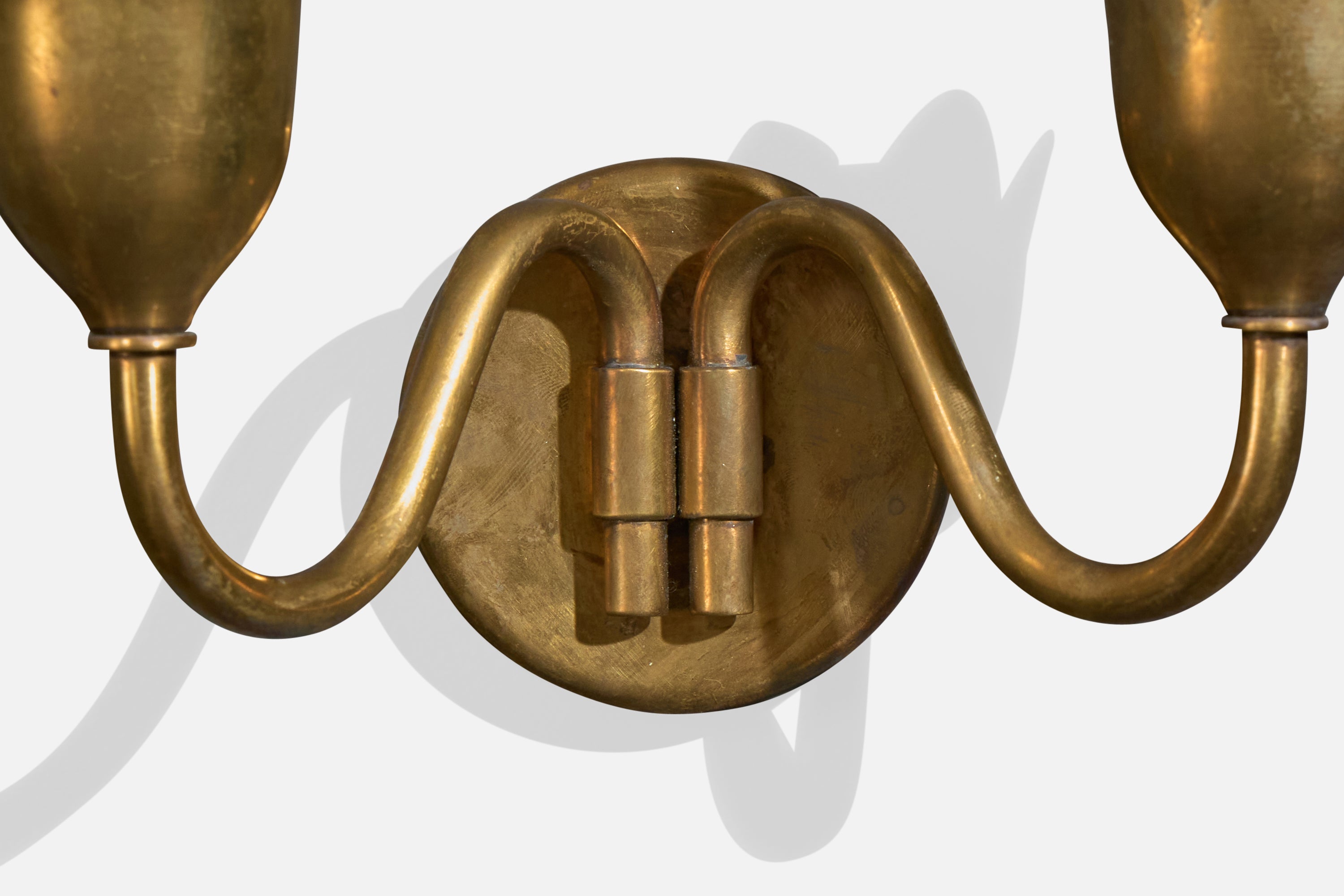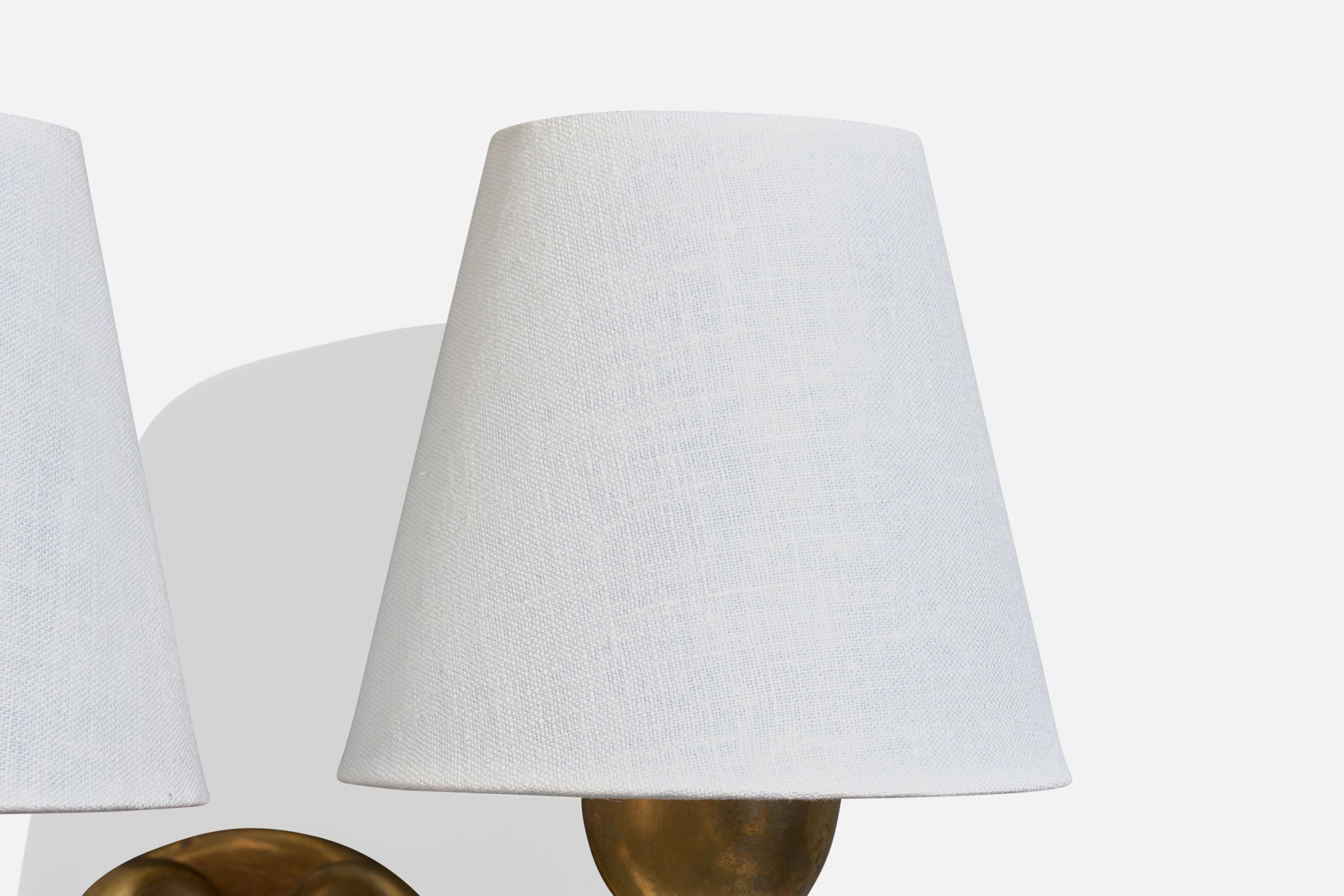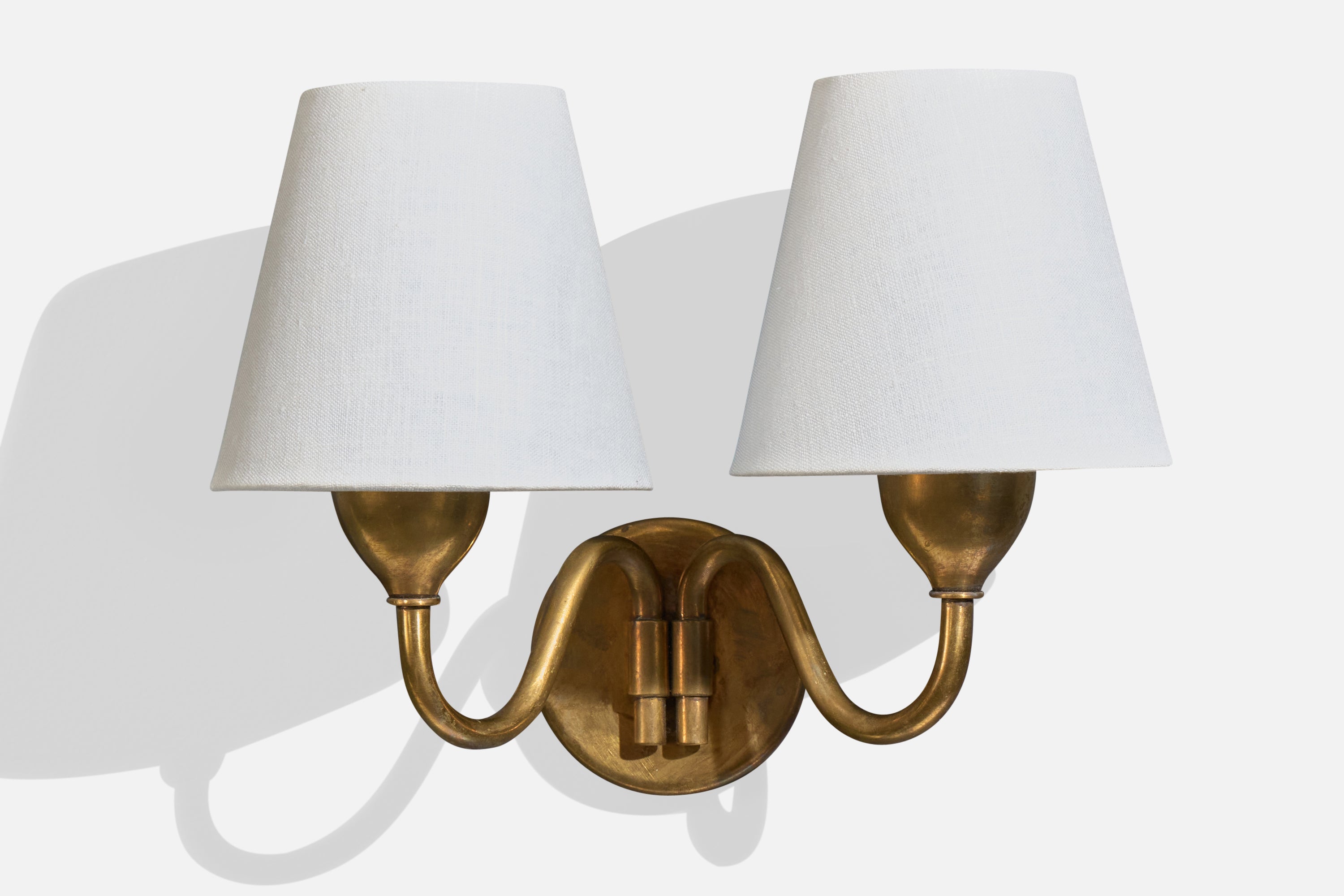A pair of brass and white fabric wall lights designed and produced in Denmark, c. 1950s.