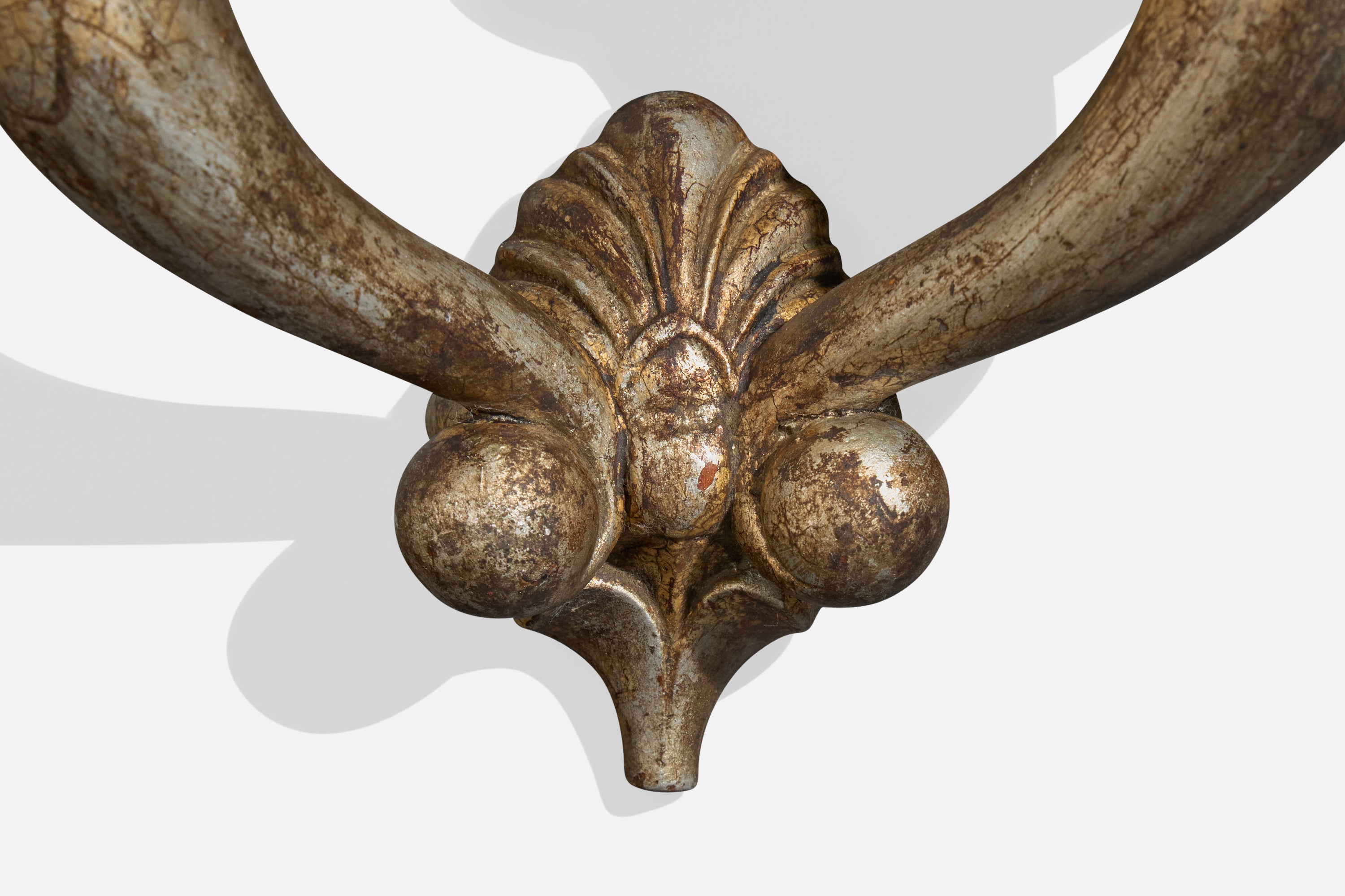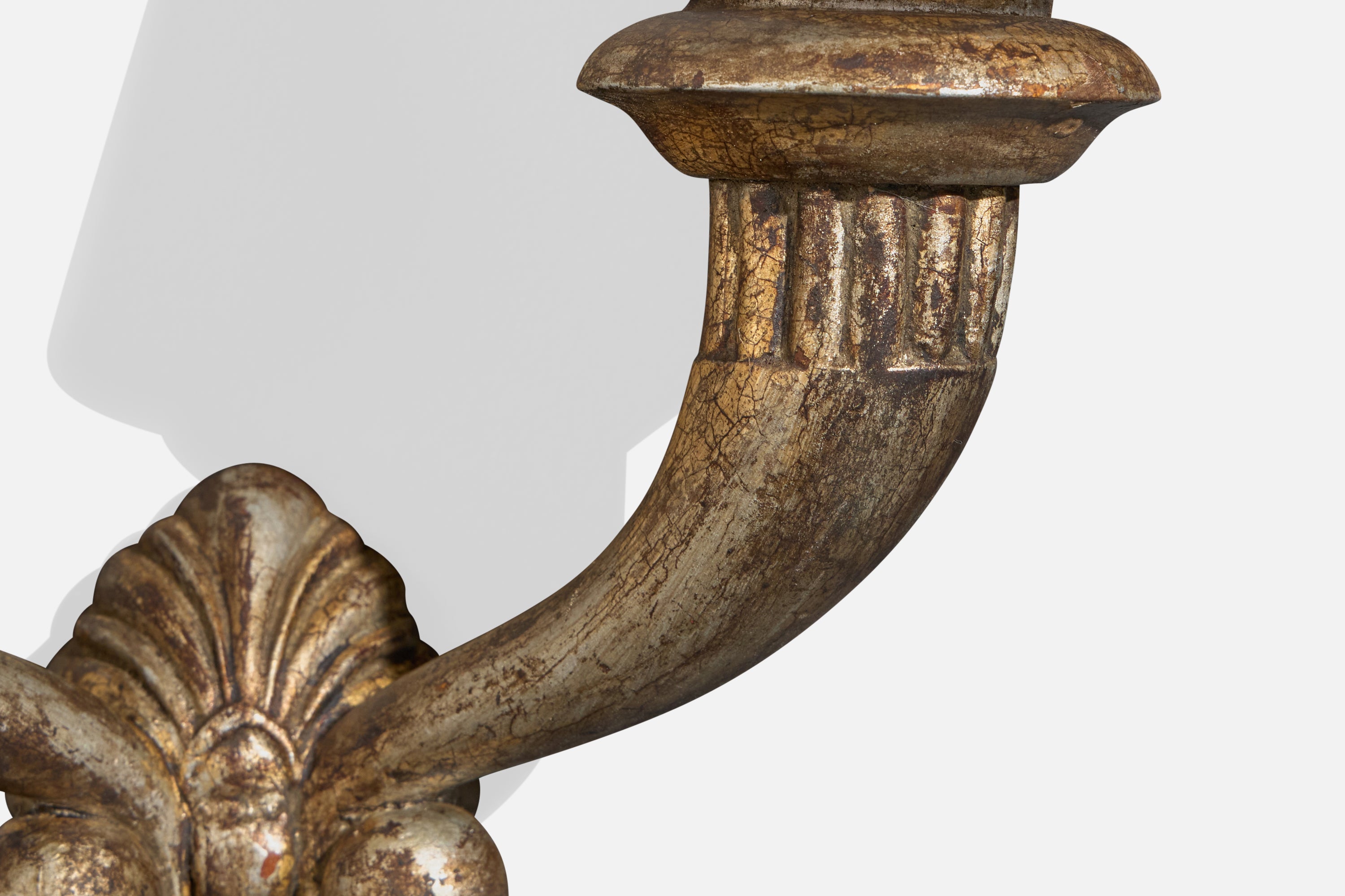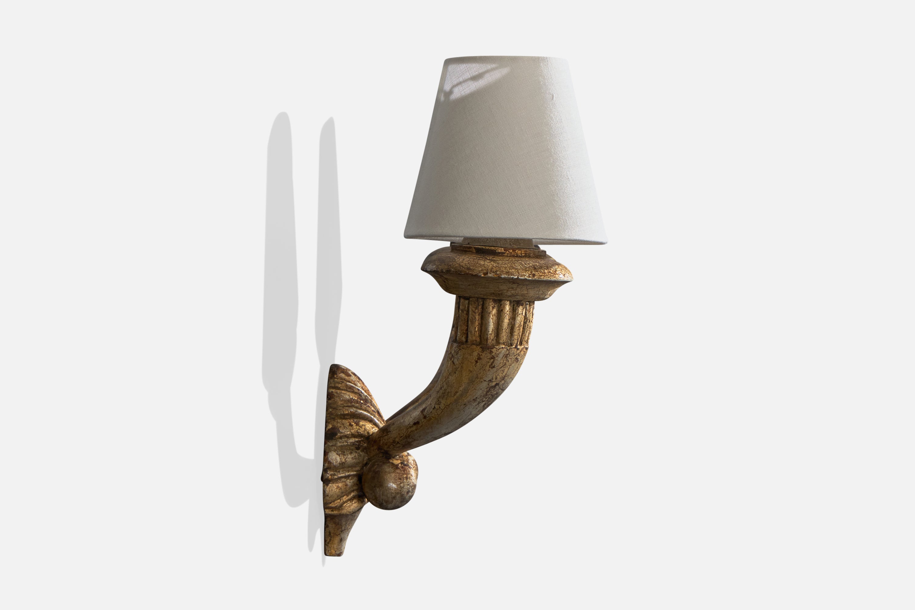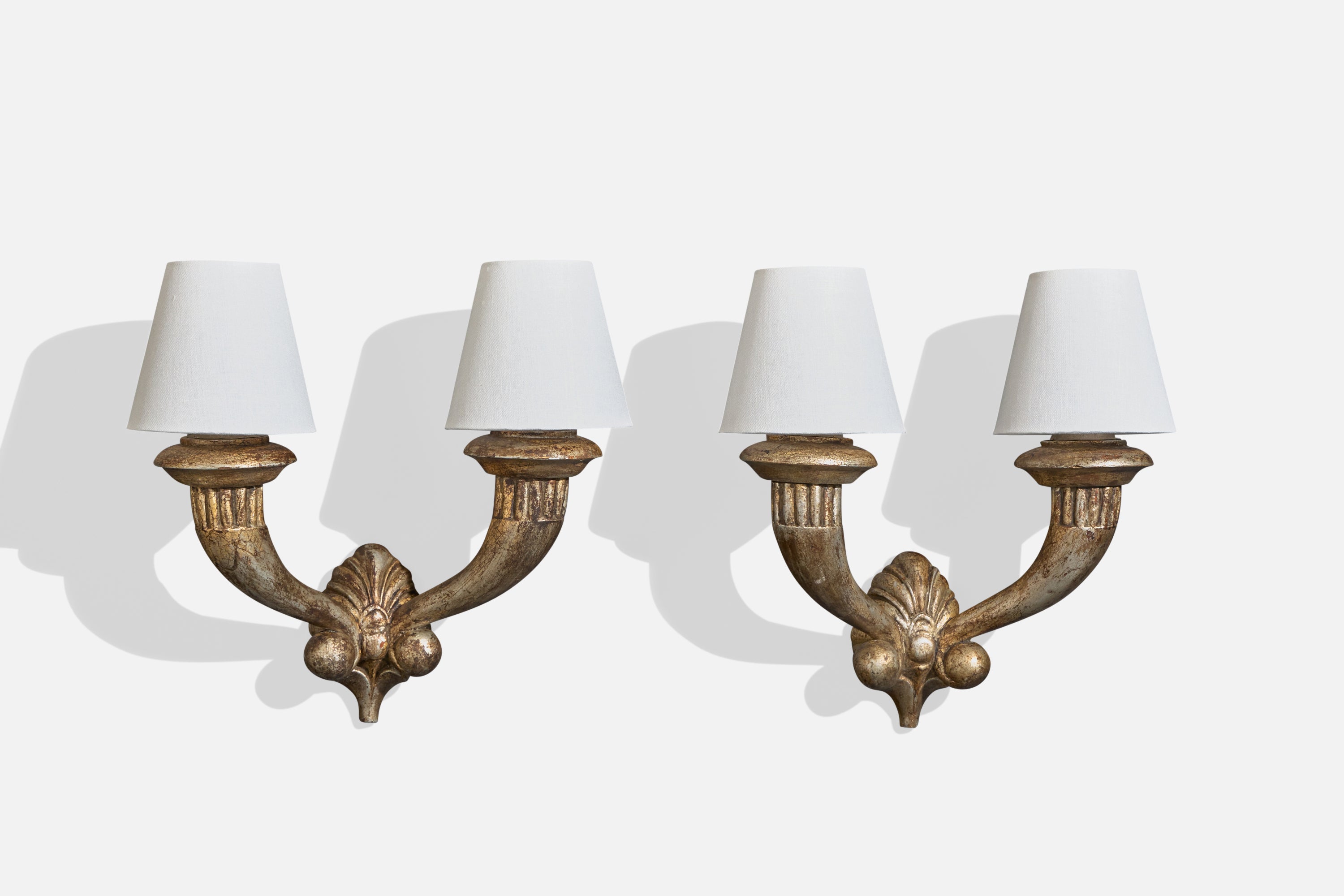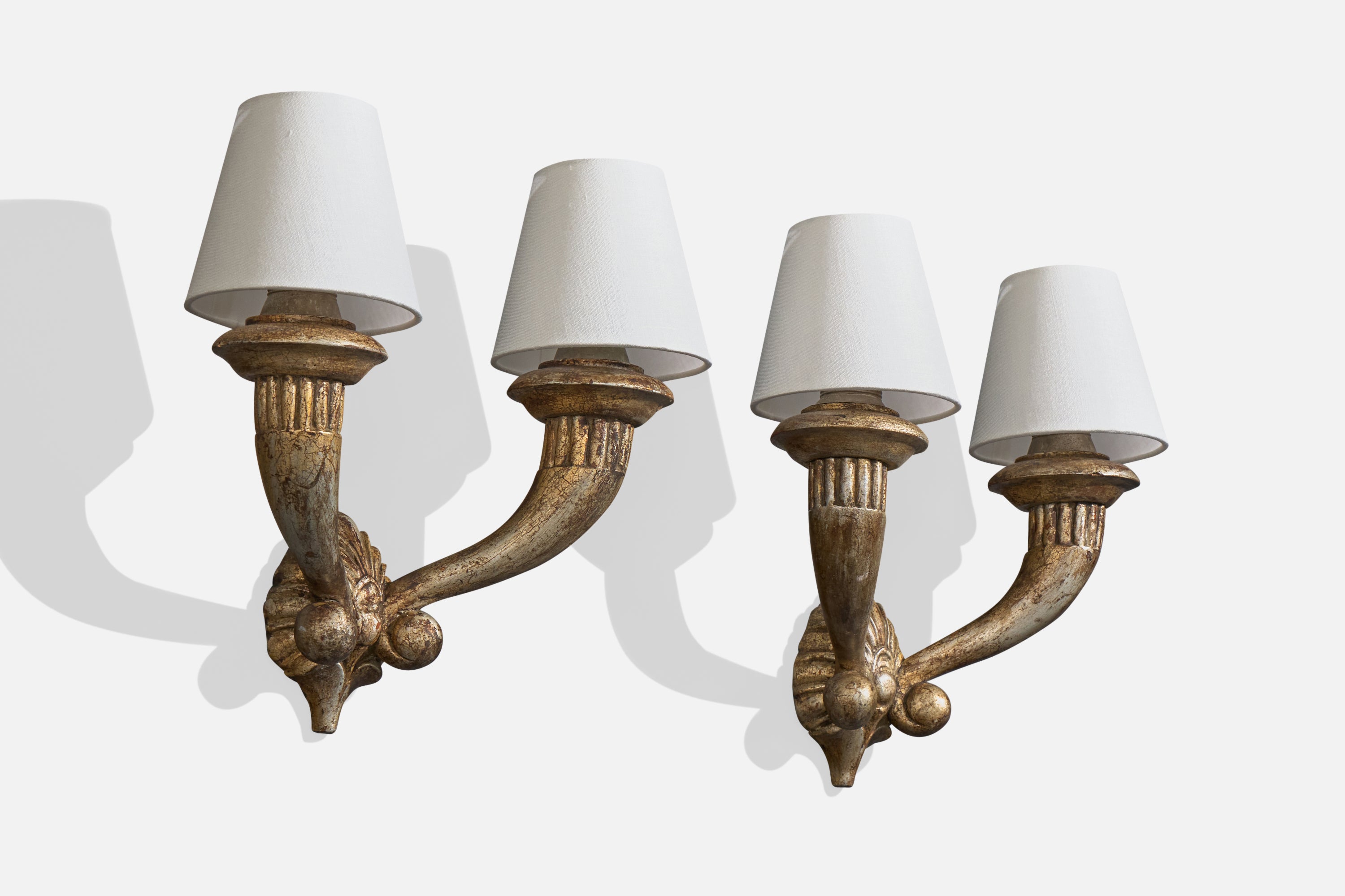 A pair of silver and bronze-painted wood and white fabric wall lights likely designed and produced in France, c. 1940s.