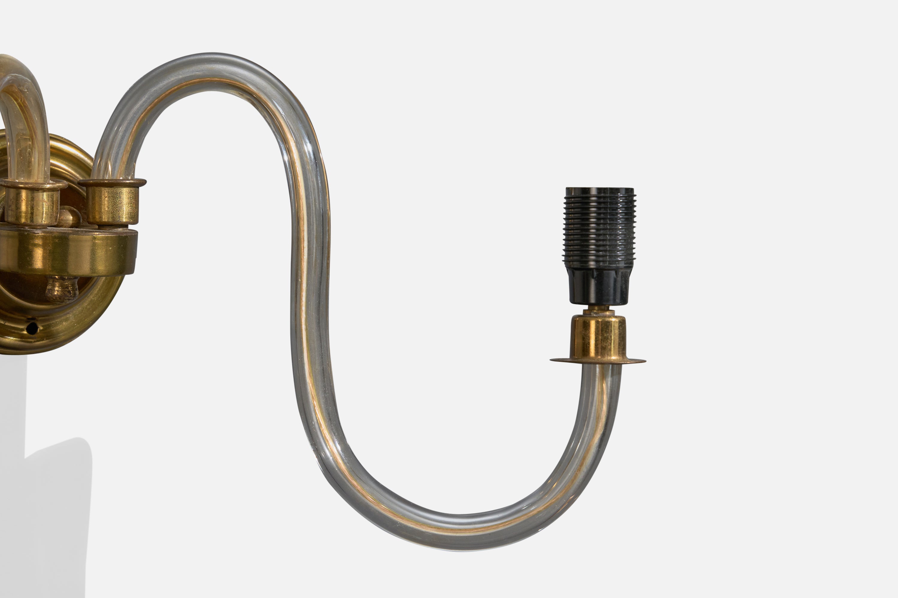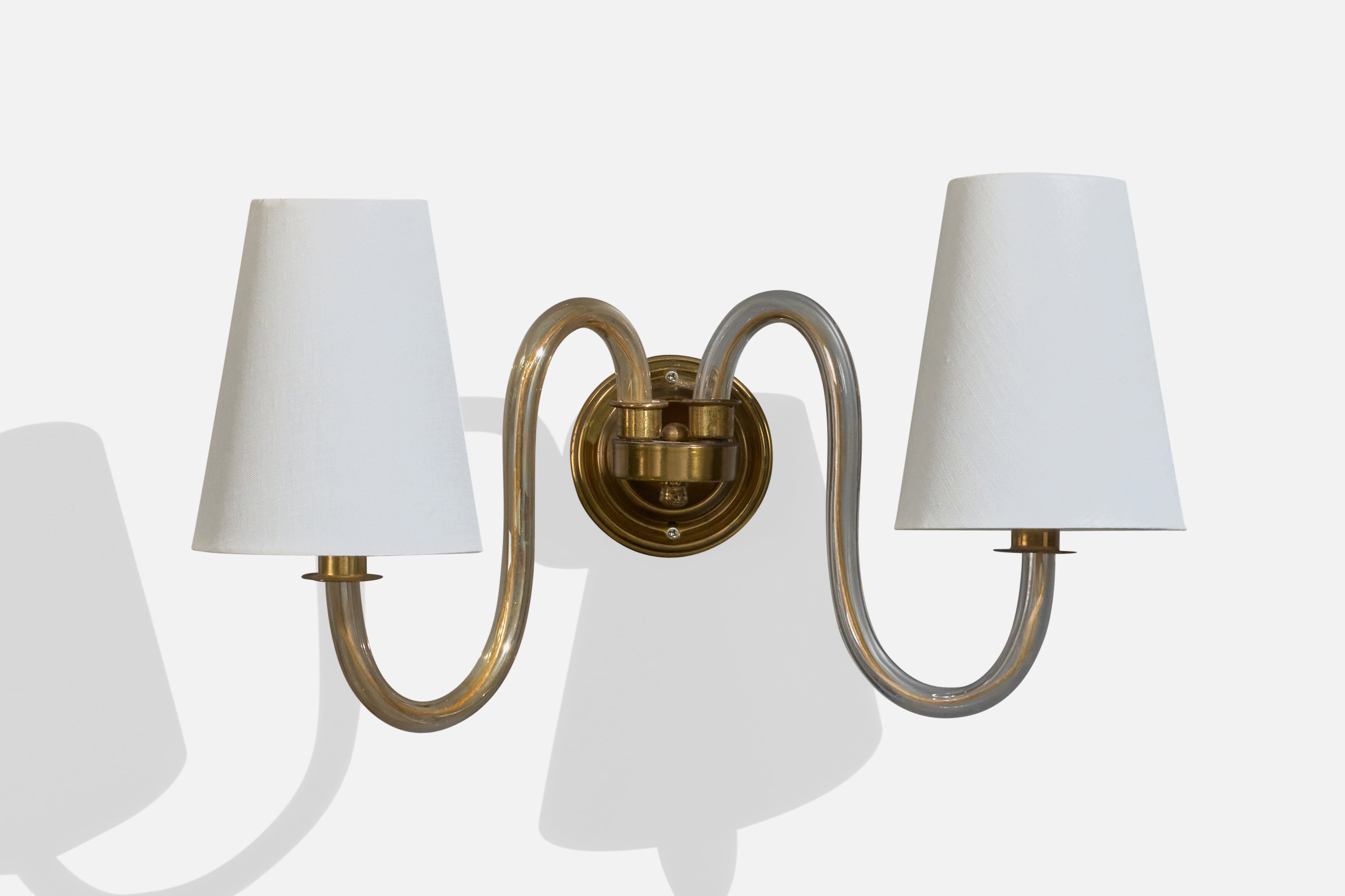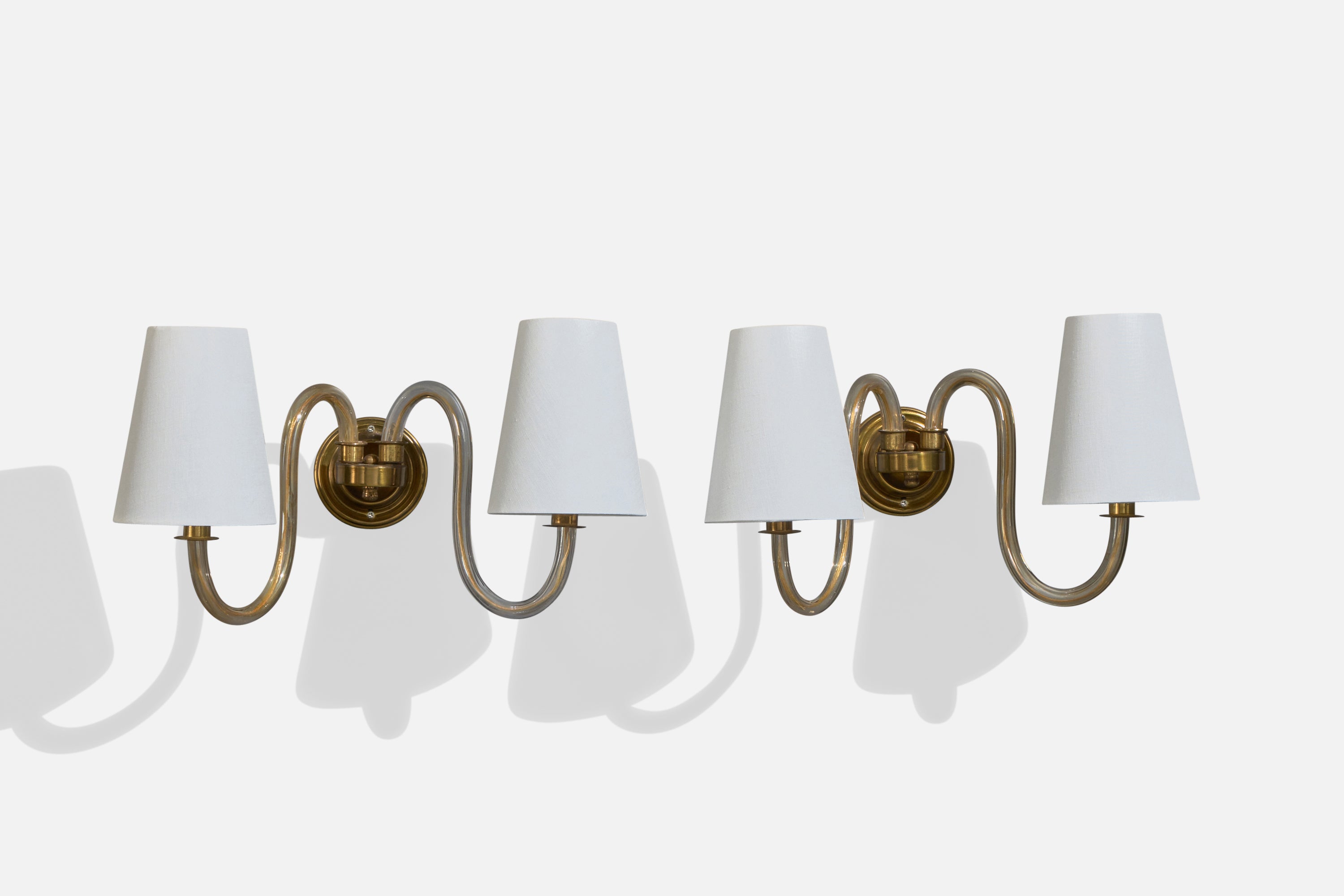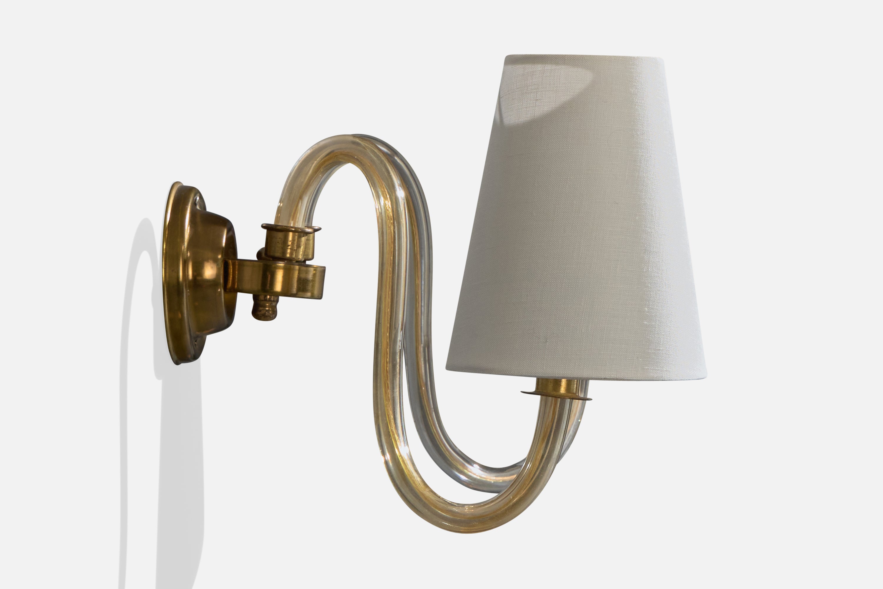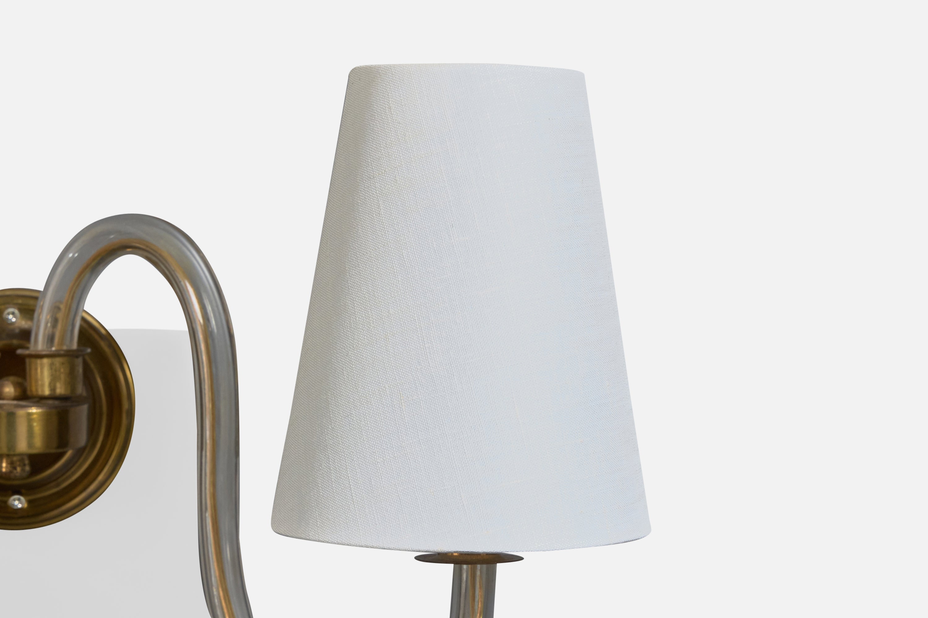 A pair of brass, acrylic and white fabric wall lights designed and produced in France, c. 1950s.