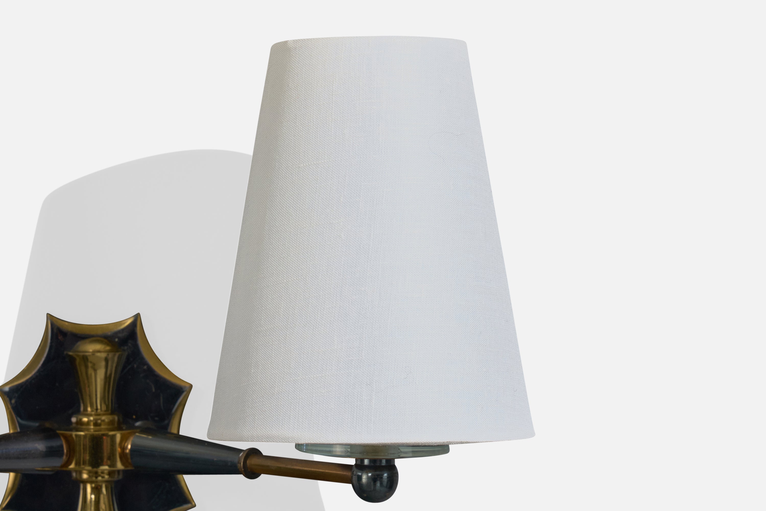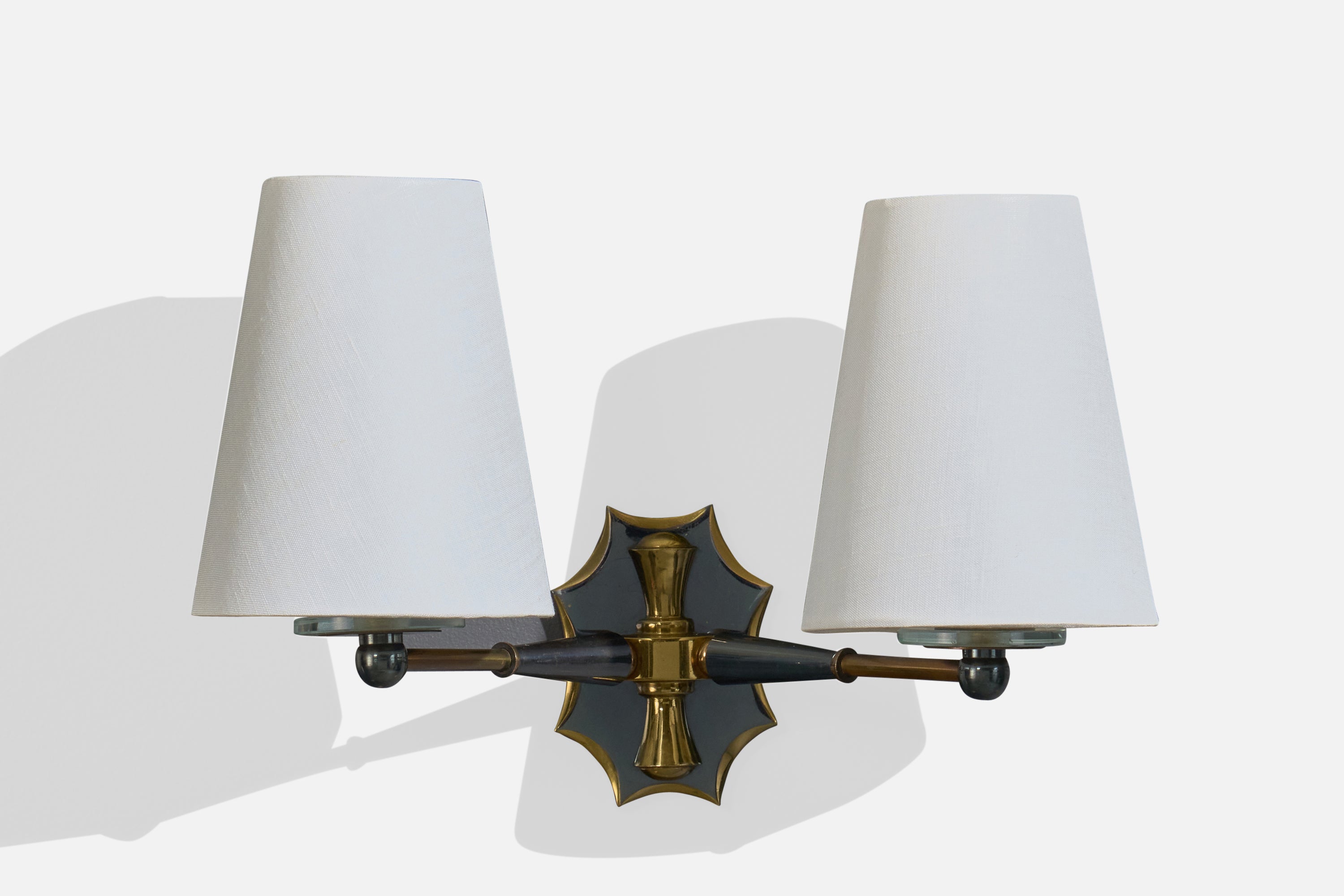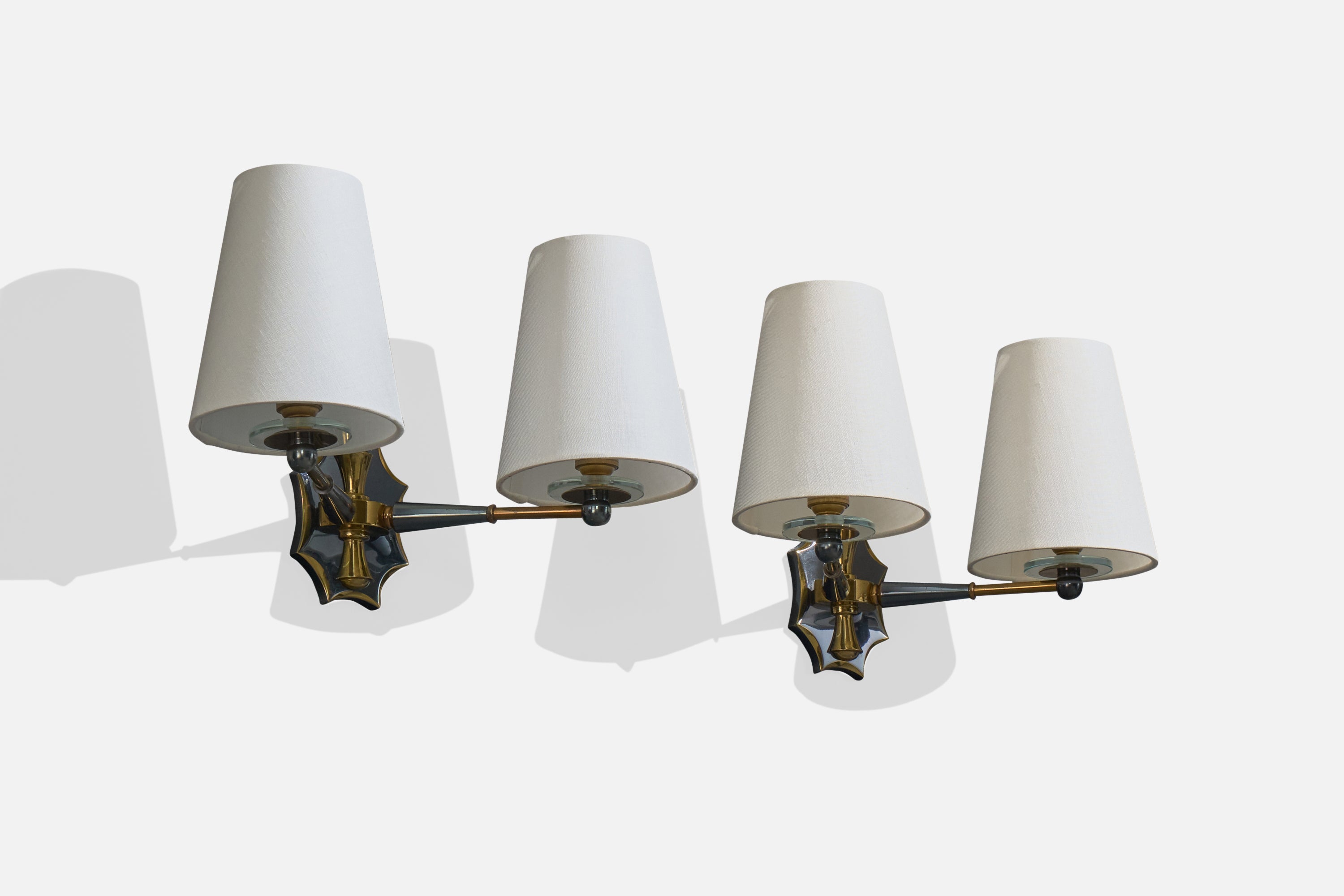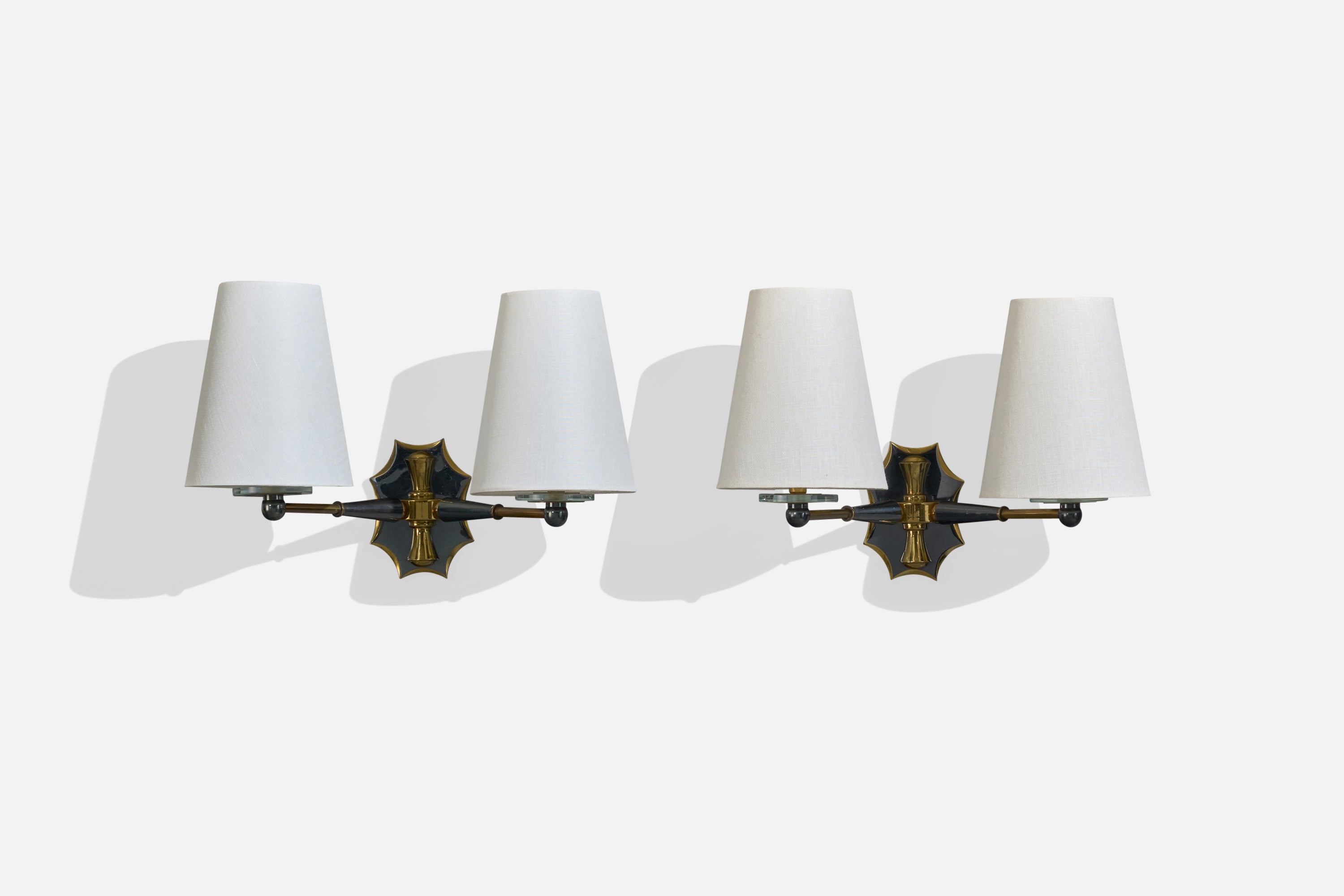 A brass, metal, glass and white fabric wall lights designed and produced in France, c. 1950s.