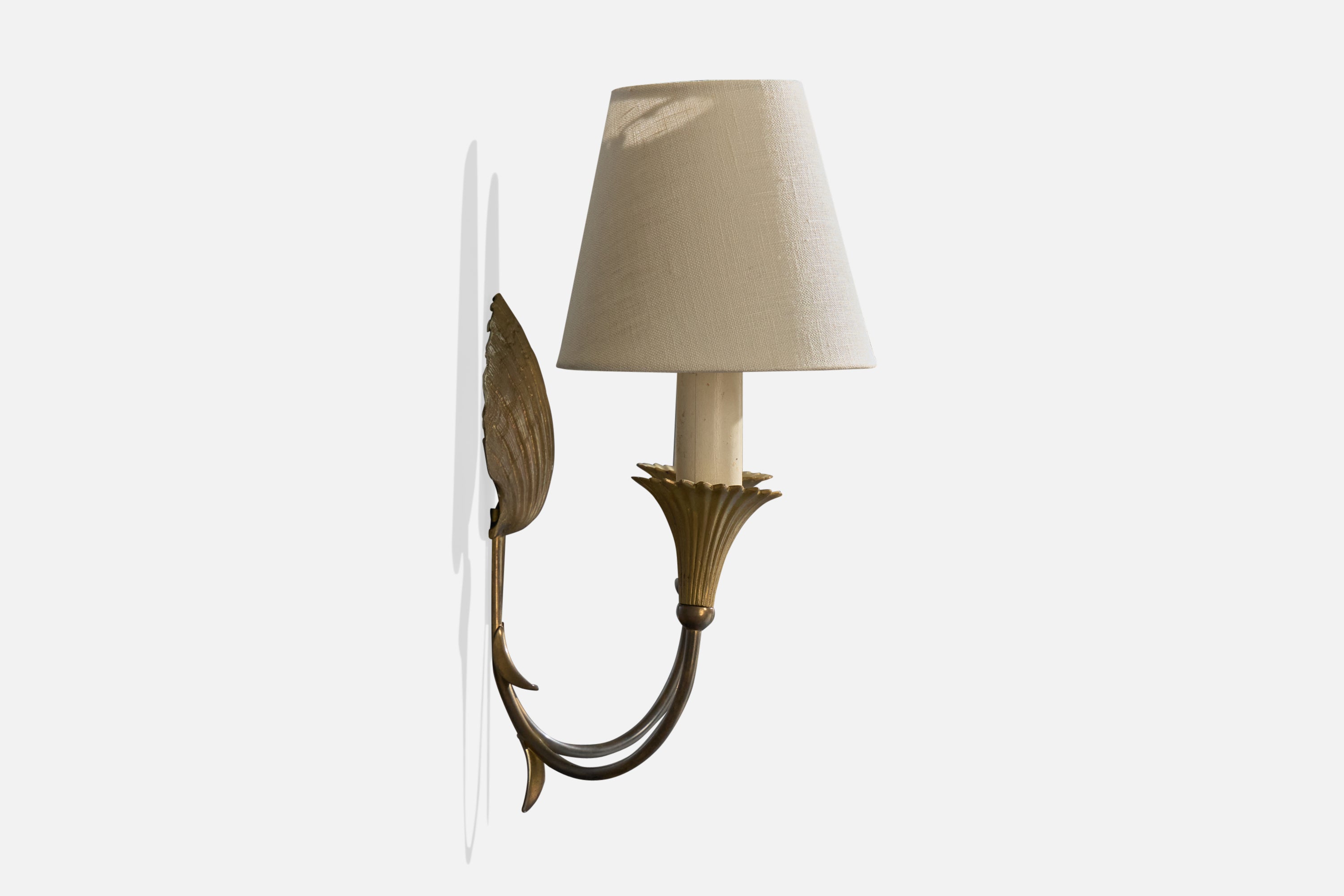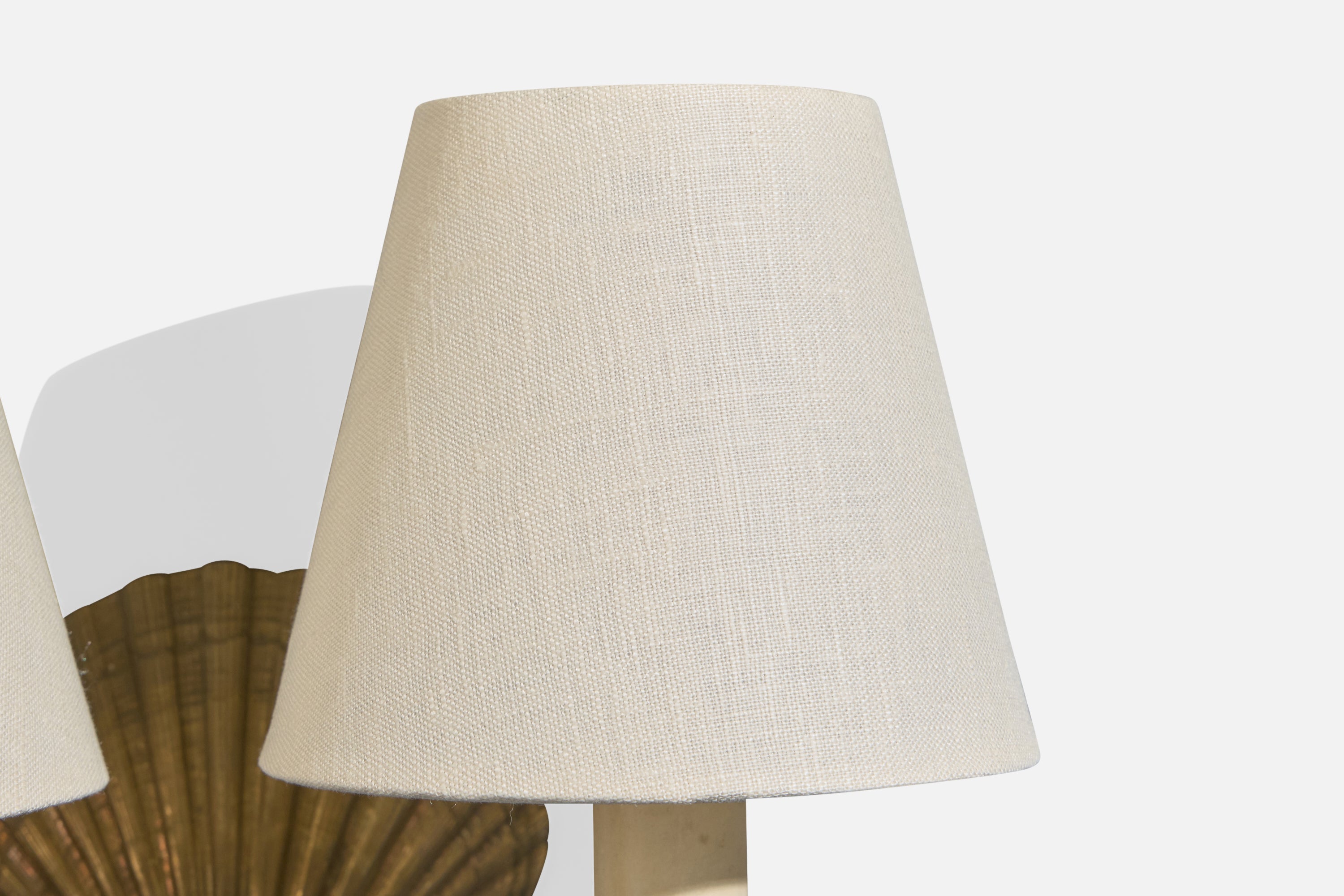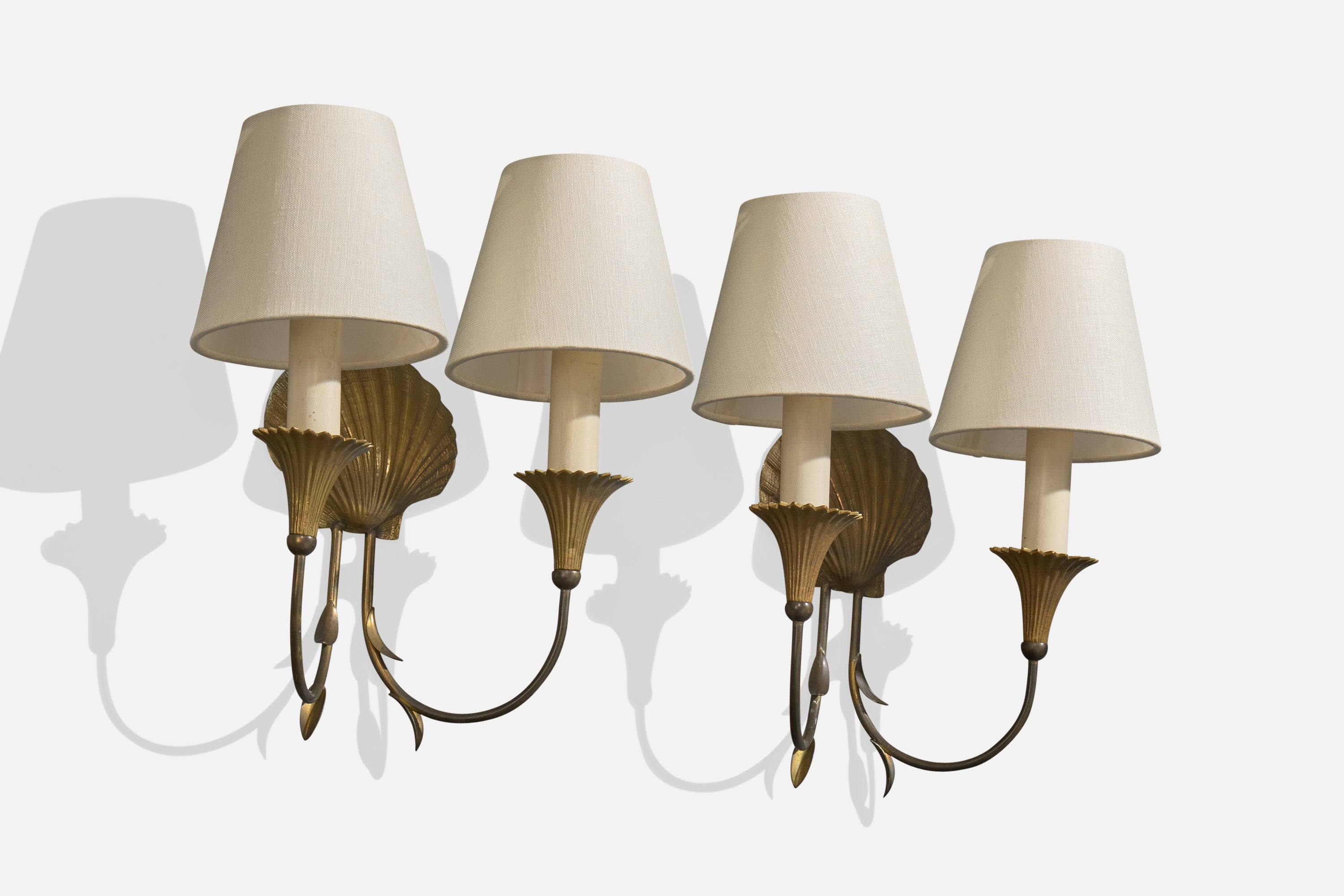 A pair of brass and white fabric wall lights designed and produced in France, c. 1950s.