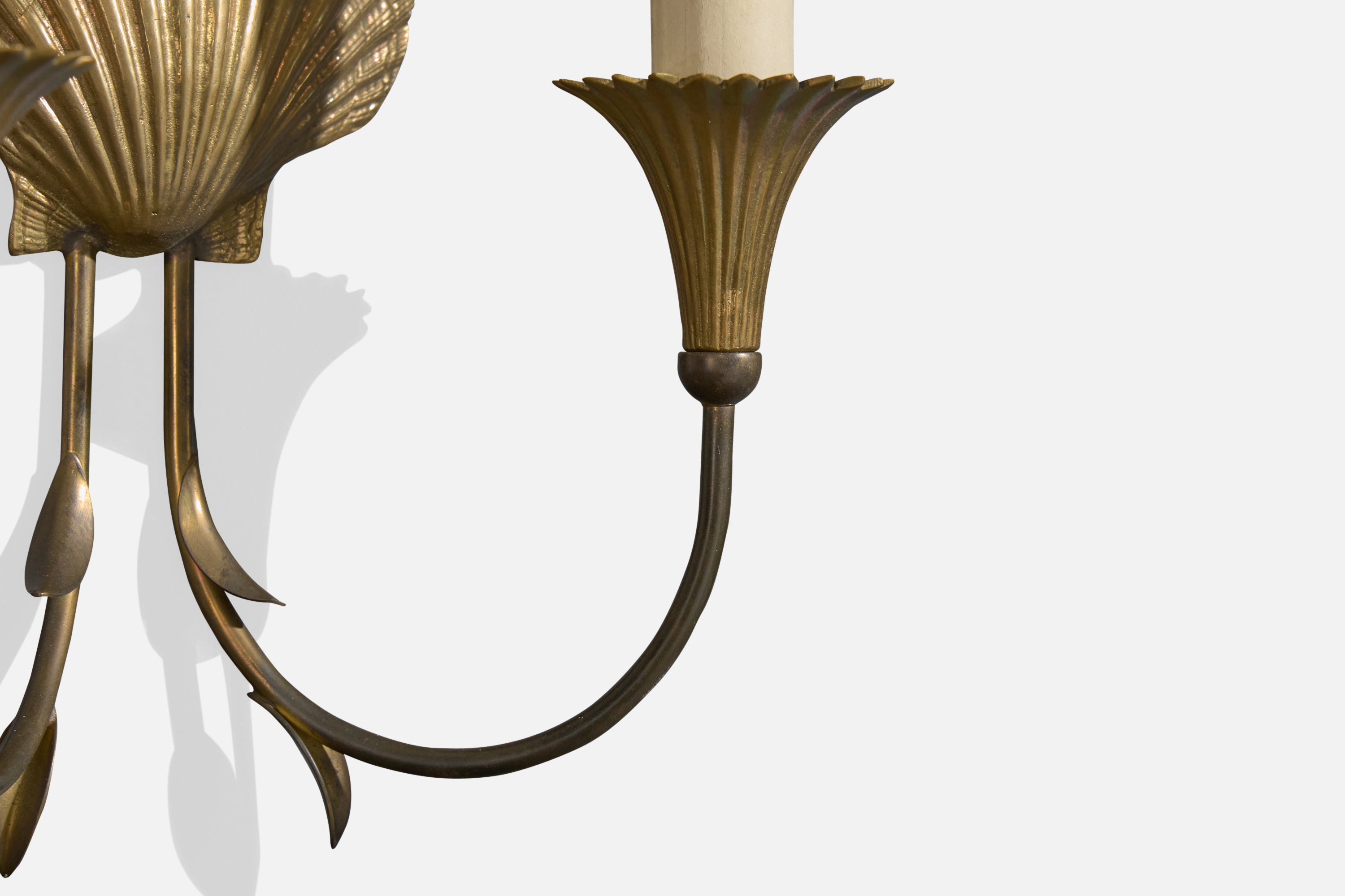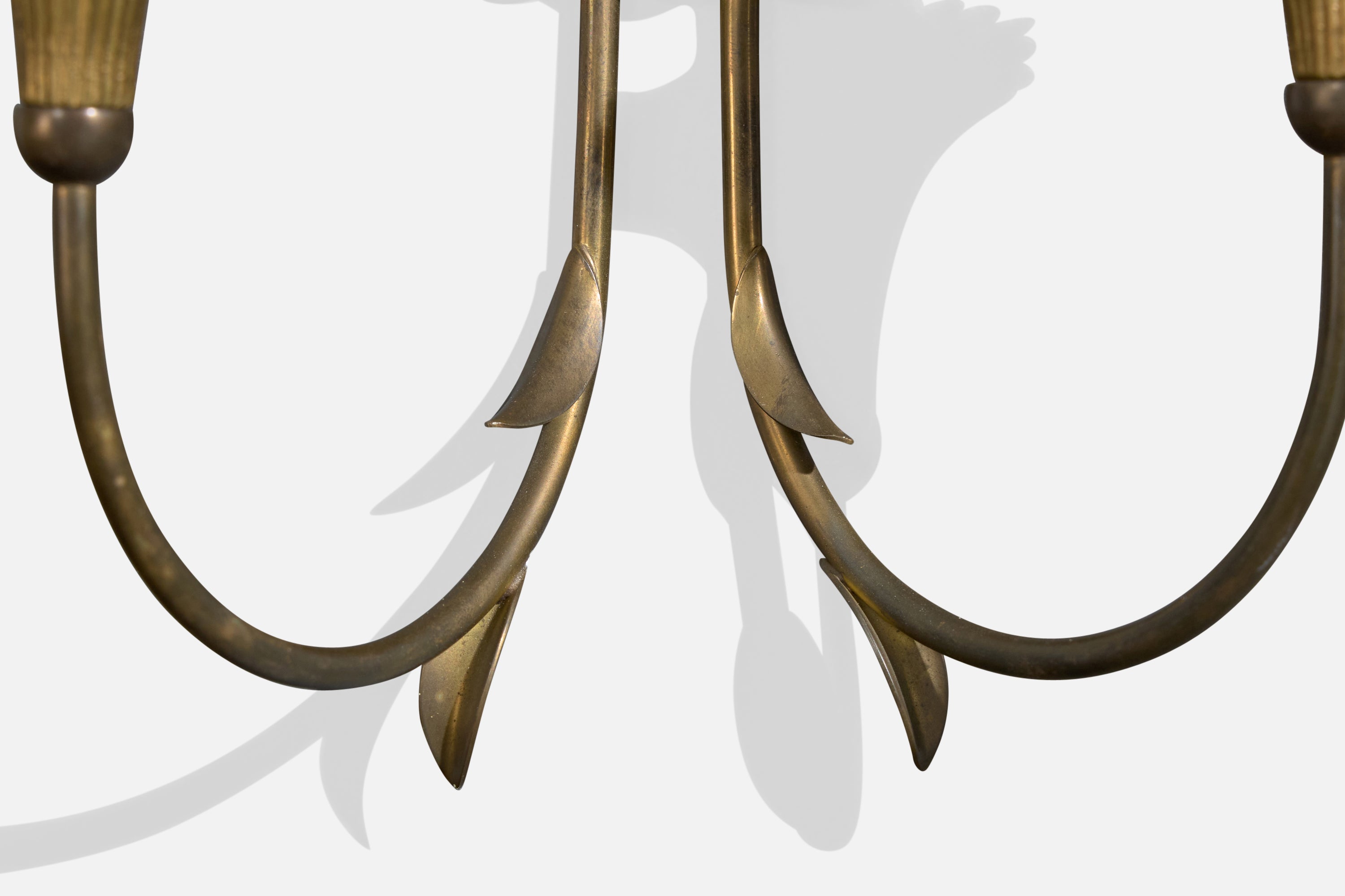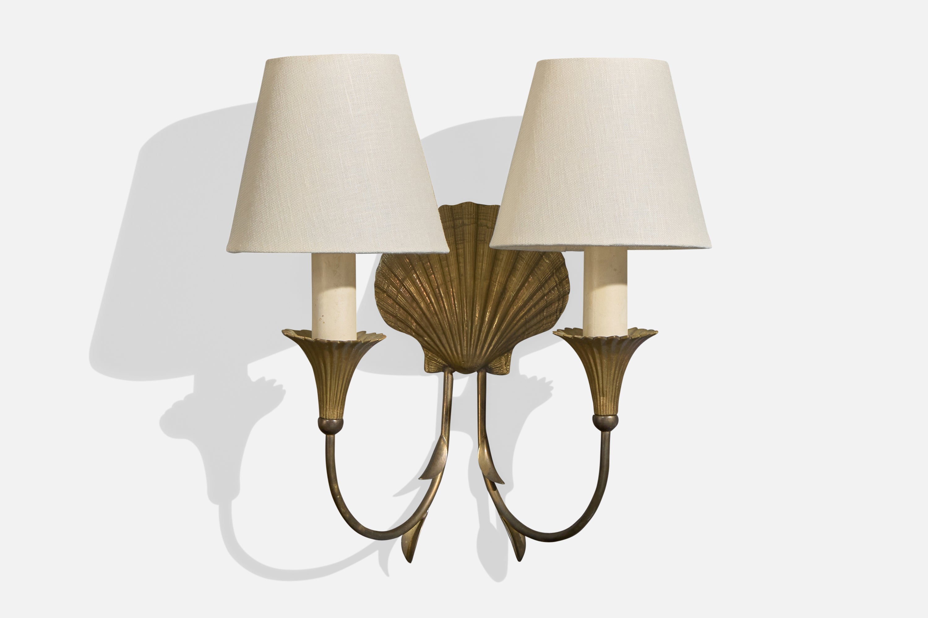 A pair of brass and white fabric wall lights designed and produced in France, c. 1950s.