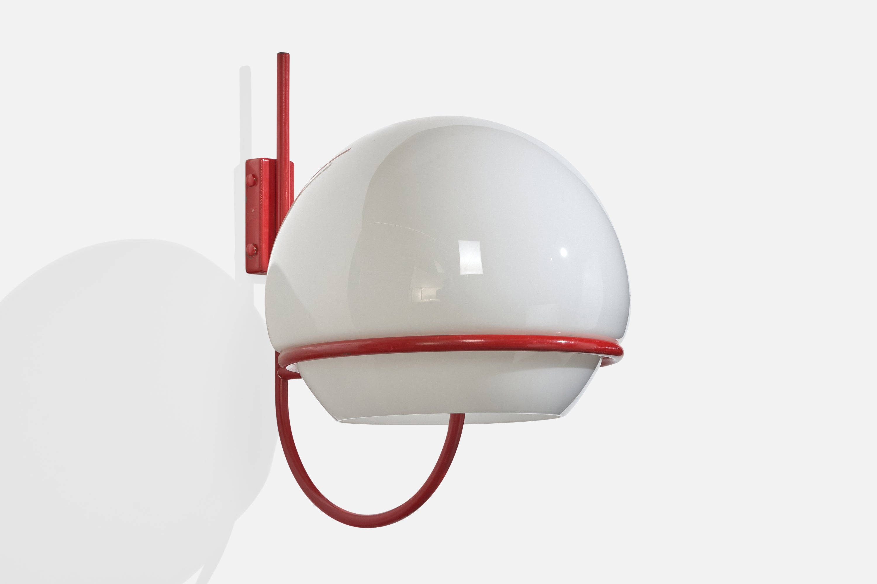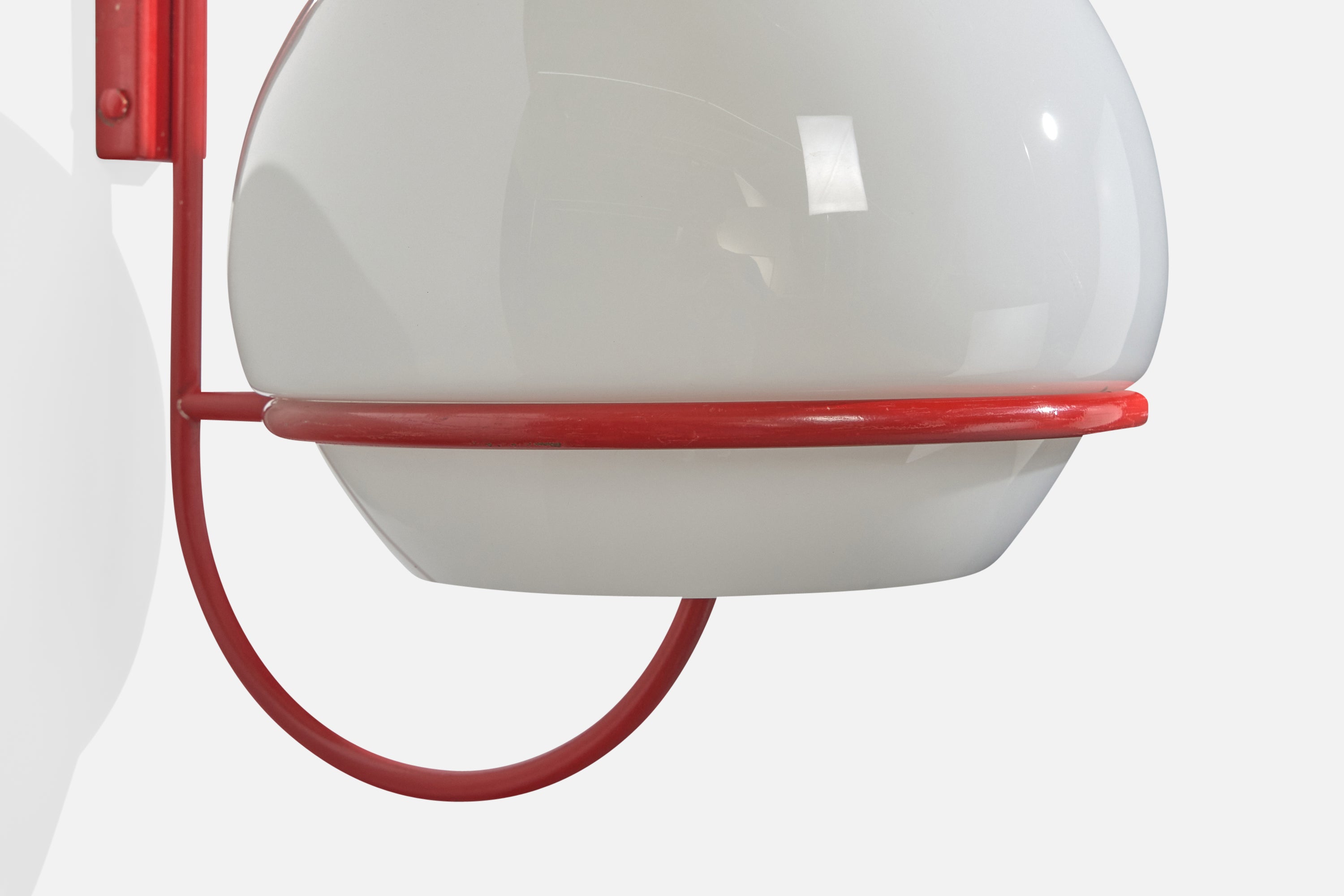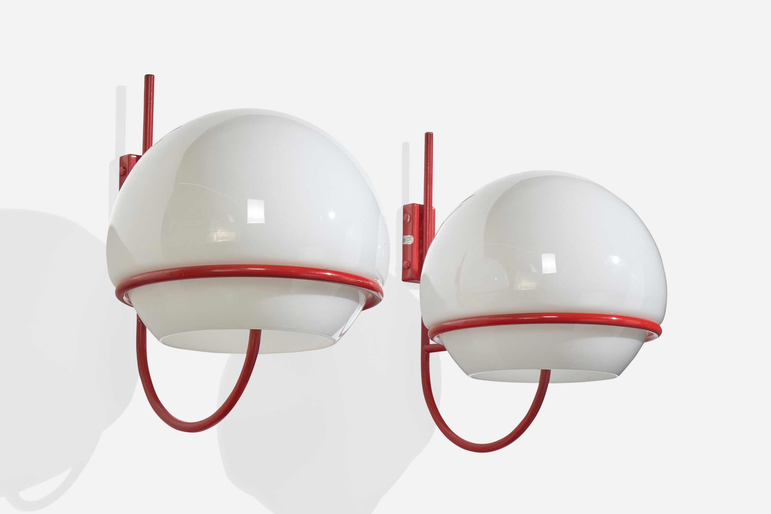 A pair of red-lacquered metal and white opaline glass wall lights, model b515, produced by Candle, Italy, c. 1970s.
